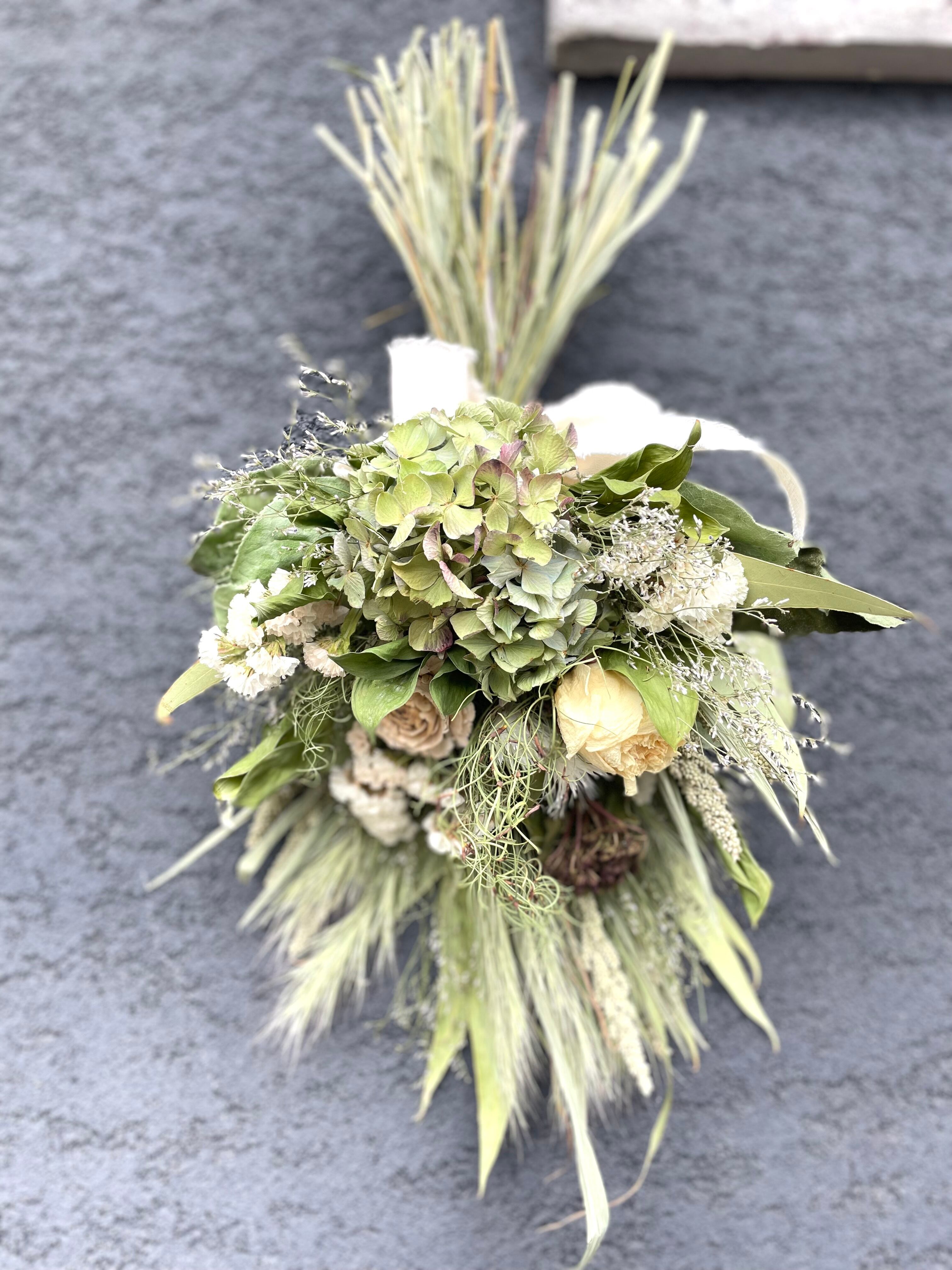 Marcaの定番商品でもある白グリーン系のスワッグ。落ち着いた花合わせで仕上げました。
