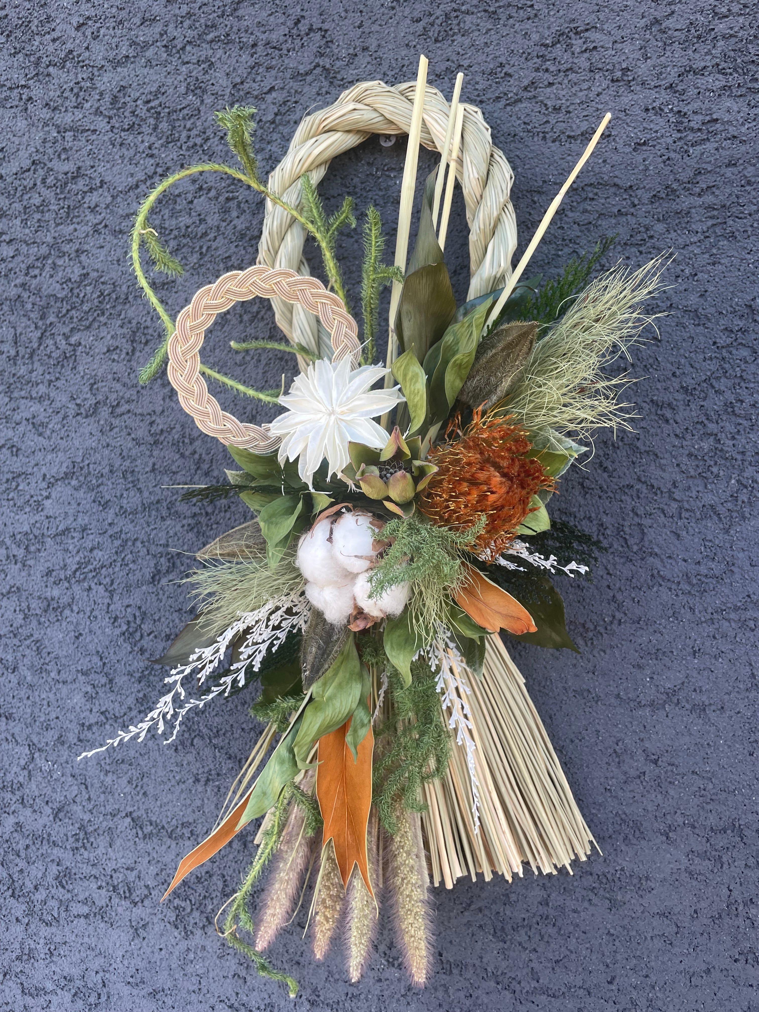 ドライアンドラ、コットン、そして月下美人(ハンドメイド)をメインに白系で仕上げたお正月飾り。