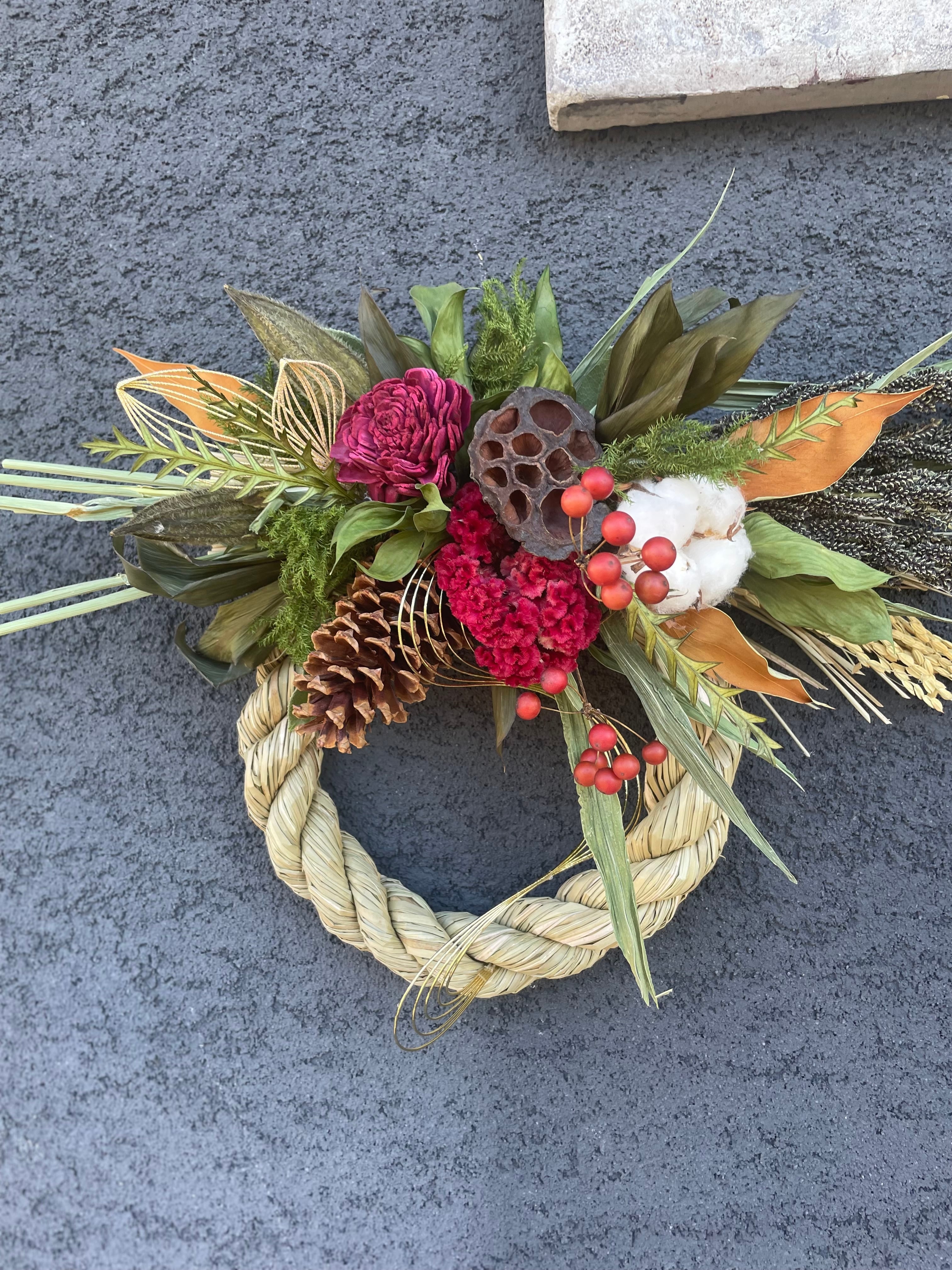 ボリュームのあるクロヒエと稲穂をベースに、華やかな色合わせのしめ飾りに仕上げました。