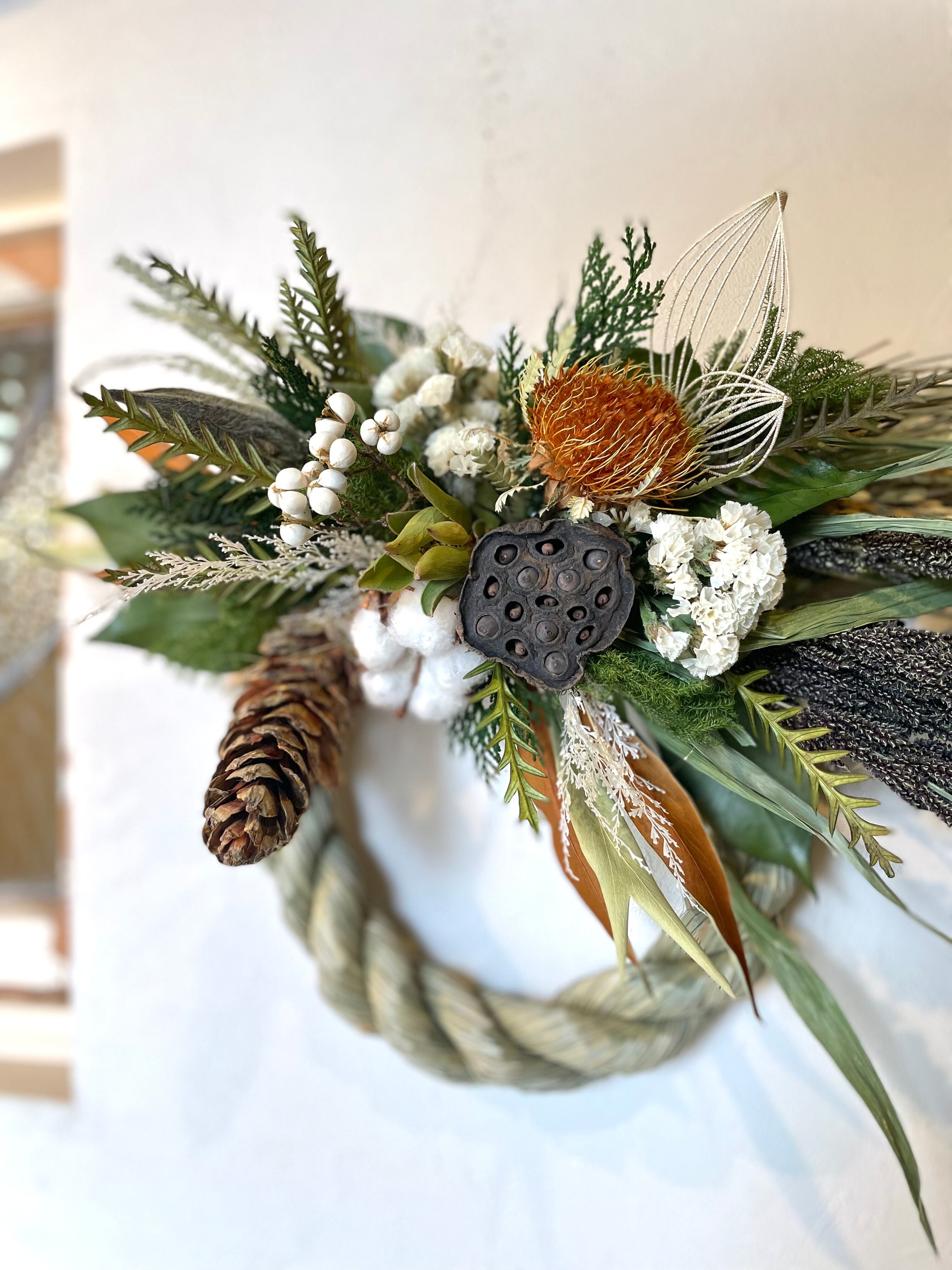 ボリュームのあるクロヒエと稲穂をベースに、ドライアンドラ、ハス、コットンなど和でも洋でも飾りやすいシックな色合わせのしめ飾り。
