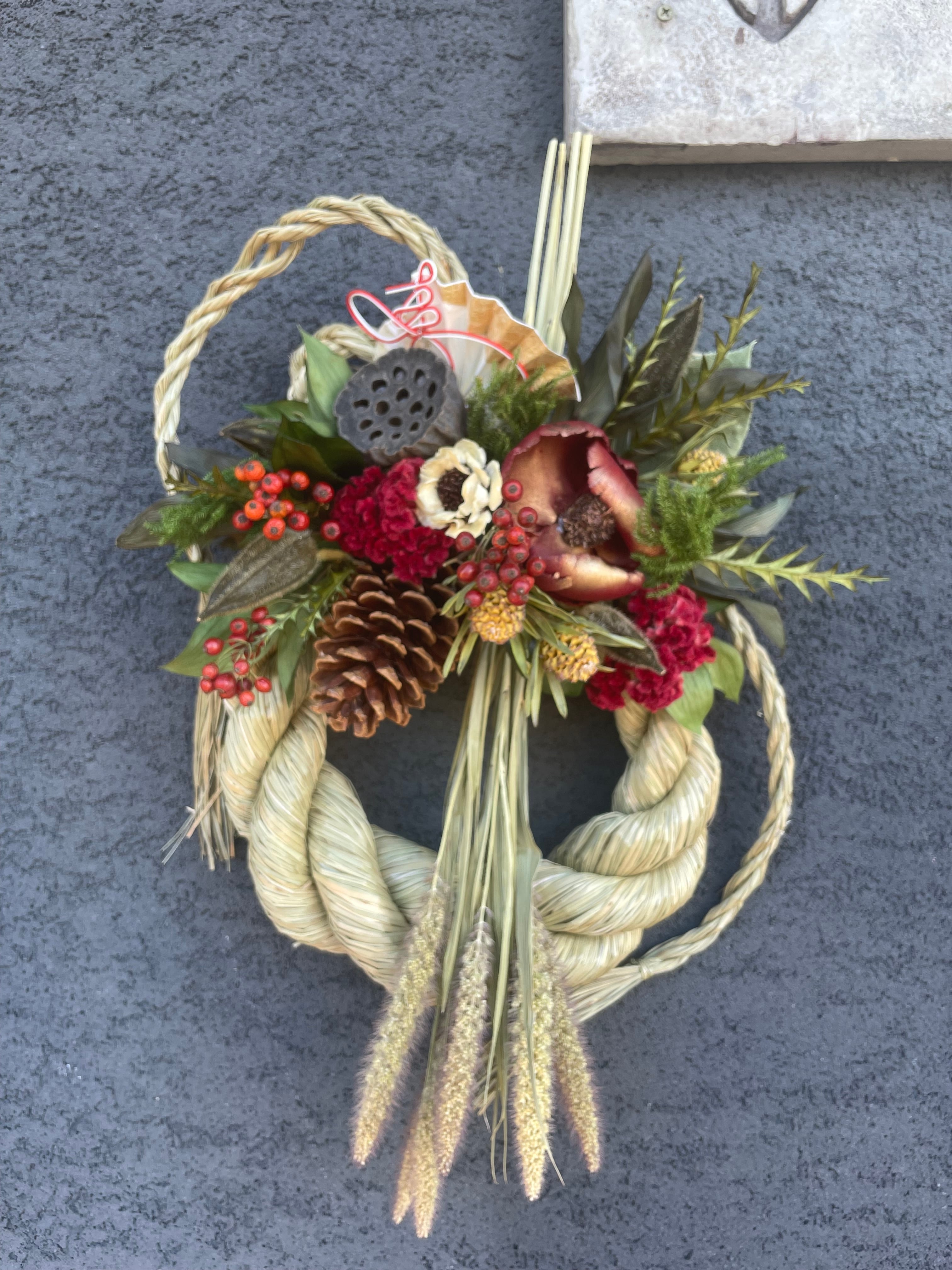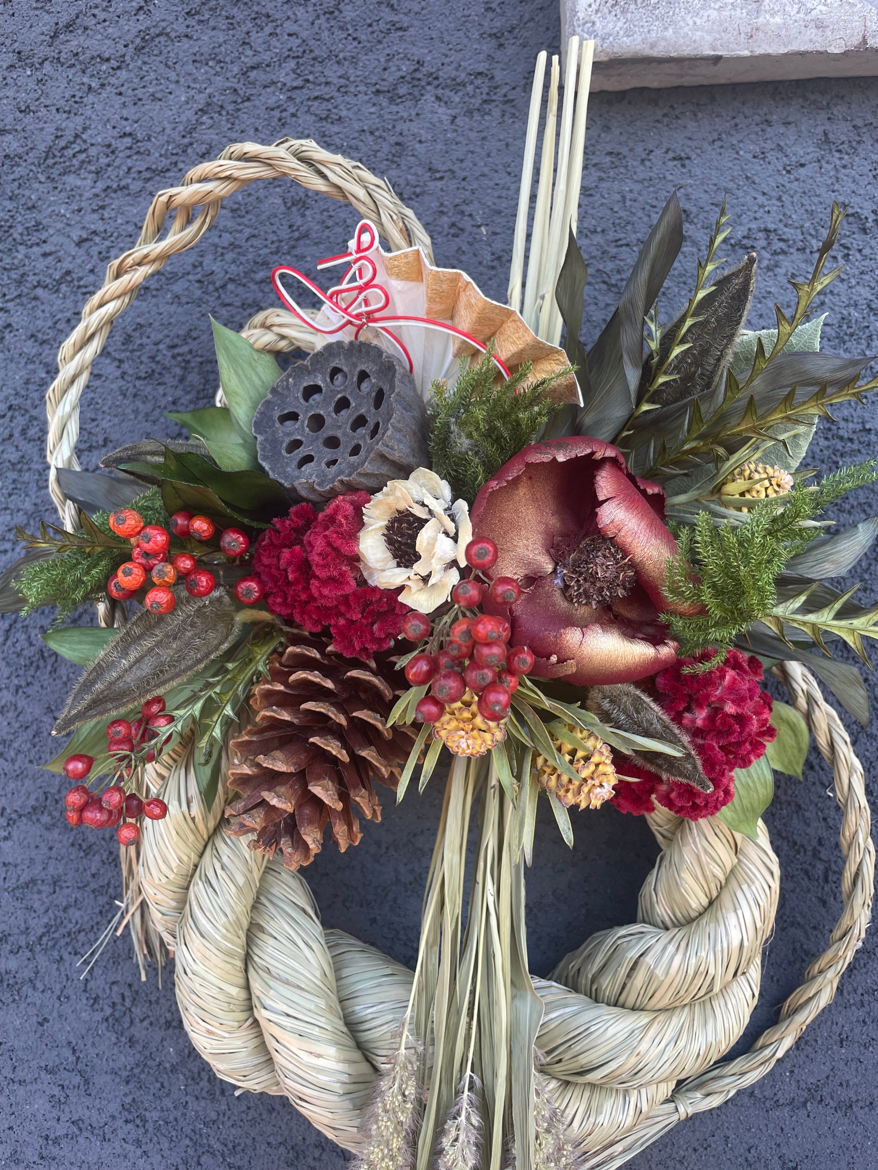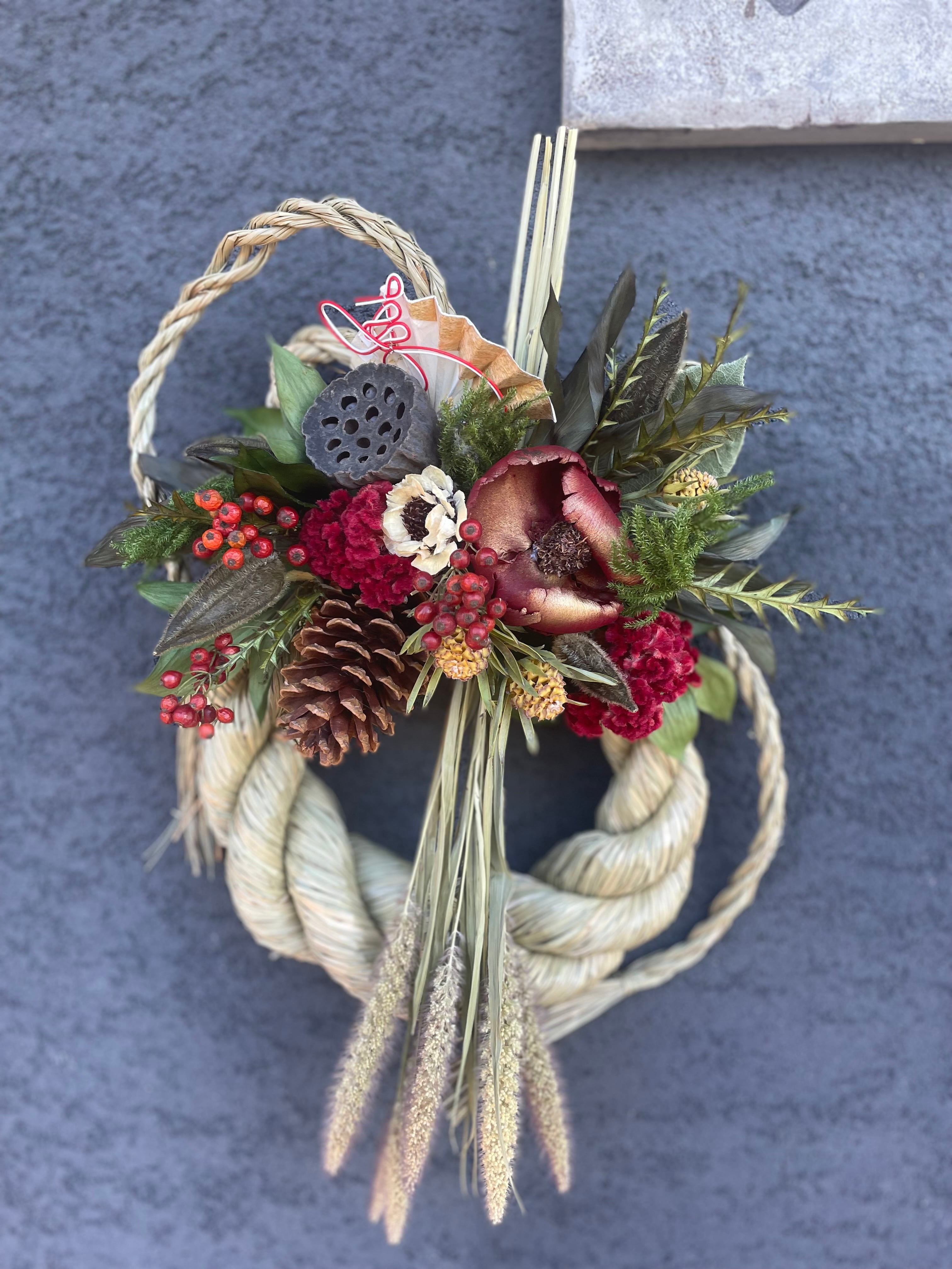 ボリューム感のあるしめ縄のベース。華やかなパームフラワーの赤、ハス、マックコーンなど、ボリュームたっぷりの仕上がりです。