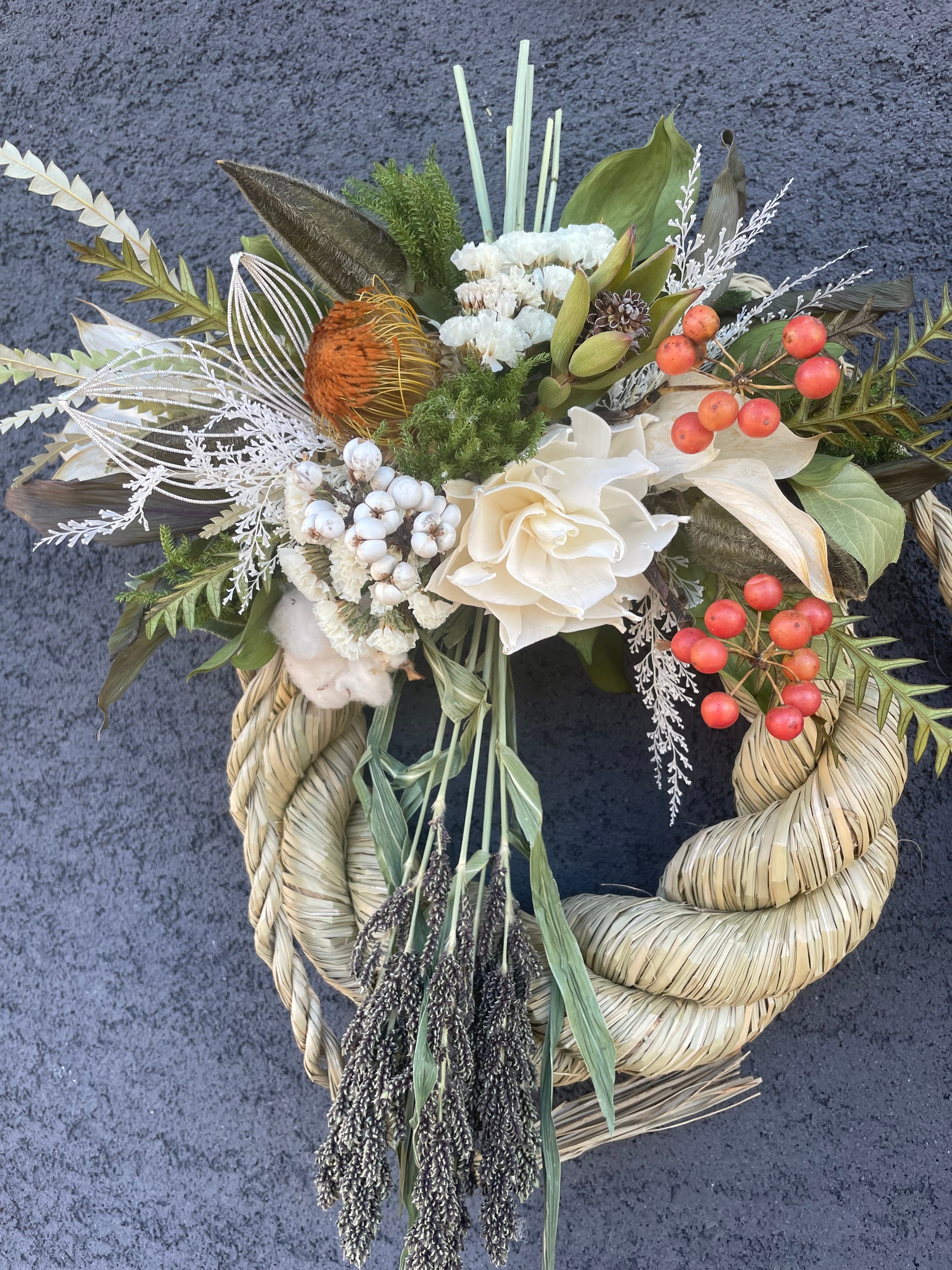 ボリューム感のあるしめ縄のベース。華やかな白のソーラーフラワーをメインに、オレンジのドライアンドラやクロヒエを合わせた落ち着いた花合わせ。
