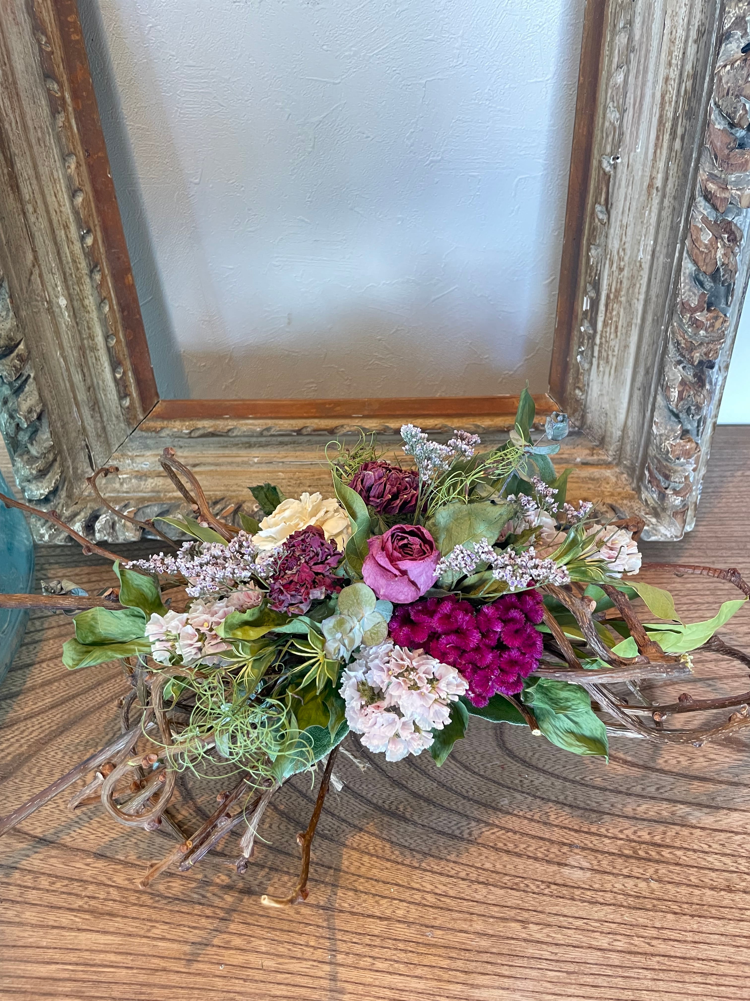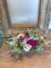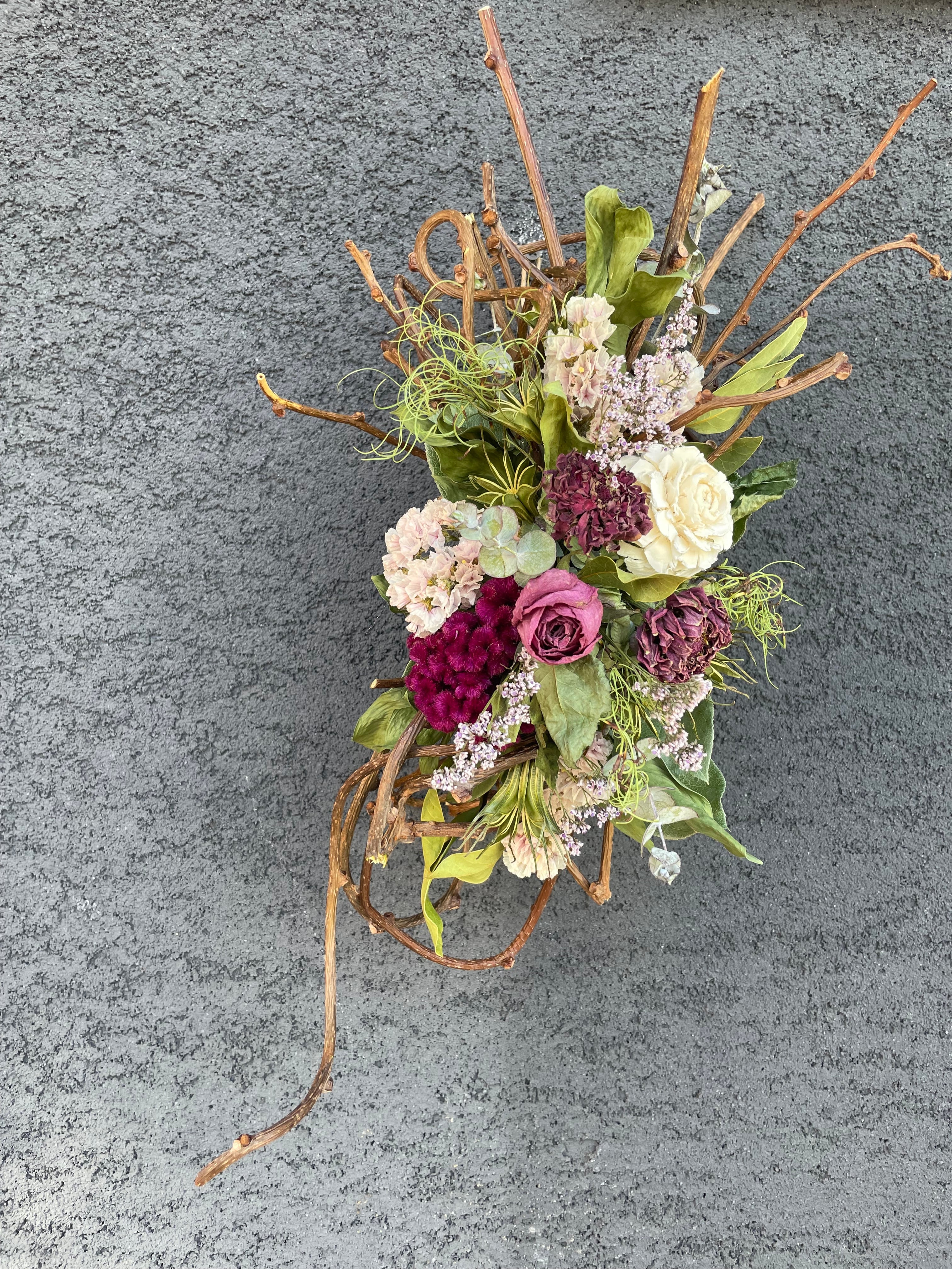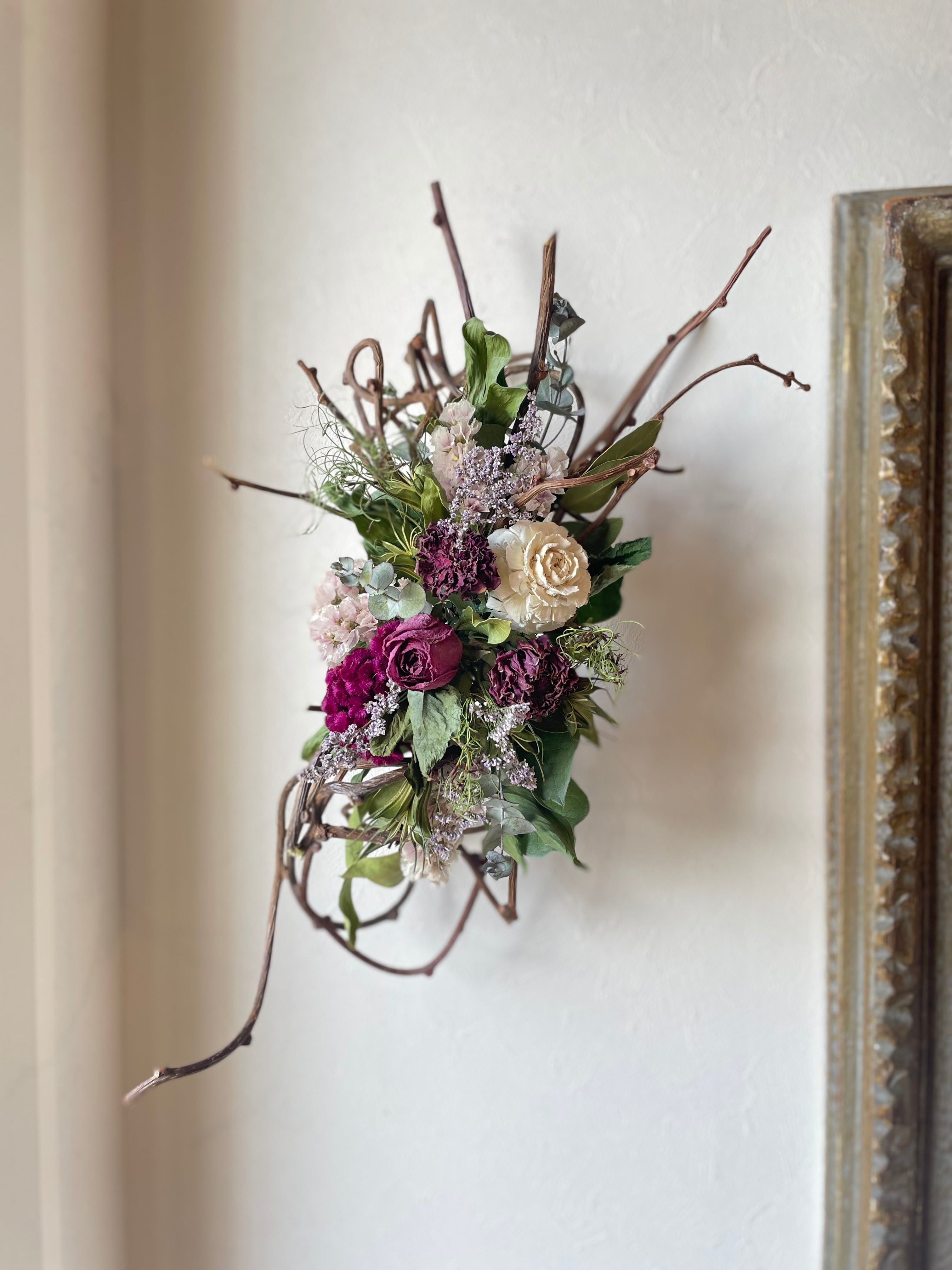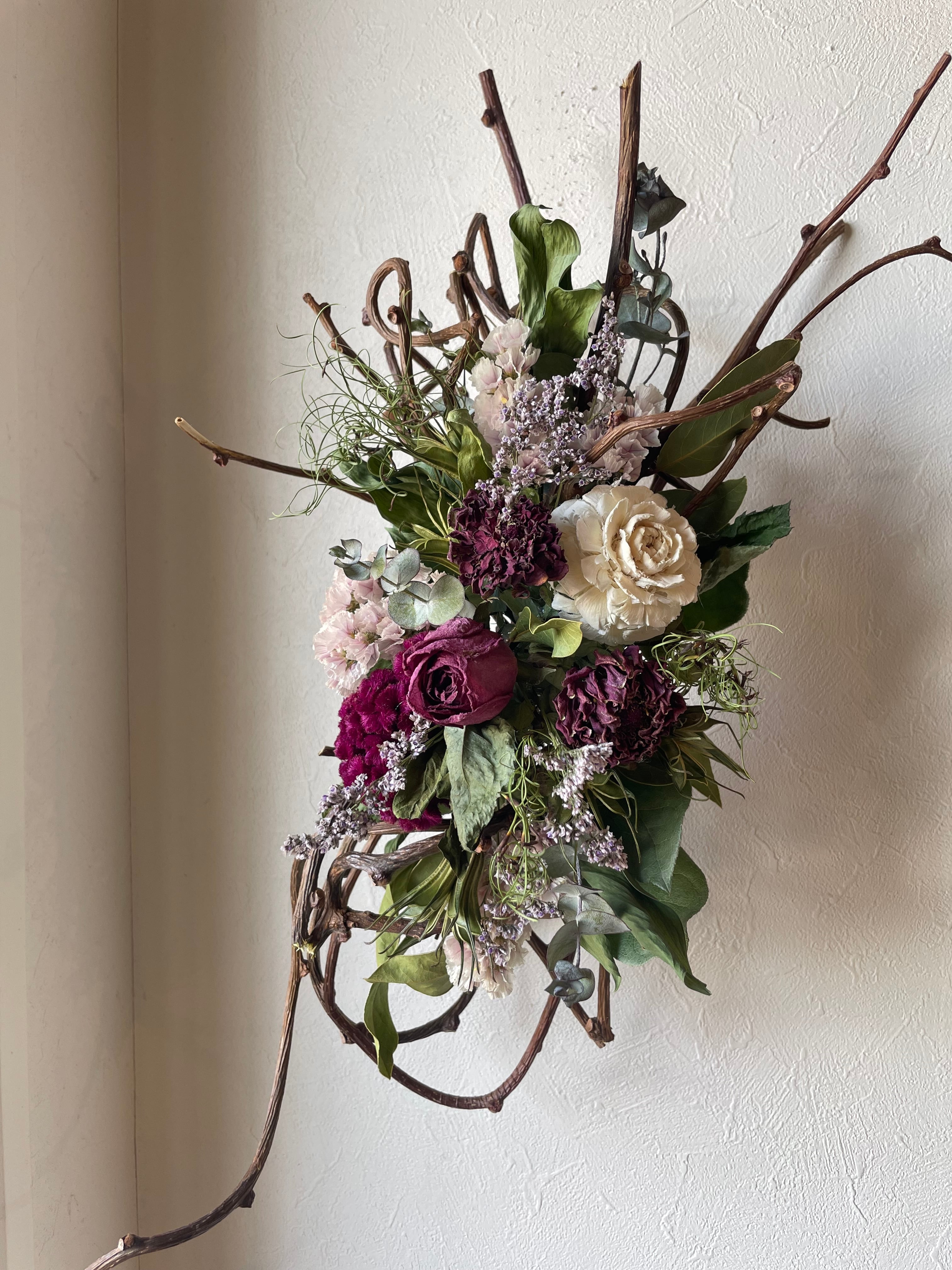 シックなワインカラーのキウイヅルアレンジ。明るめの白をプラスすることで春らしさも。
