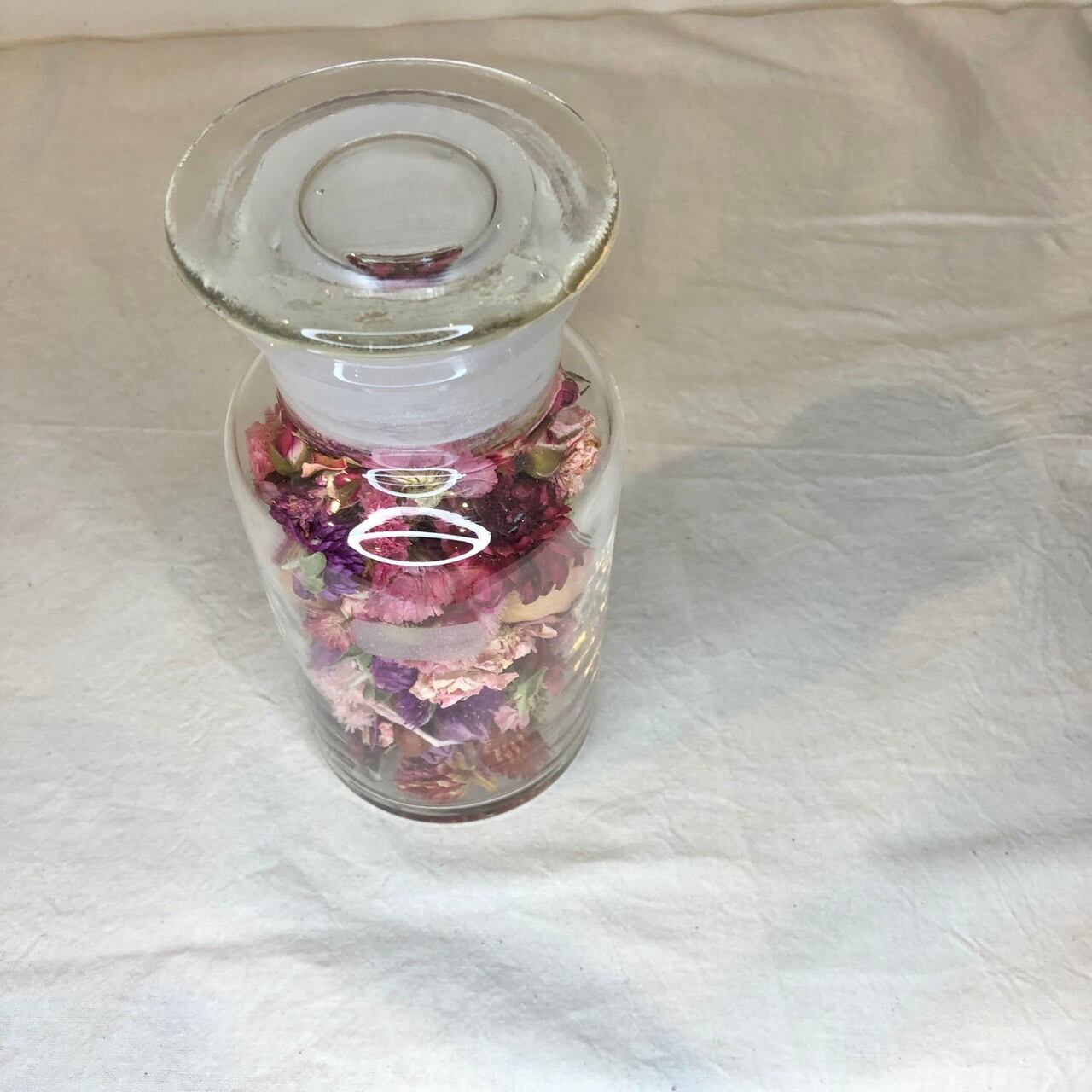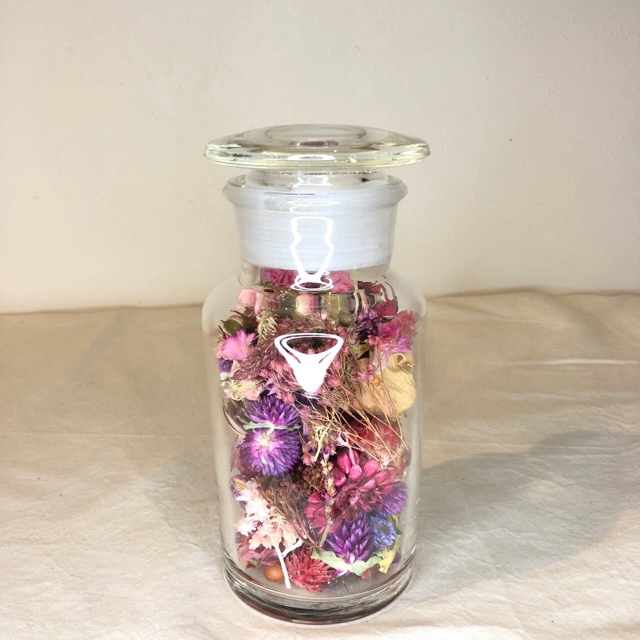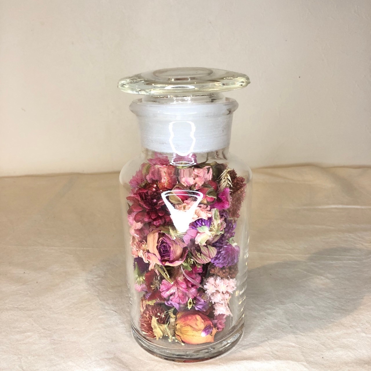 見る角度で様々な表情が楽しめる瓶詰ドライフラワー。