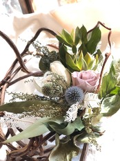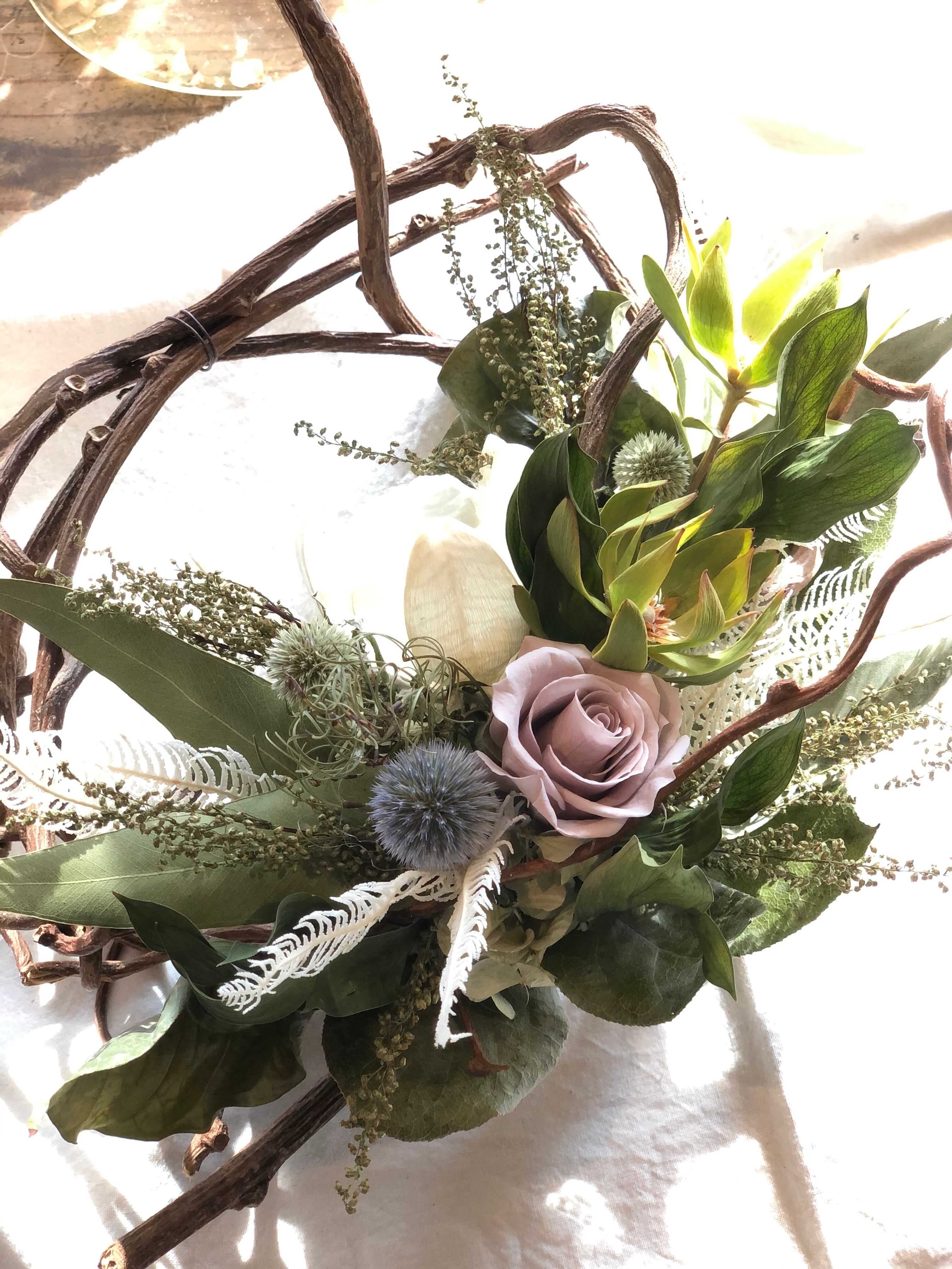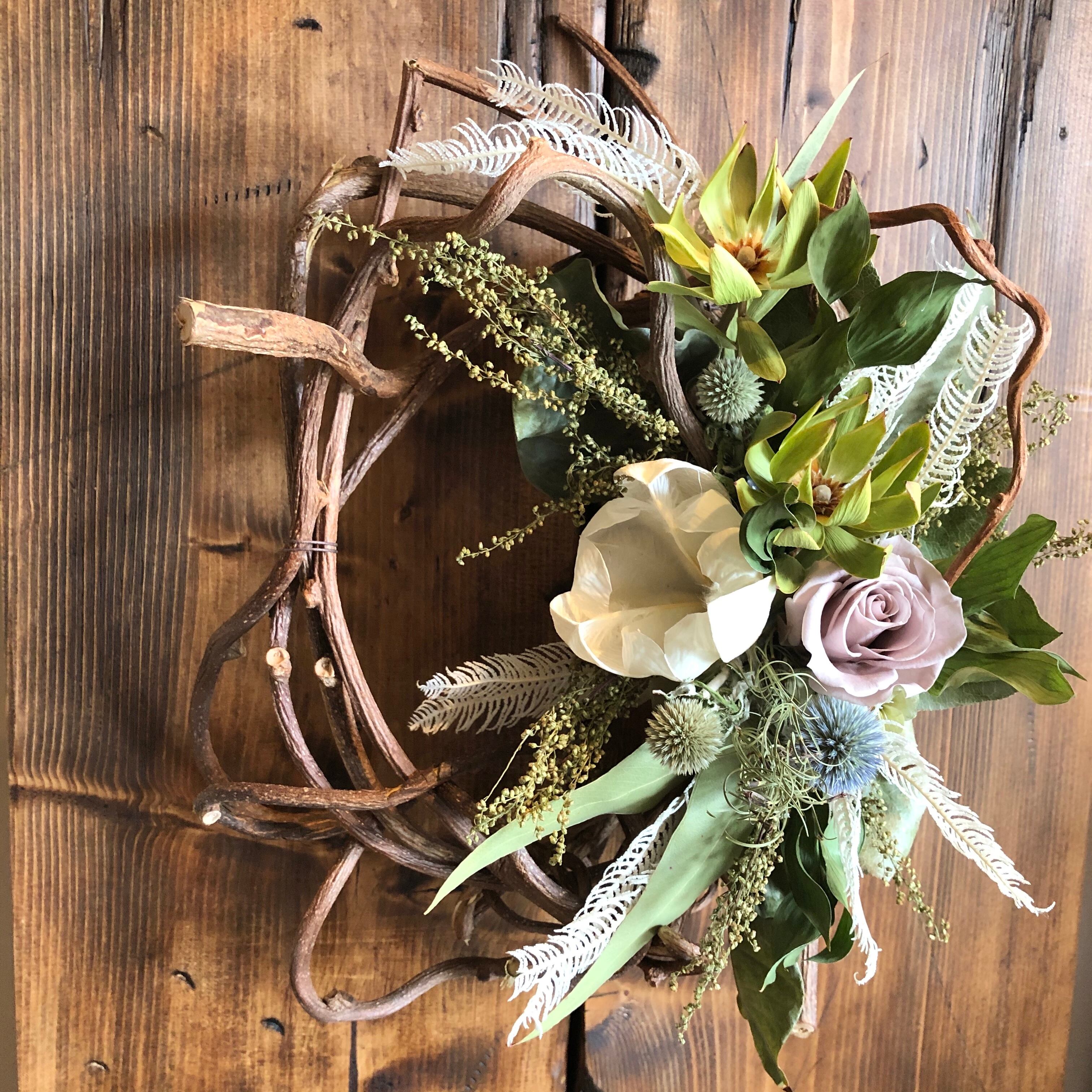 キウイヅルをランダムにまとめたベースに白グリーン系の花材をアレンジ。