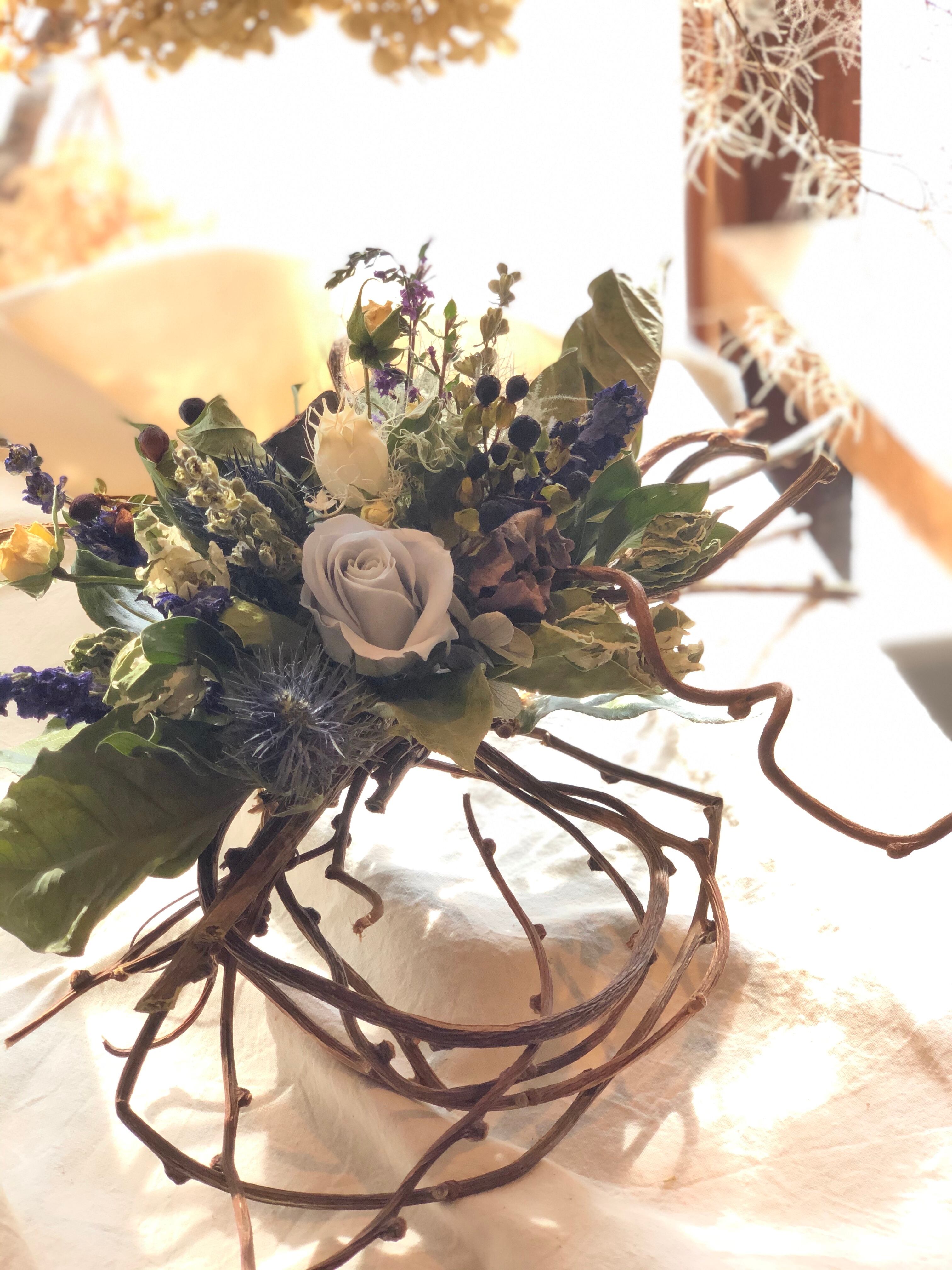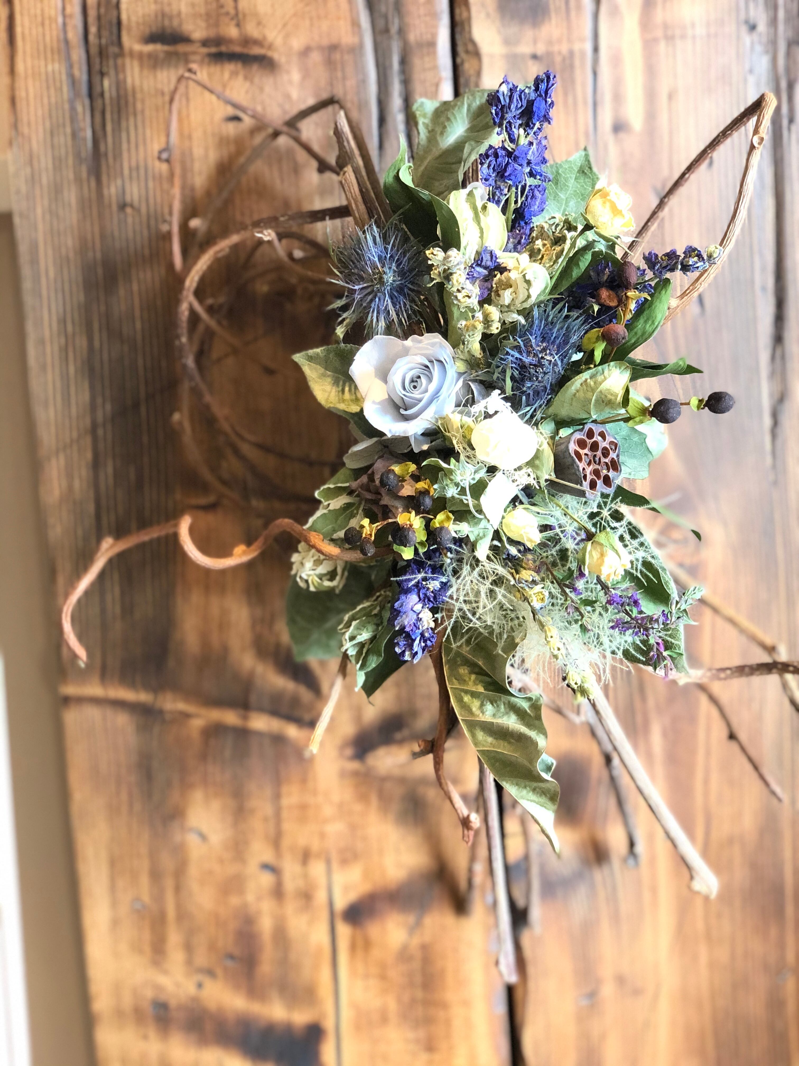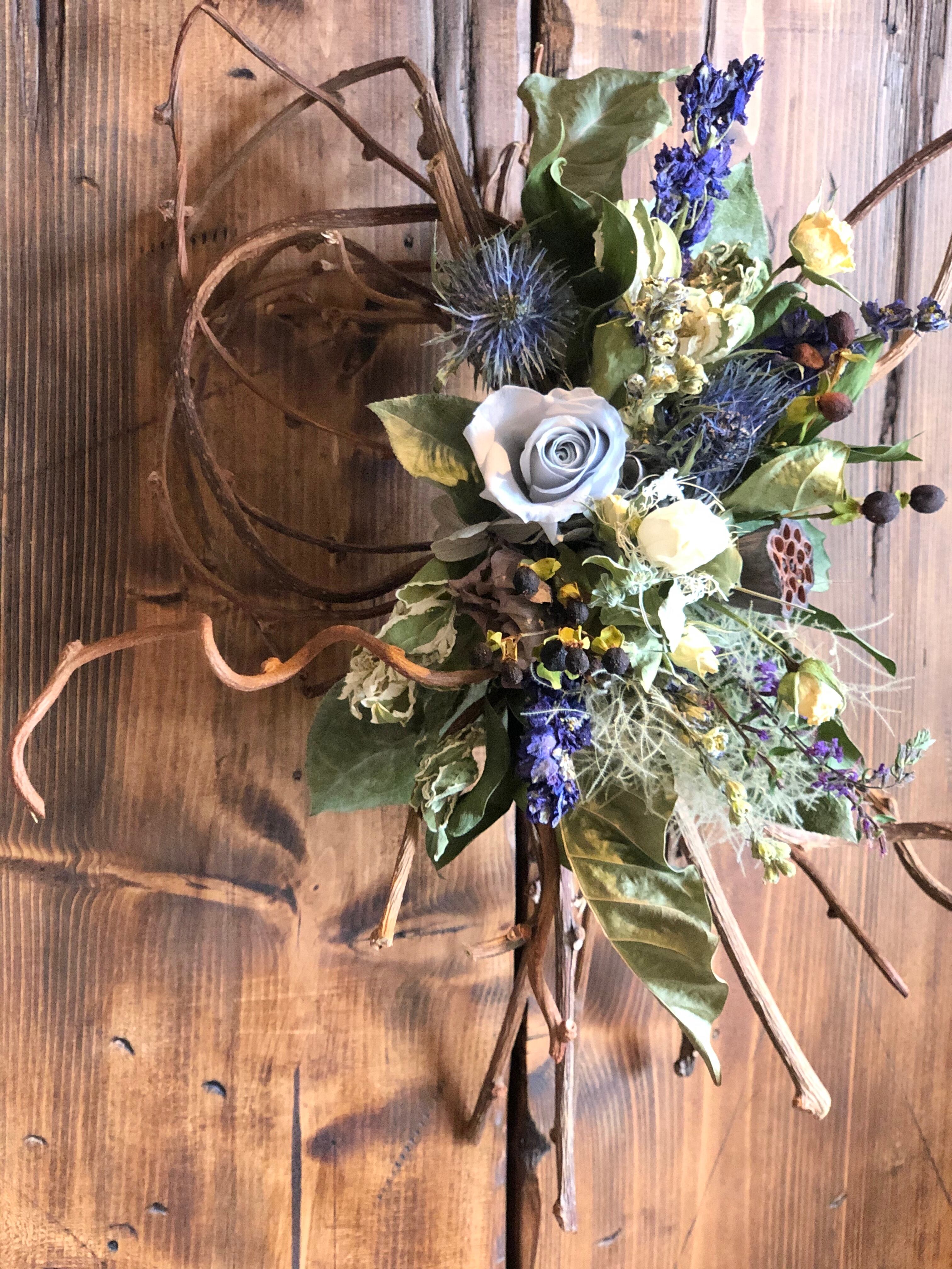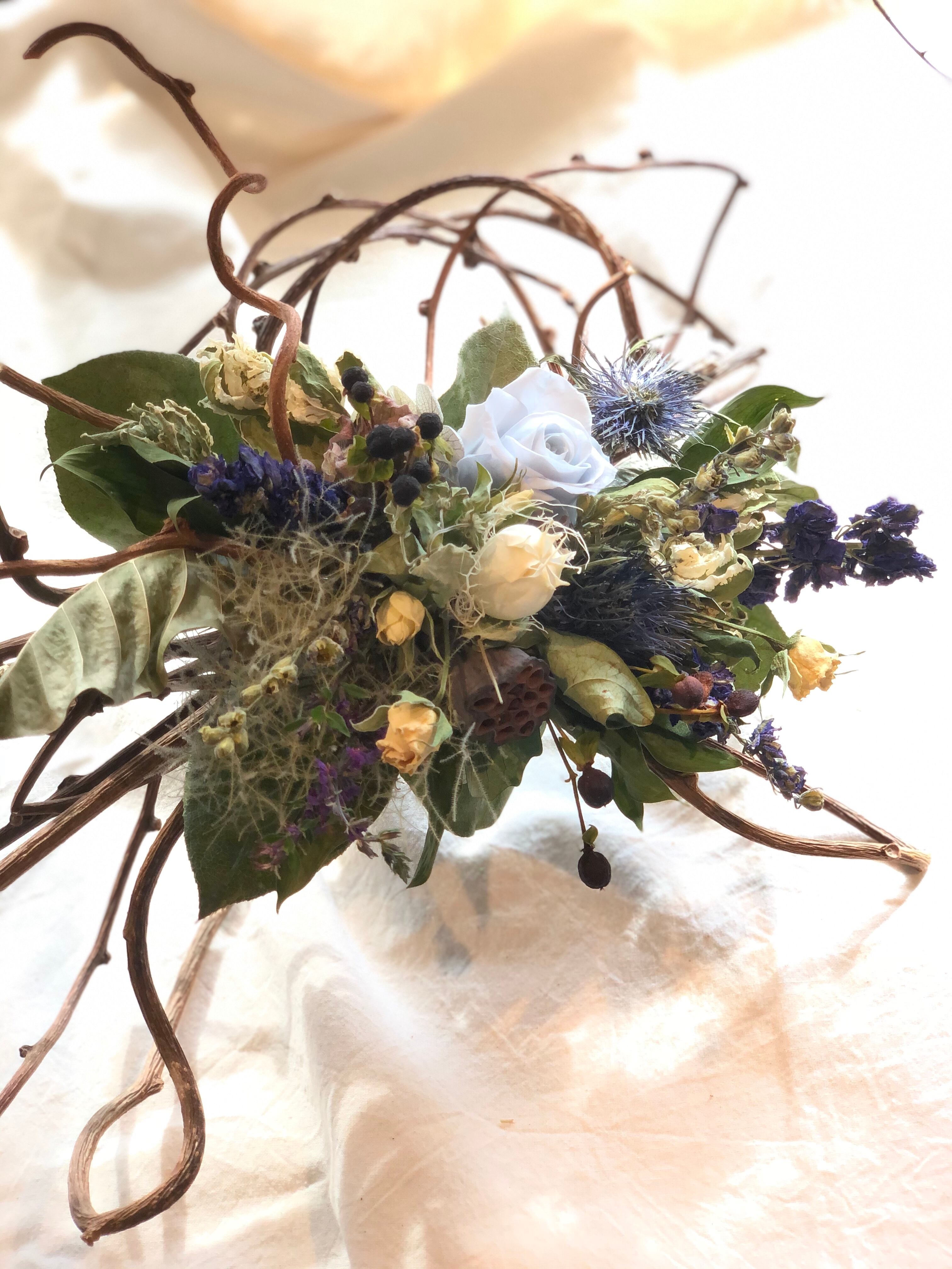少し変わった形にまとめたキウイヅルに白ブルー系のドライフラワーをアレンジしました。