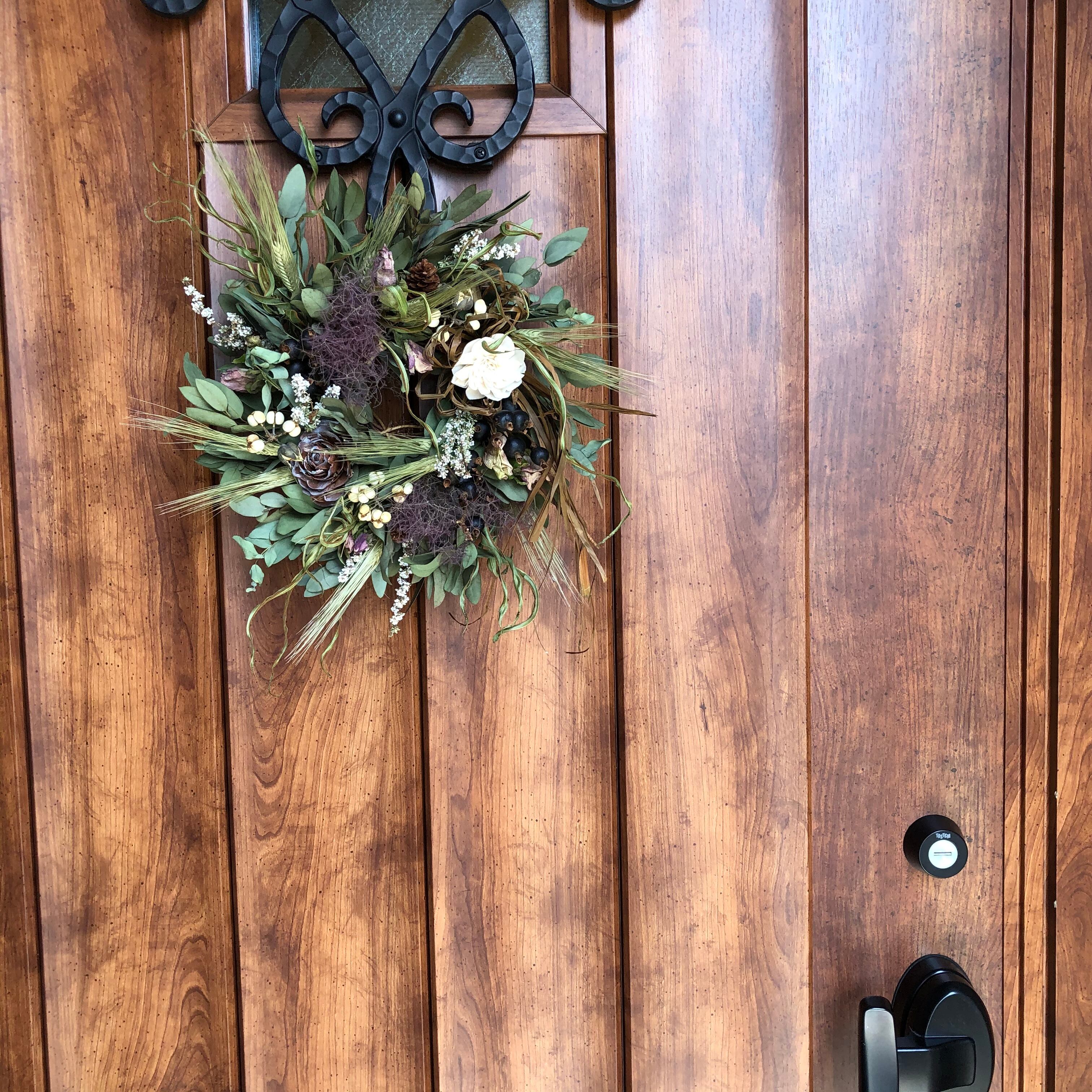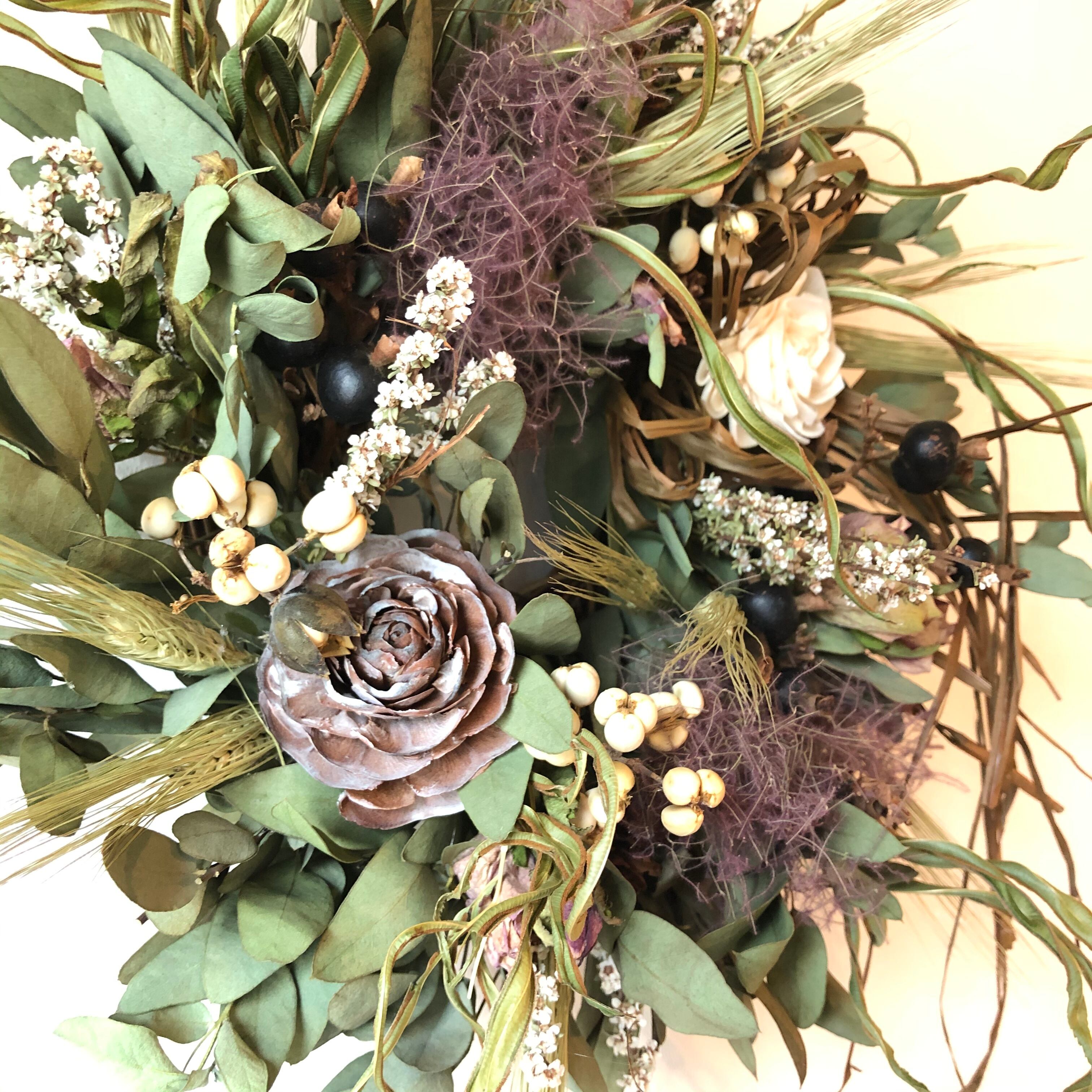 ユーカリの葉をスパイラル状につけ、ブラックベリーやナンキンハゼなどの木の実もたっぷりと入れた、初秋の色合いのナチュラルリースです。