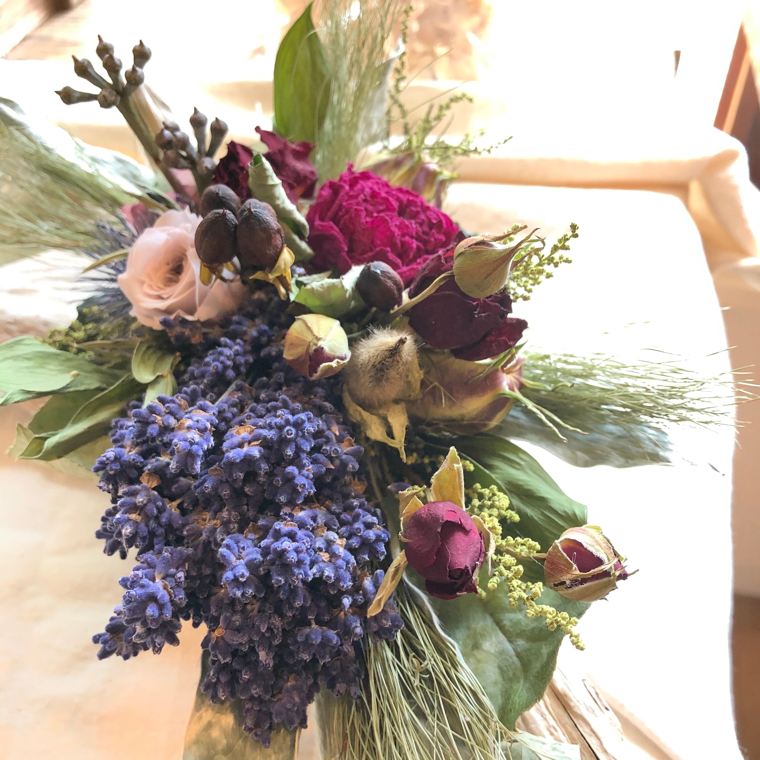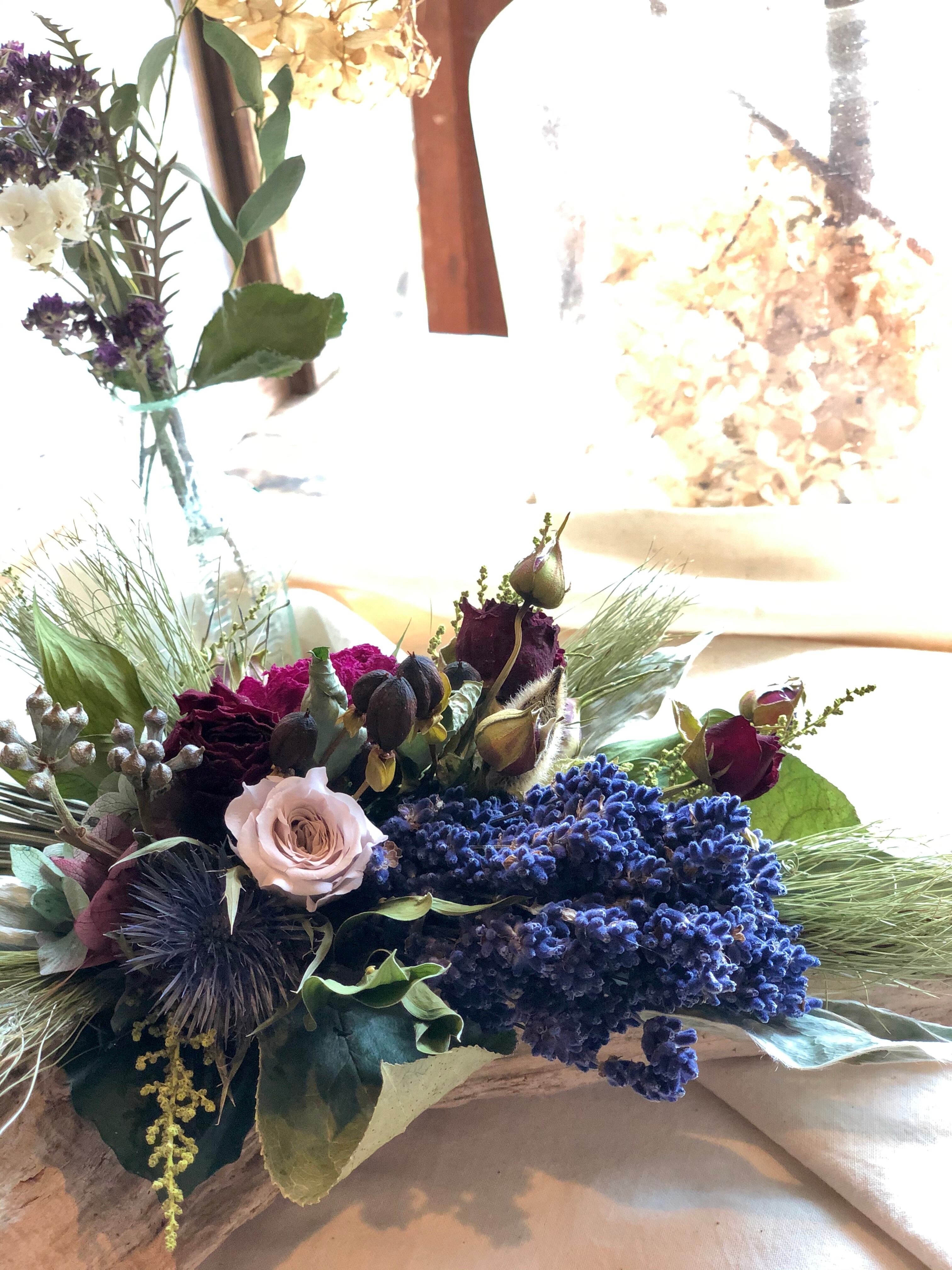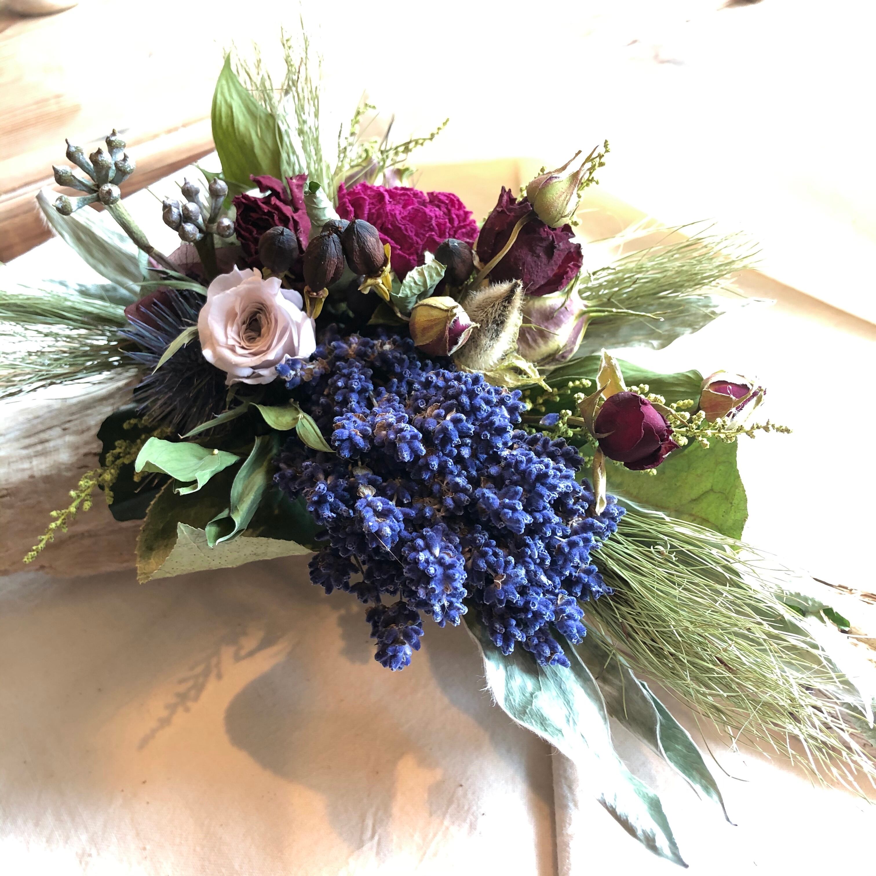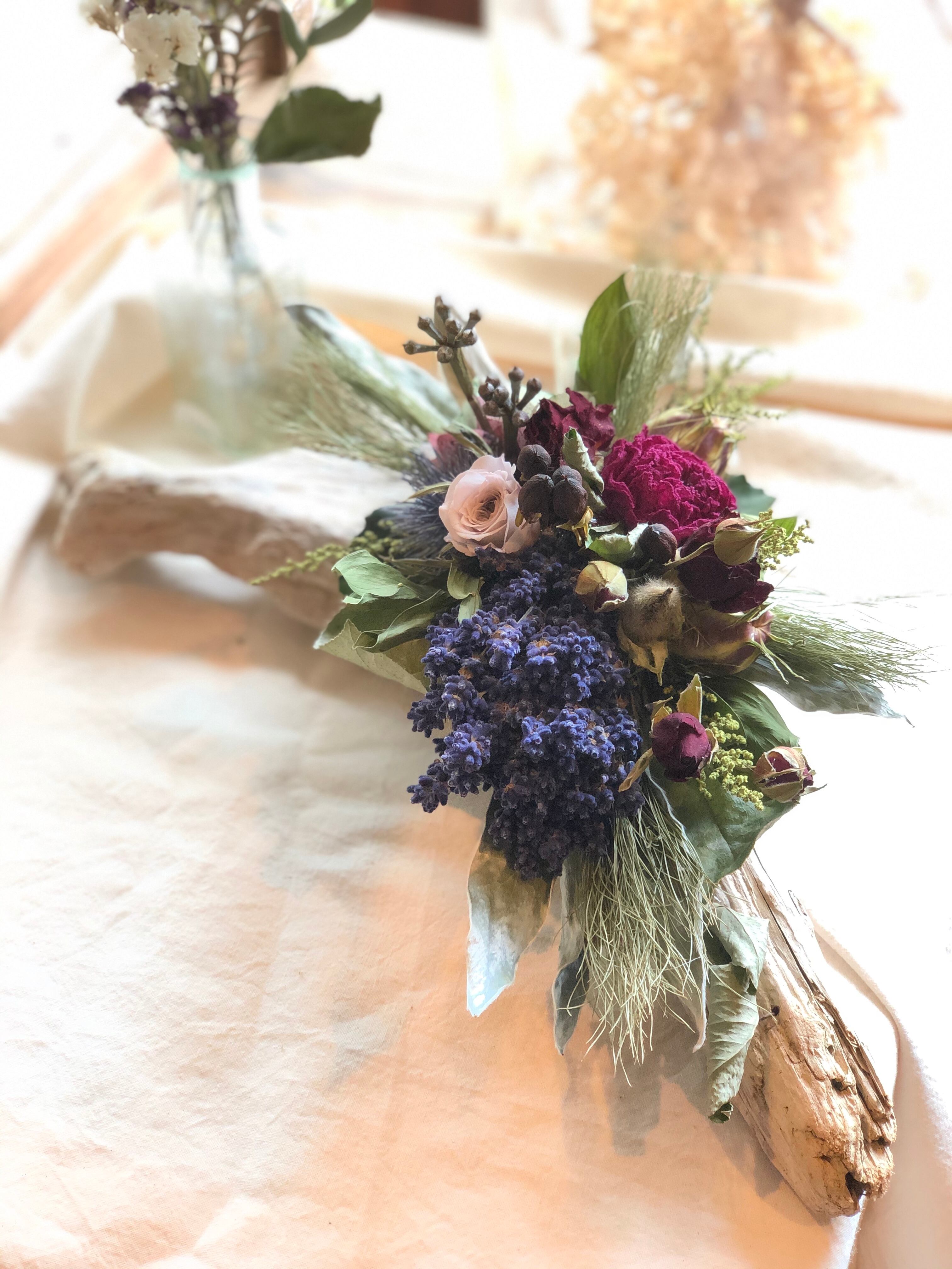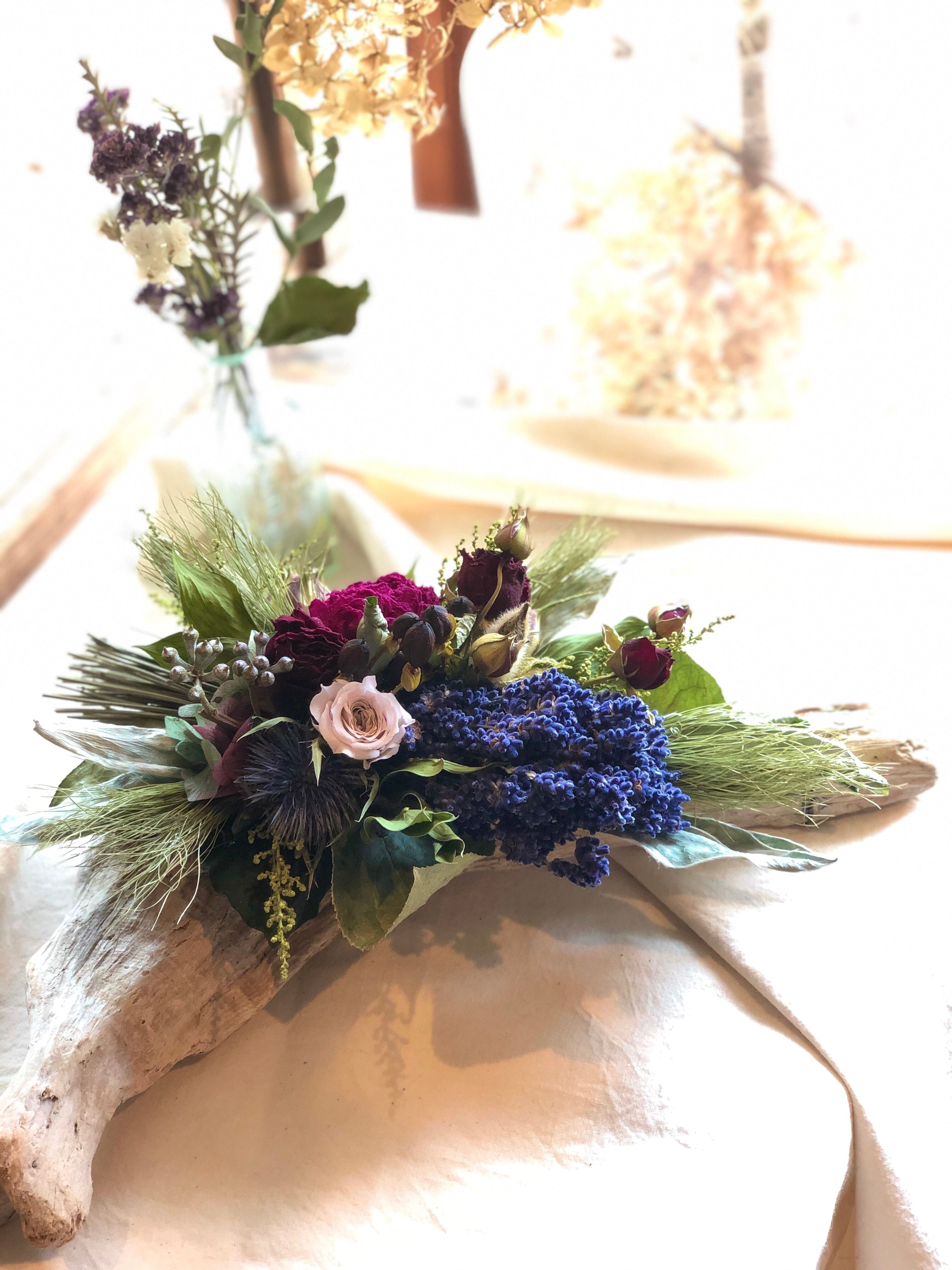 北海道産のラベンダーをたっぷりと入れ、白い流木にアレンジ。