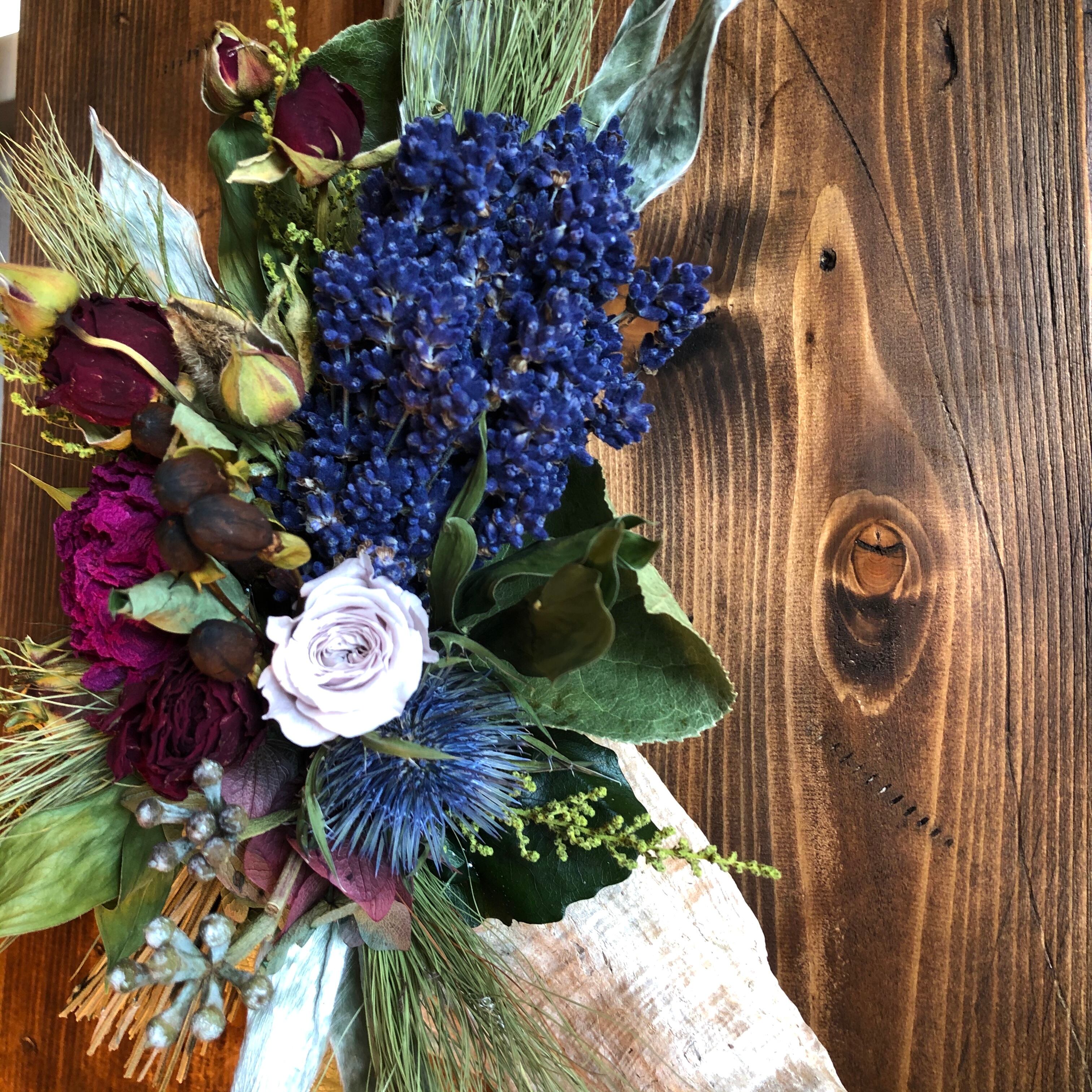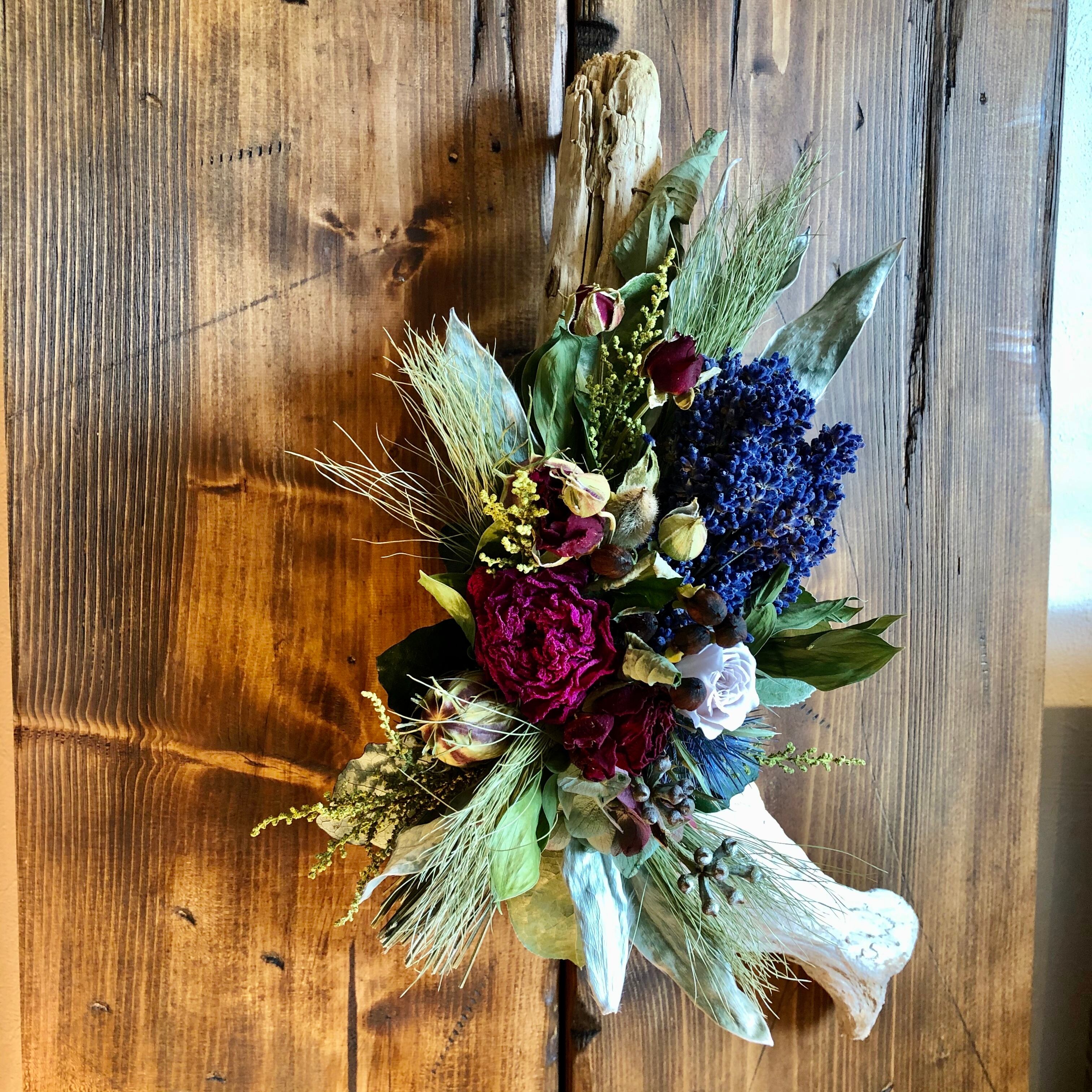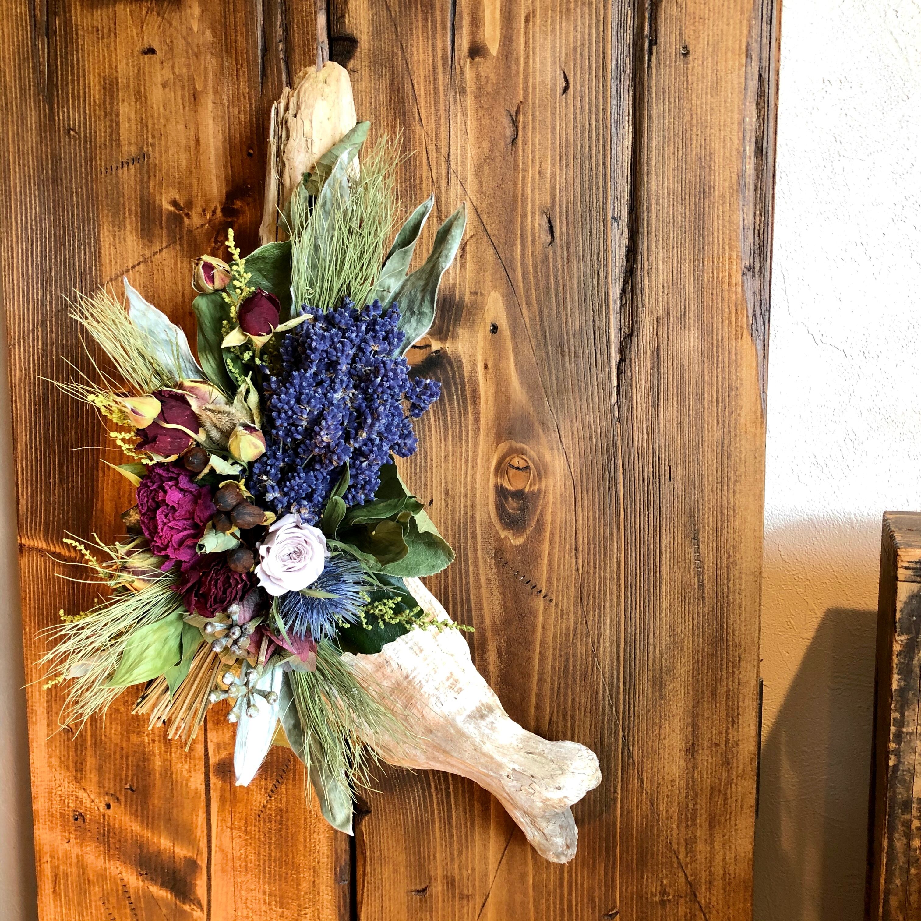 置いても、壁にかけて飾っても素敵です。香りも楽しめる流木のアレンジメントです。