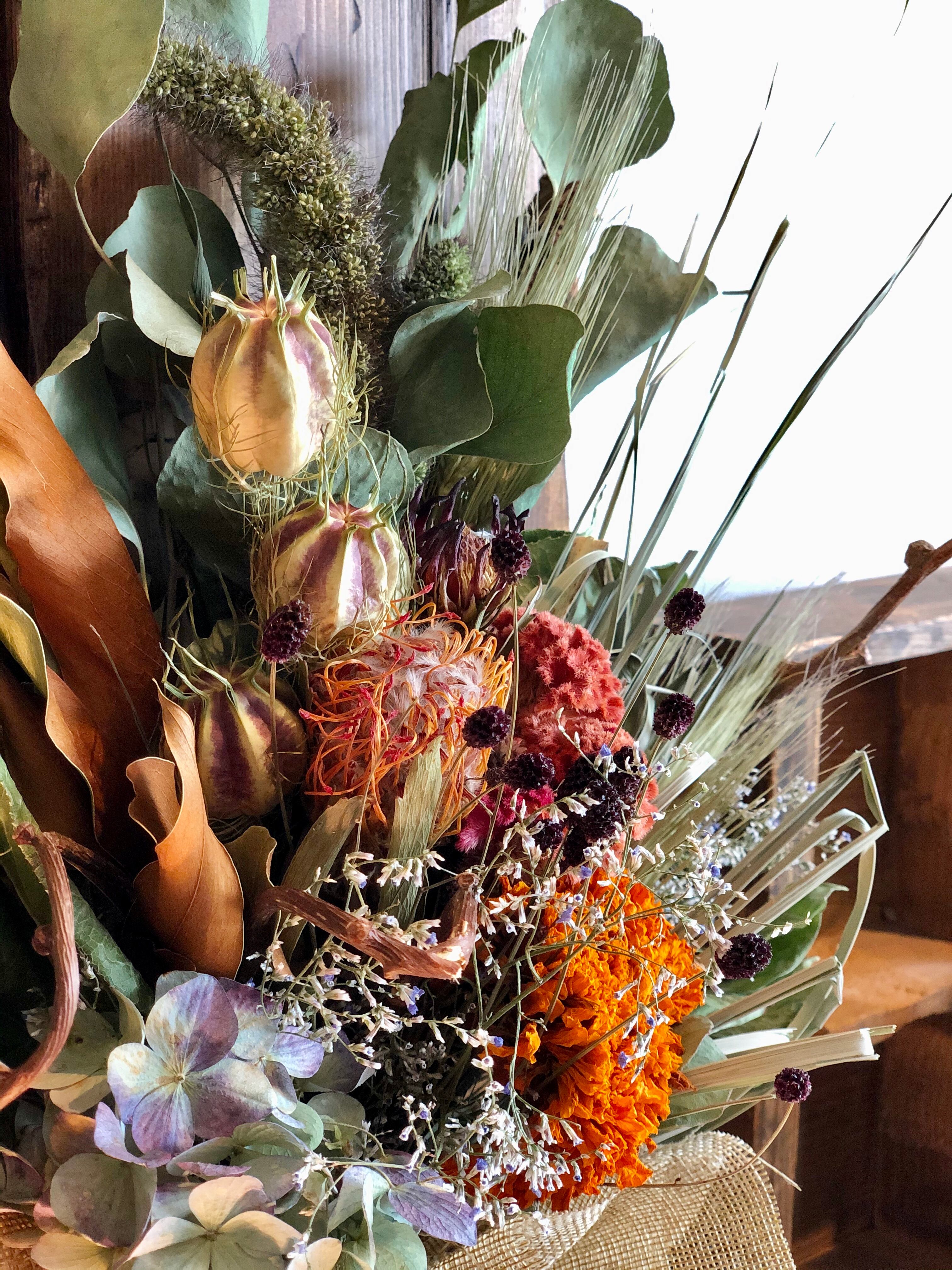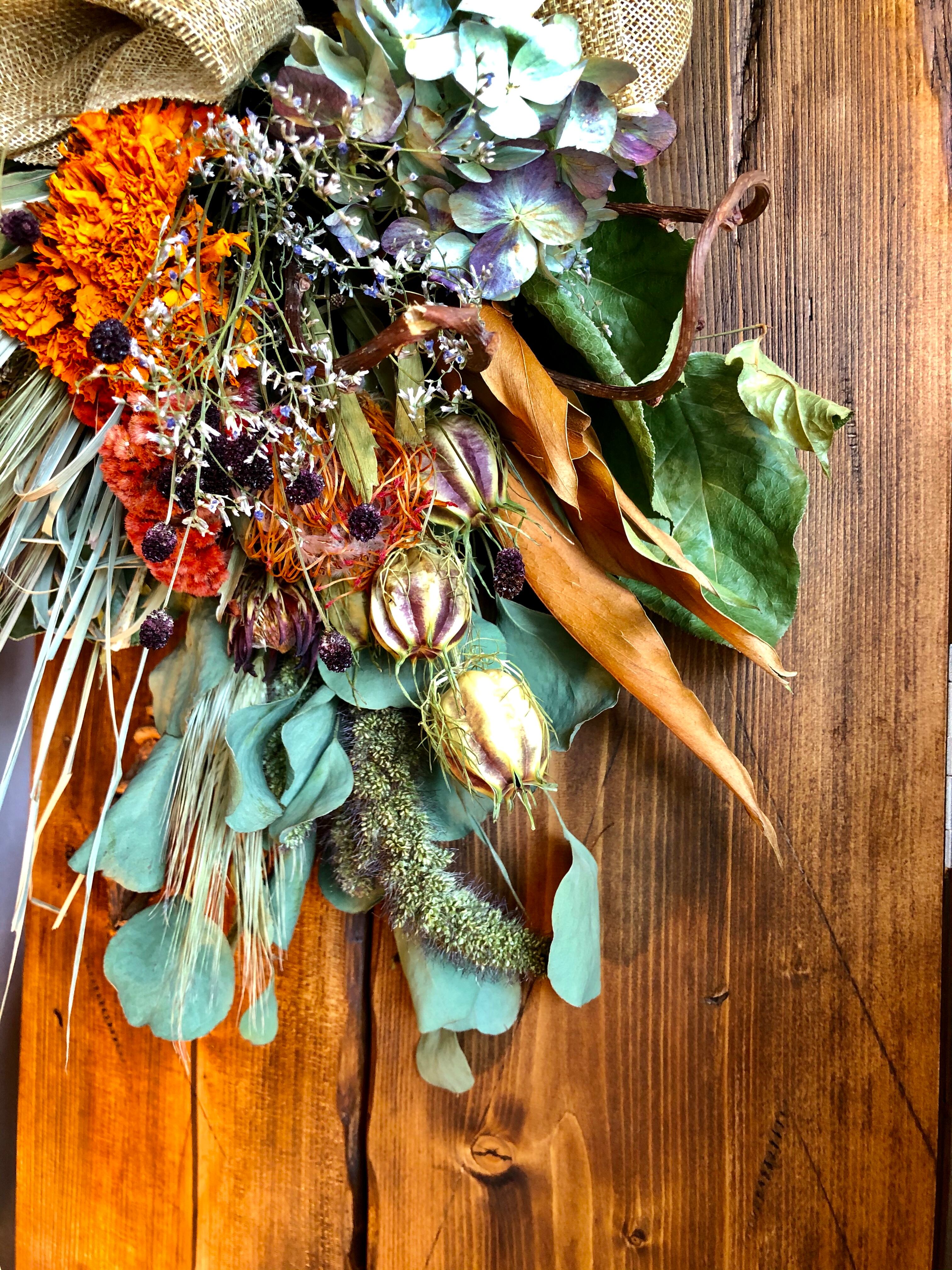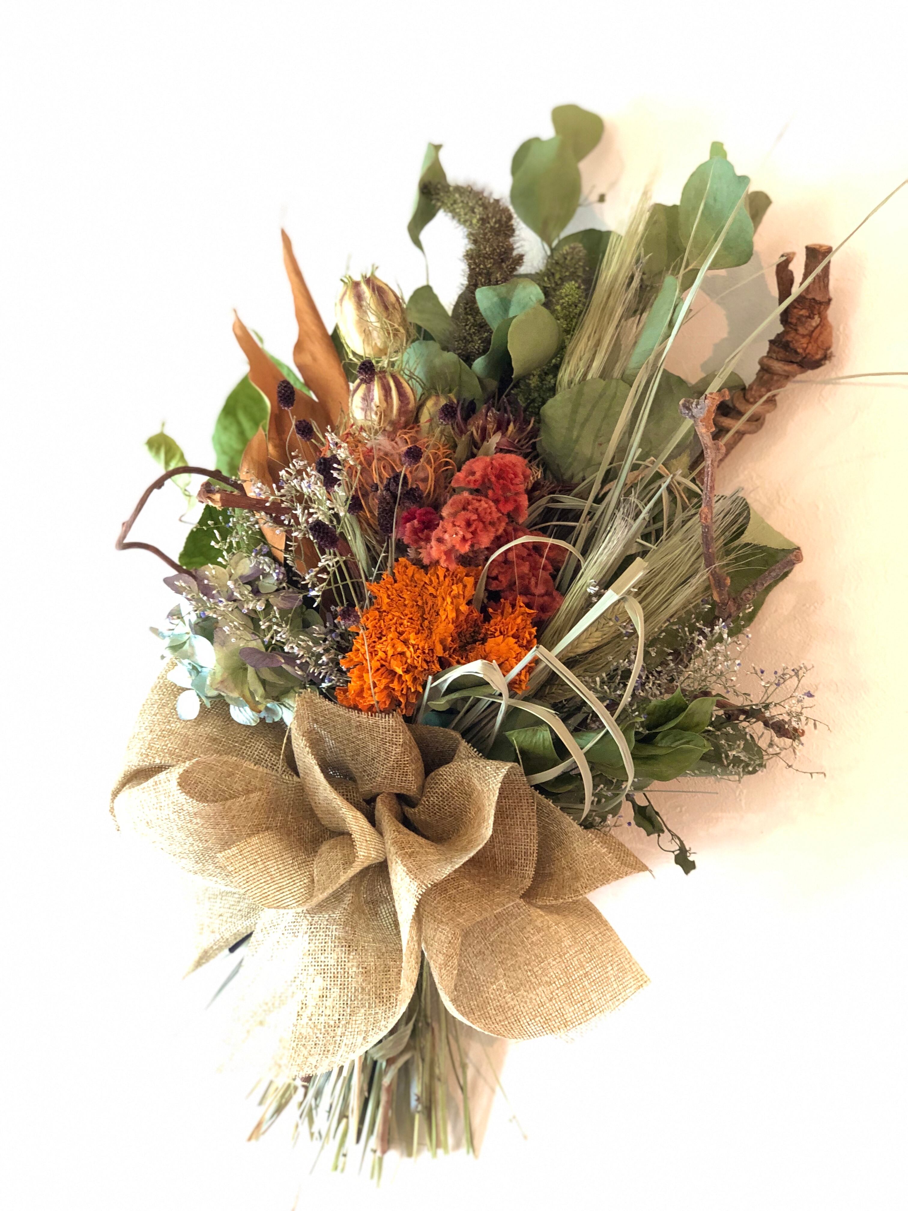 秋色の花材をざっくりと。キウイヅルやレモングラスの葉も入れた、ナチュラルなスワッグです。人気のワイルドフラワー、ピンクッションをメインに、マリーゴールドやこっくりとしたオレンジのケイトウ、ボルドーカラーのワレモコウも可愛いです。