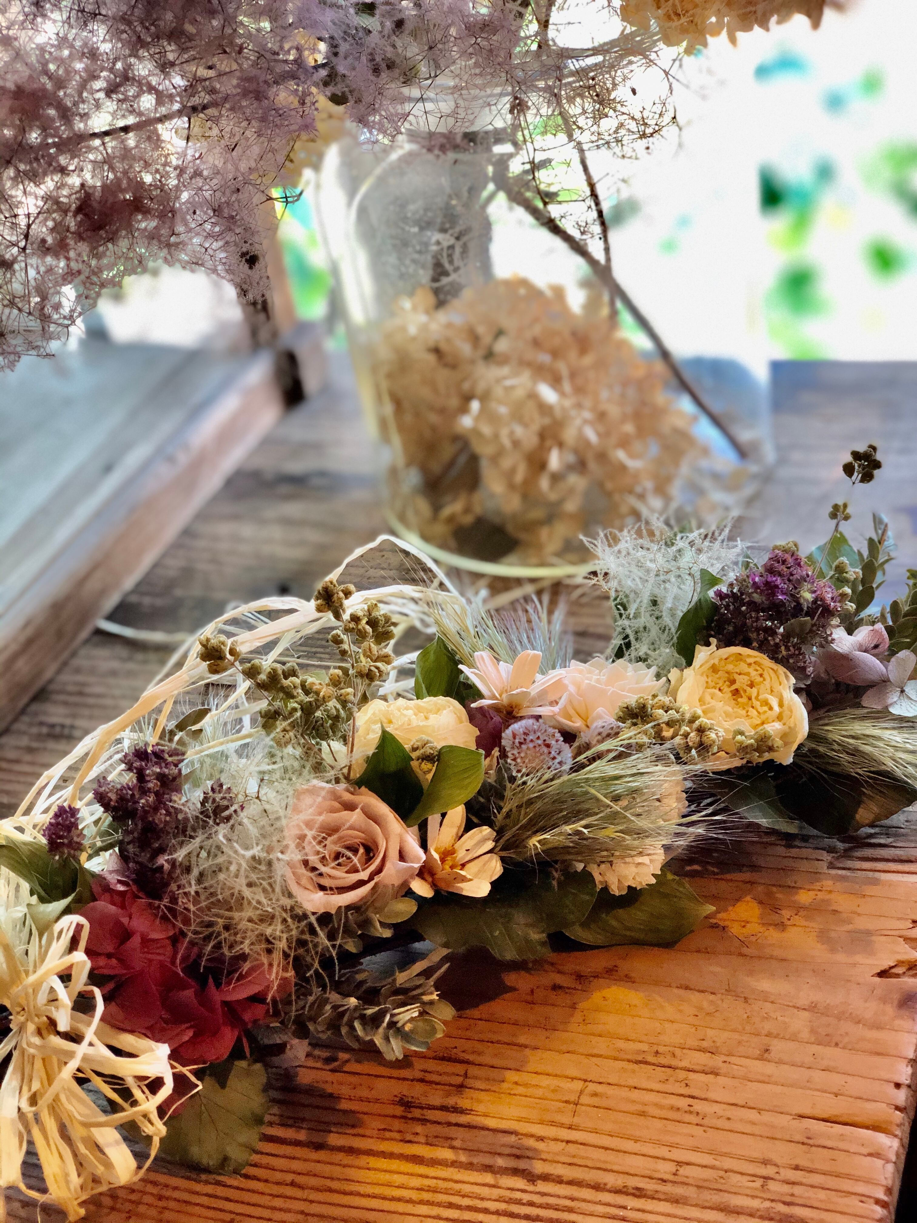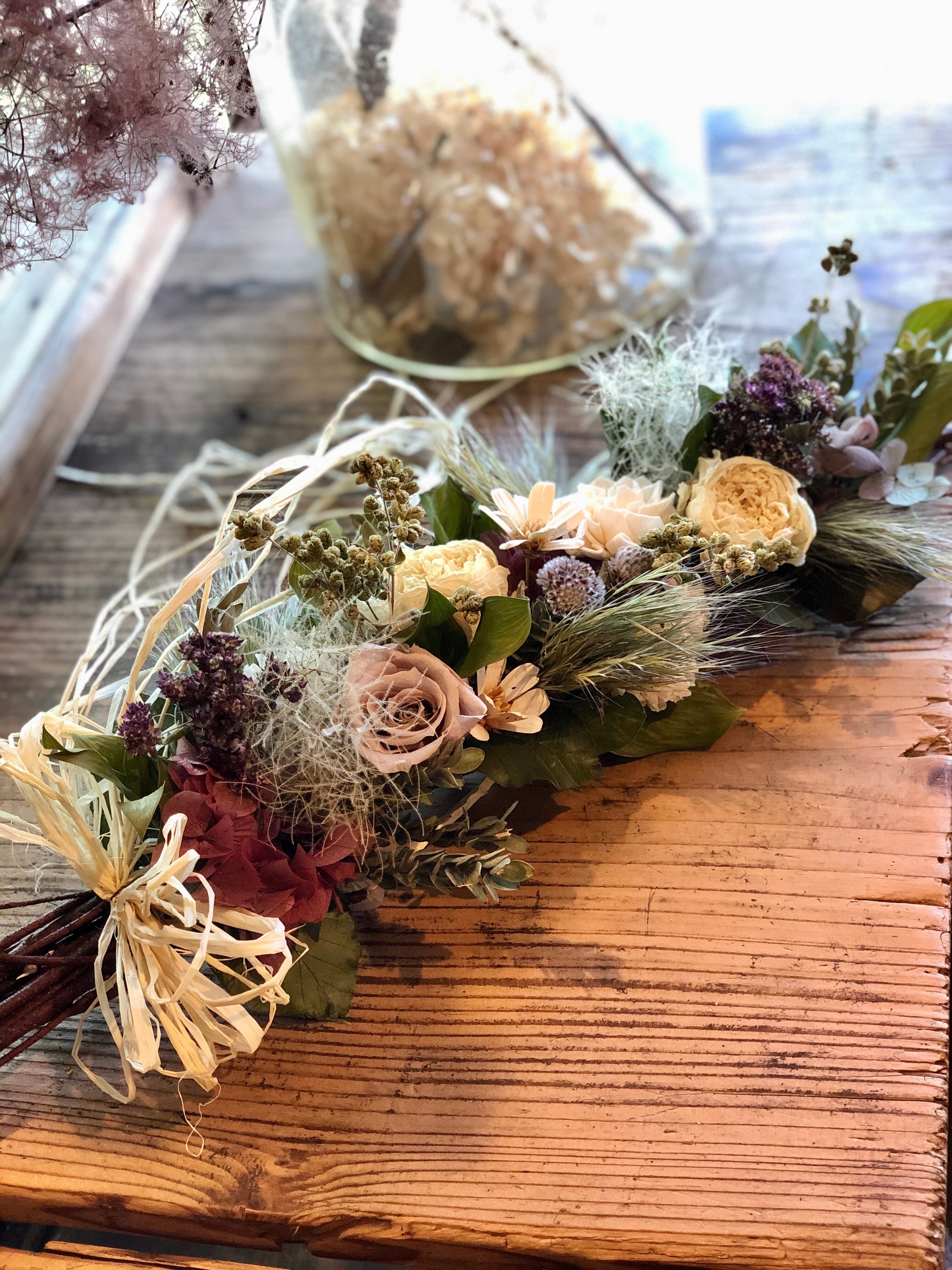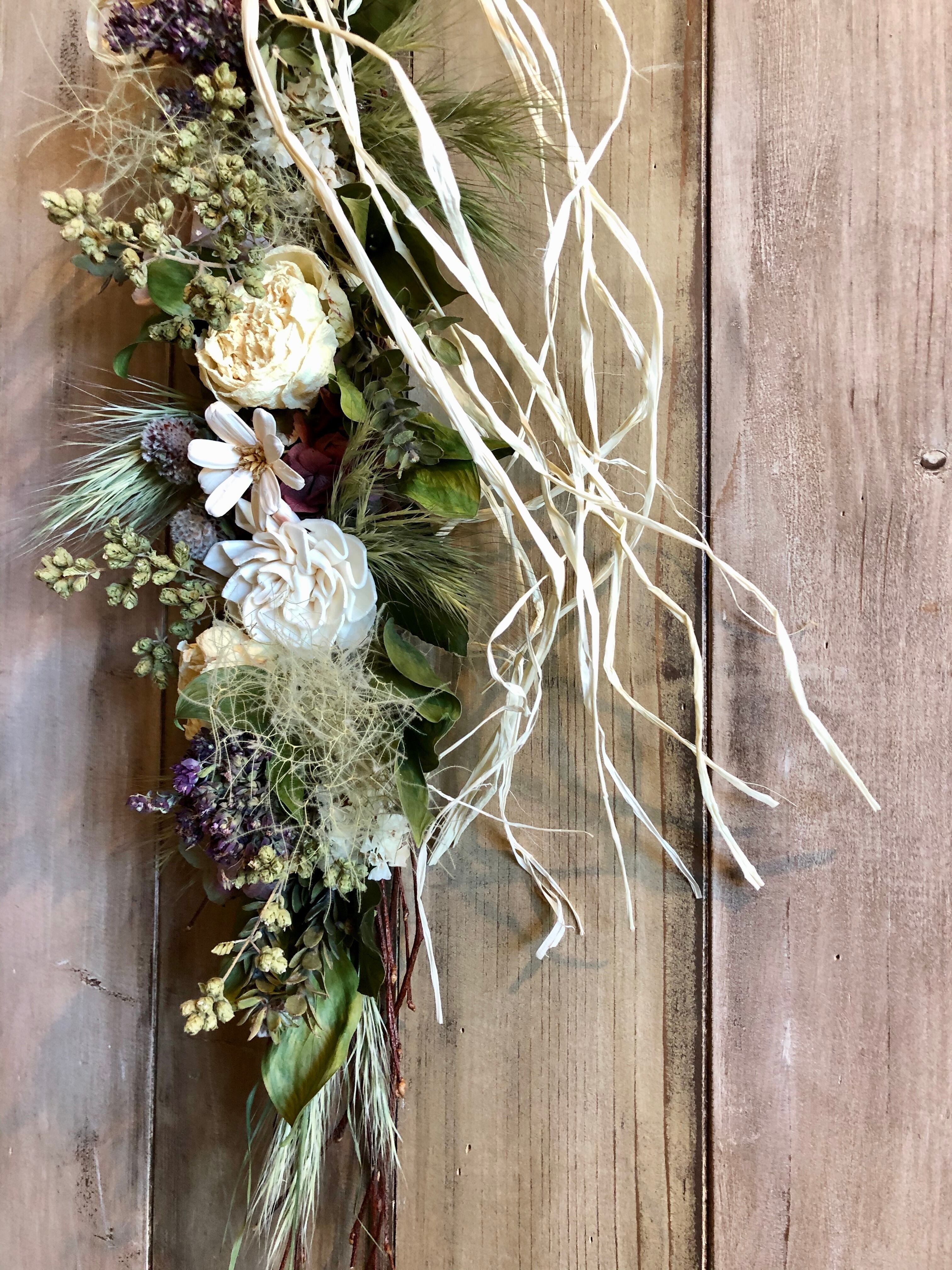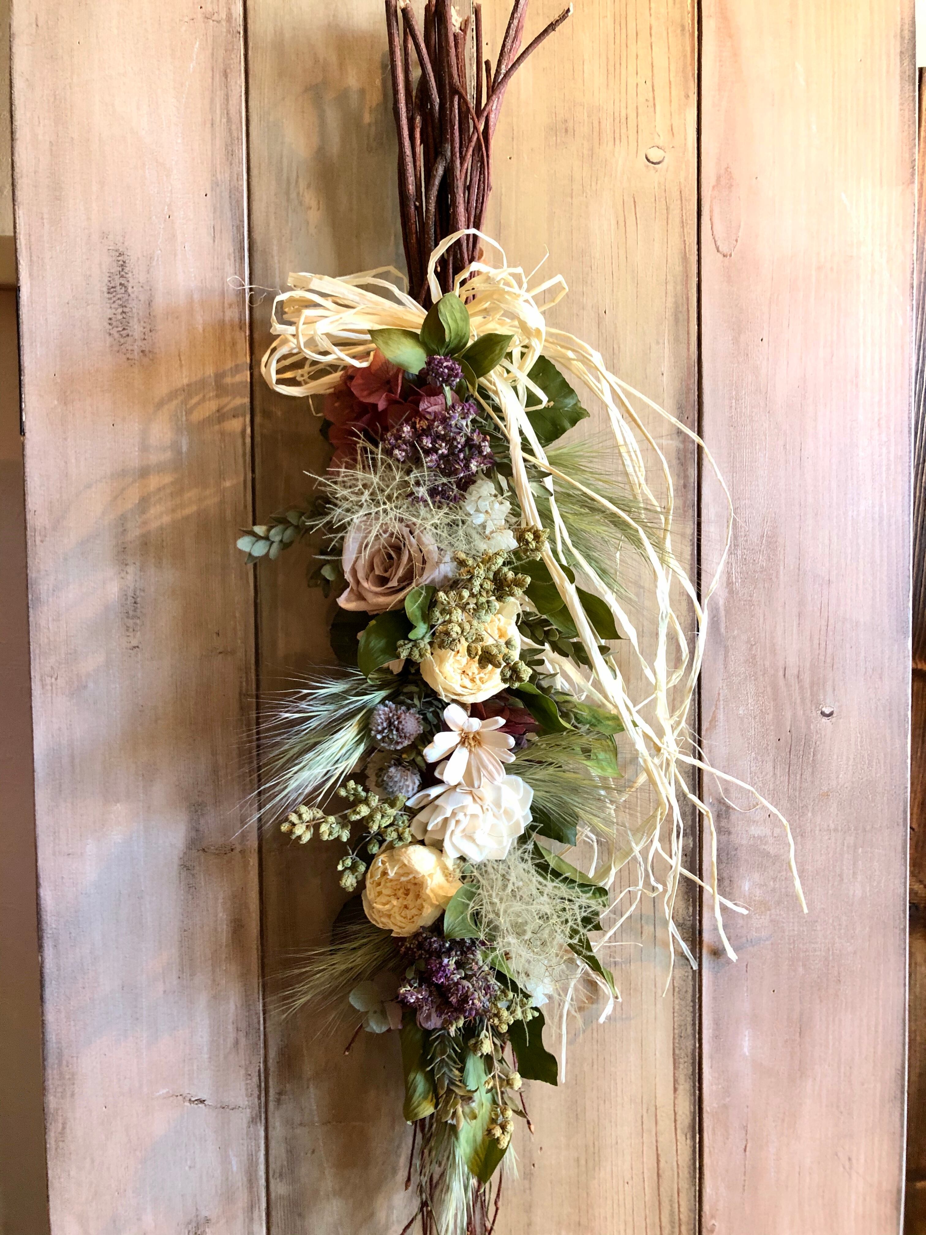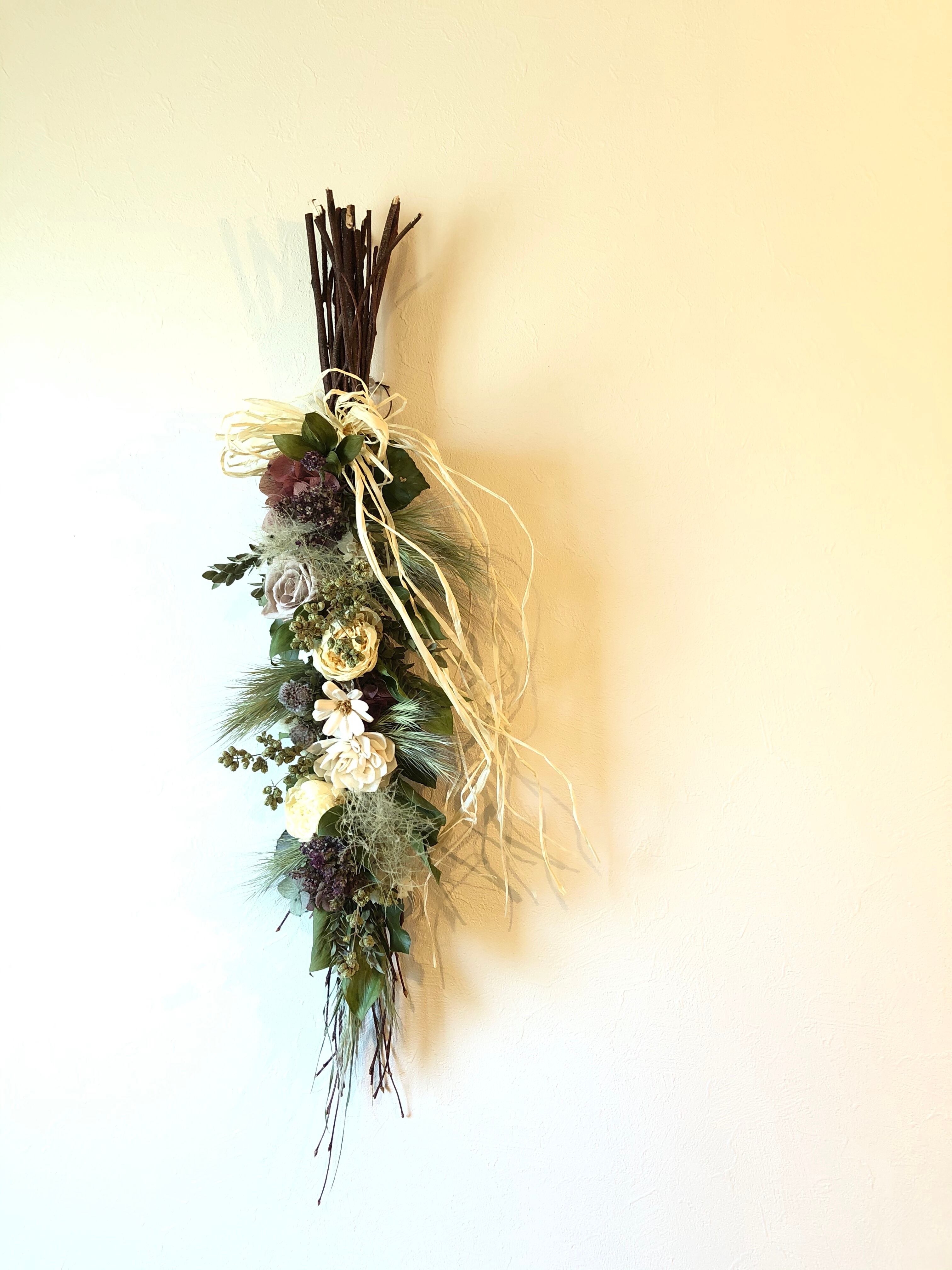 白樺の枝をベースに、シャクヤクや紫陽花、スモークツリーなどシックな色合いの壁飾りです。