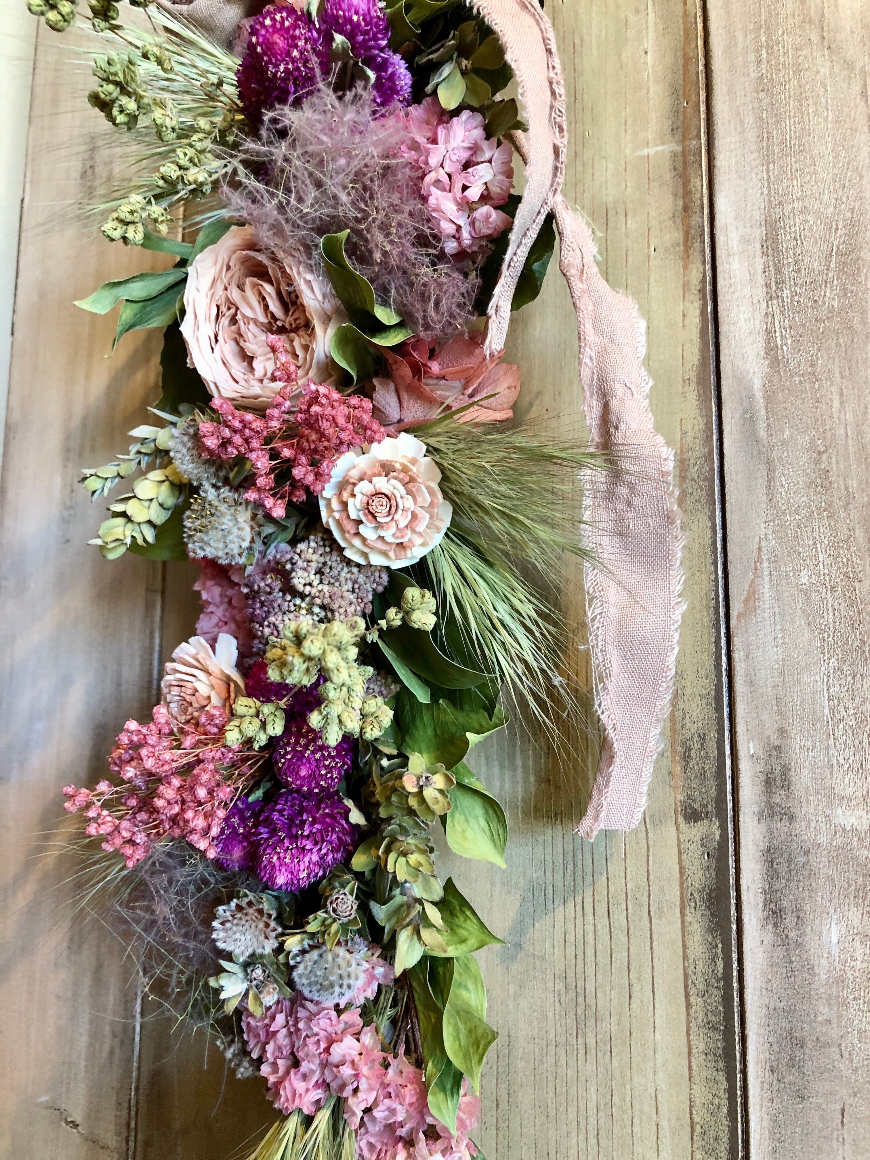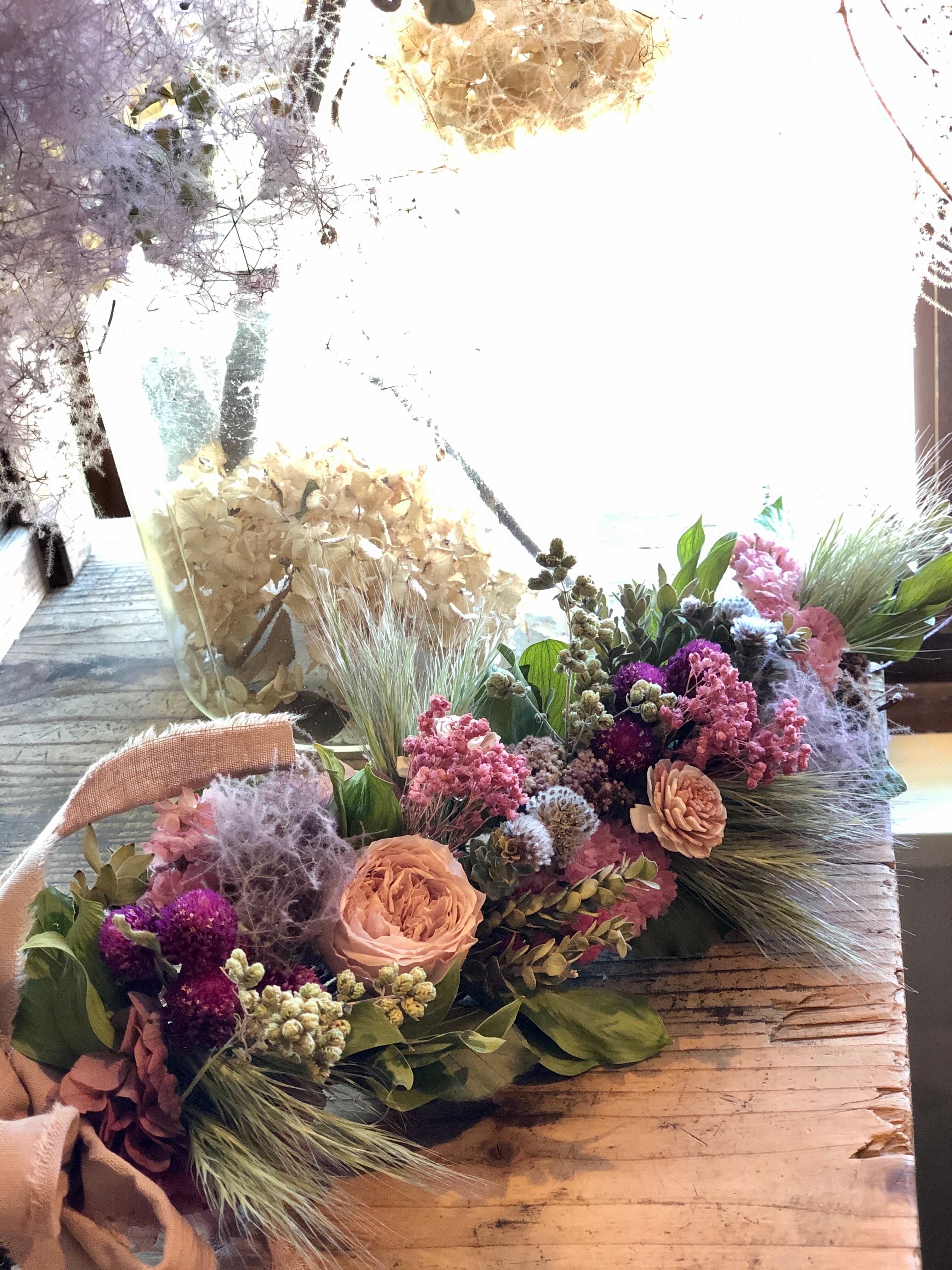白樺の枝をベースに、スターチスや千日紅にパープル系の花材やボルドーのスモークツリーもプラスした、シックなピンク系の壁飾りです。