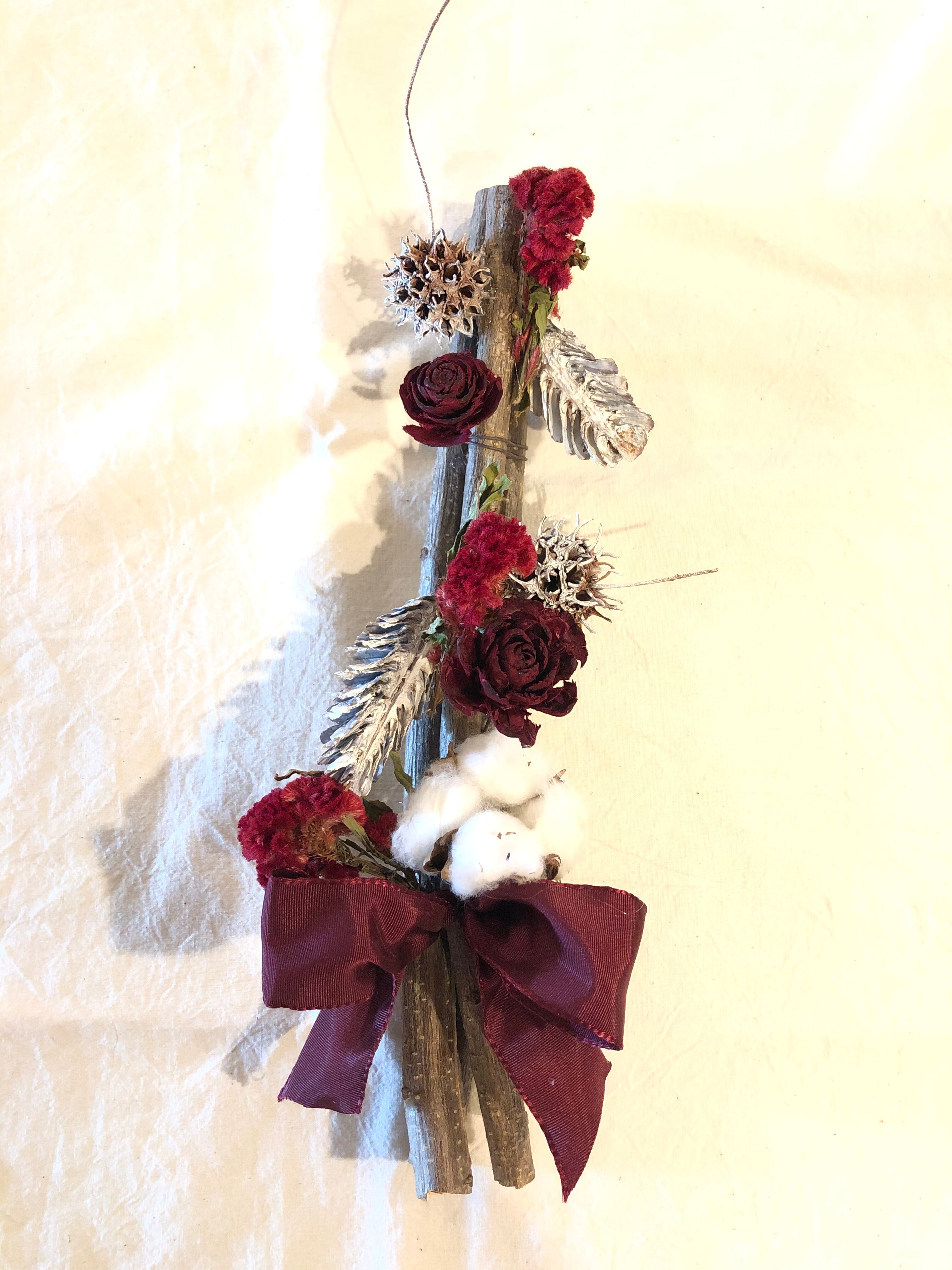 ⑤野ばらの実や小枝、ミニバラなどを高さをつけるようにグルーガンでつけ、出来上がり。