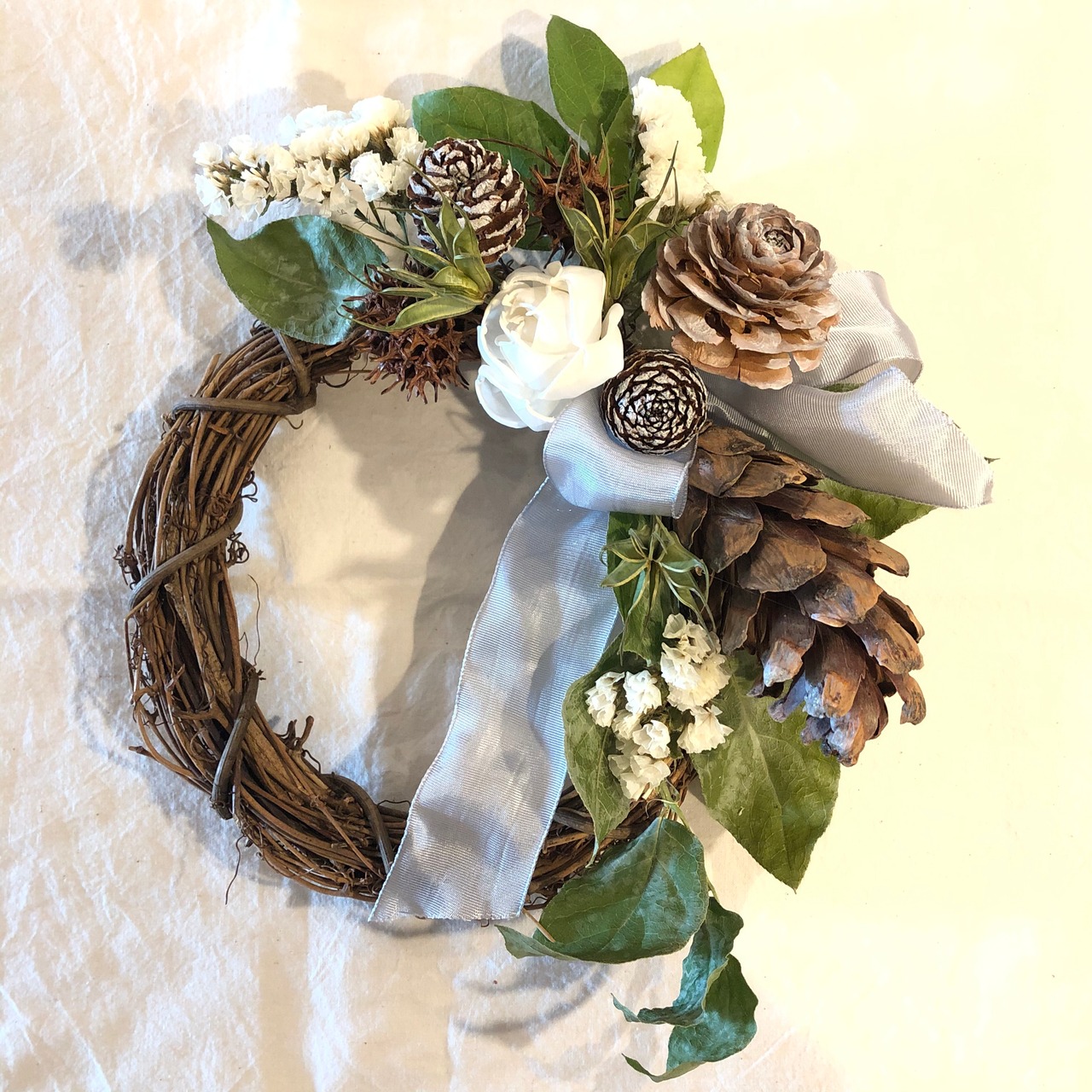 20㎝のリースベースに白グリーンのシックな花材をたっぷりと入れた、