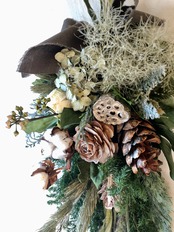 ヒムロスギや雑穀を束ねたベースに、クリスマスらしいコットンや松ぼっくりなどをアレンジしたスワッグ。