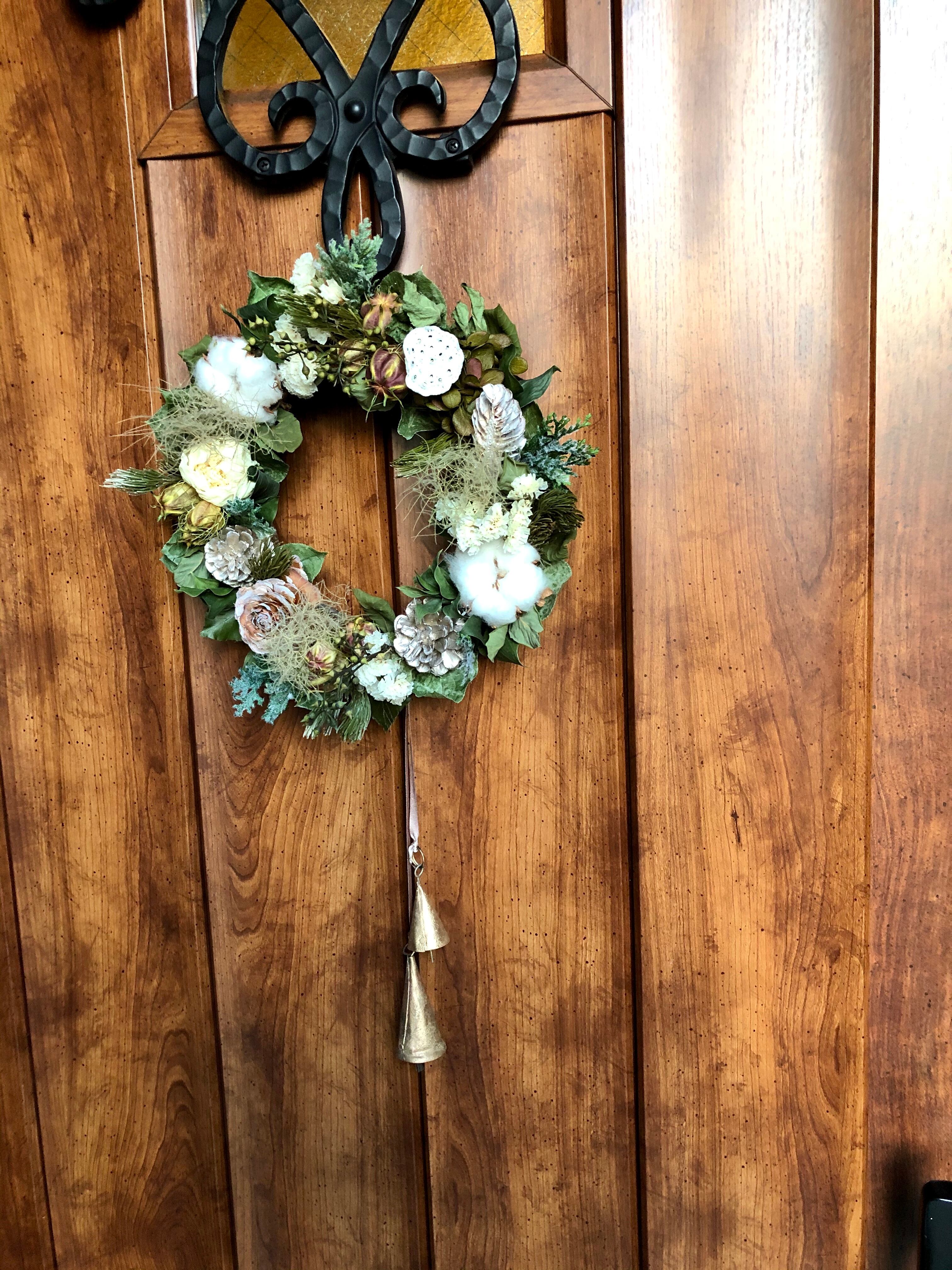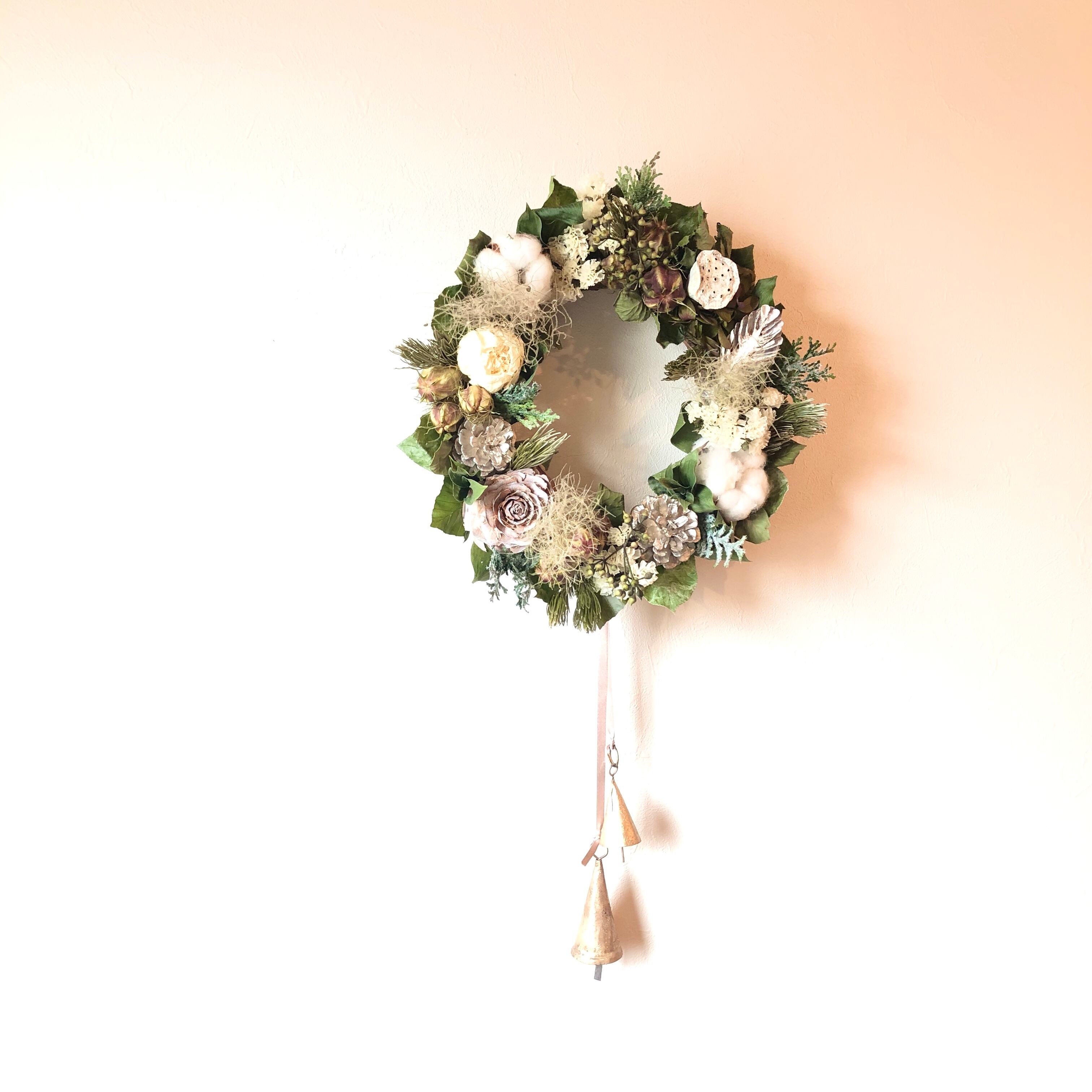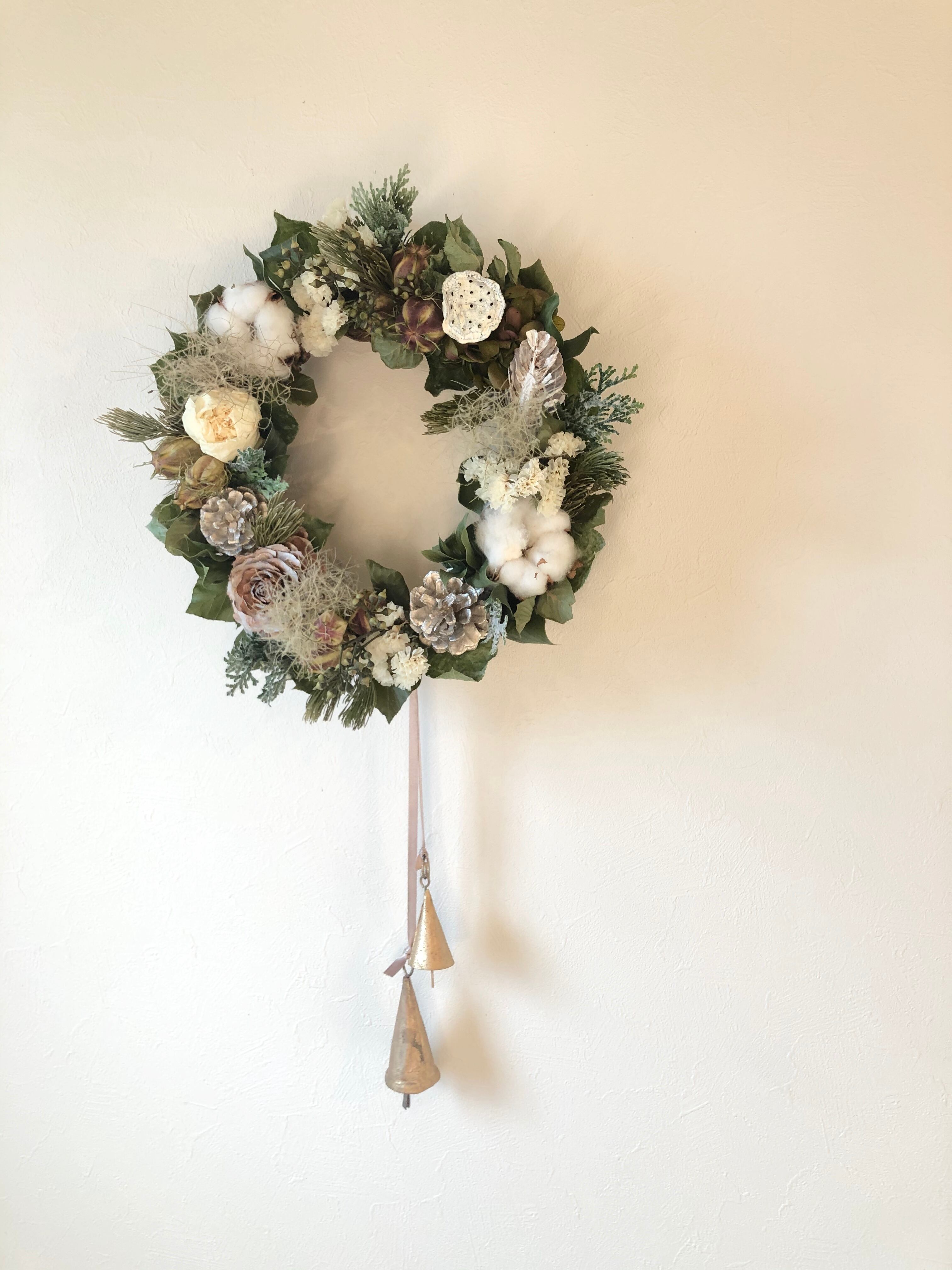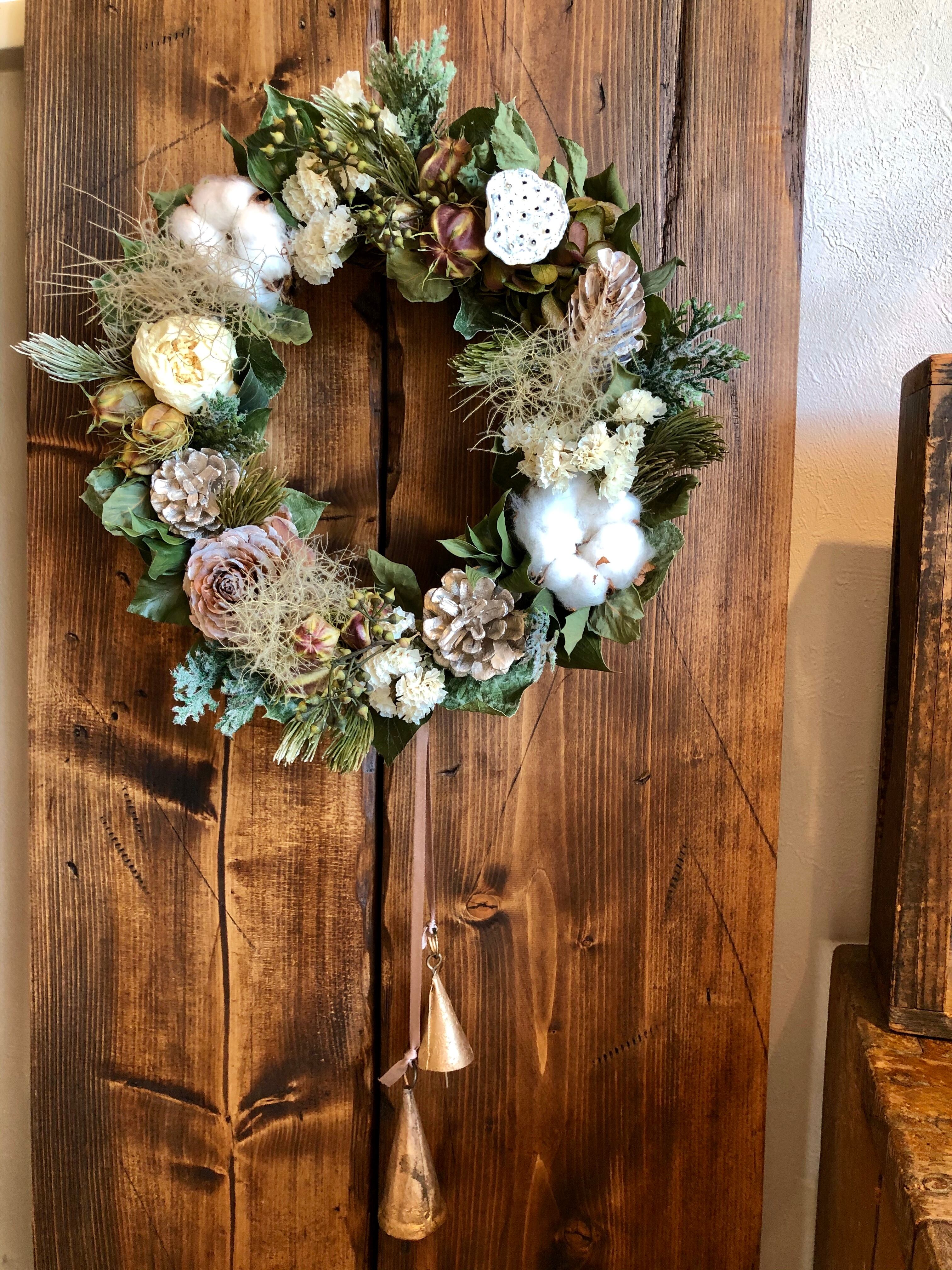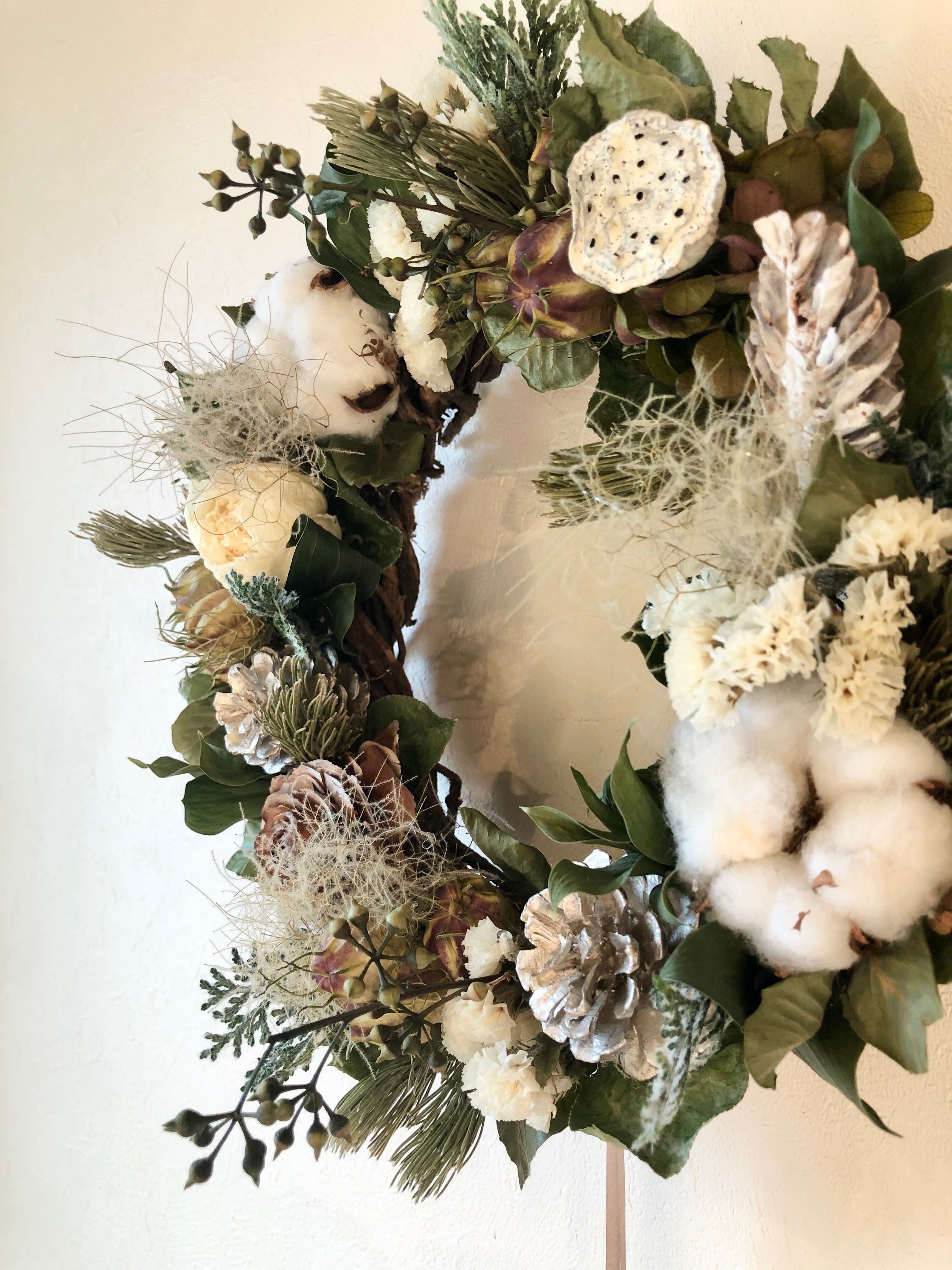 シックな白グリーン系のリースは、クリスマスを過ぎても飾っていただける、冬色リースです。