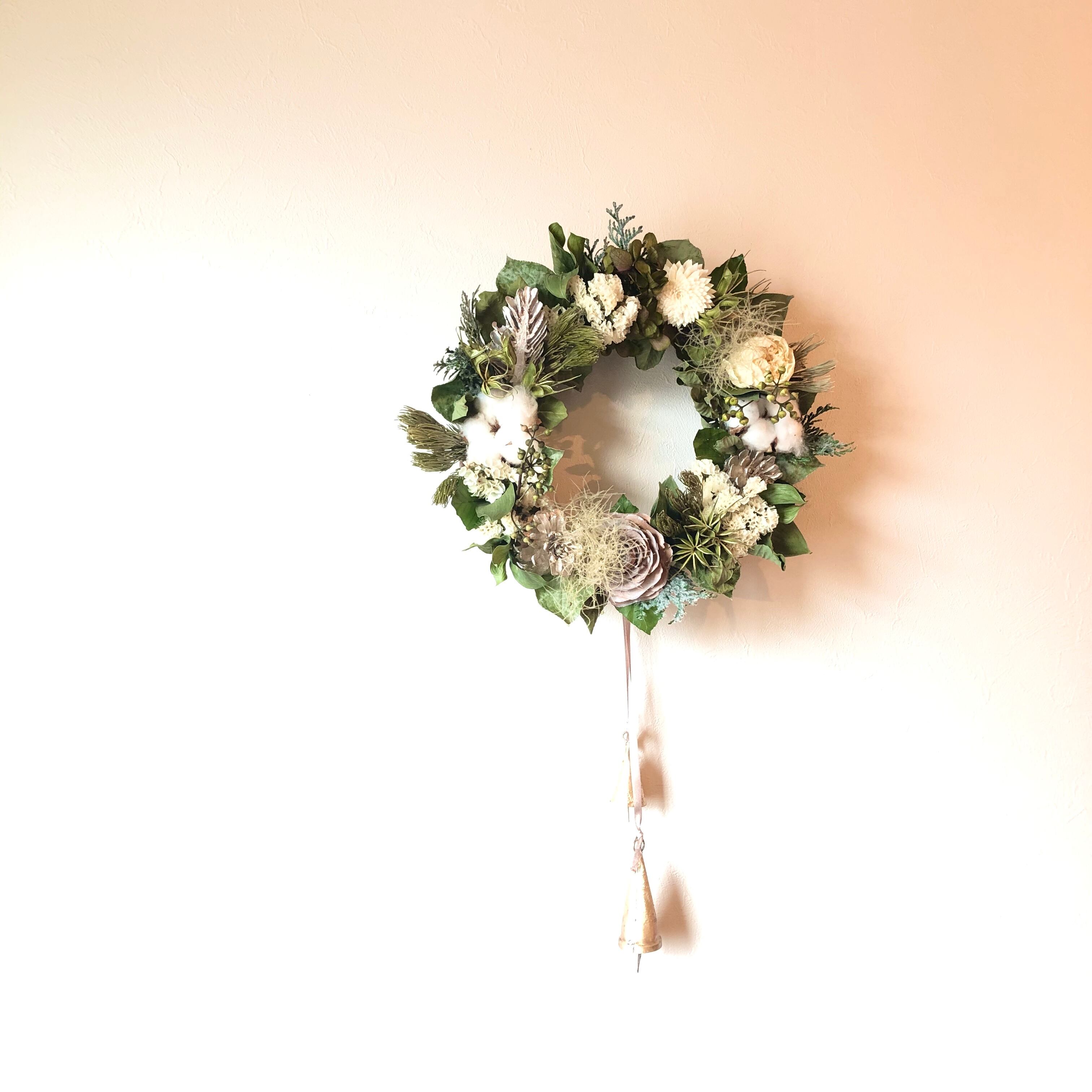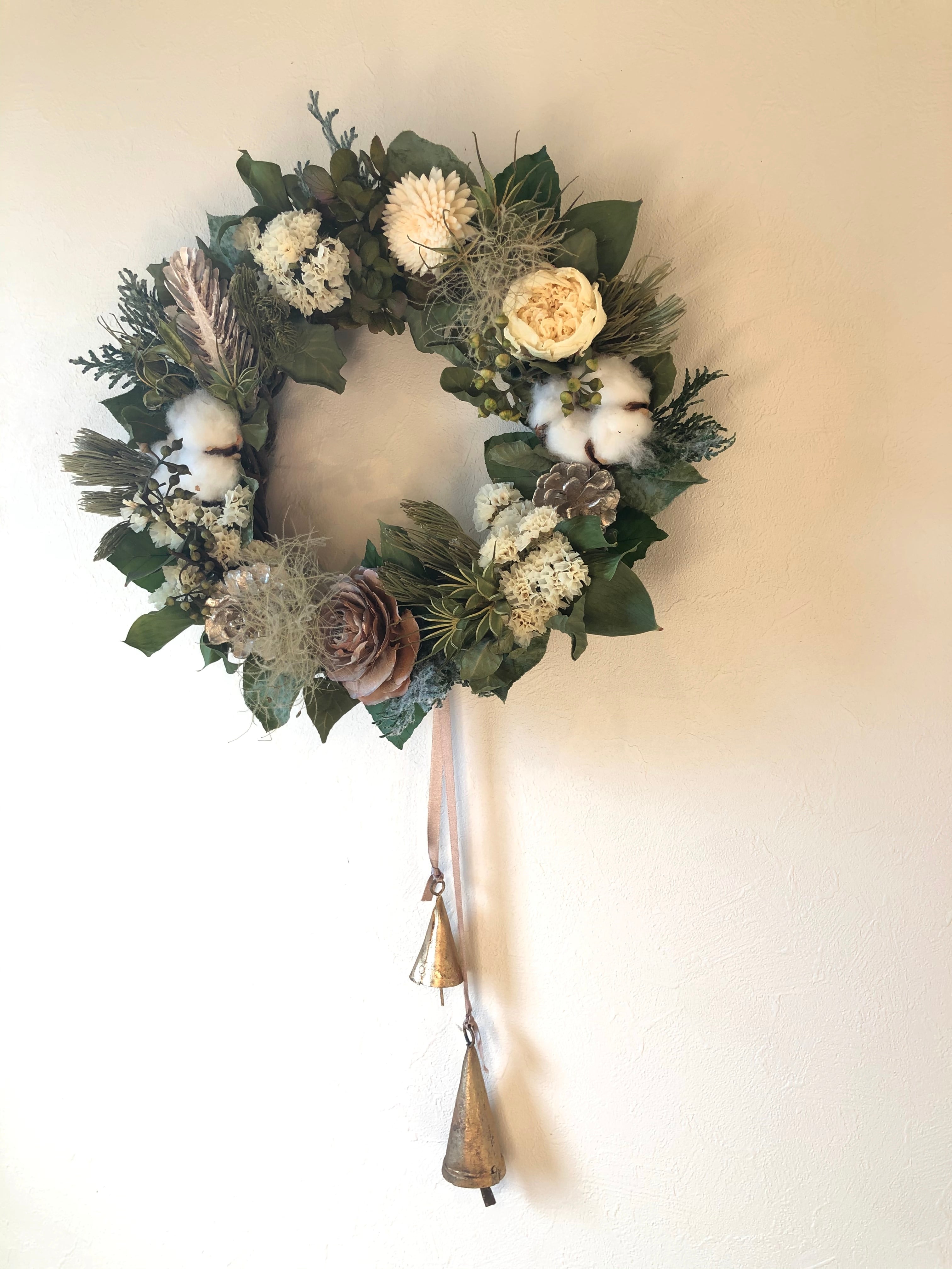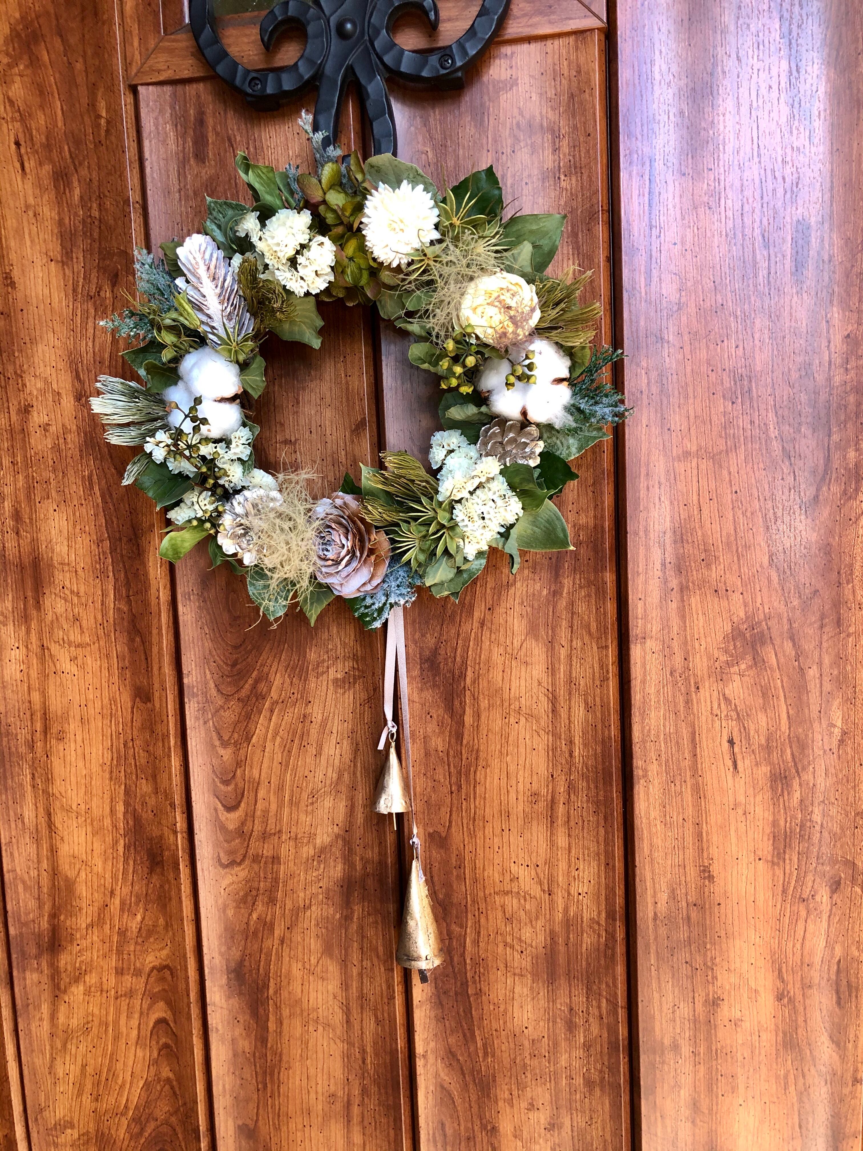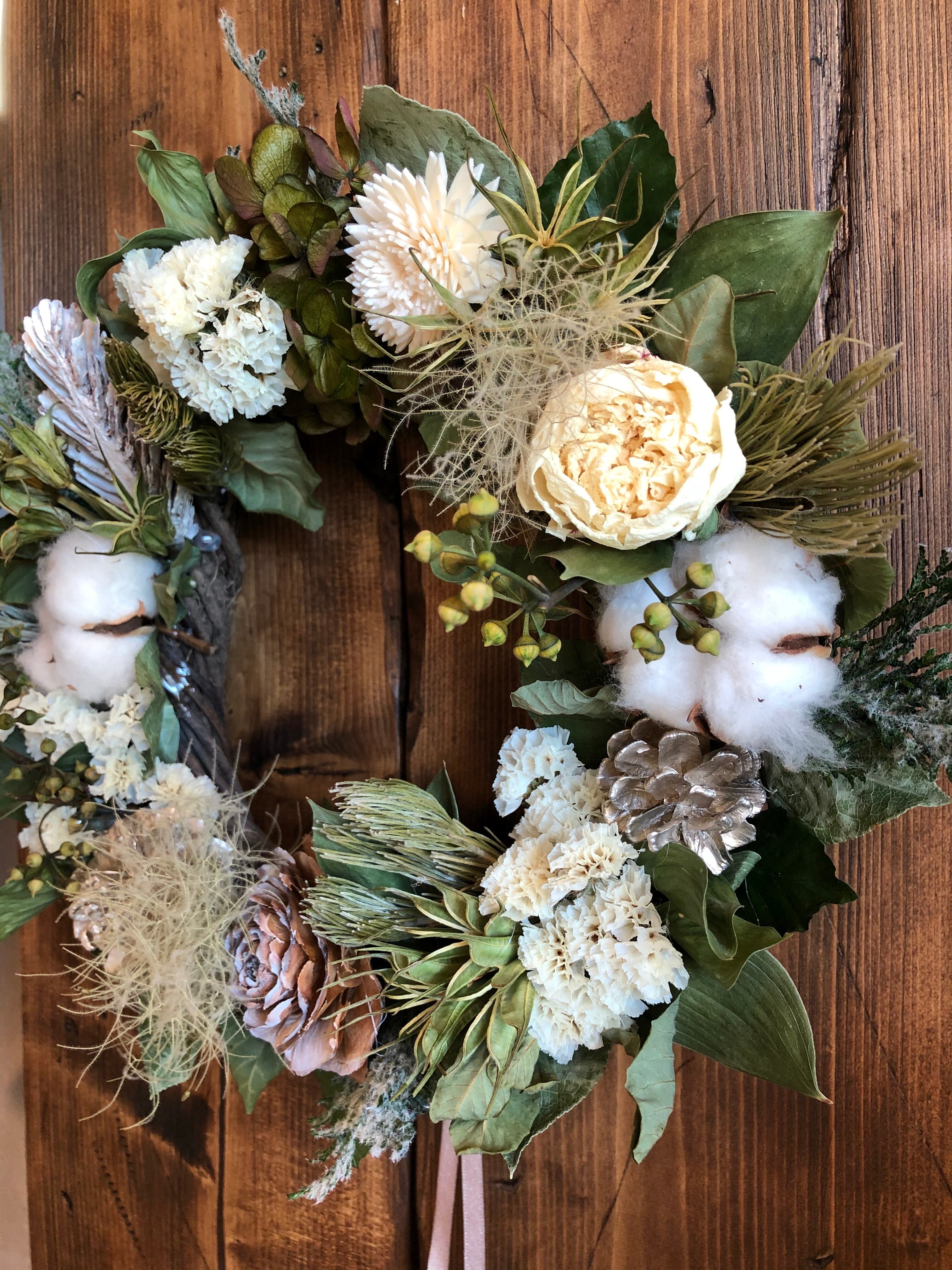シックな白グリーン系のリースは、クリスマスを過ぎても飾っていただける、冬色リースです。