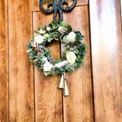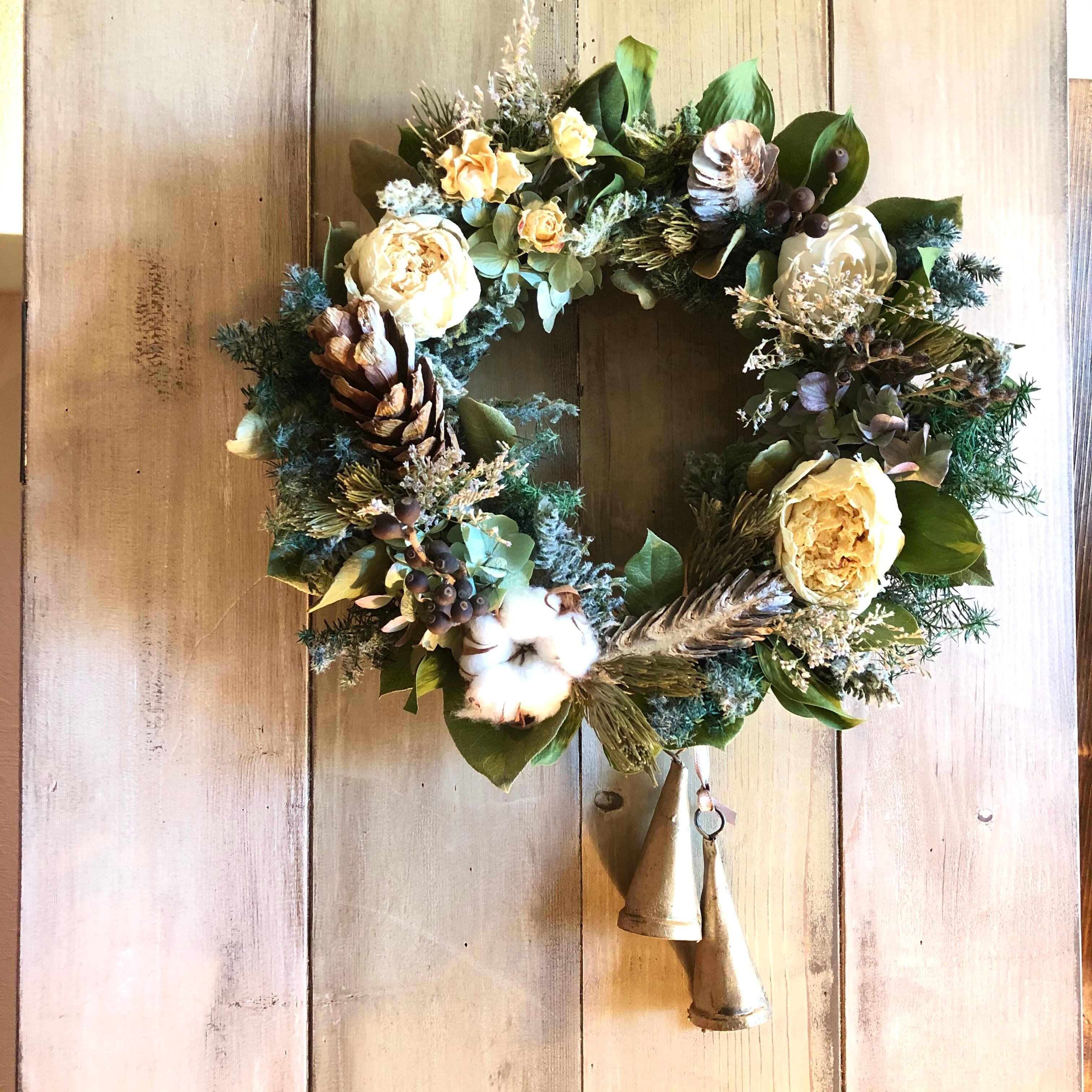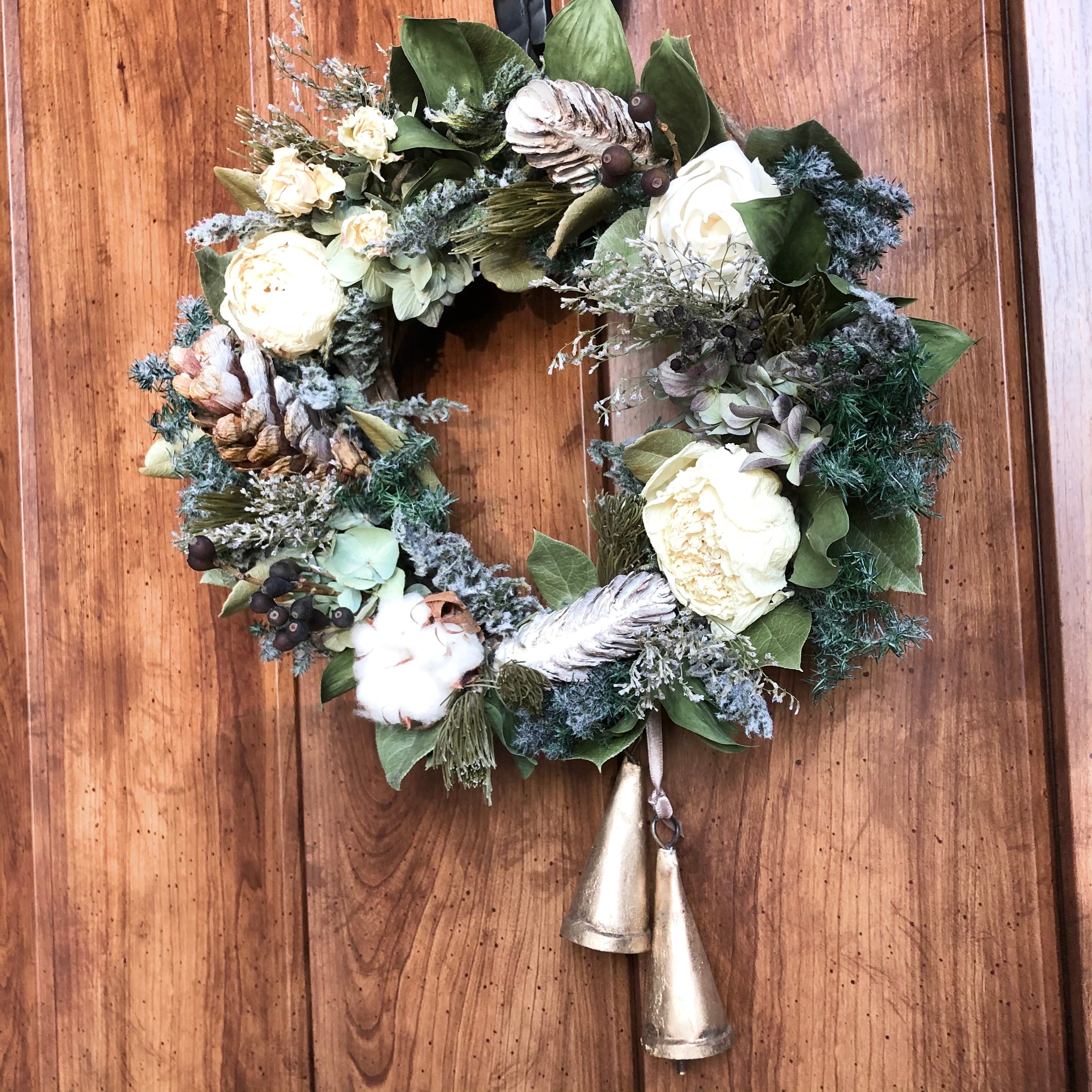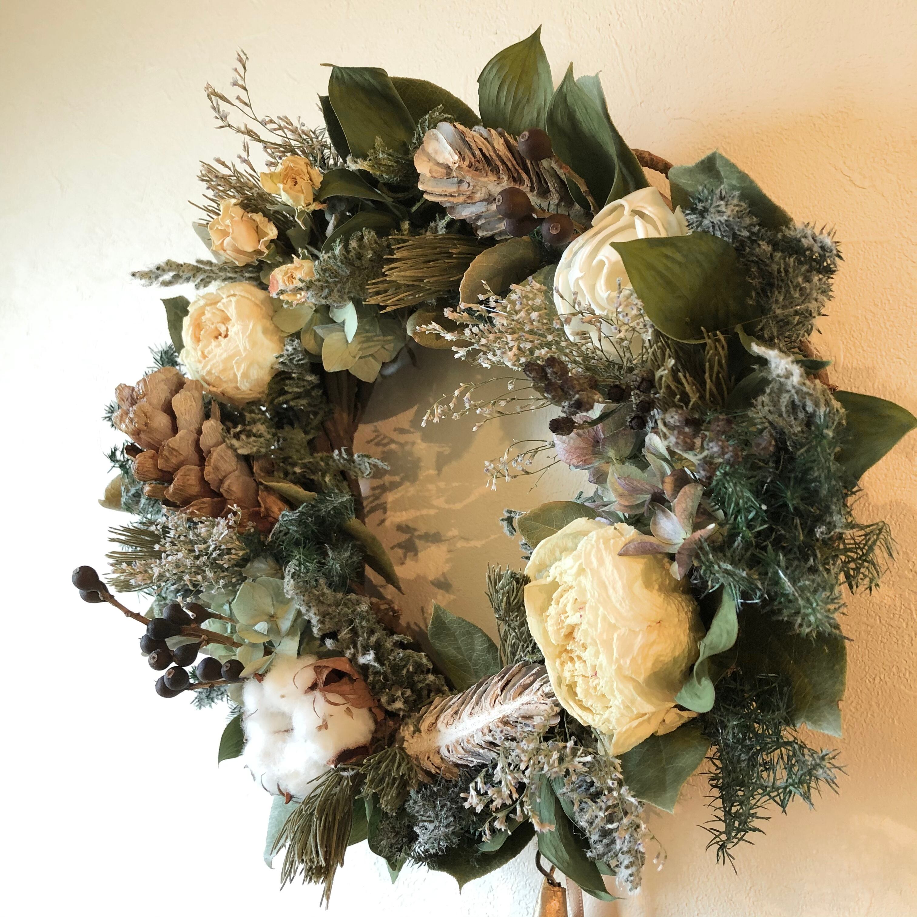 白グリーンの冬色花材をたっぷりと使ったリース。