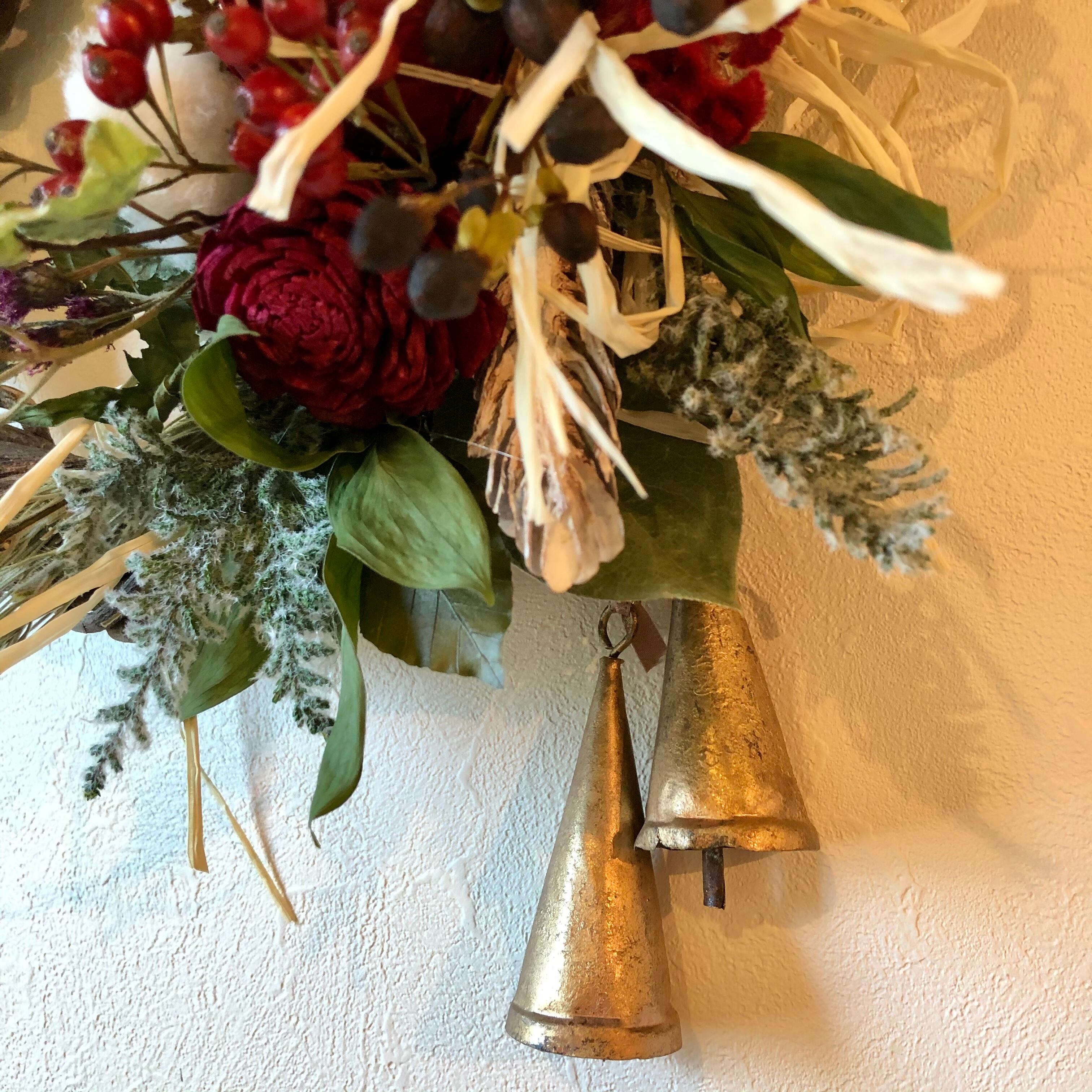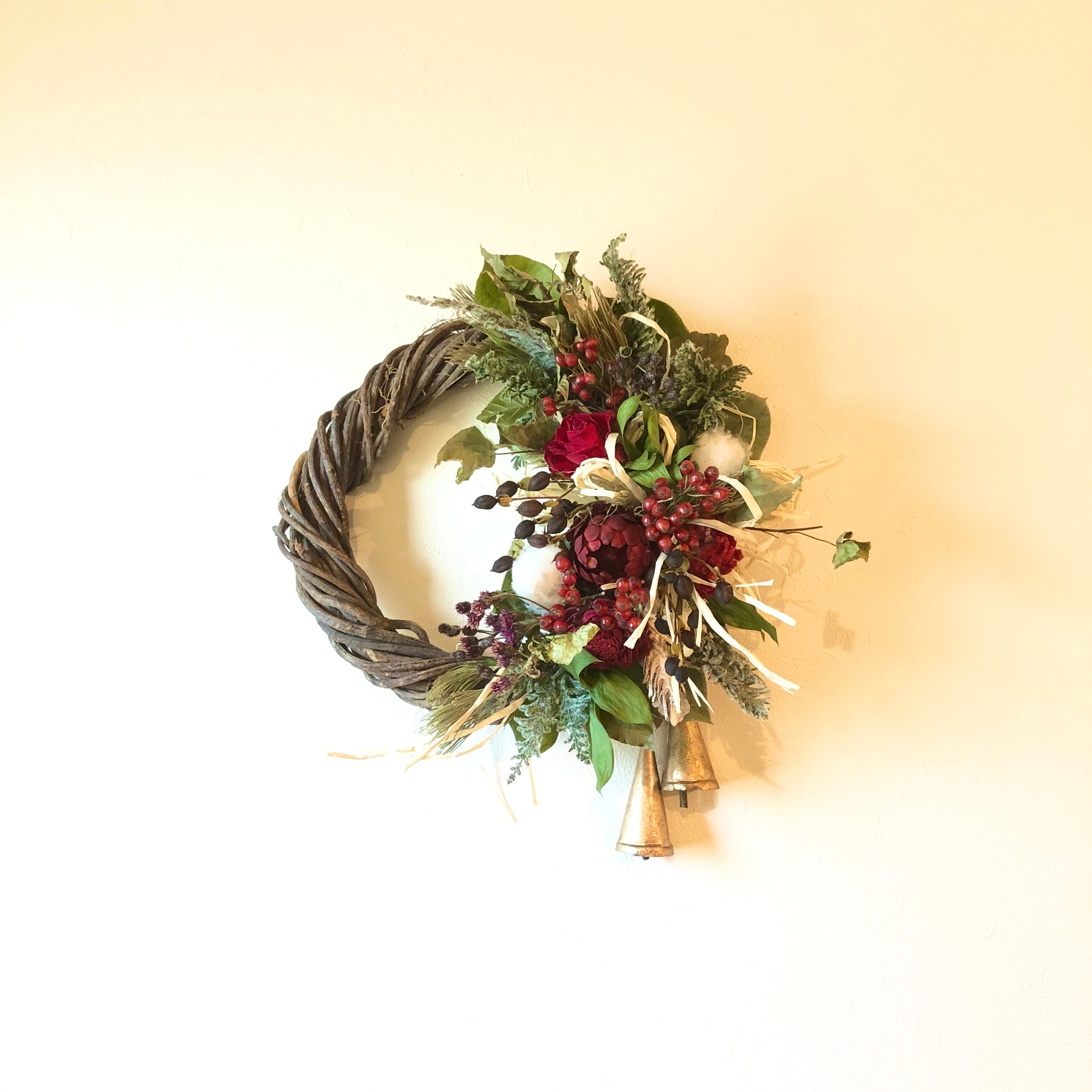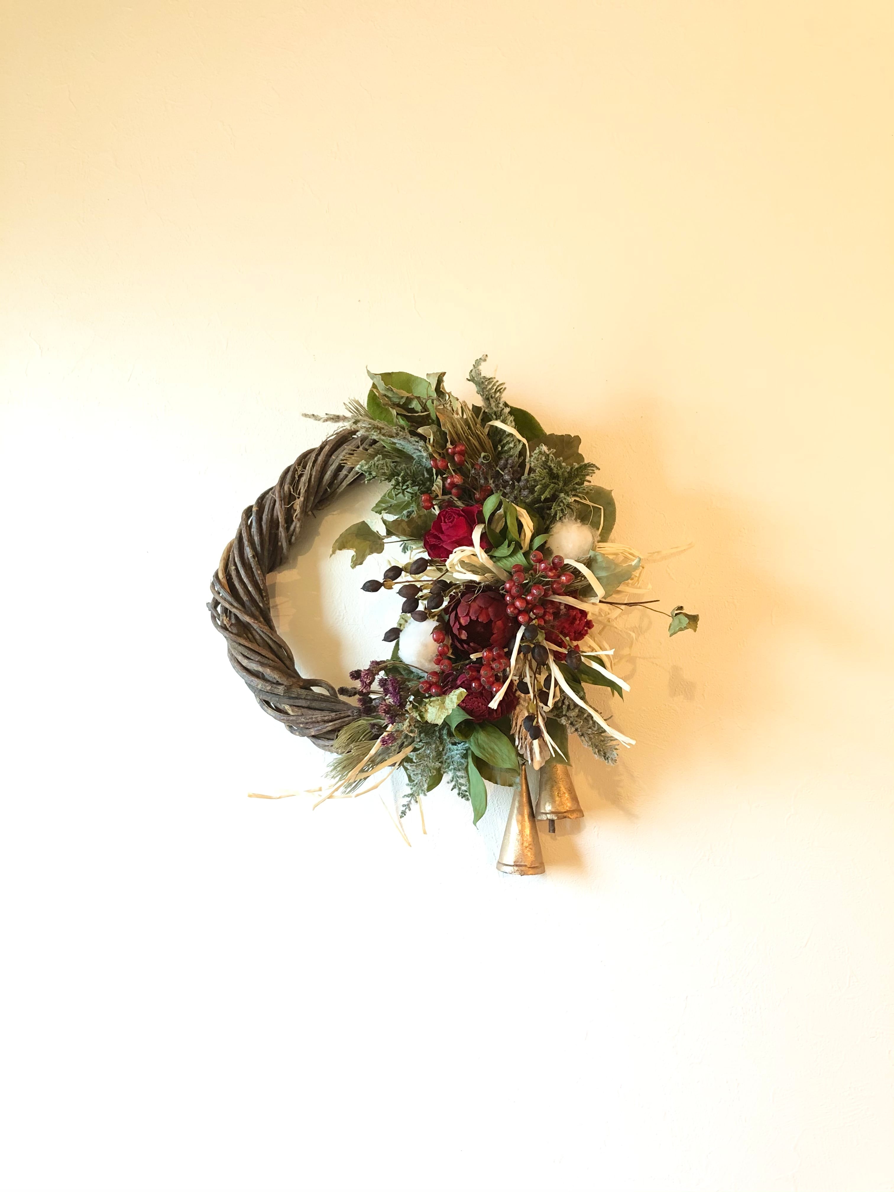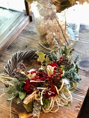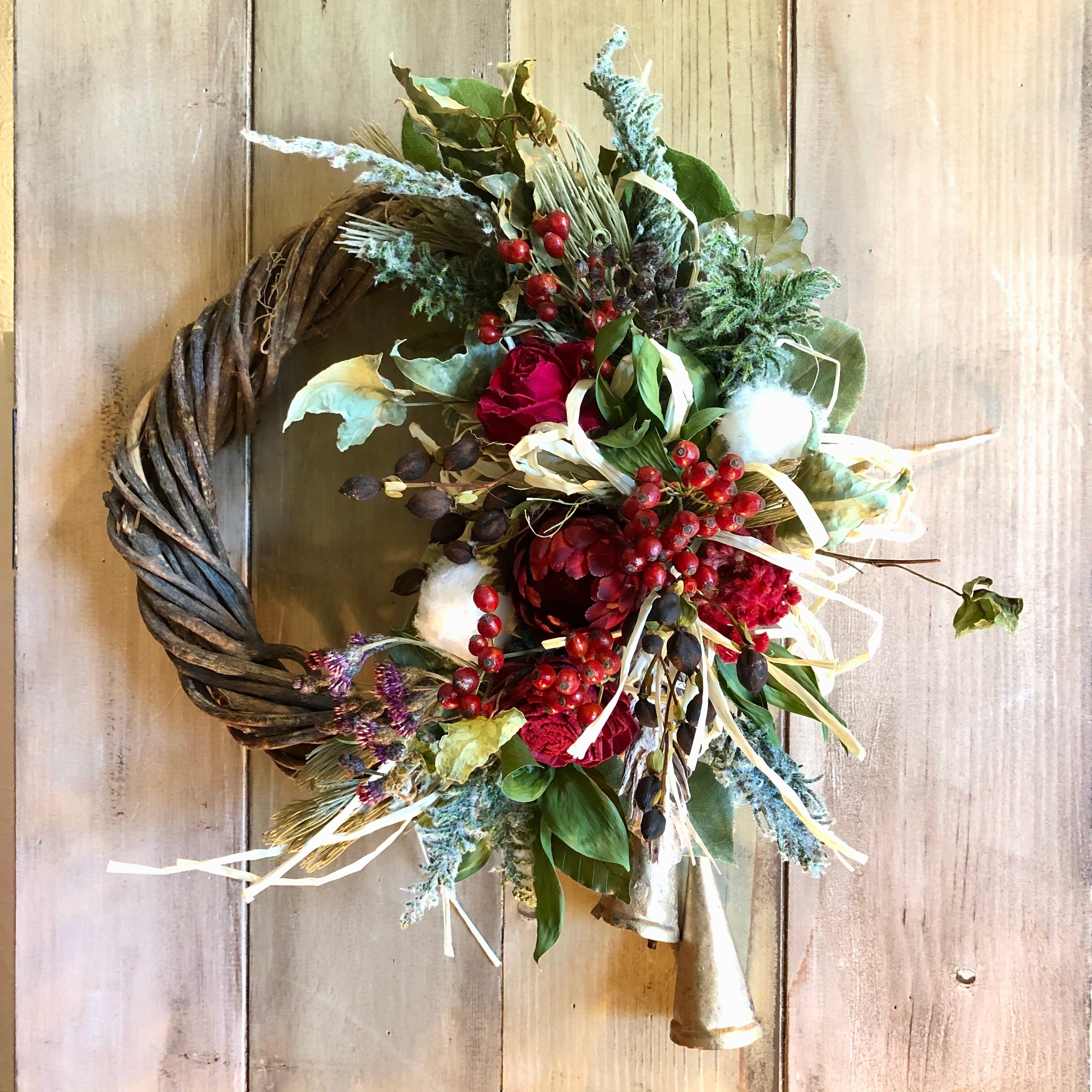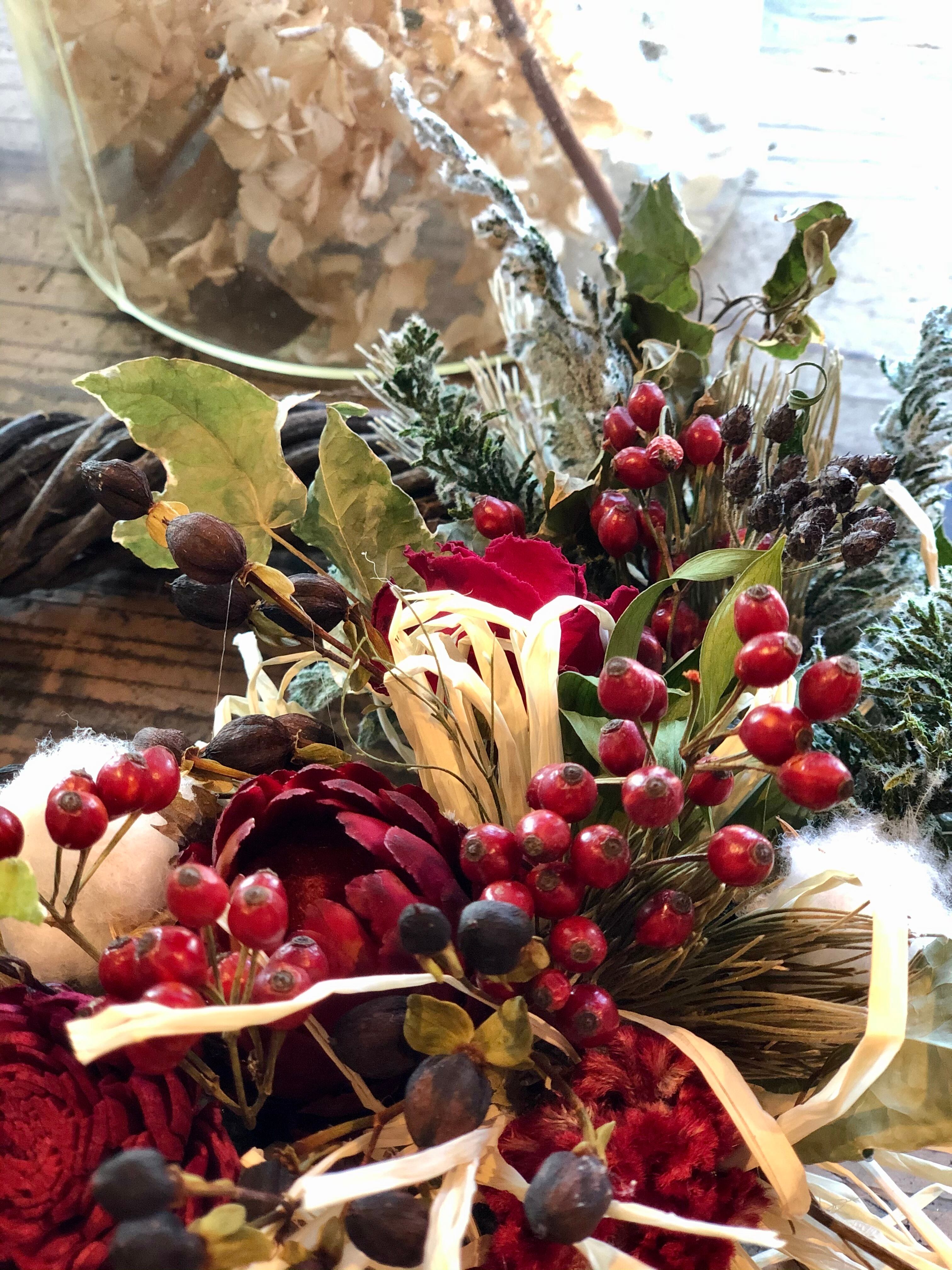 真っ赤なフレア、ソーラーローズなどをメインに、コットンなどを入れてクリスマス~冬の間飾っていただけるような、温かみのある色合いのリースです。