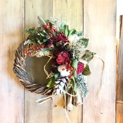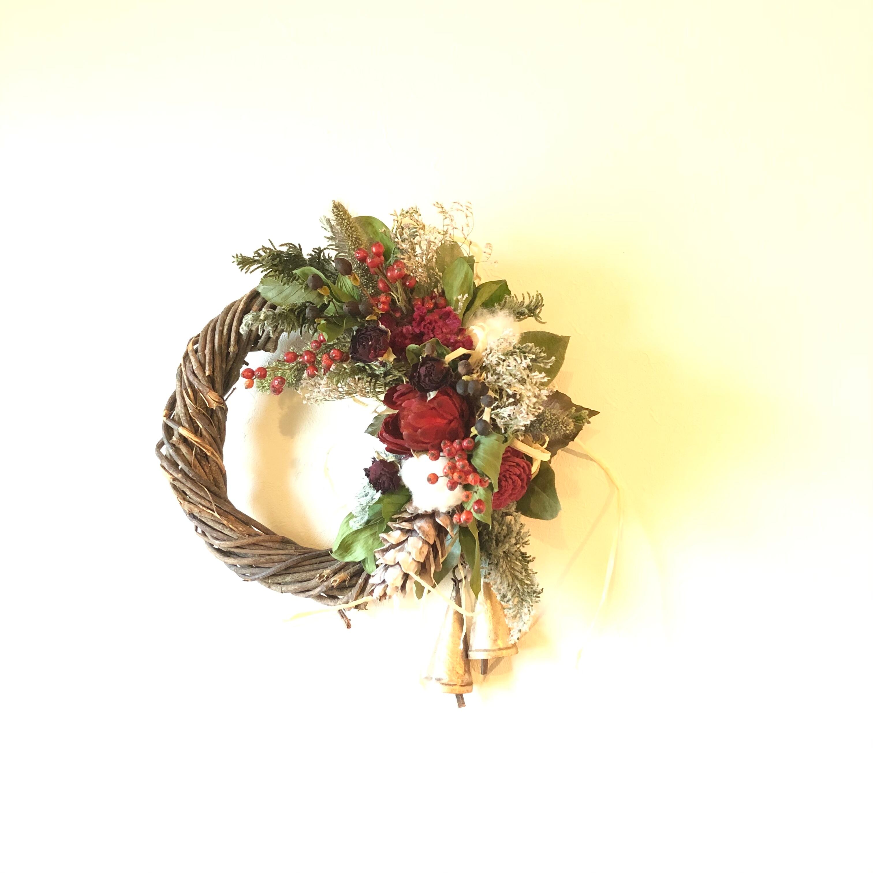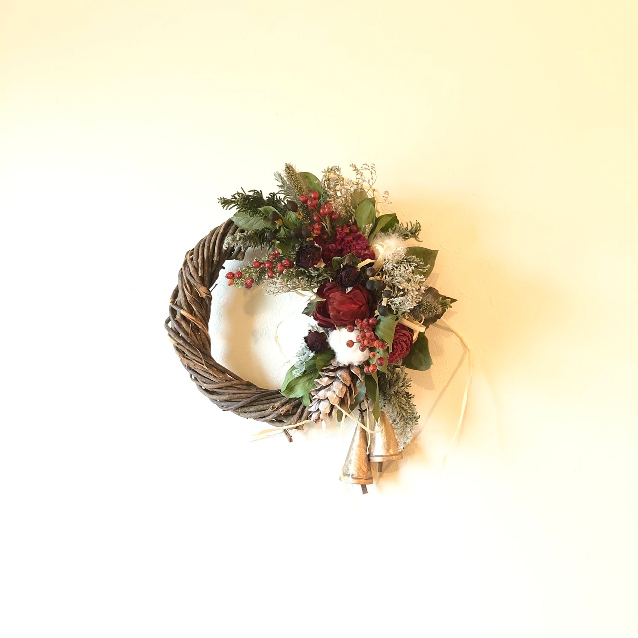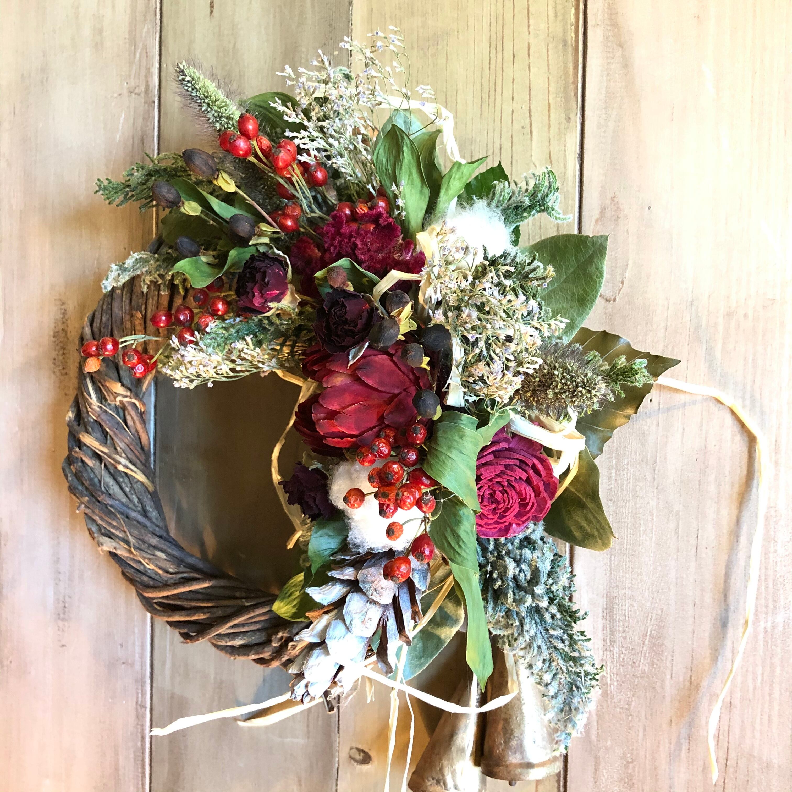 真っ赤なフレア、ソーラーローズなどをメインに、コットンなどを入れてクリスマス~冬の間飾っていただけるような、温かみのある色合いのリースです。