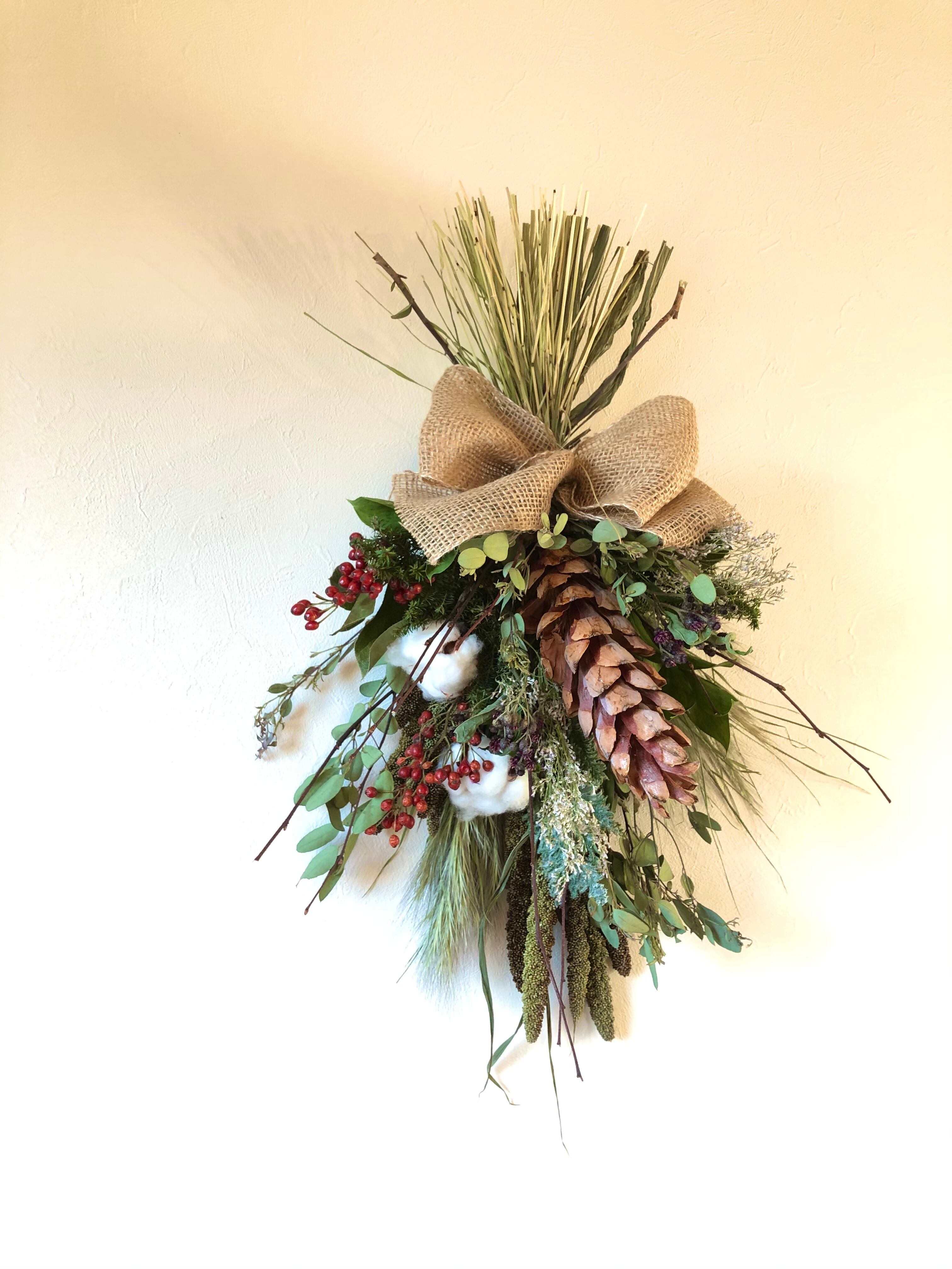白樺の枝も入ってボリュームのある壁掛けスワッグです。