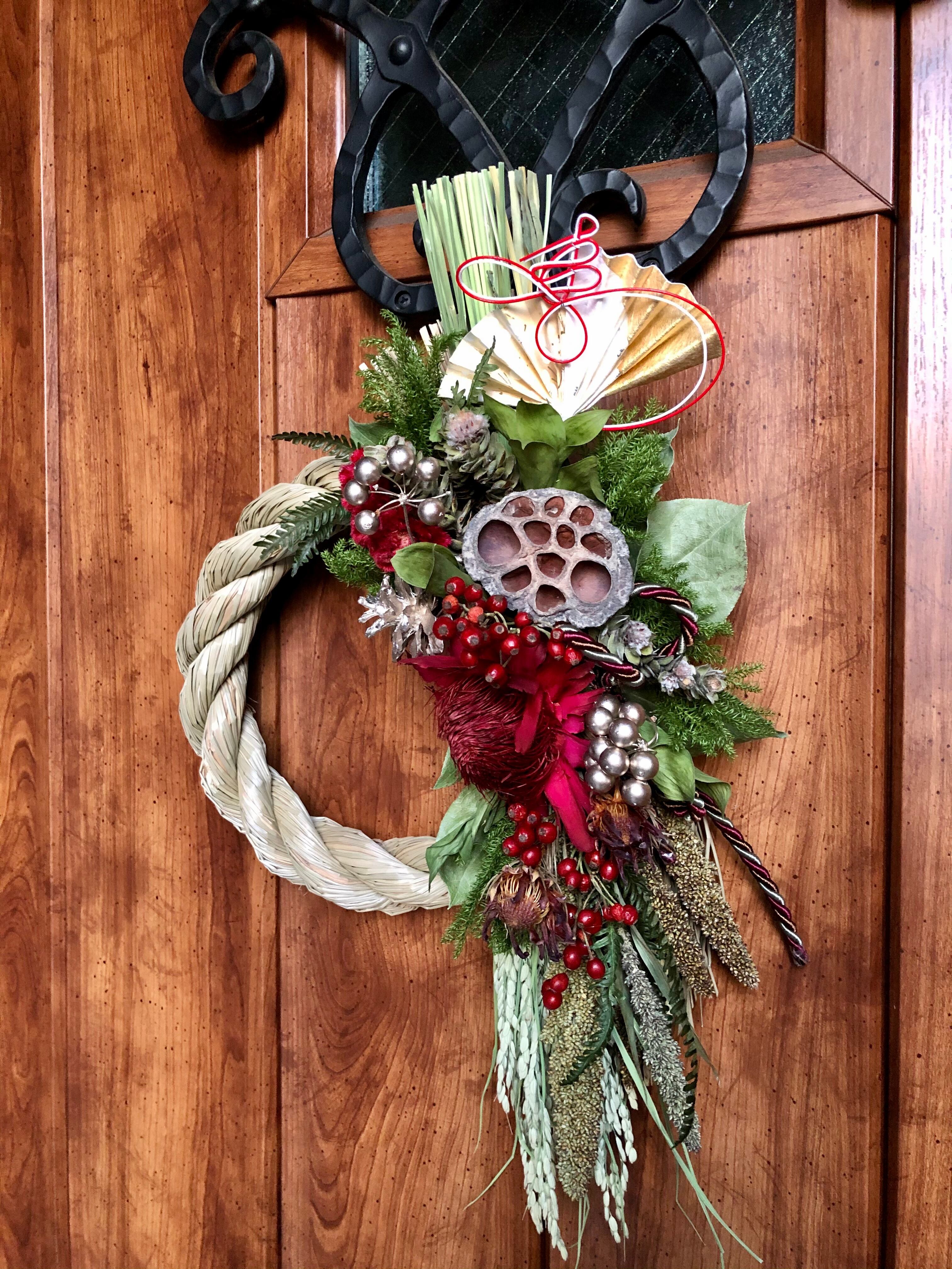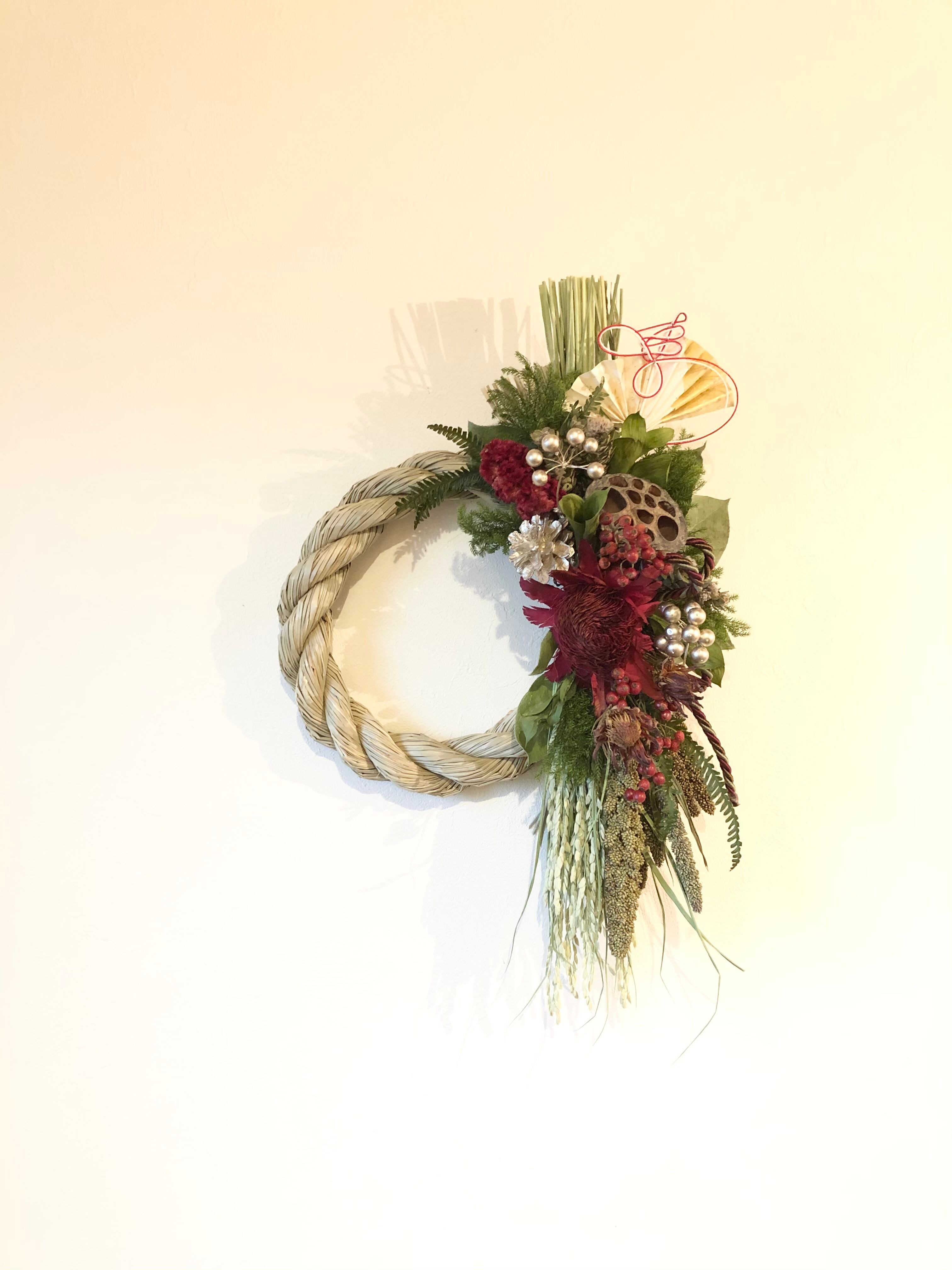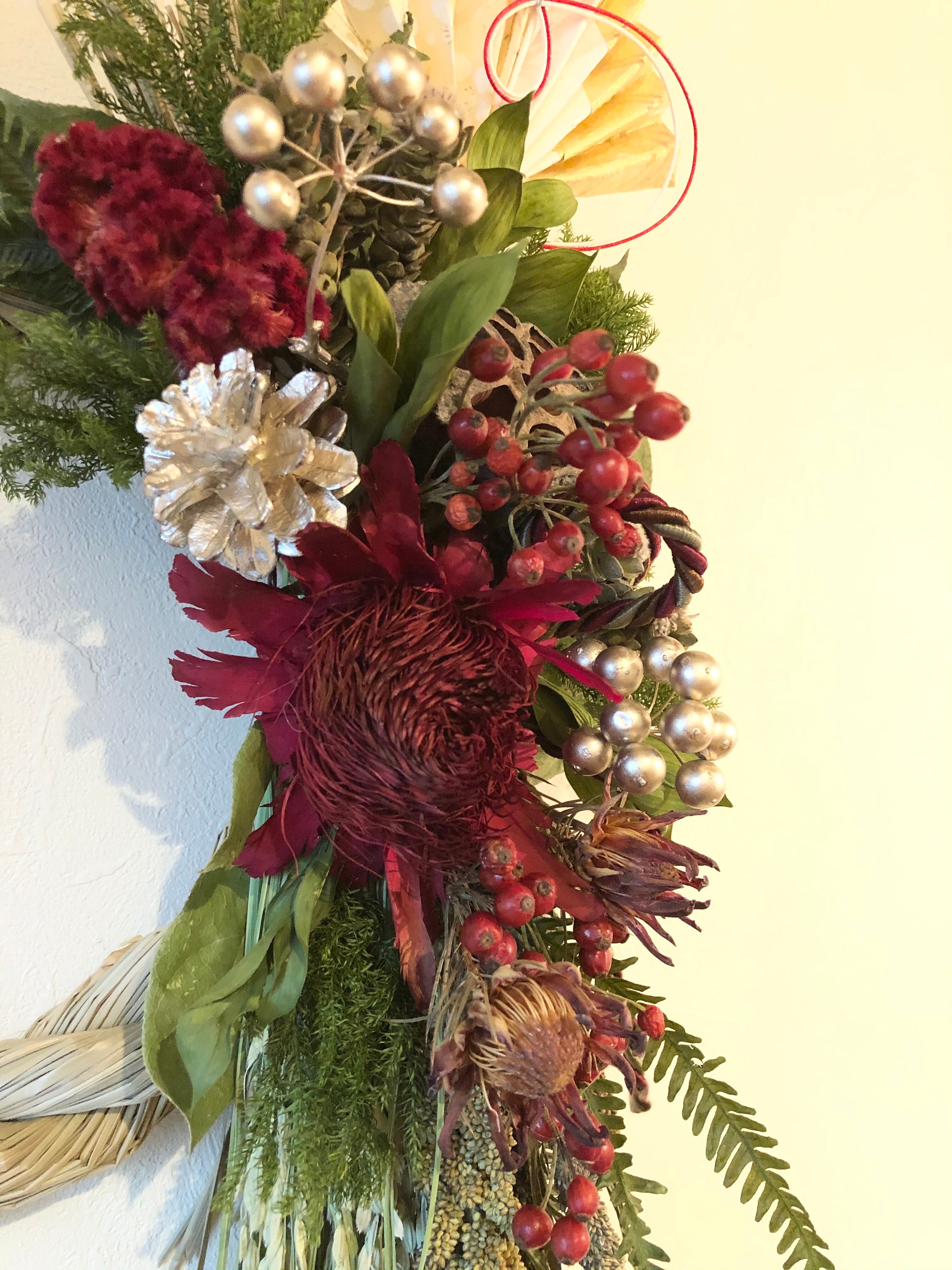 華やかな赤の花材に、ハスやバラの実、稲穂など、お正月らしい花材をたっぷりと使ったしめ飾り。