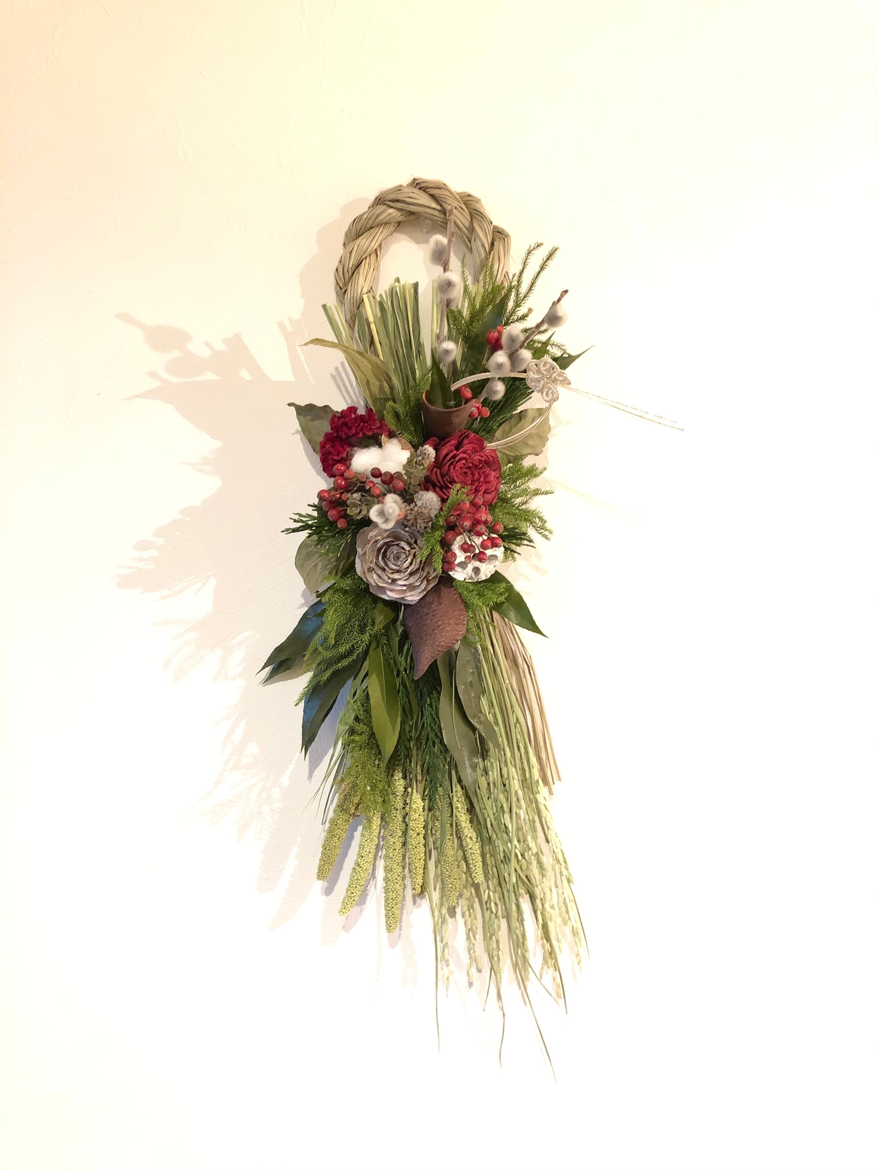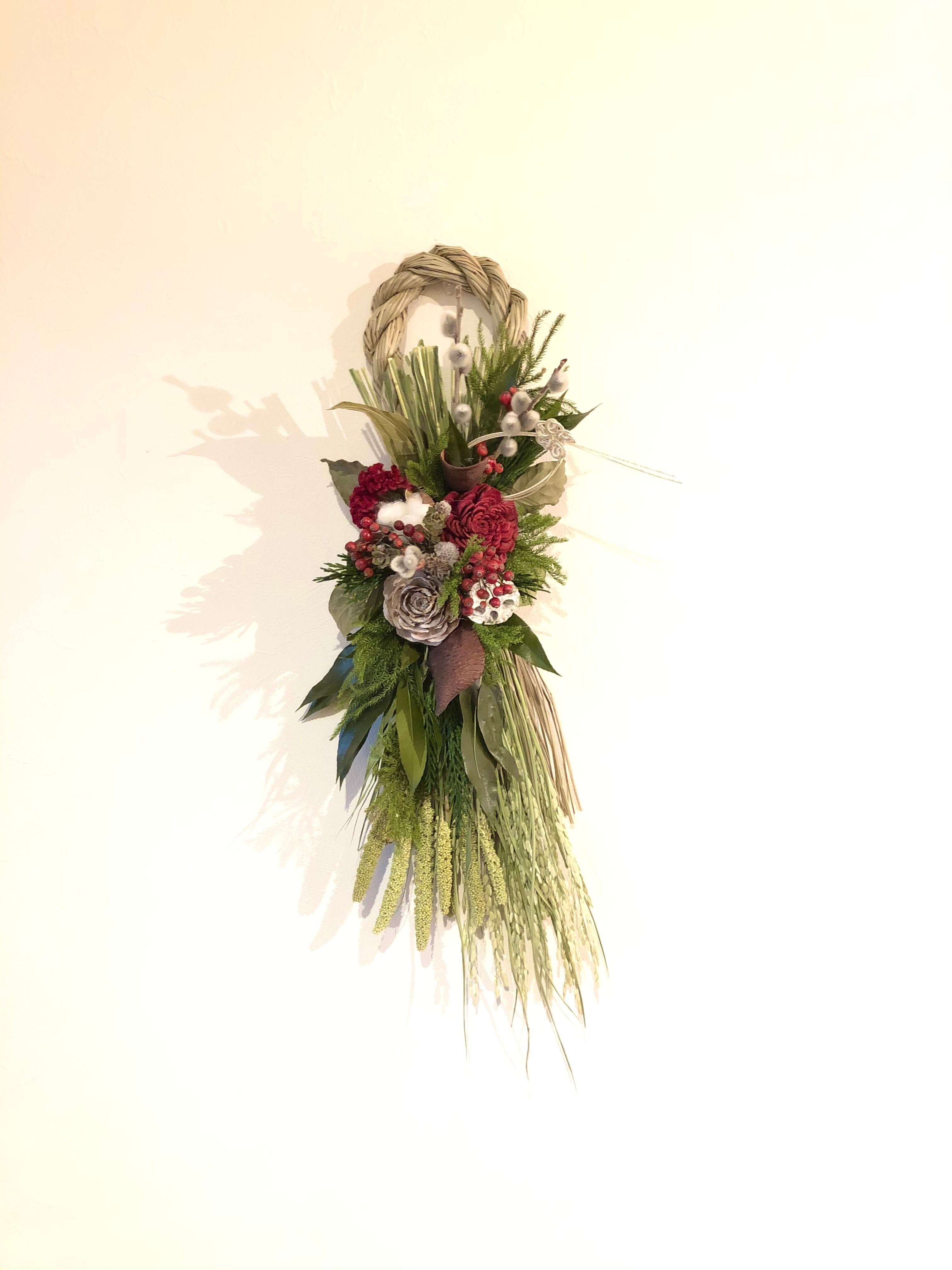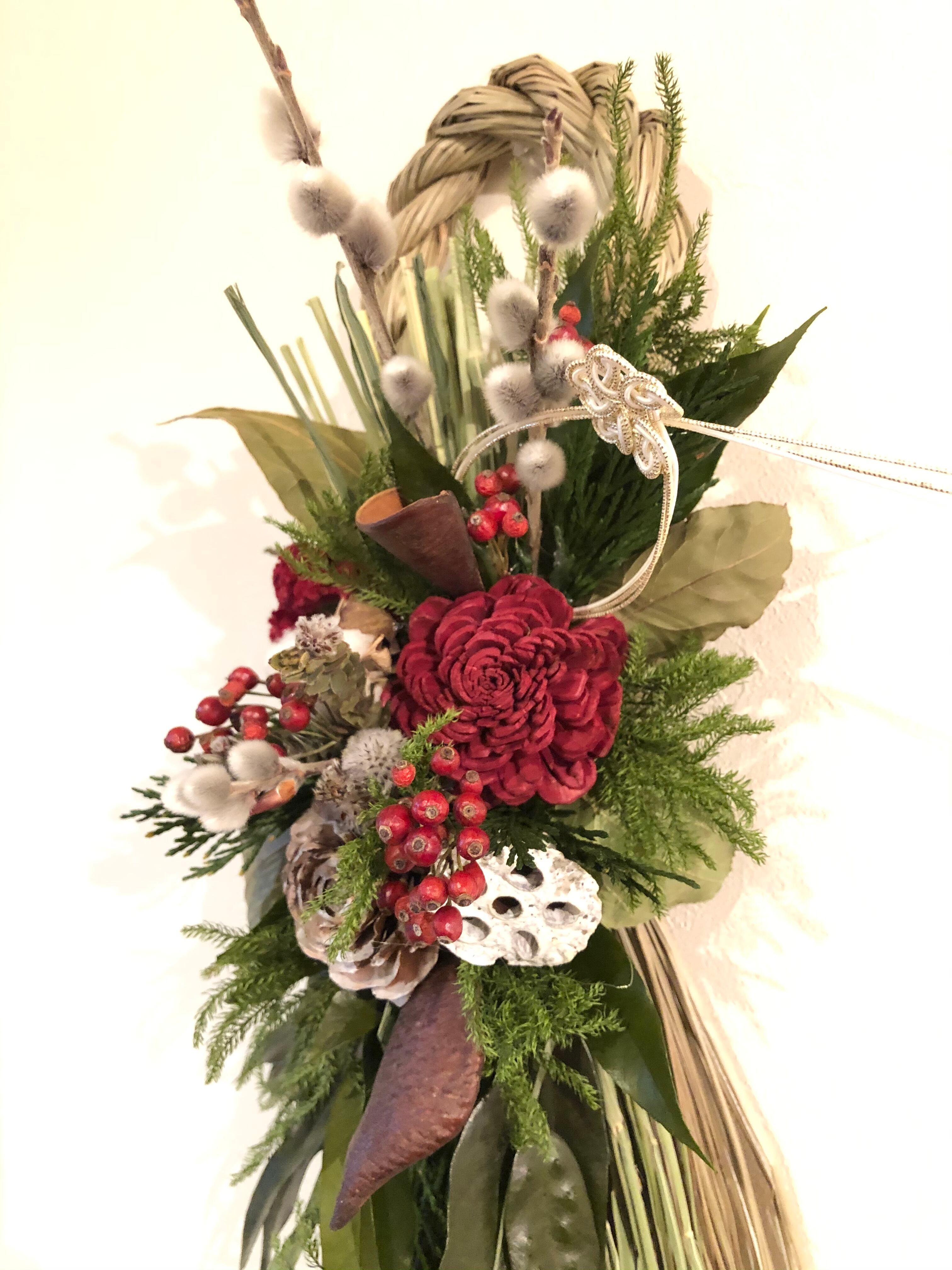 華やかな赤系の花材をたっぷりと使った、縦長のしめ飾り。