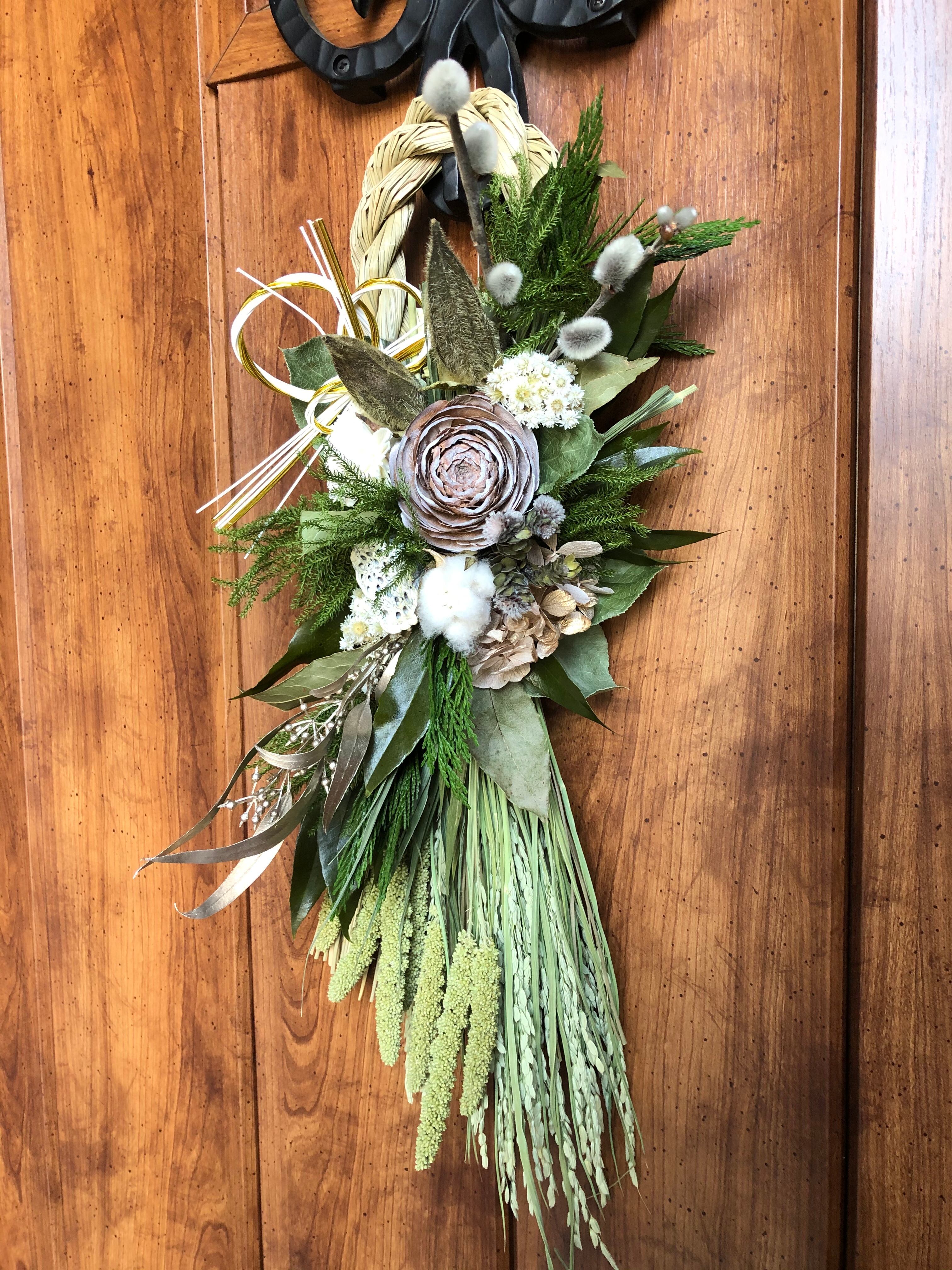 和洋、どちらの玄関にも合う、落ち着いた色合いのしめ飾りです。