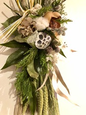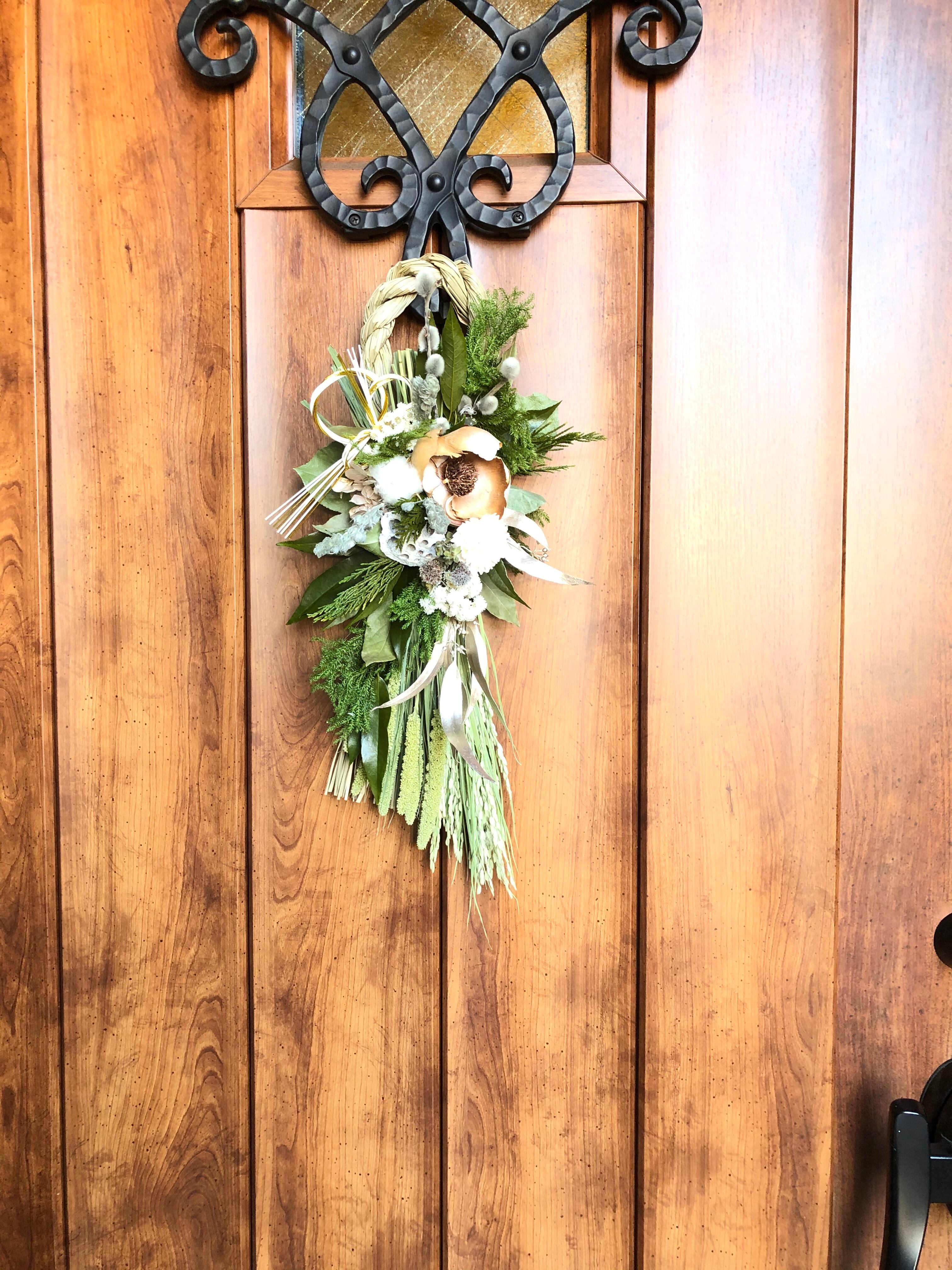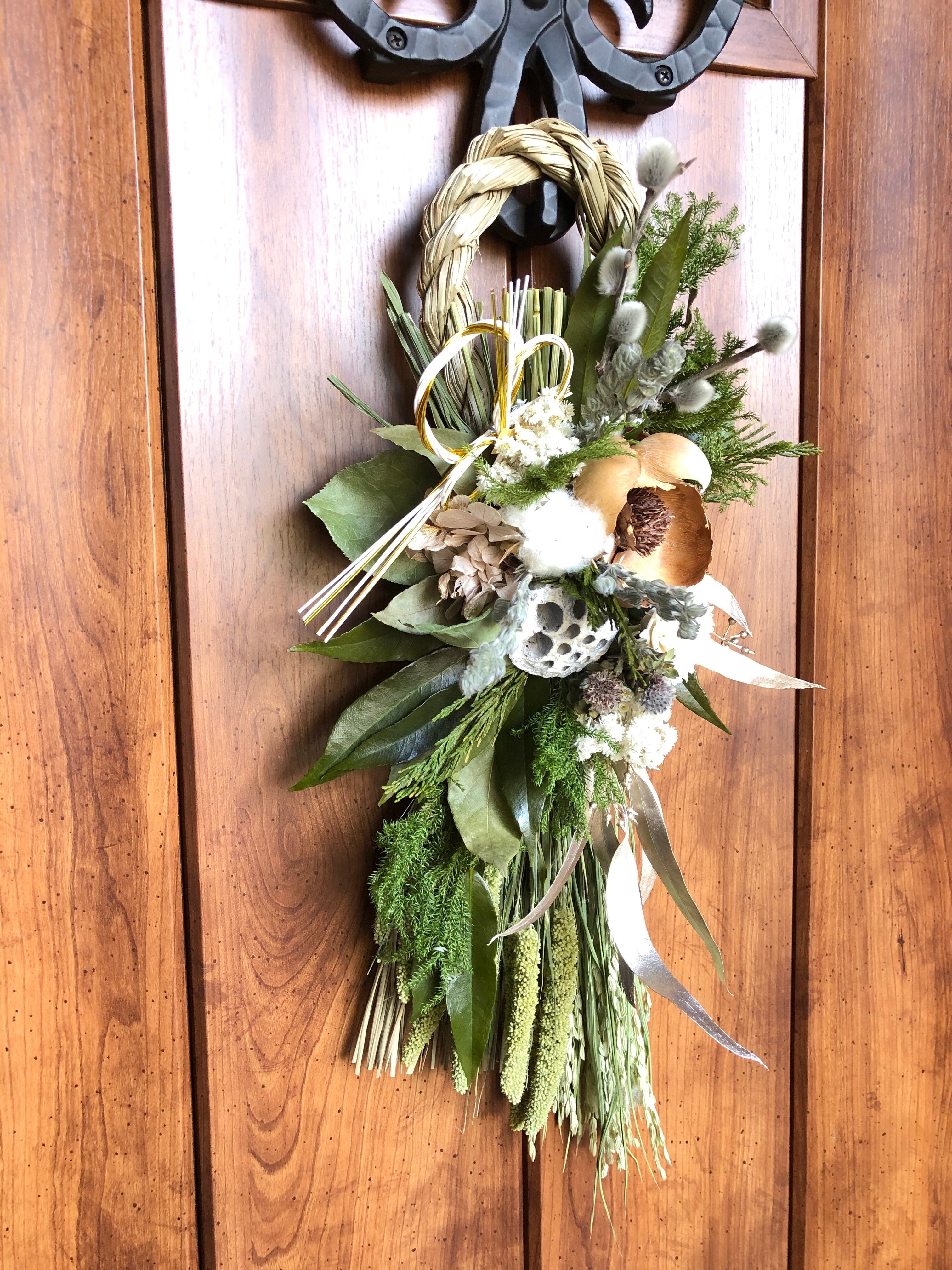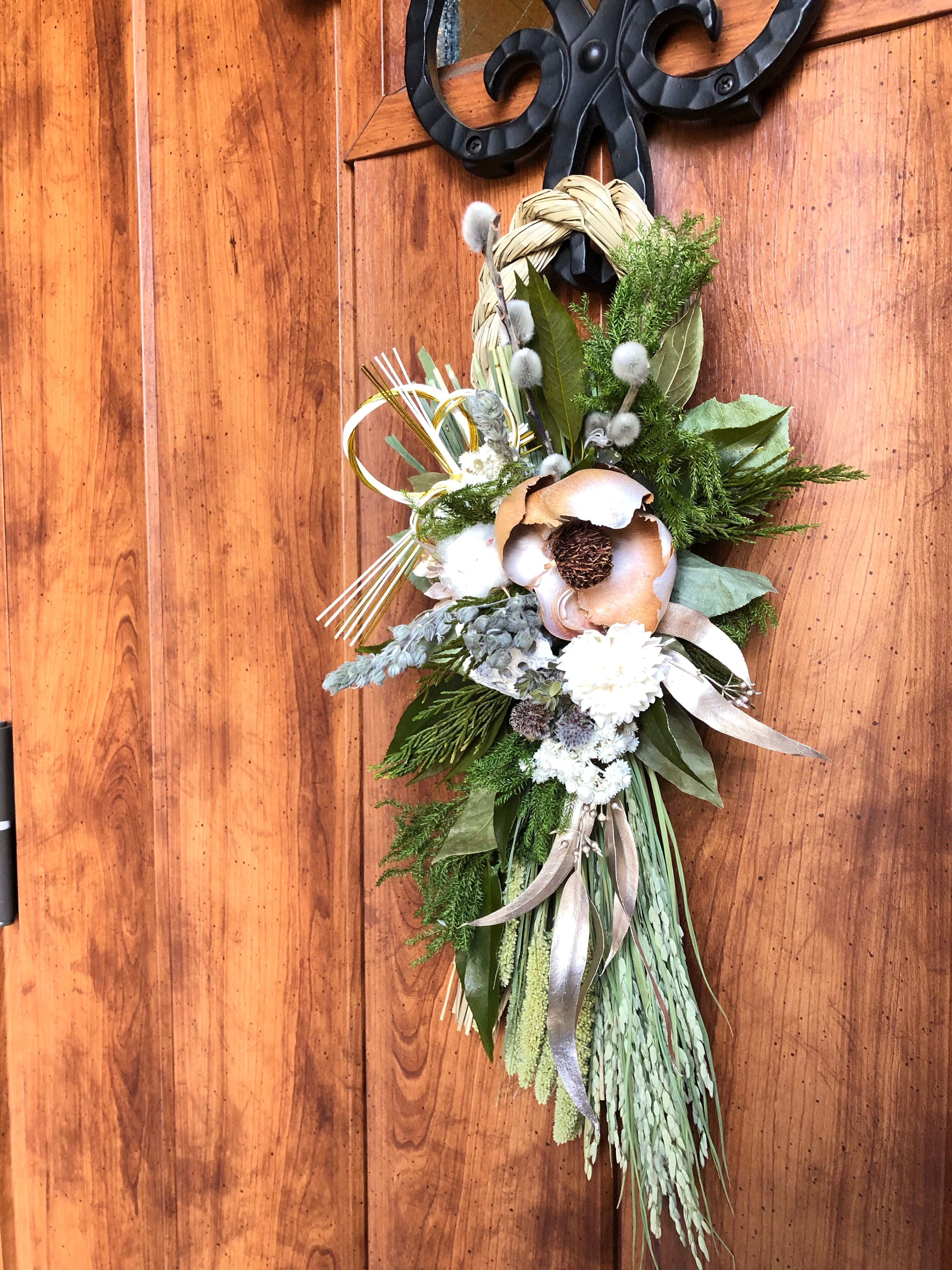 和洋、どちらの玄関にも合う、落ち着いた色合いのしめ飾りです。