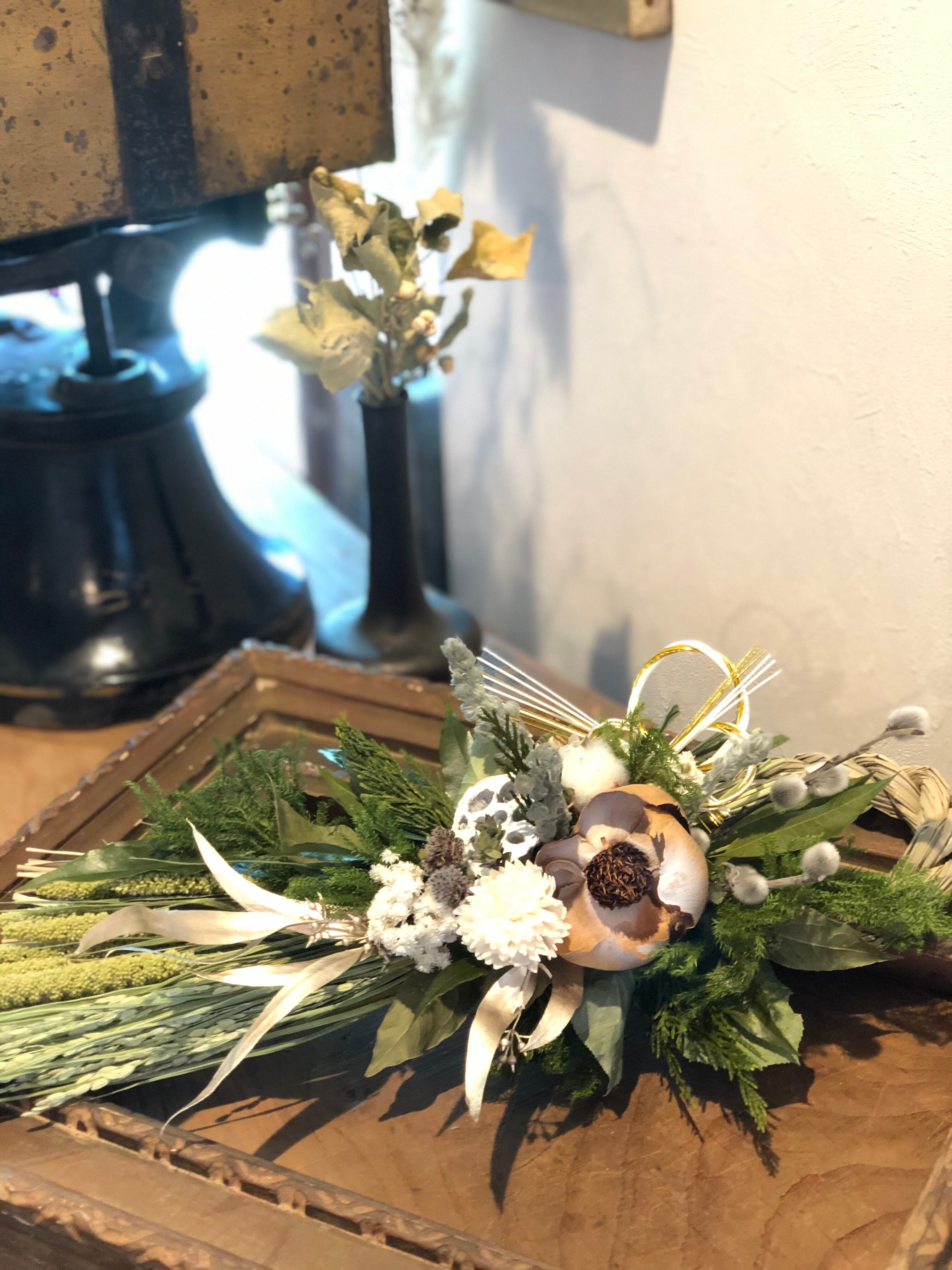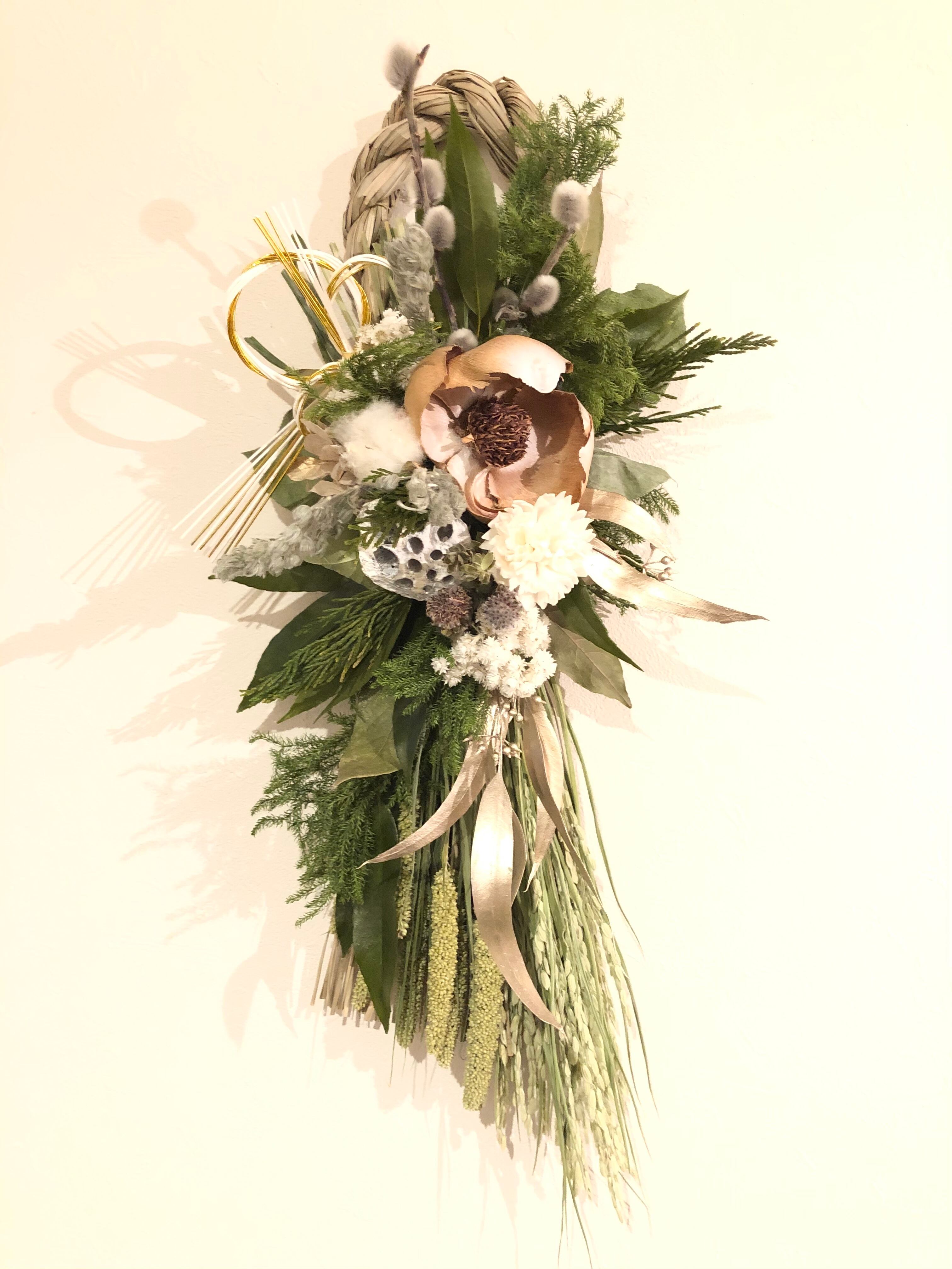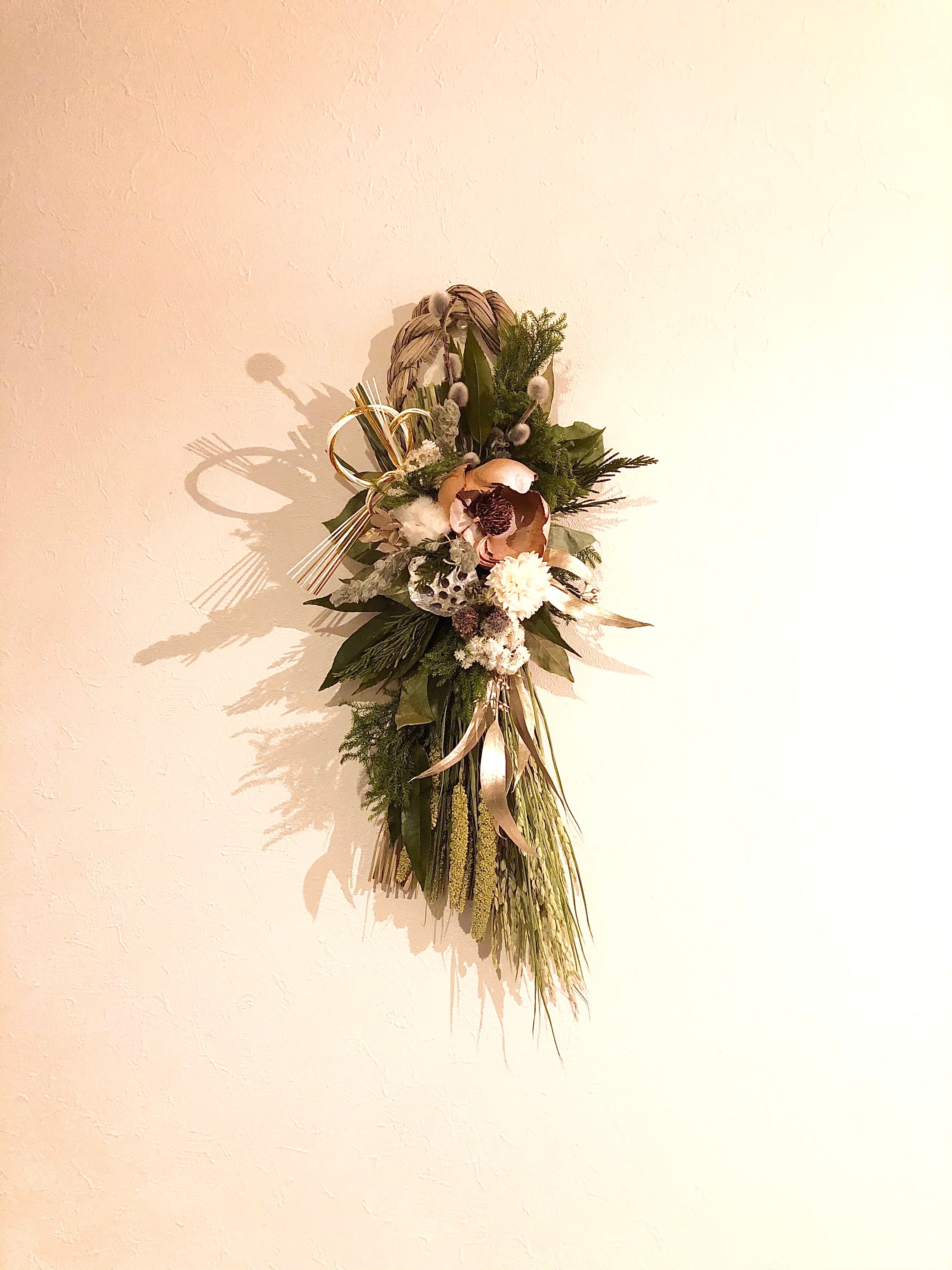 ホワイトベージュのシックなパームフラワーをメインに、落ち着いた色合いのしめ飾り。