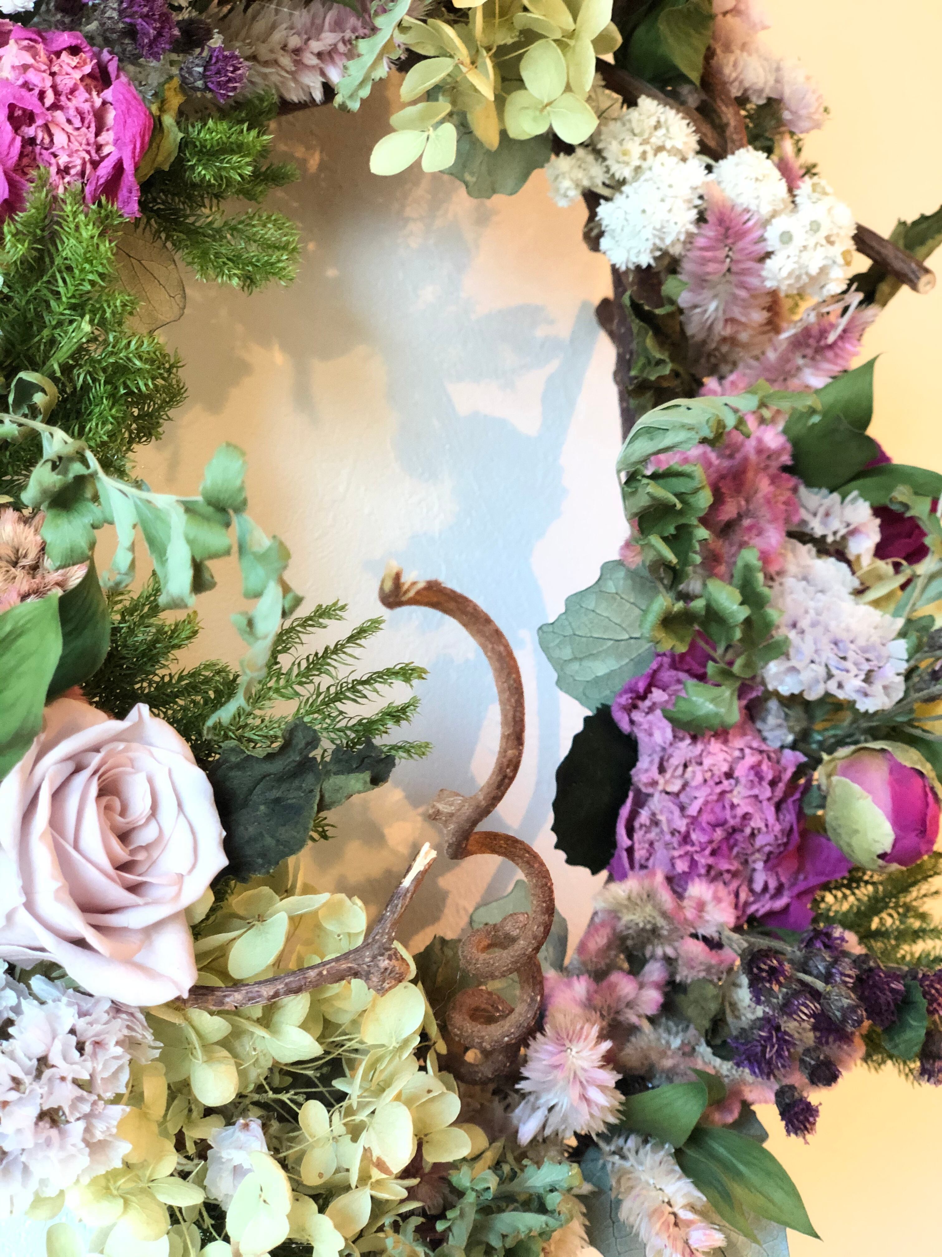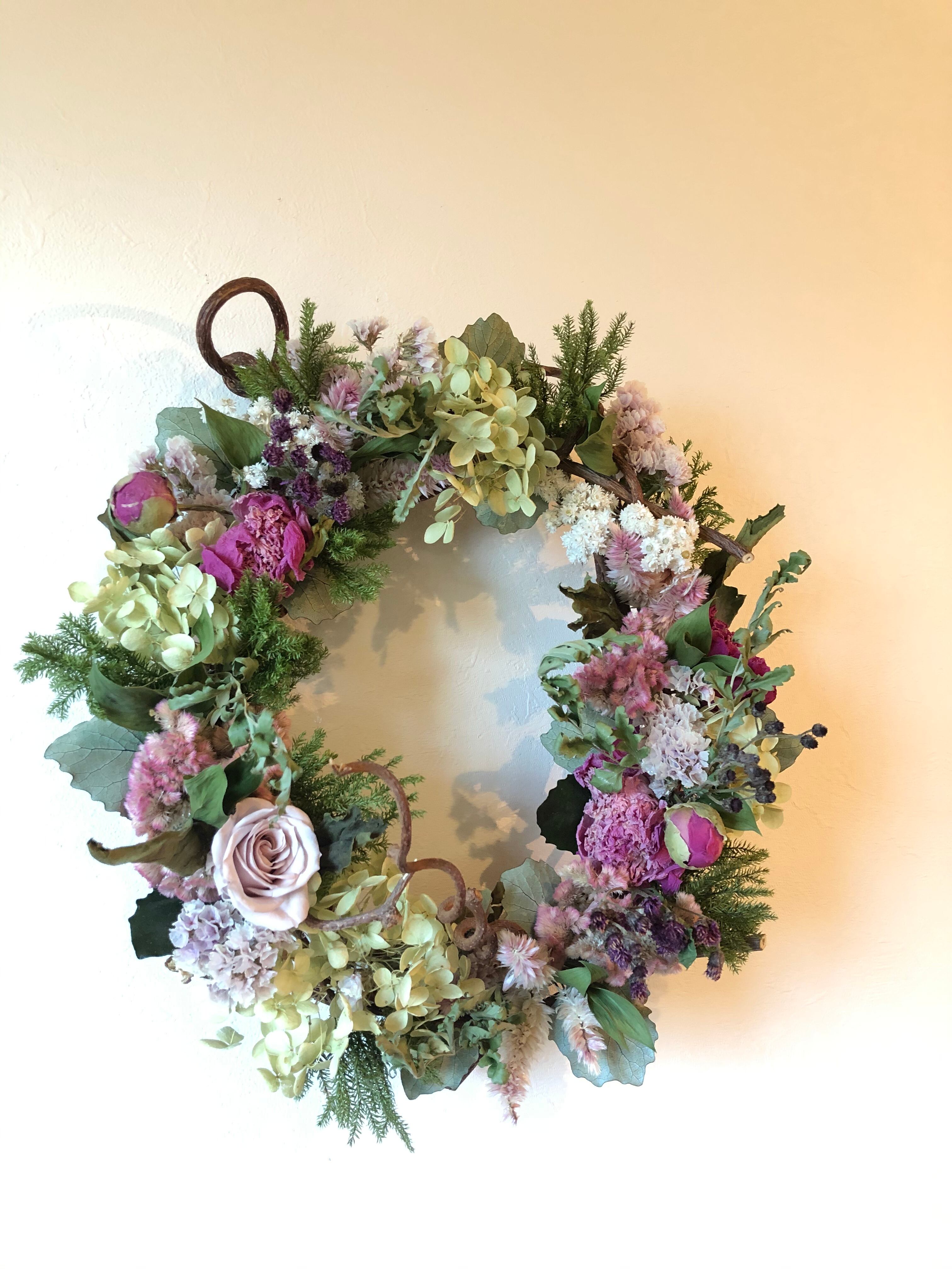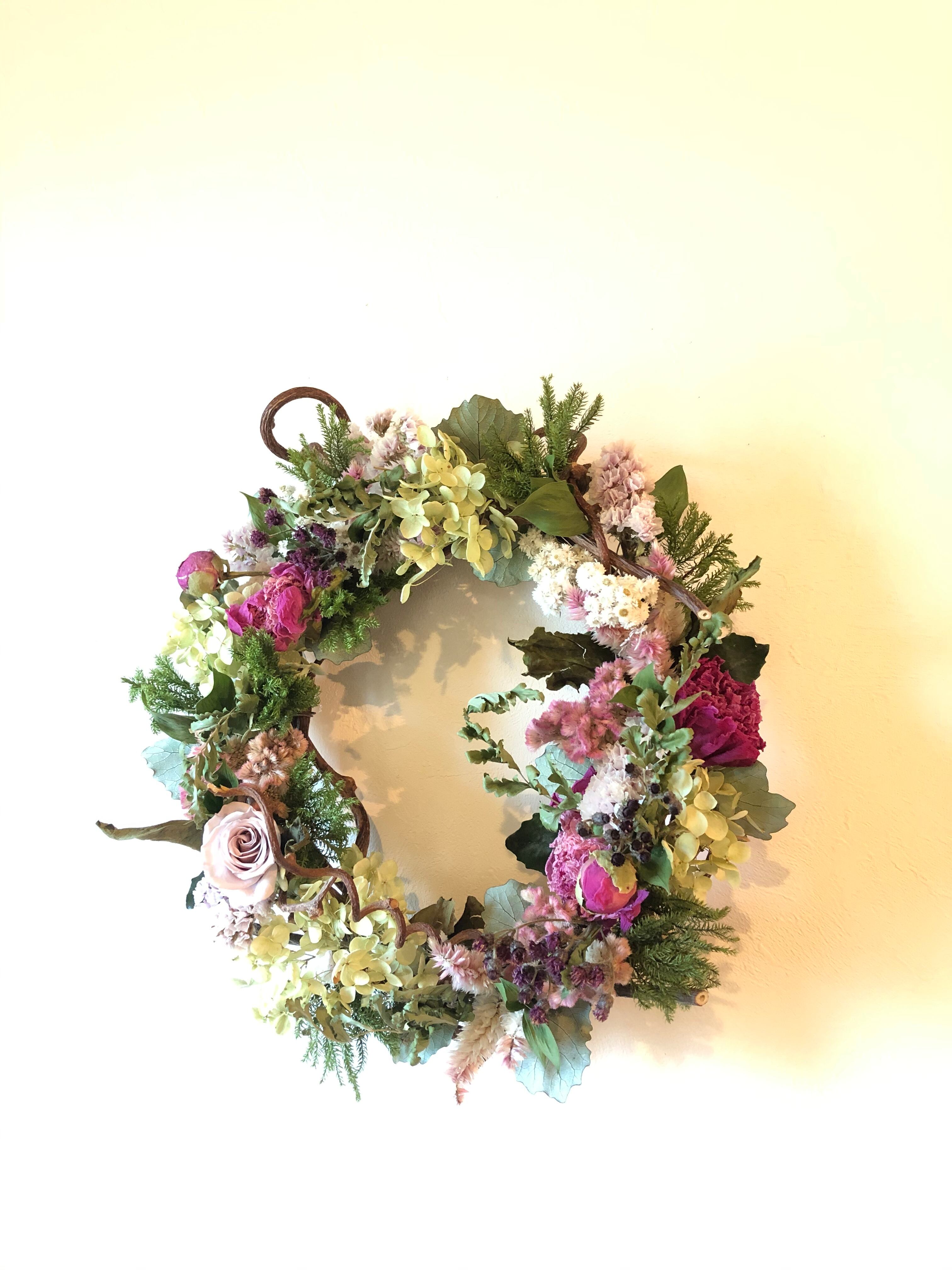 ナチュラルなキウイヅルのリースベースに、淡いピンク系のの花材をたっぷりとアレンジしたリース。