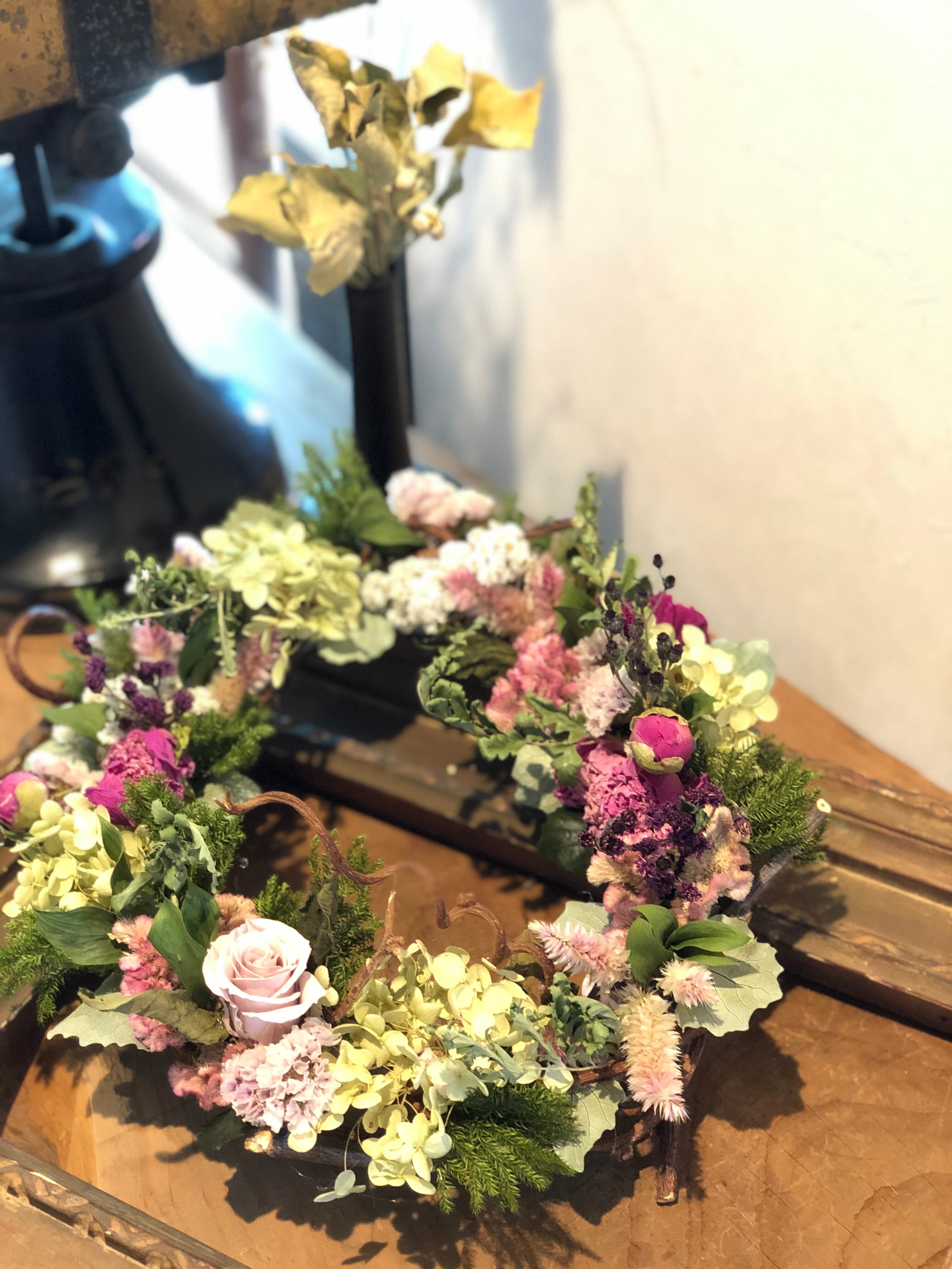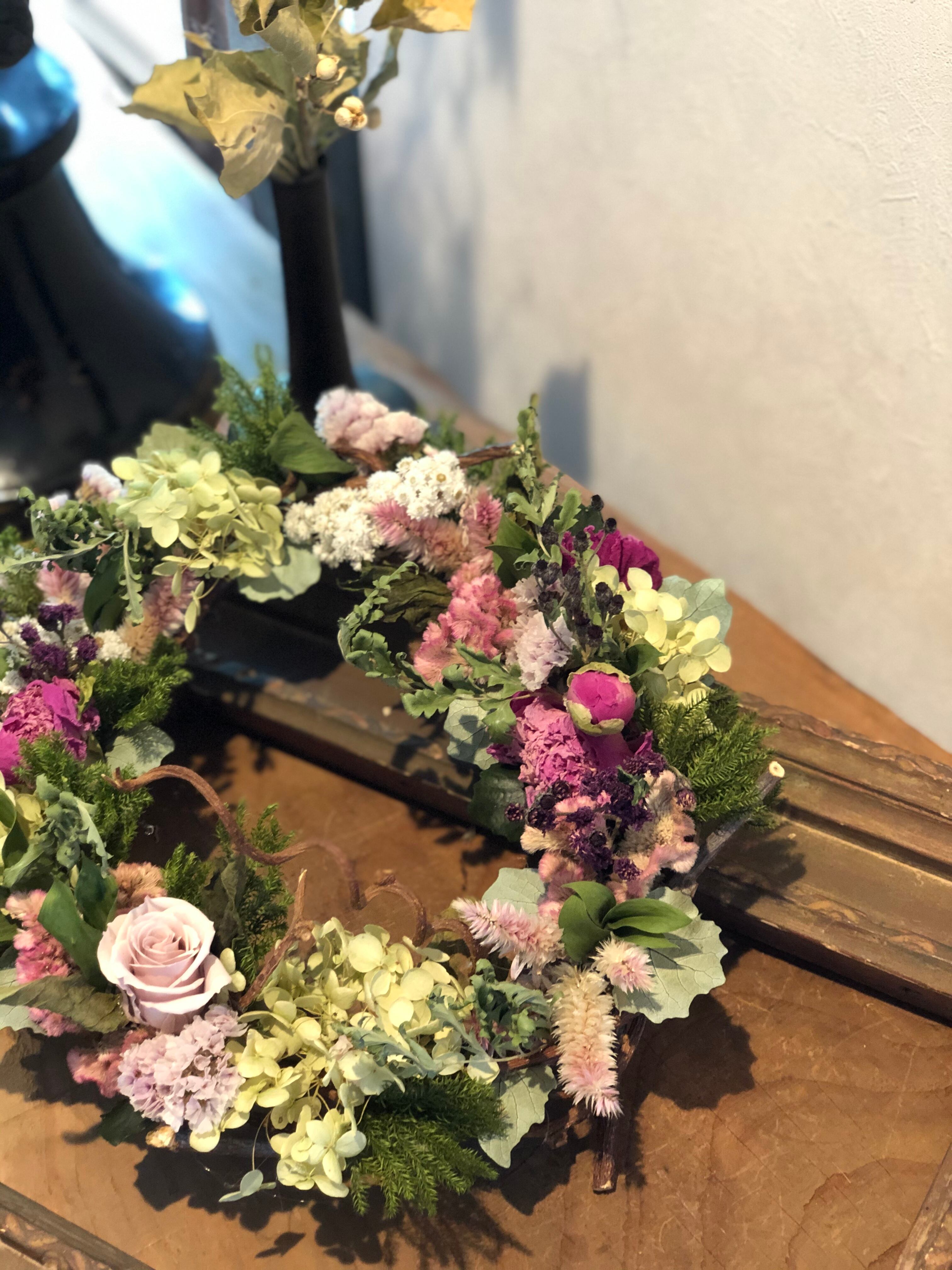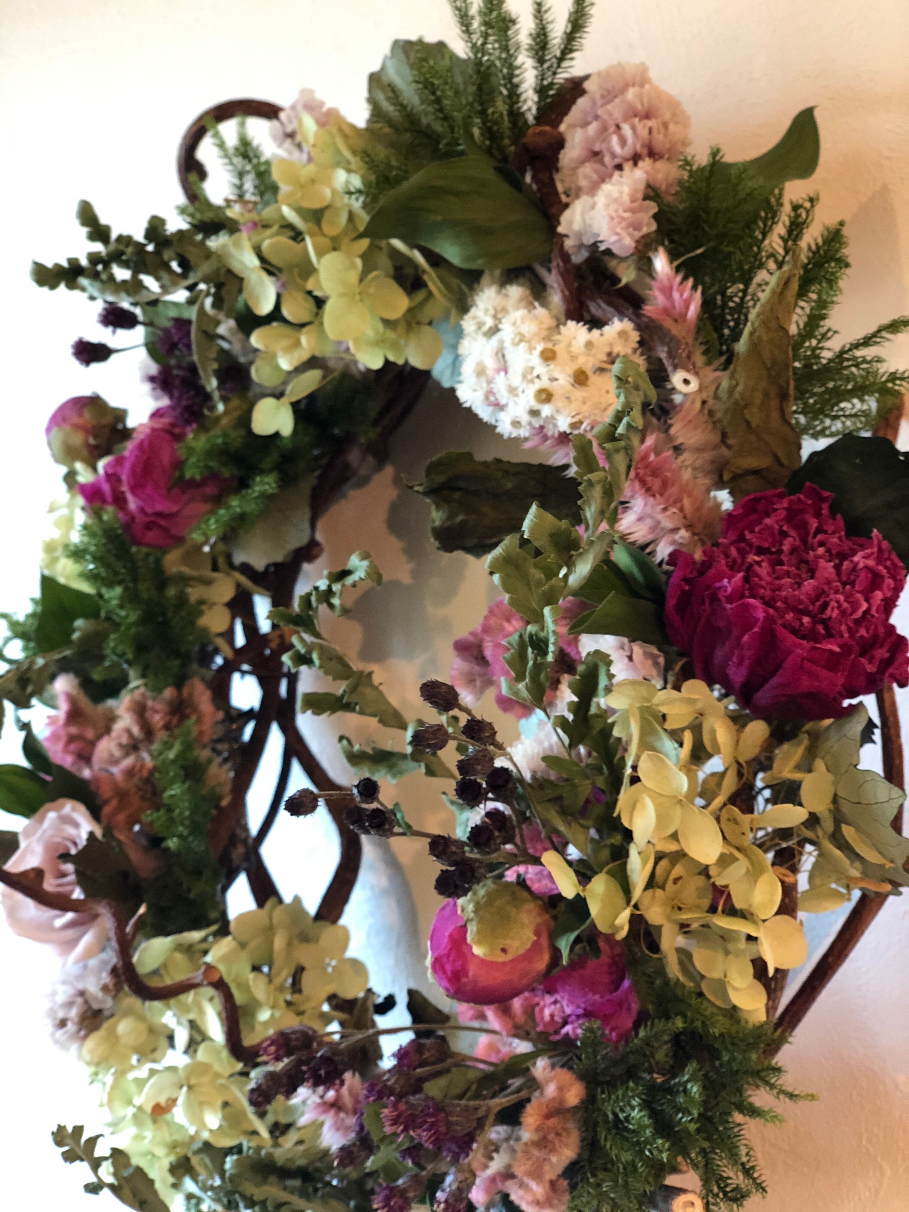 冬~春の間、楽しんでいただけるようなシックで落ち着いた色合いのリースです。