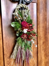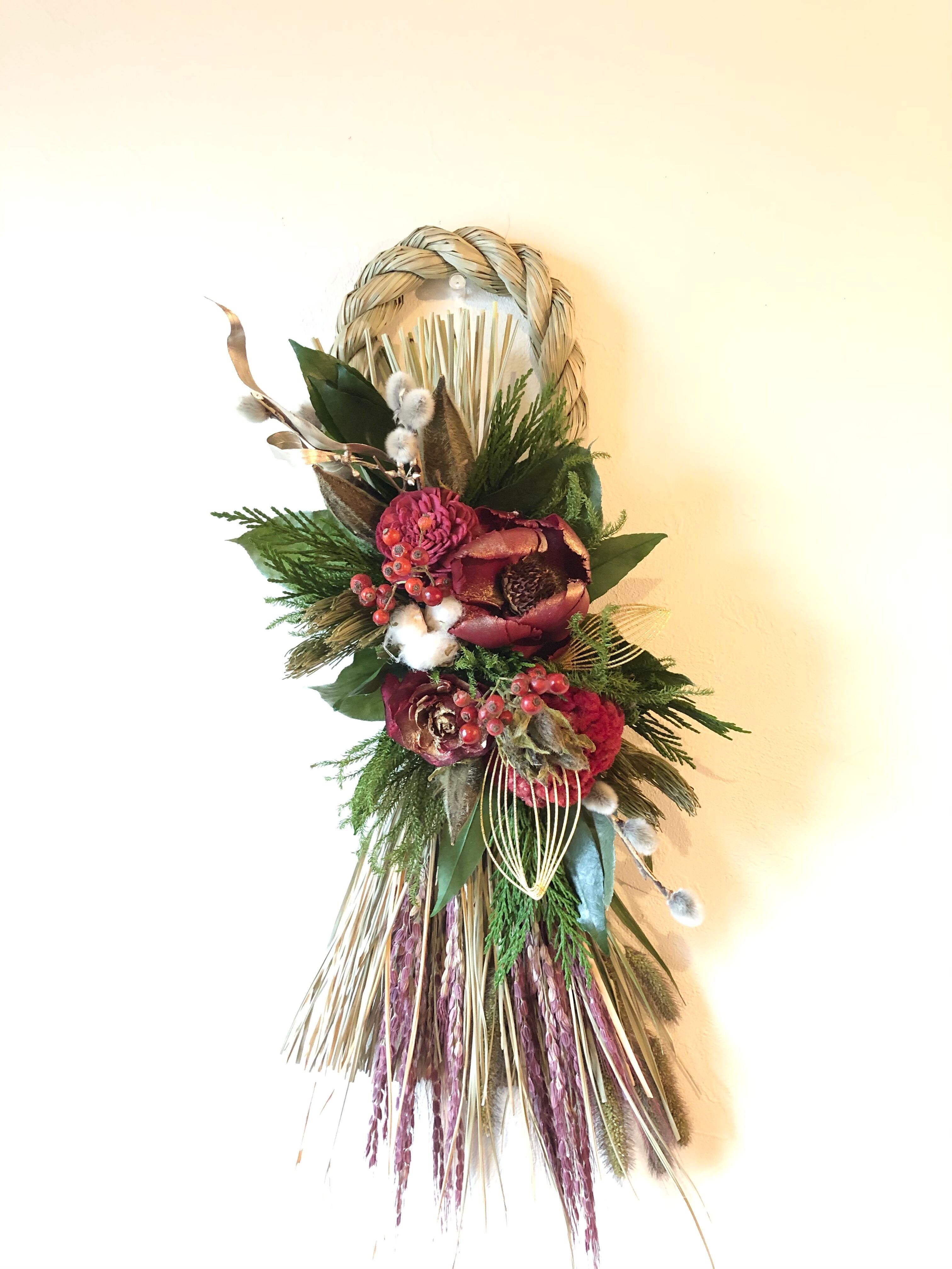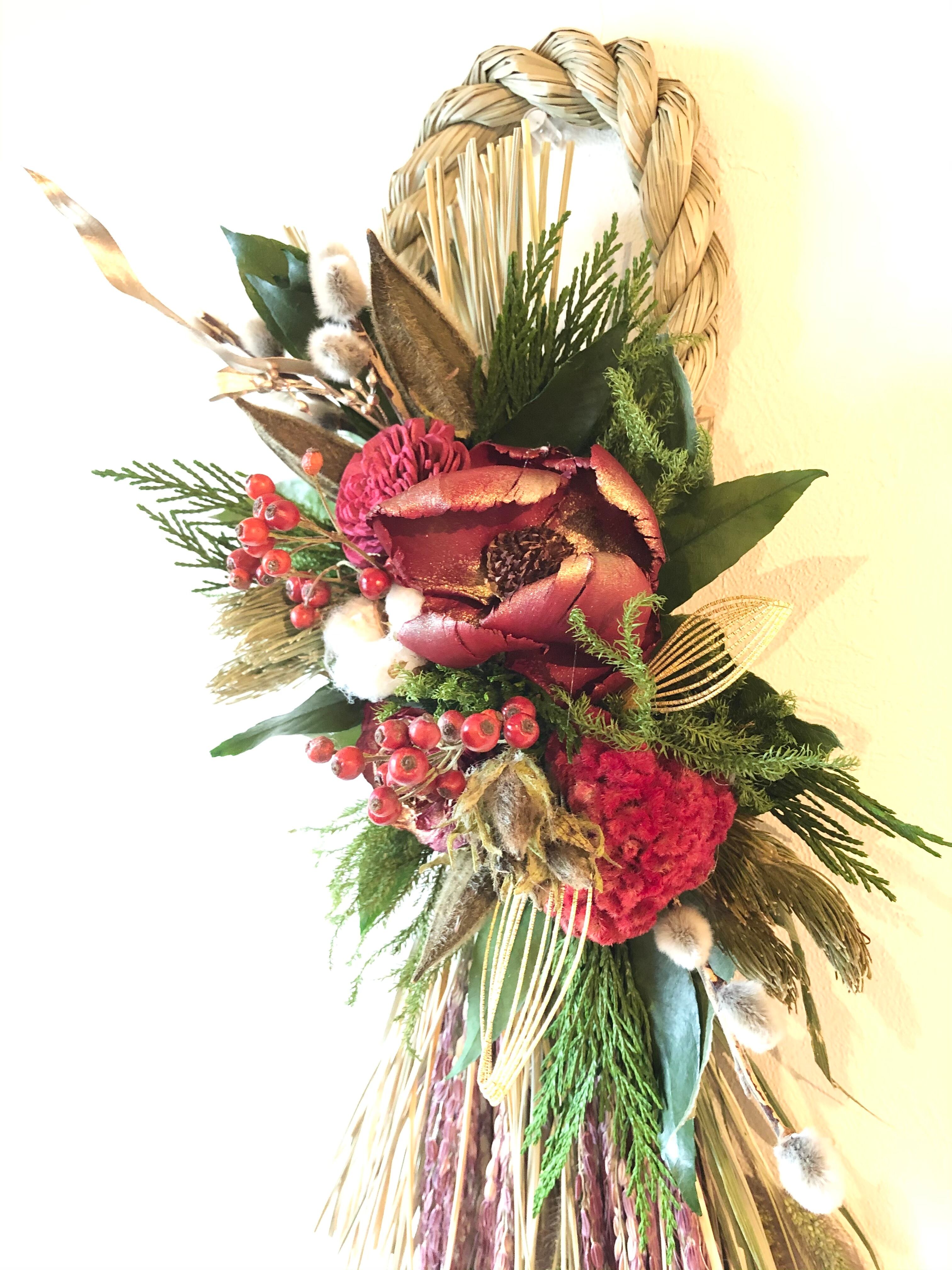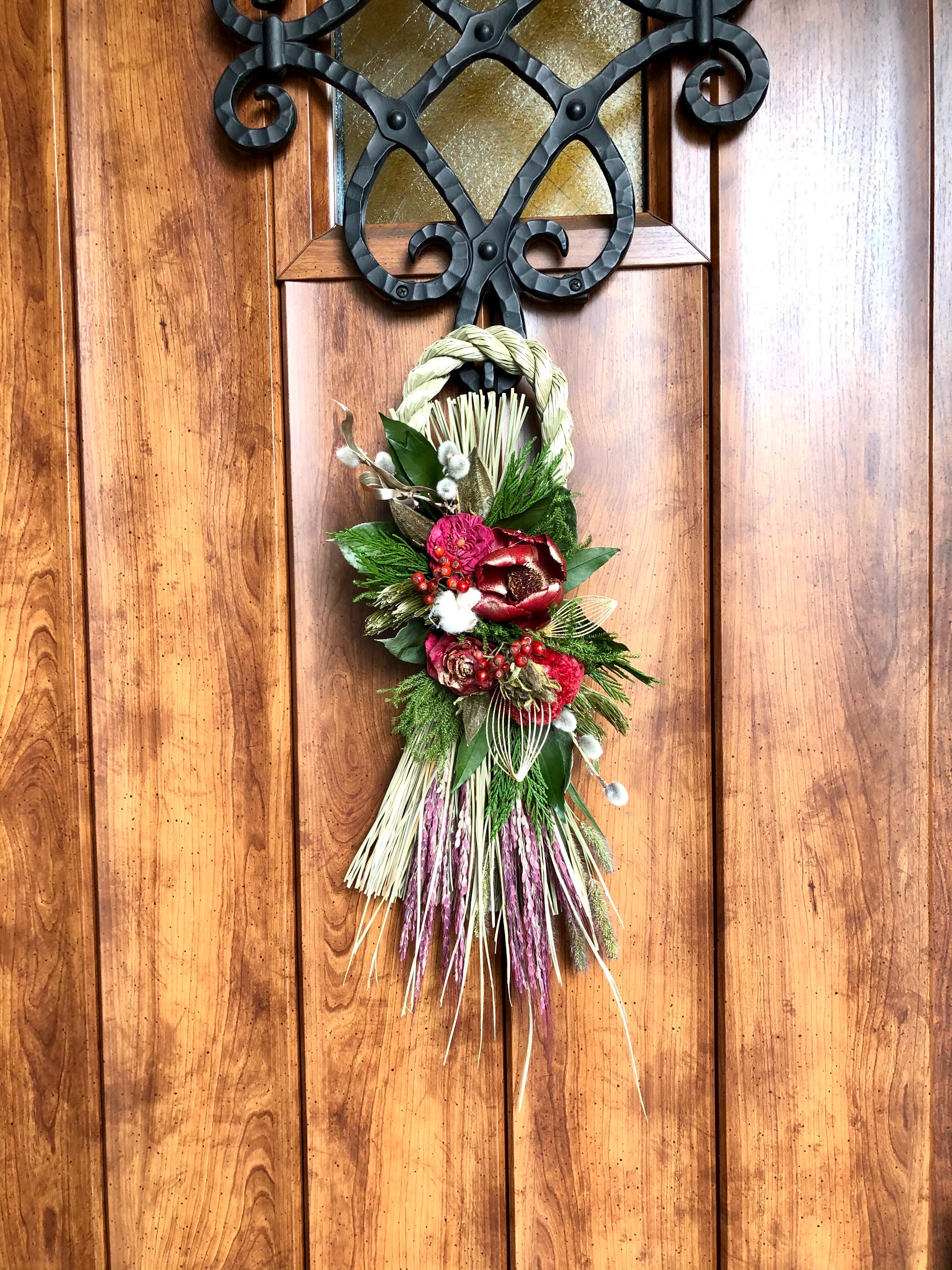 パームフラワーをメインにして、華やかな赤系の花材をたっぷりと使った、縦長のしめ飾り。