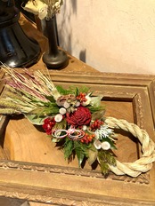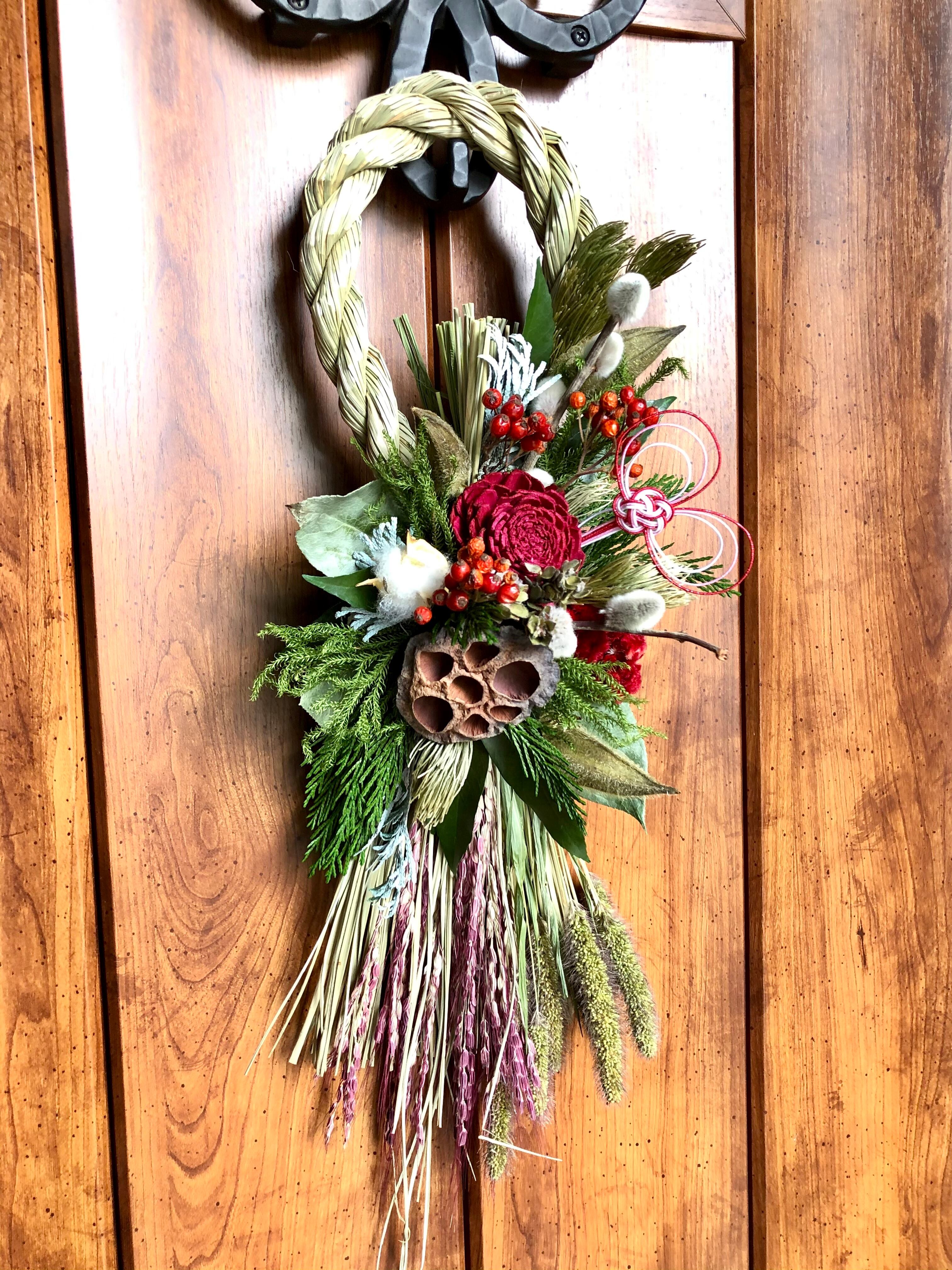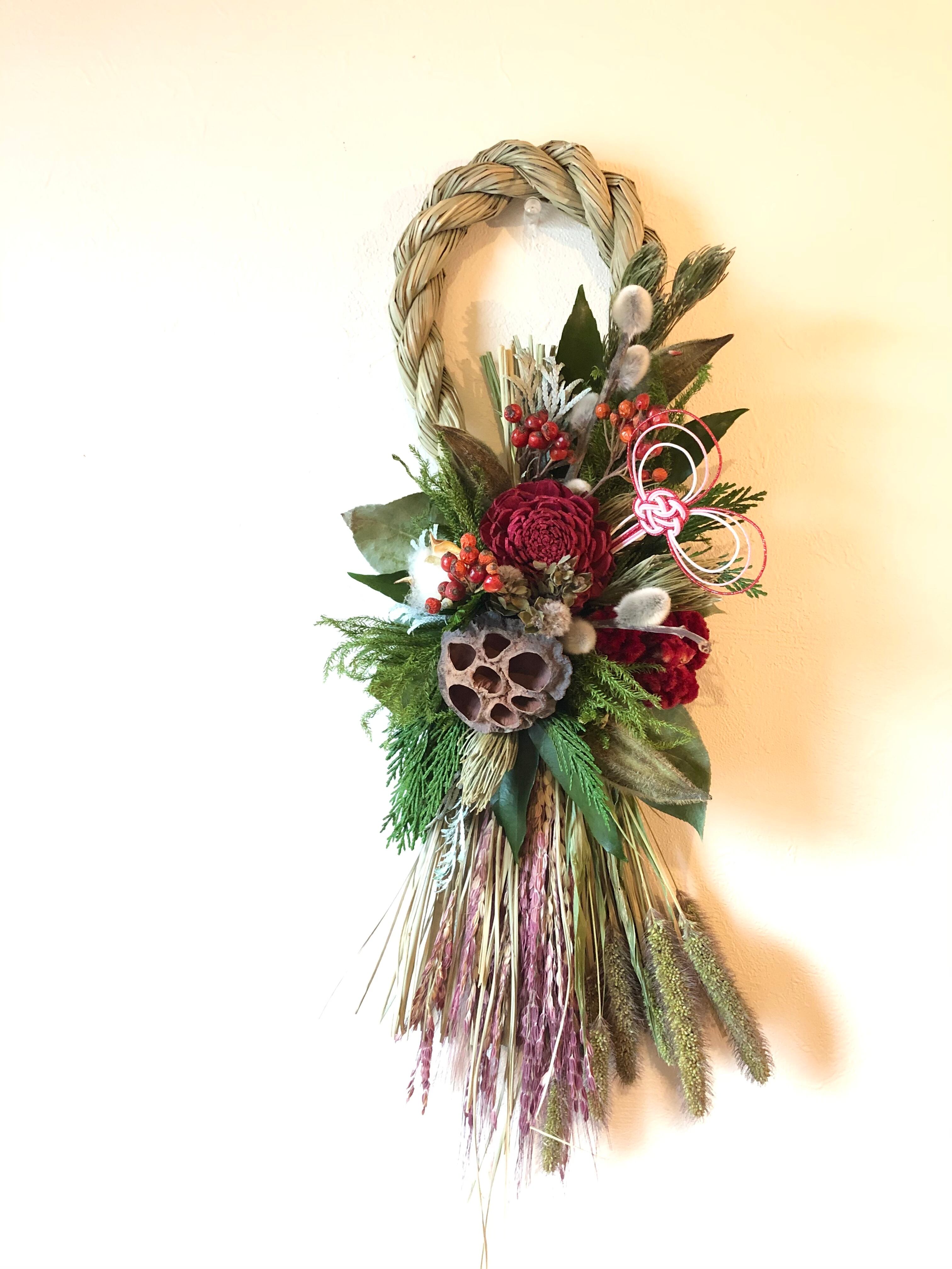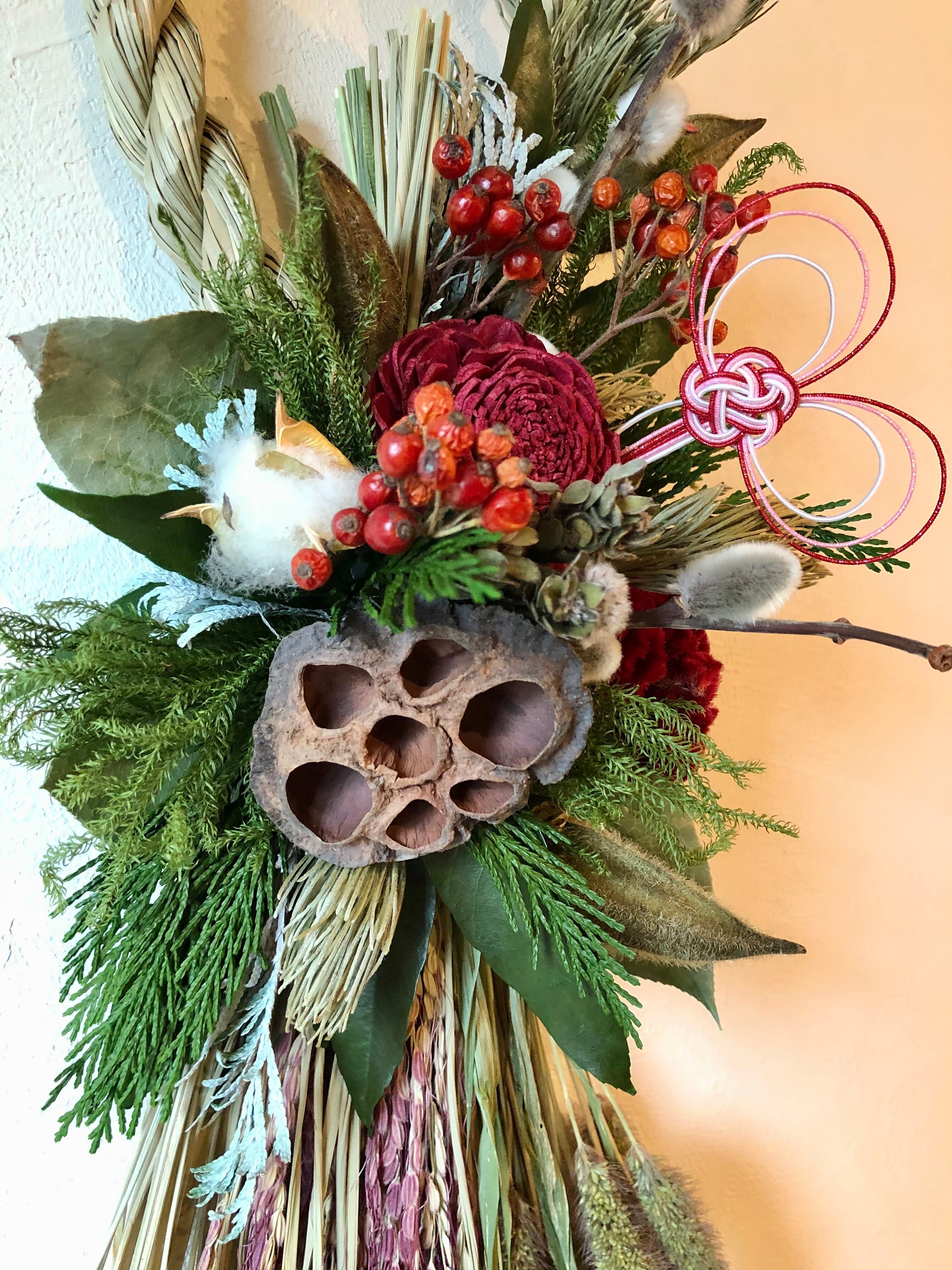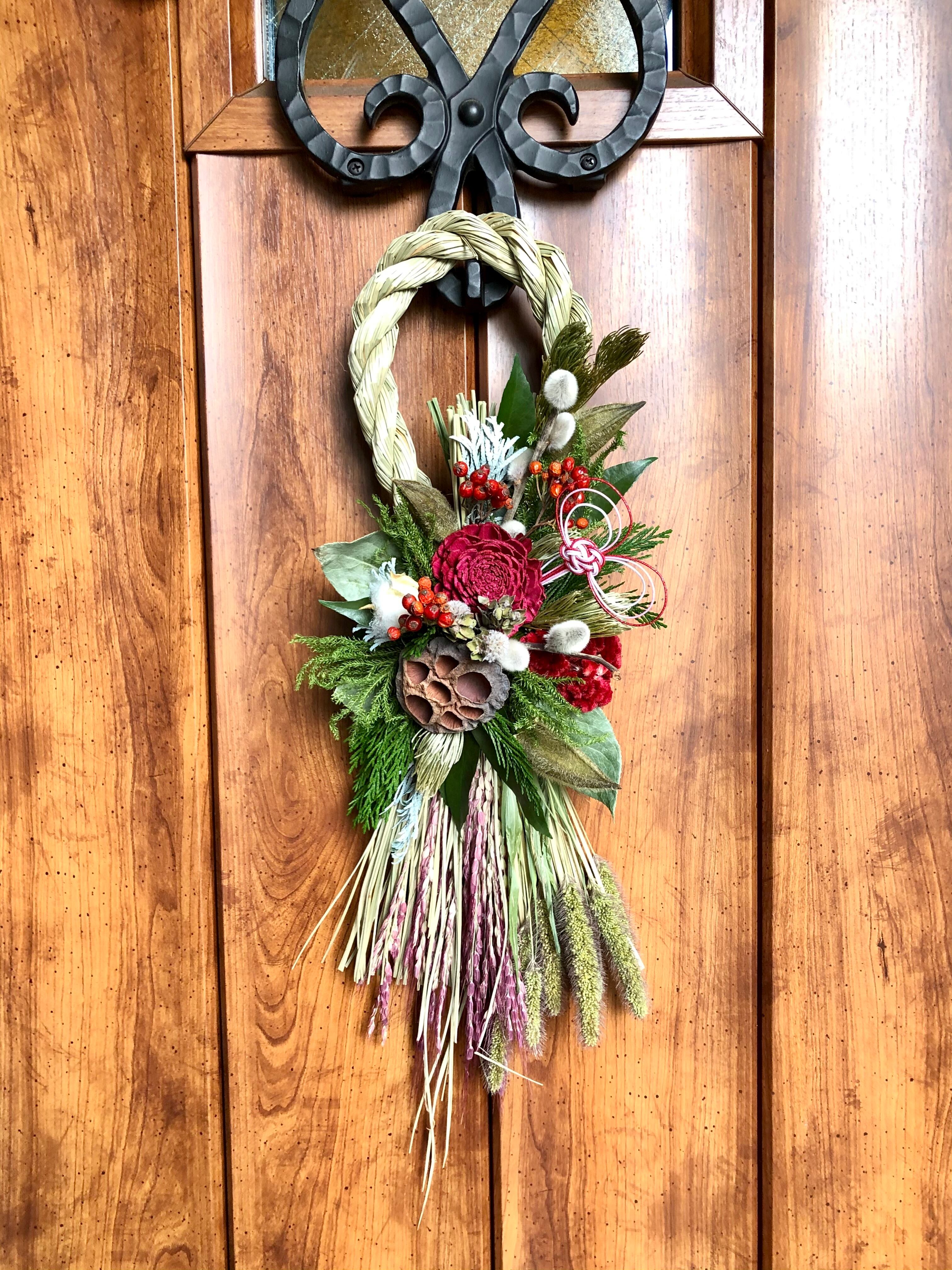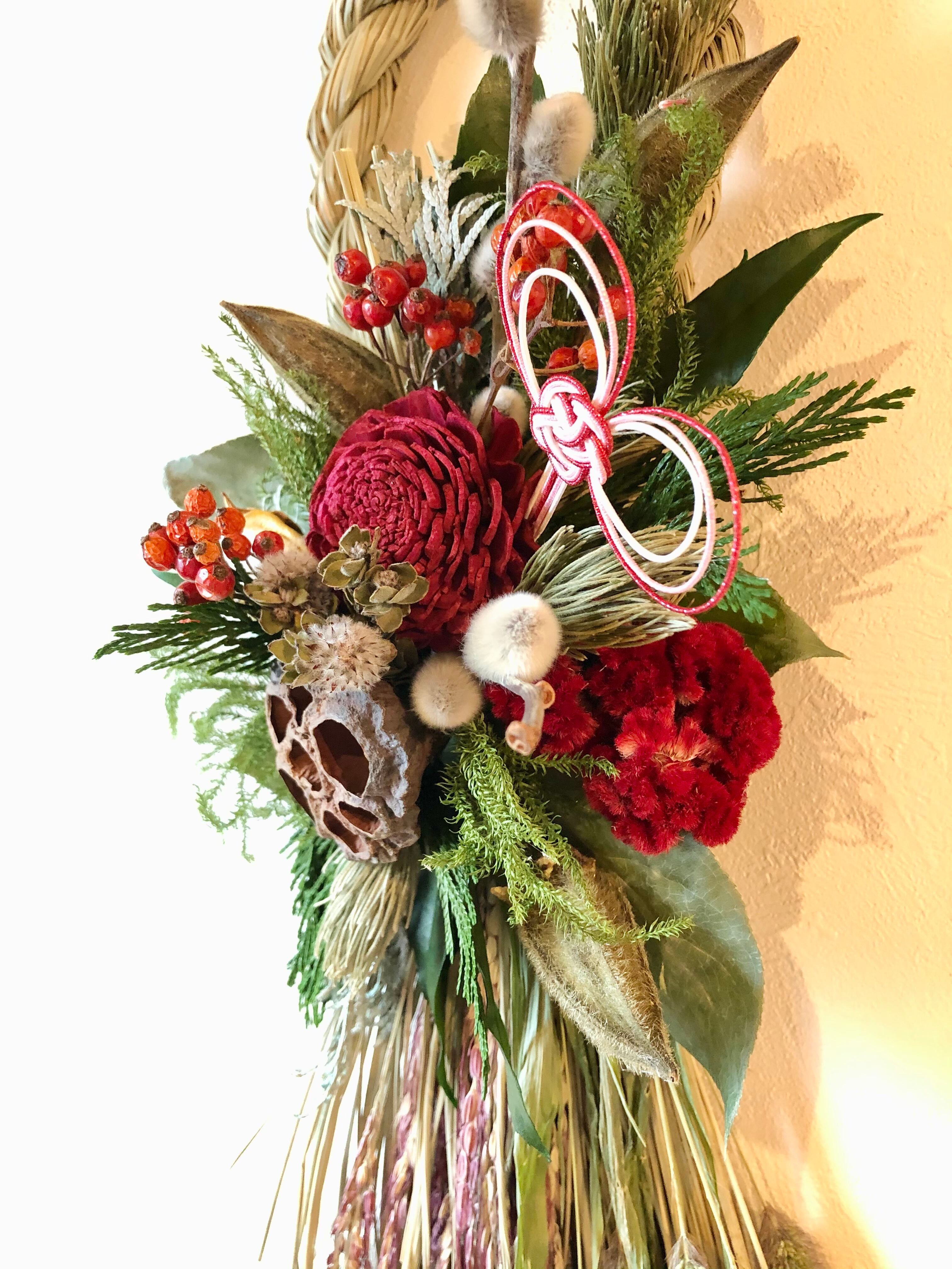 ソーラーフラワーとハスをメインにして、華やかな赤系の花材をたっぷりと使った、縦長のしめ飾り。赤い稲がお正月らしい華やかな雰囲気に。