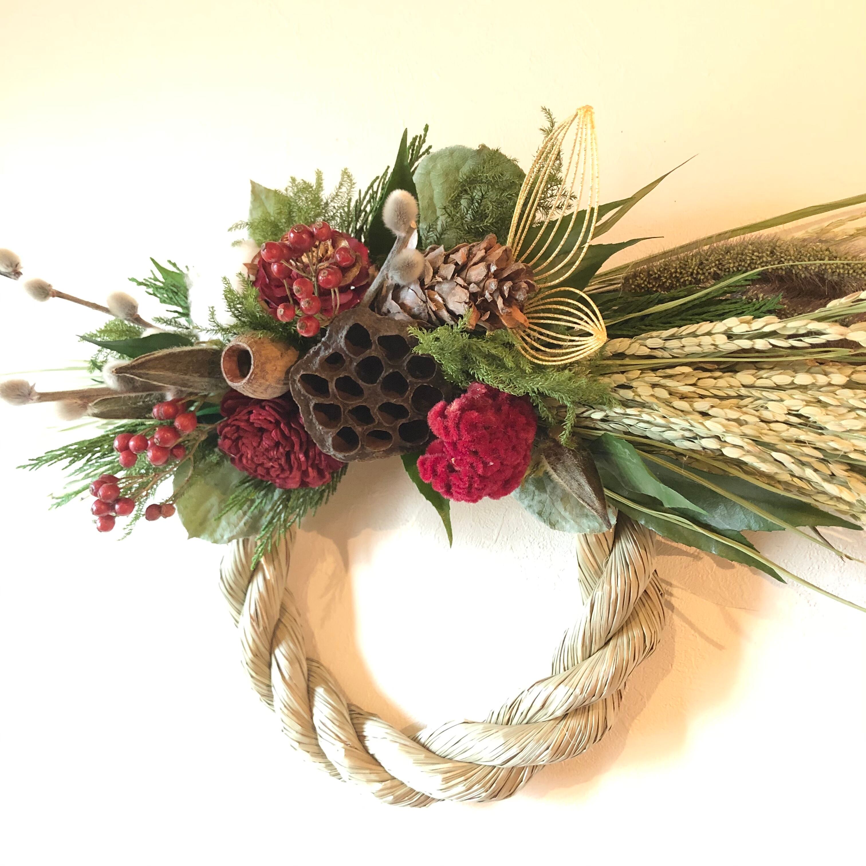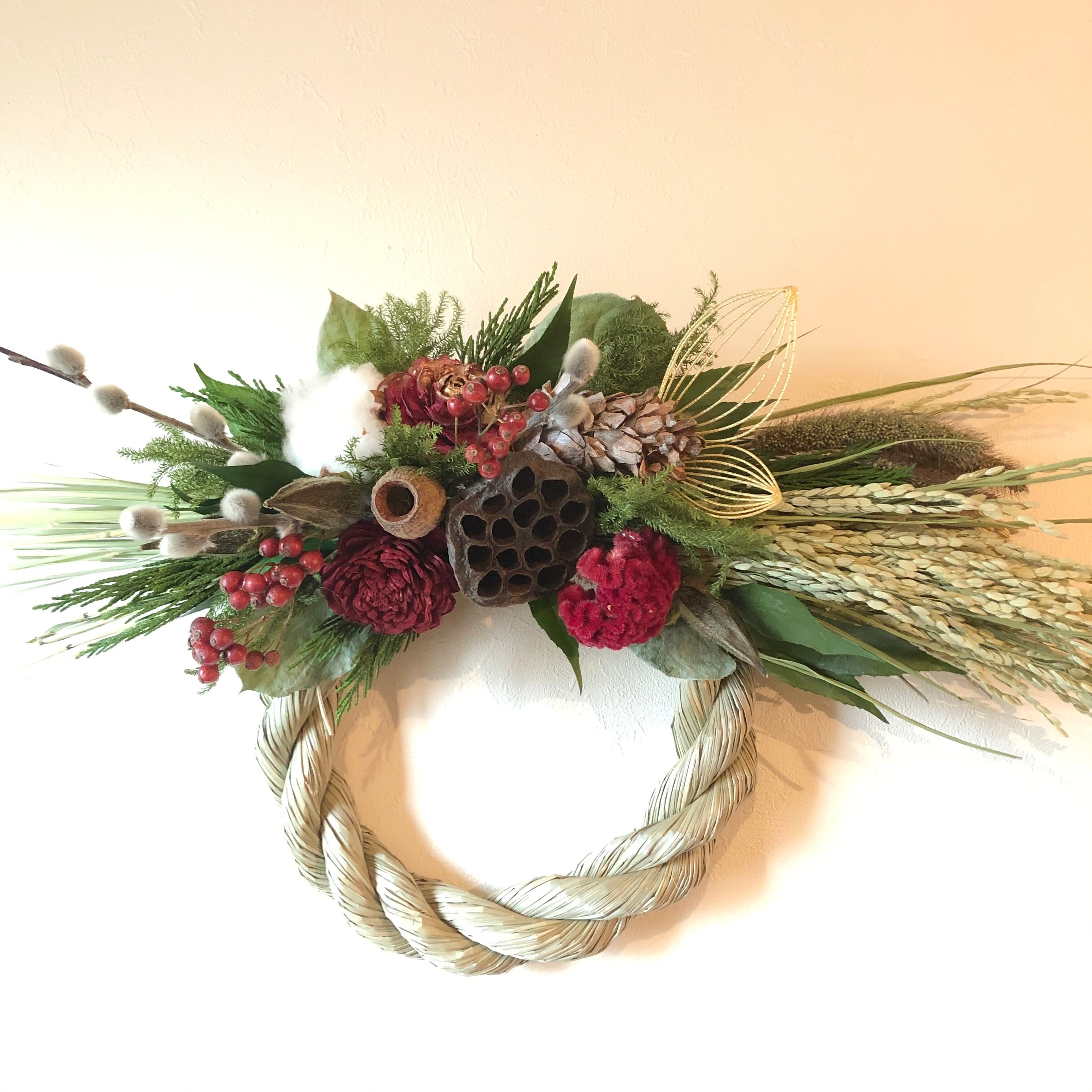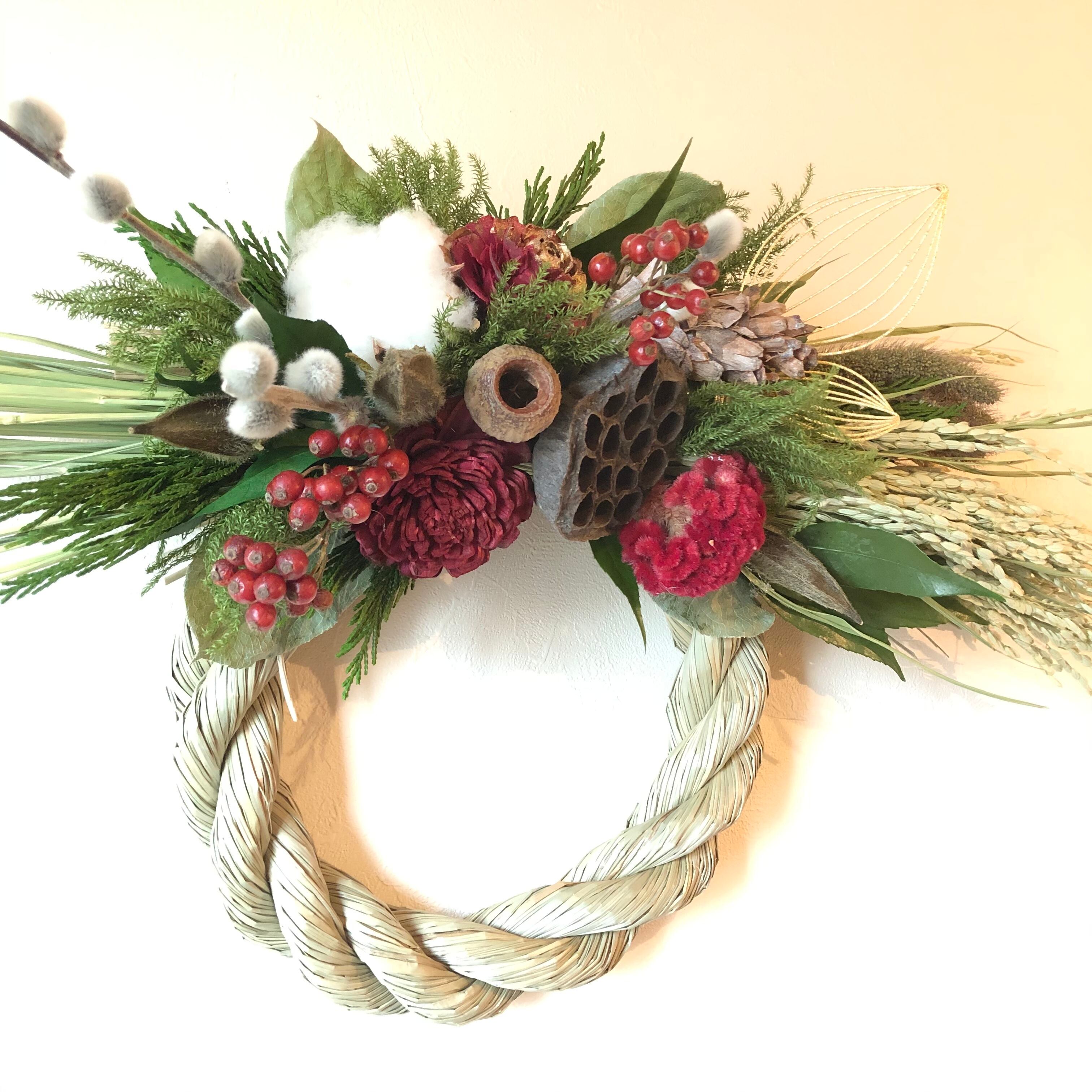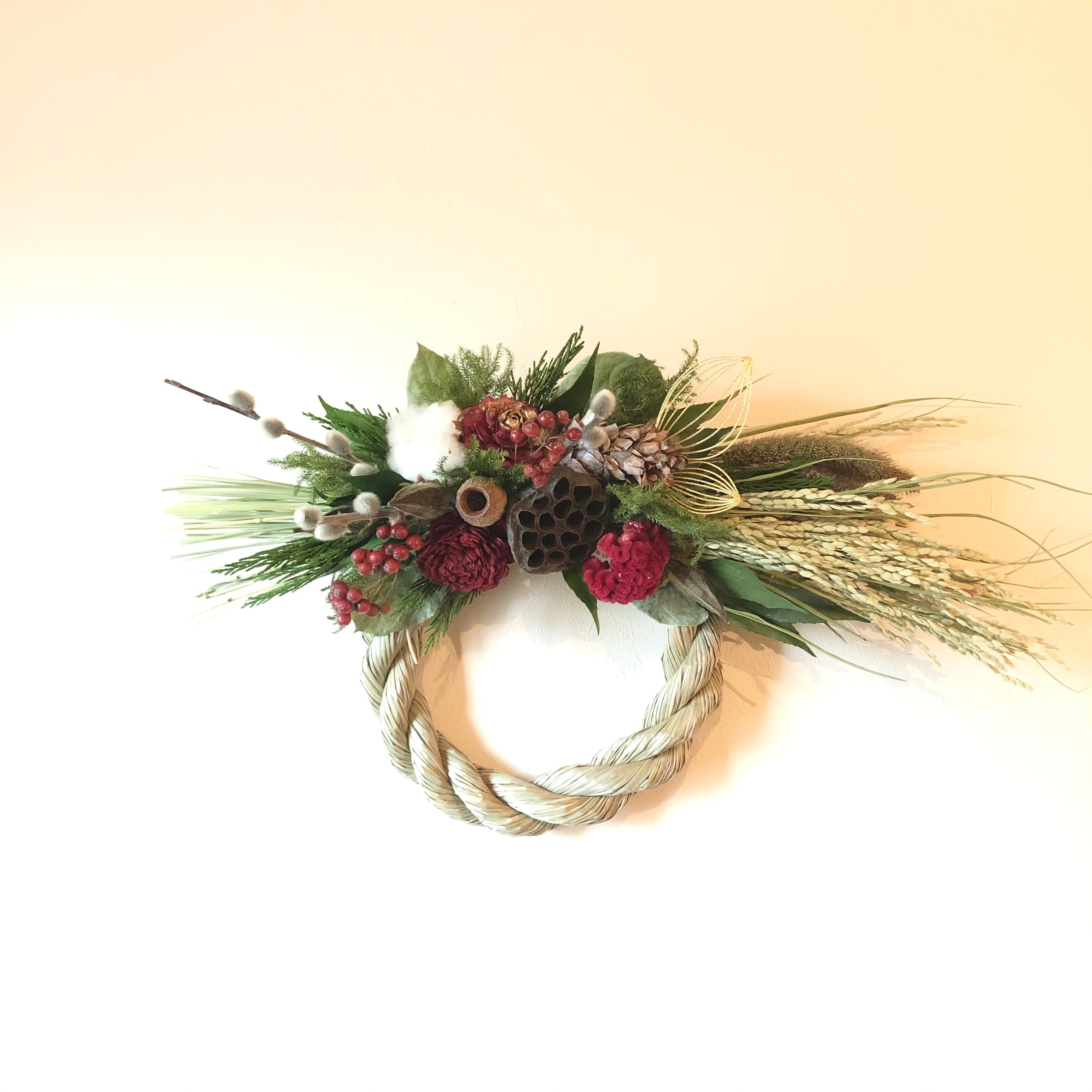 赤のソーラーローズやシダローズなど華やかな花材をメインに、ハスや松ぼっくり、稲穂など、お正月らしい花材をたっぷりと使ったしめ飾り。白のユキヤナギが可愛らしい、華やかなしめ飾りです。