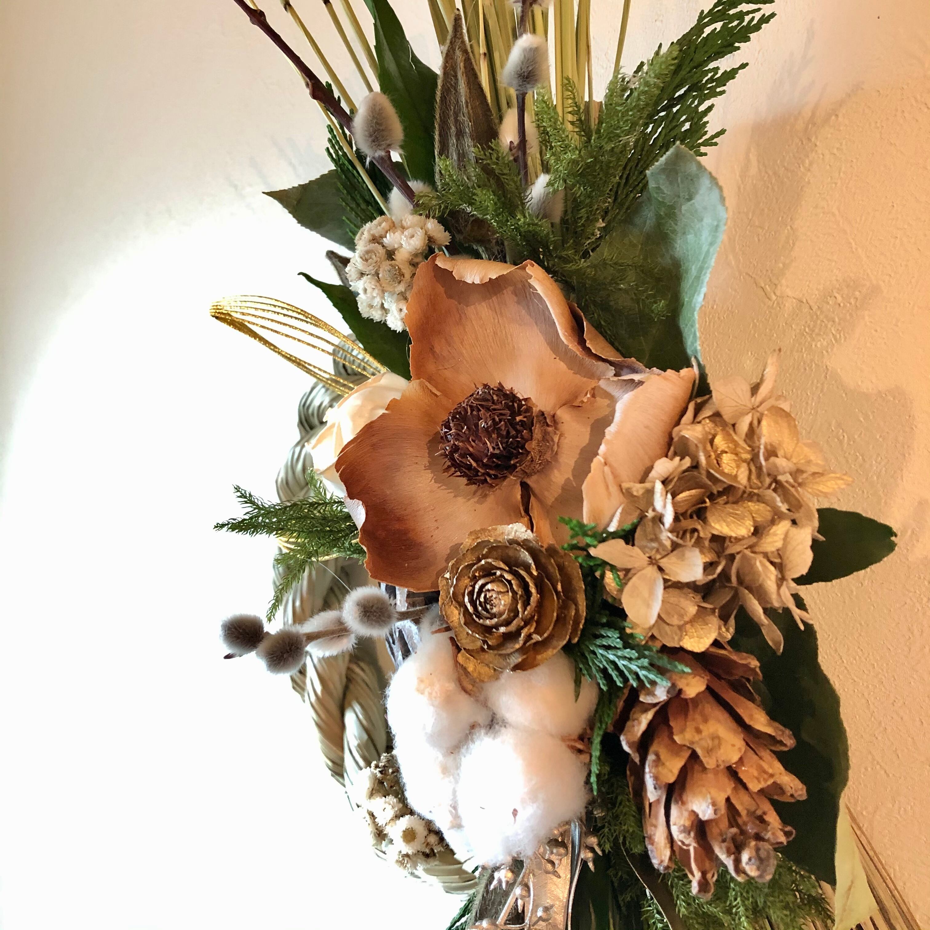 ゴールドのシダローズやユーカリとシックな葉飾りを使って華やかさもプラスして。
