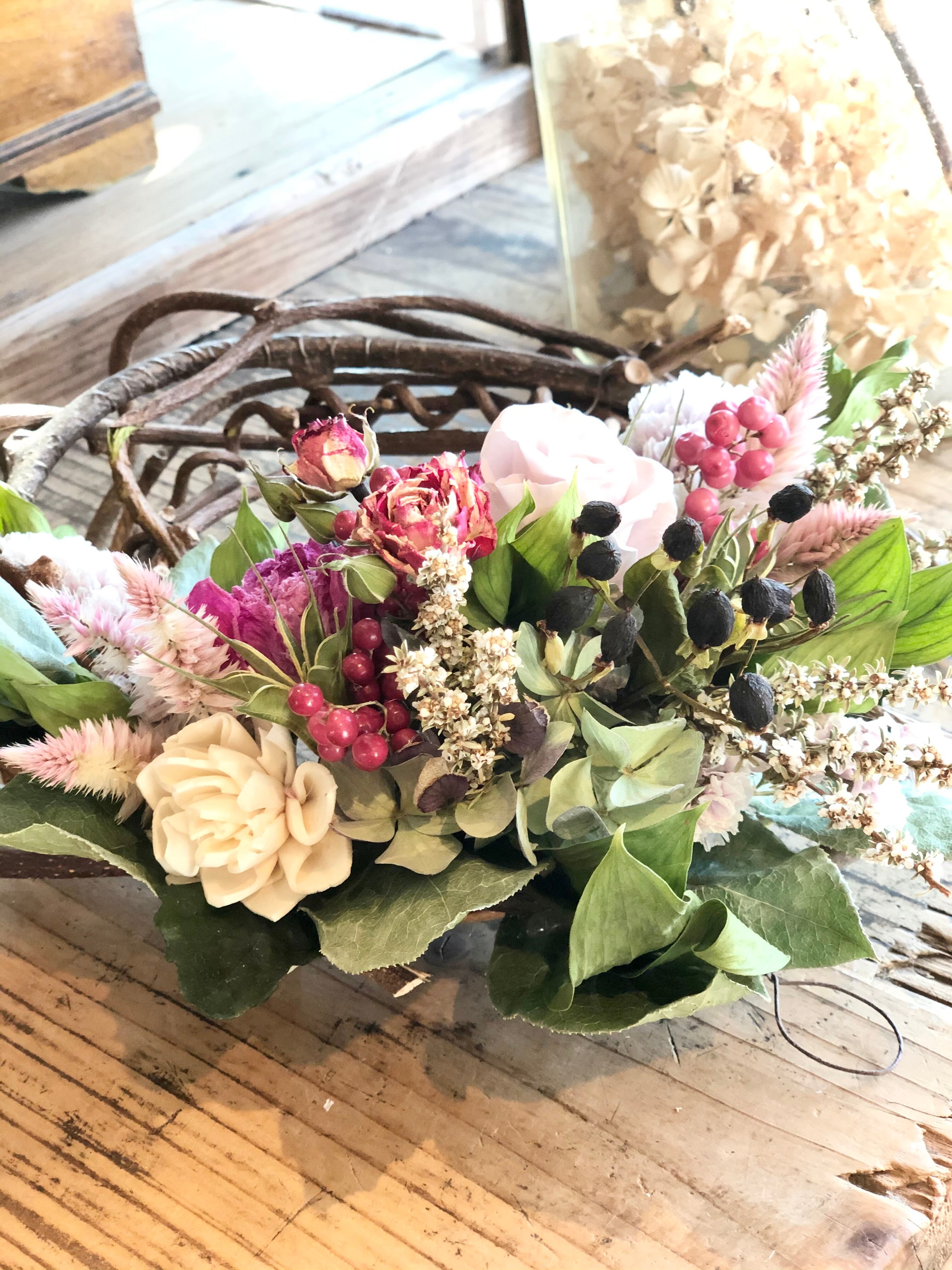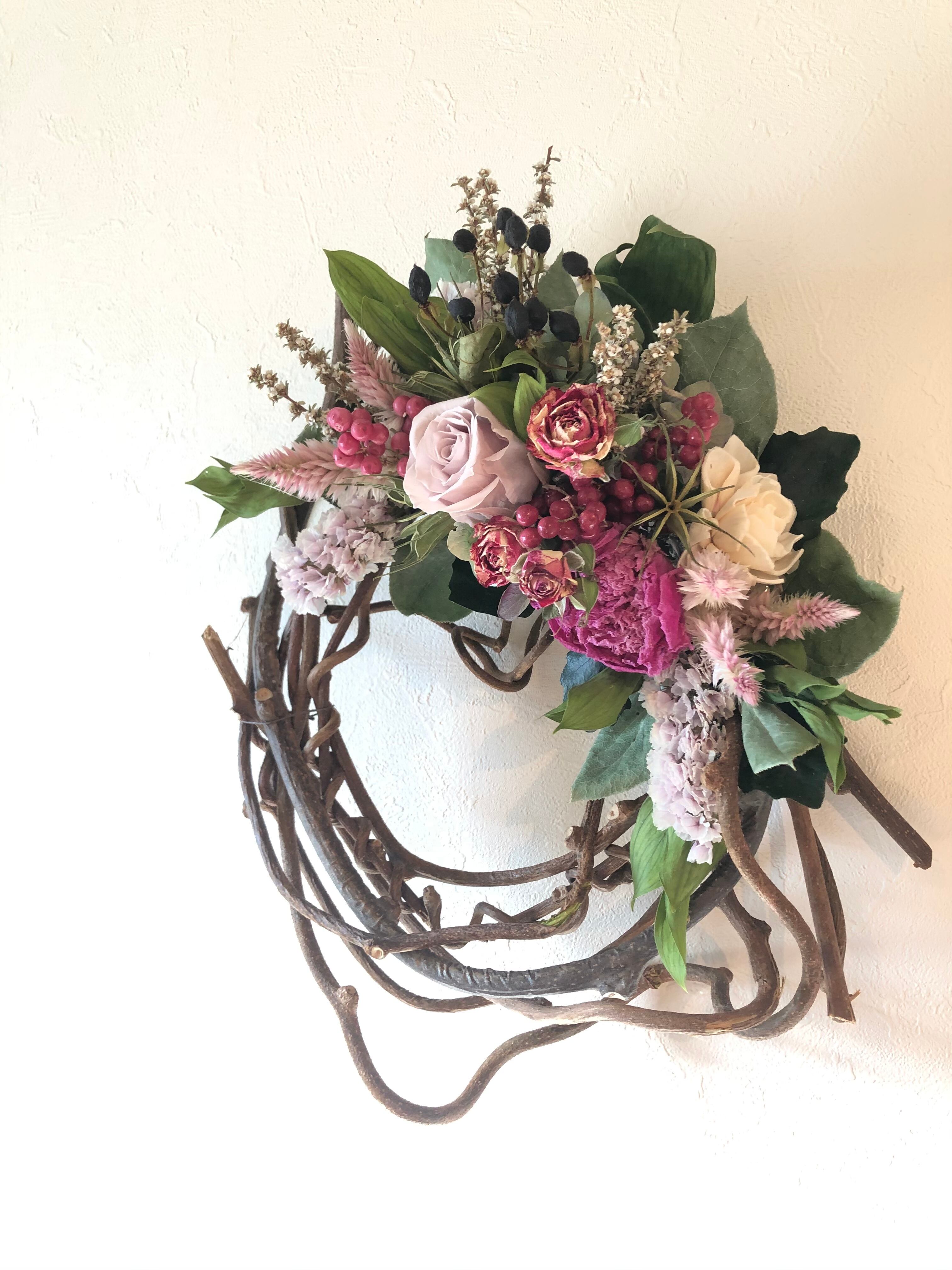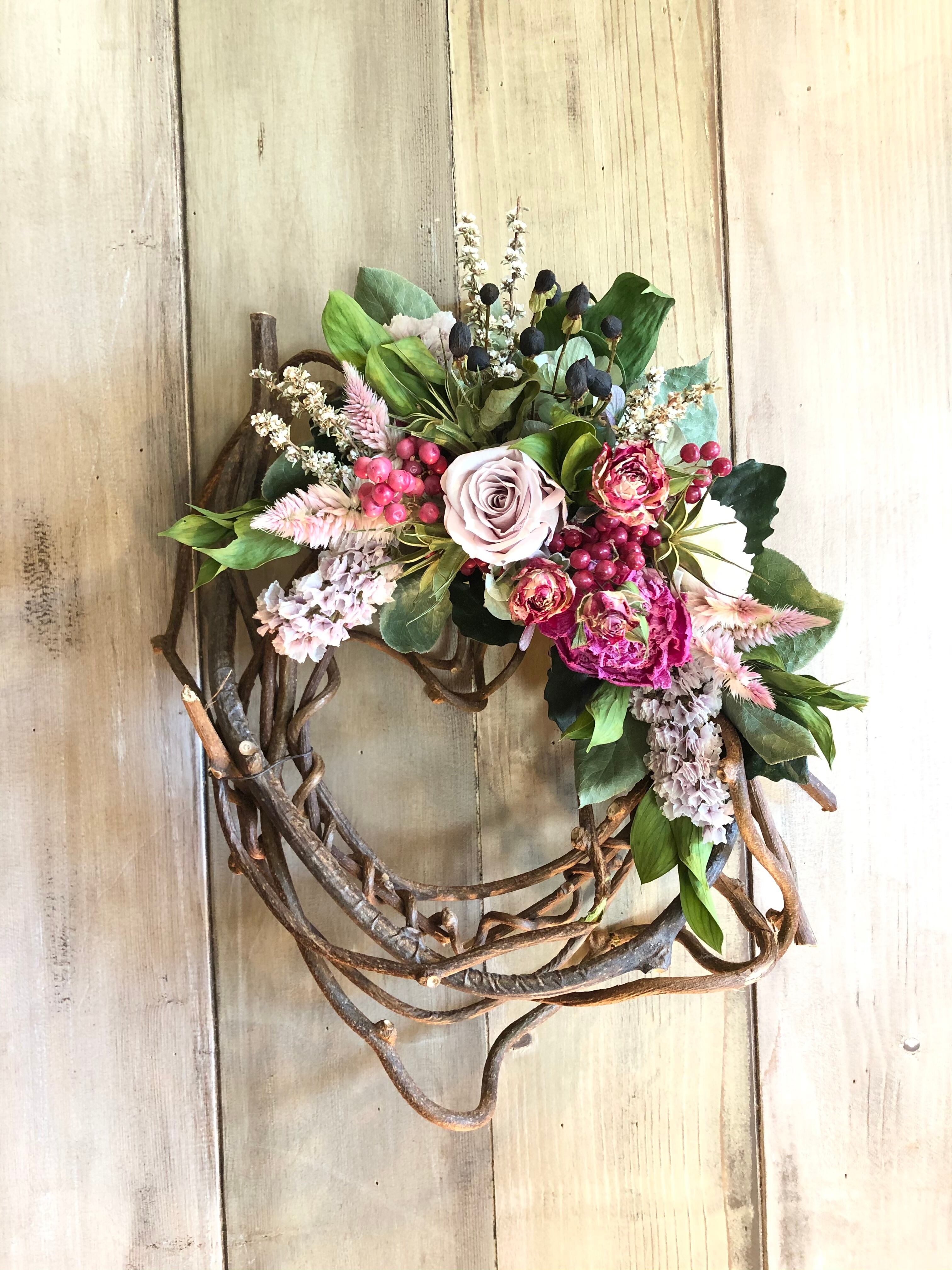 キウイヅルのナチュラルなリースベースに、シックな色合いの花材をたっぷりと入れた、