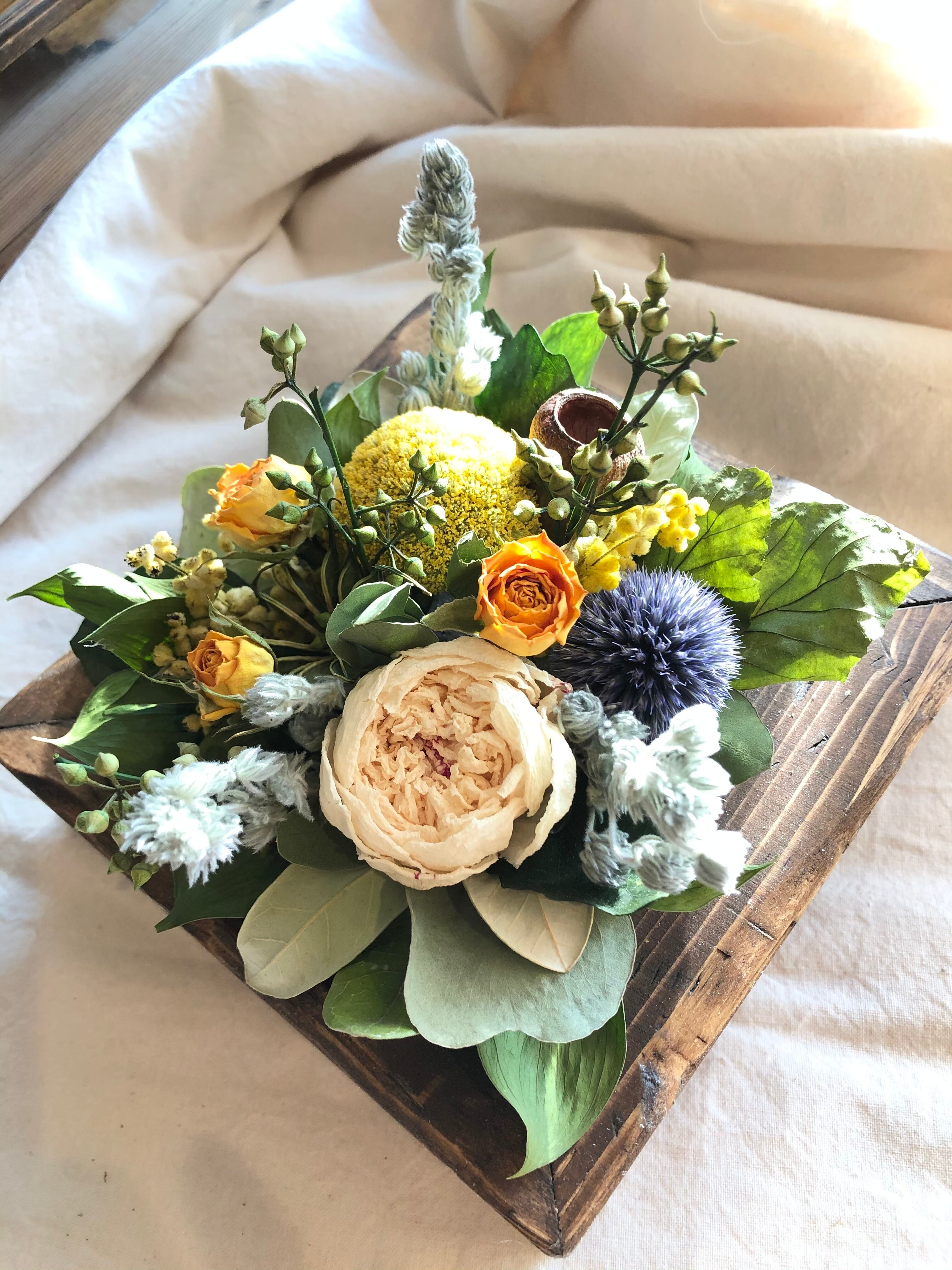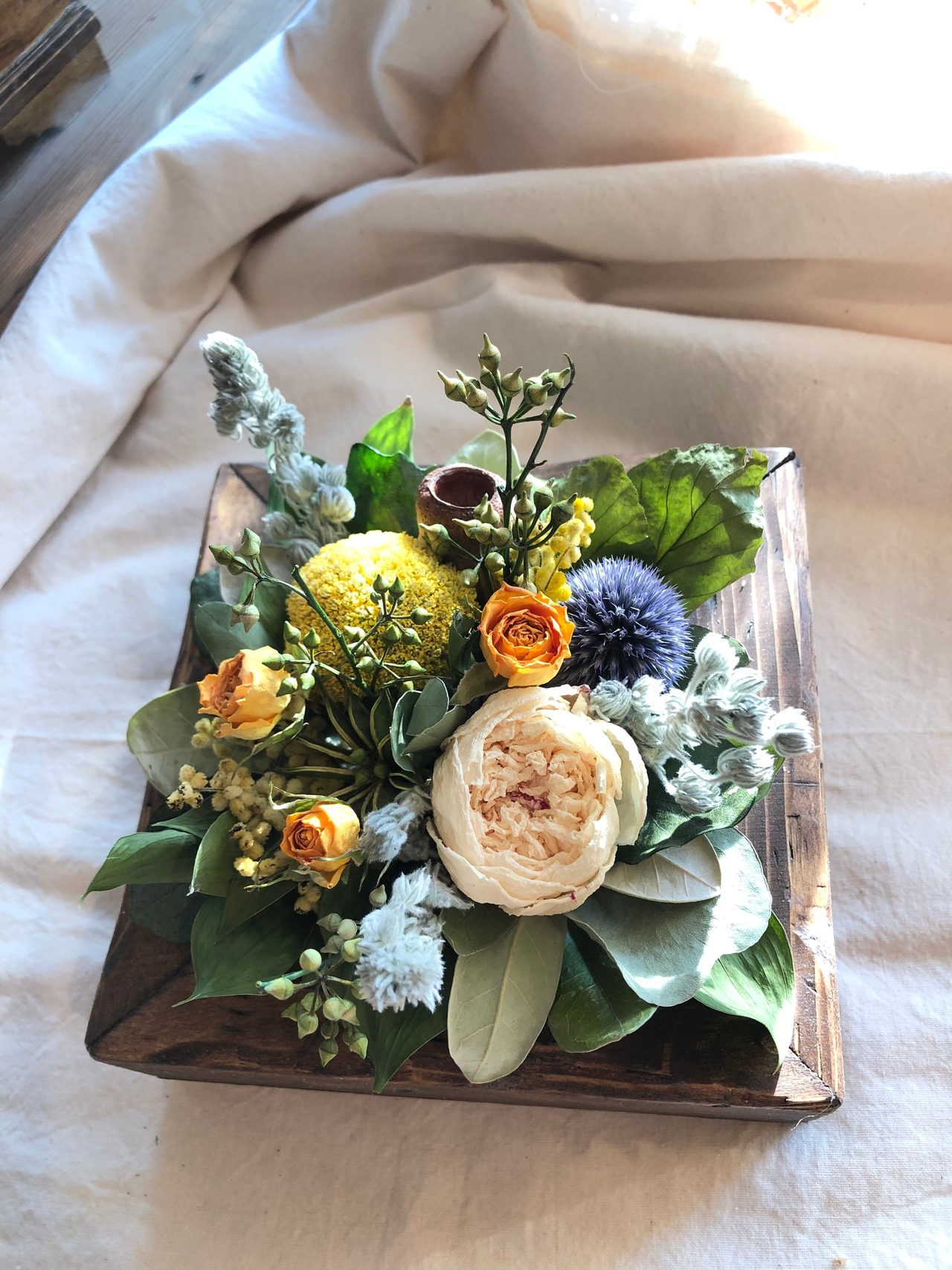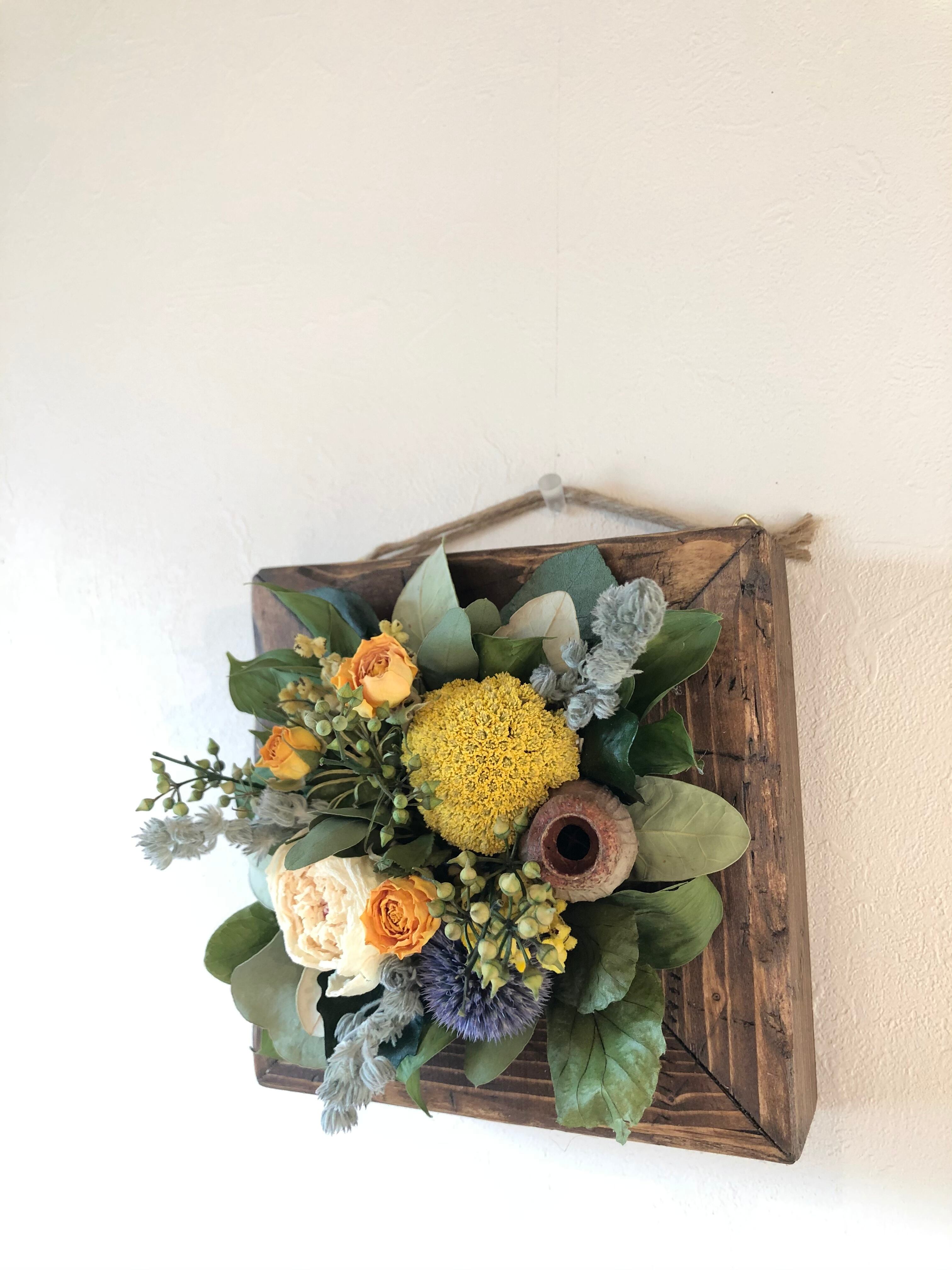 古木フレームの厚みが4㎝。ボリューム感もあり、ちょっとした贈り物にも喜ばれるアレンジメントです。