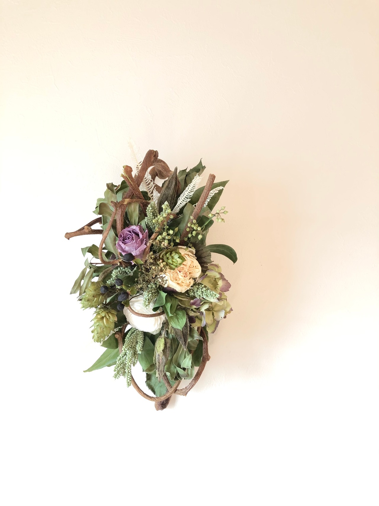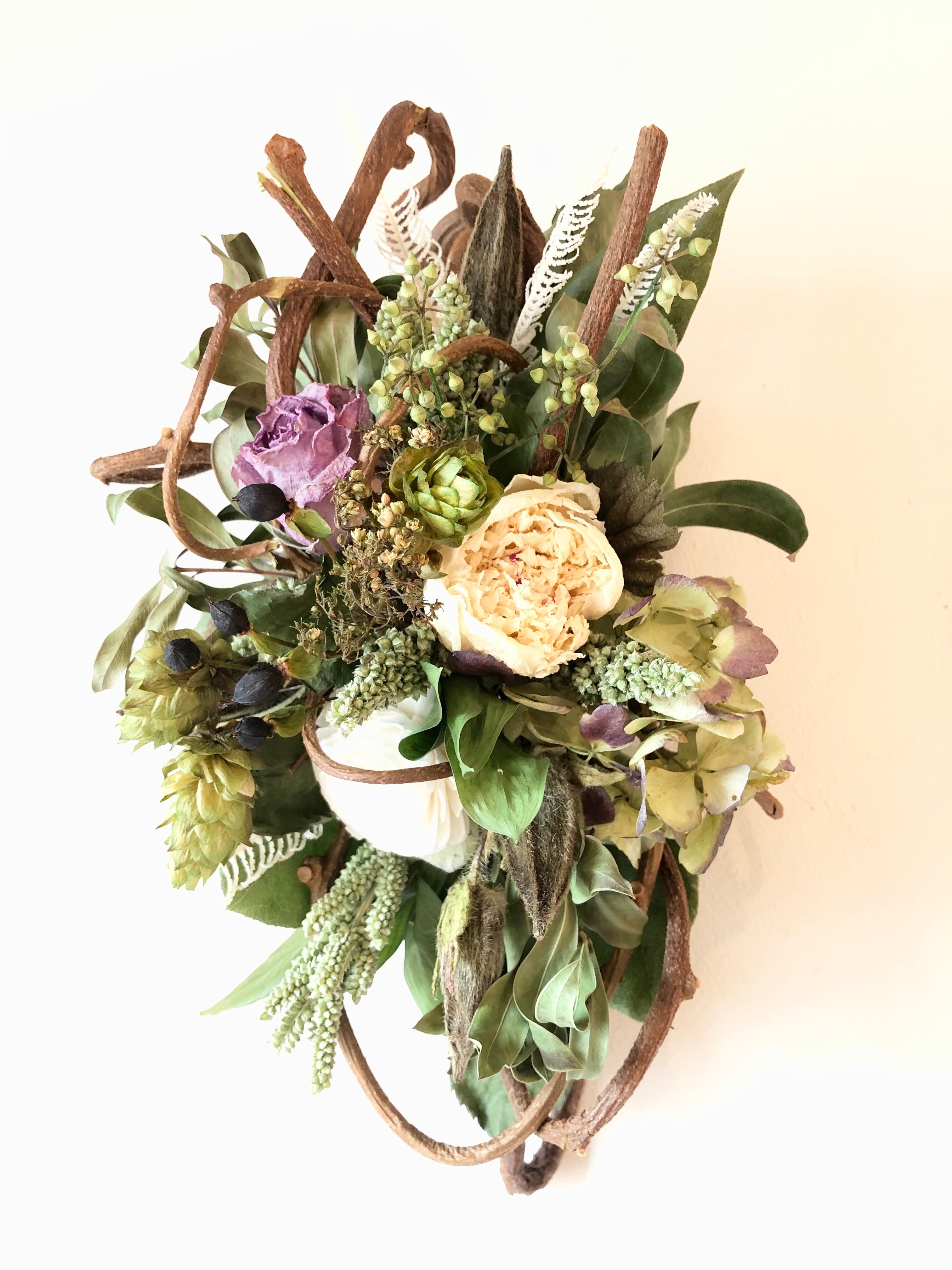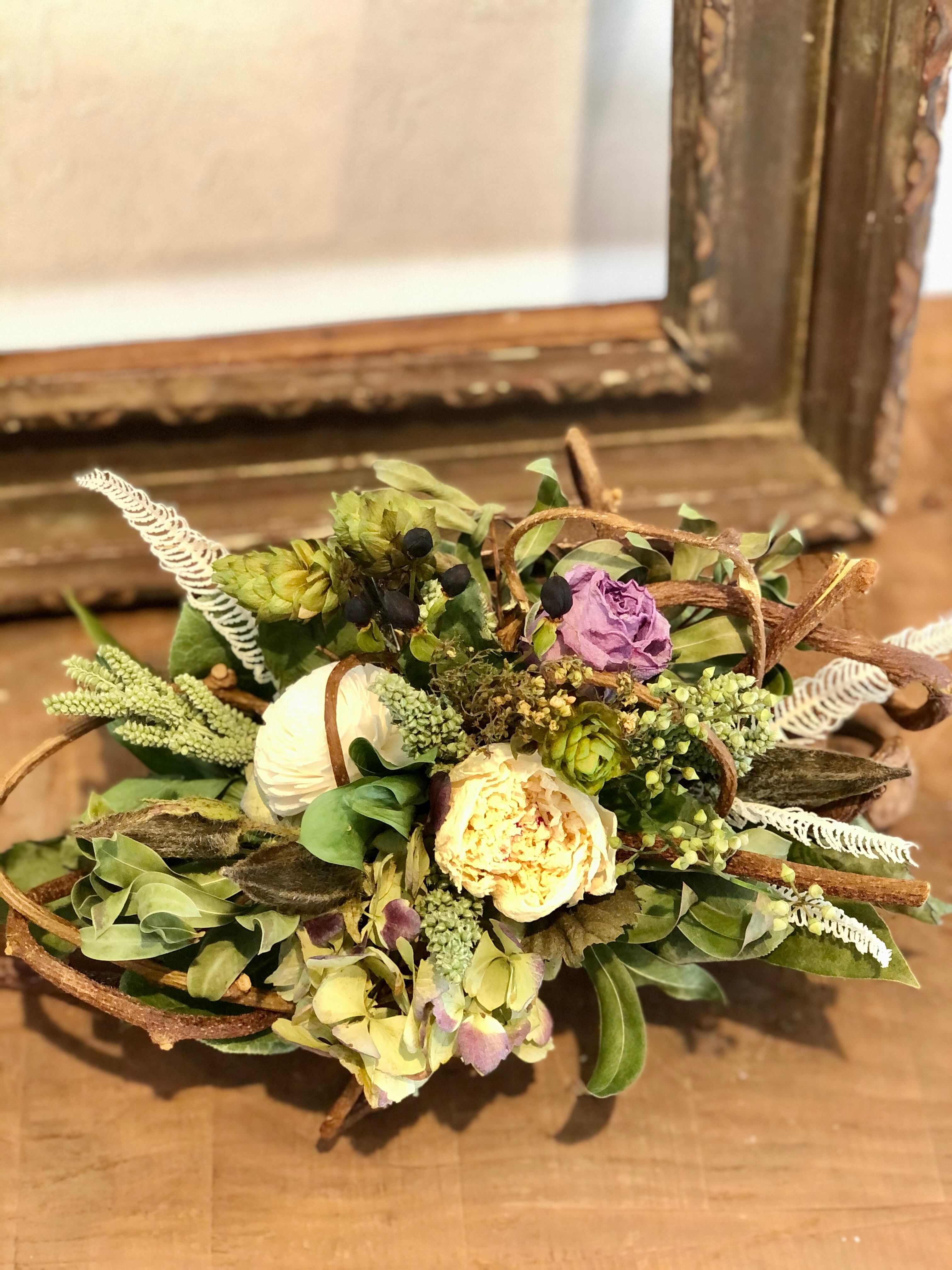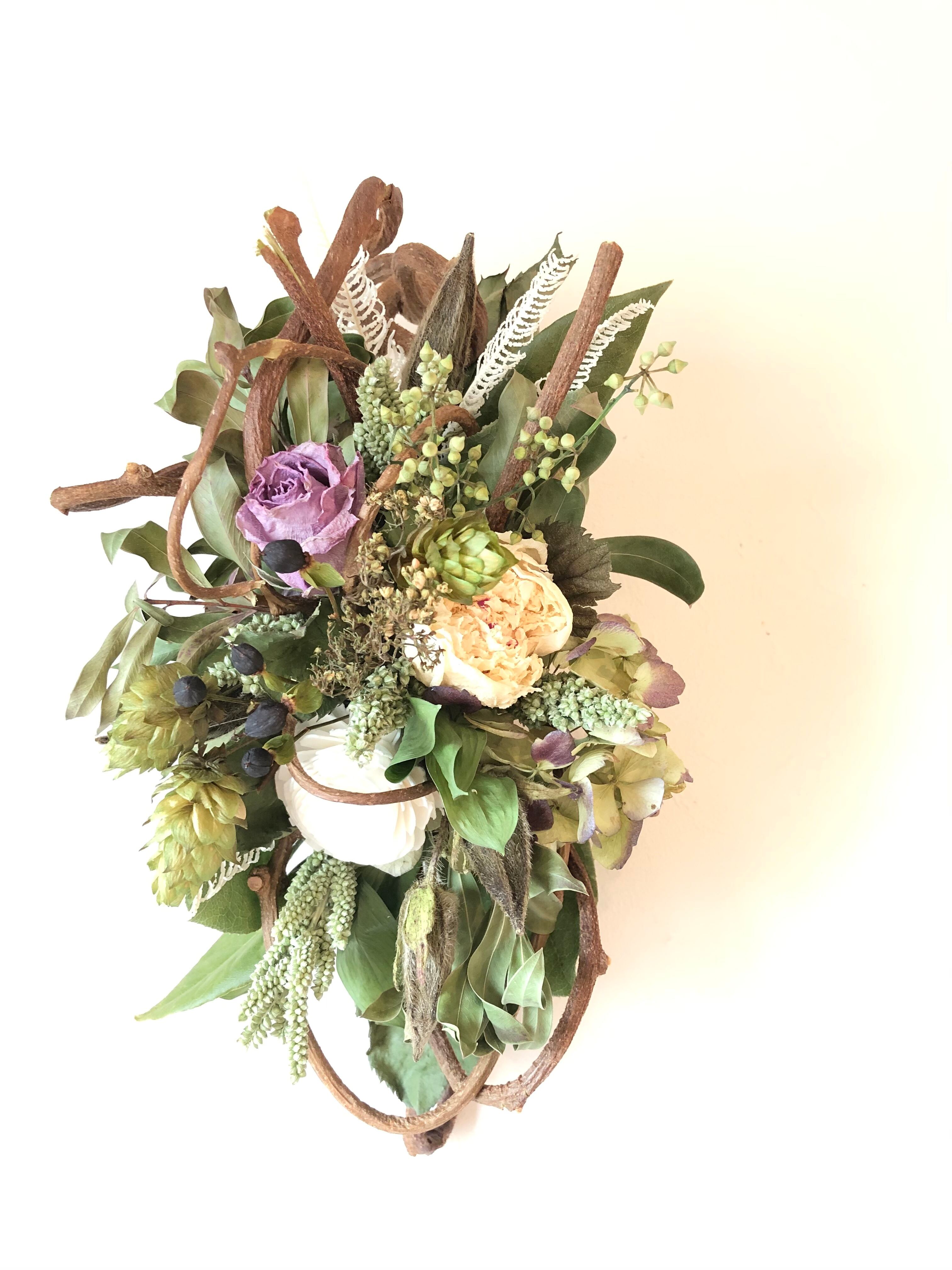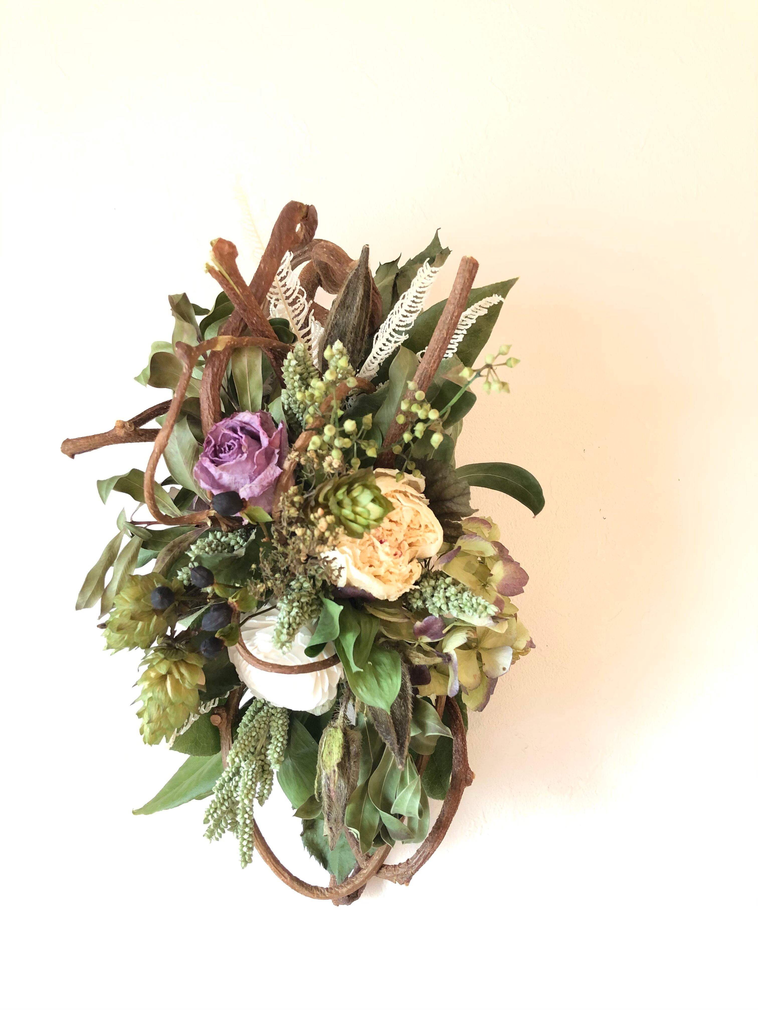 くるくるとしたツルがかわいい、キウイヅルをベースにして、白グリーンの花材にシックな淡いパープルのバラを合わせた、落ち着いた色合いのアレンジメント。