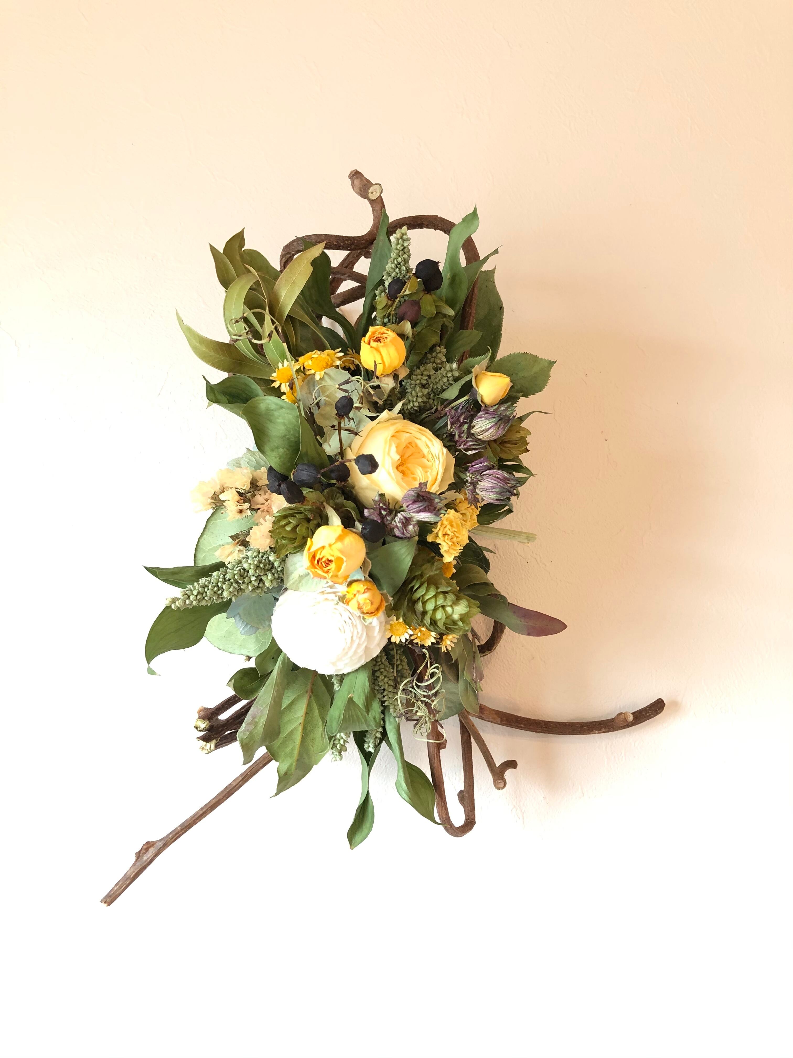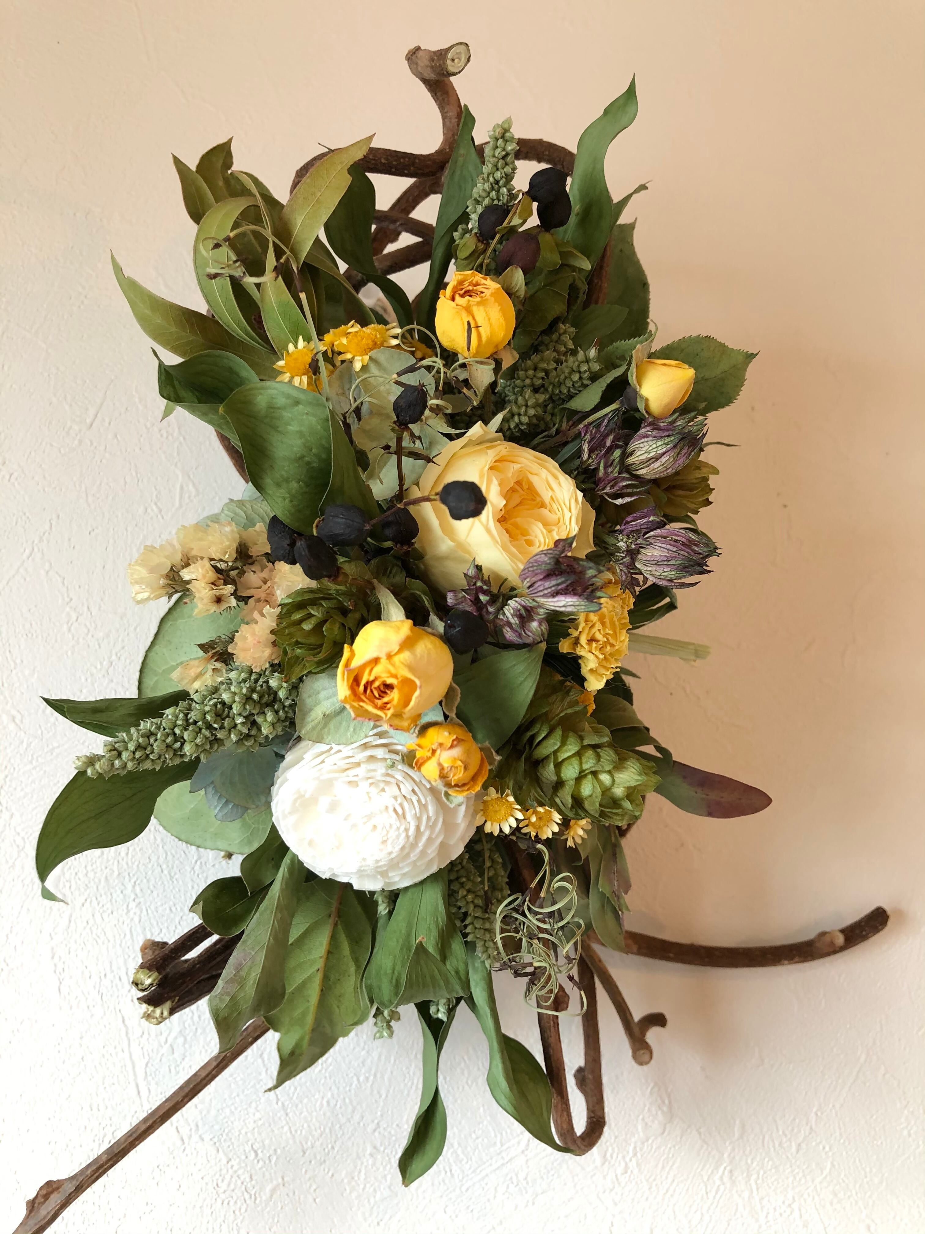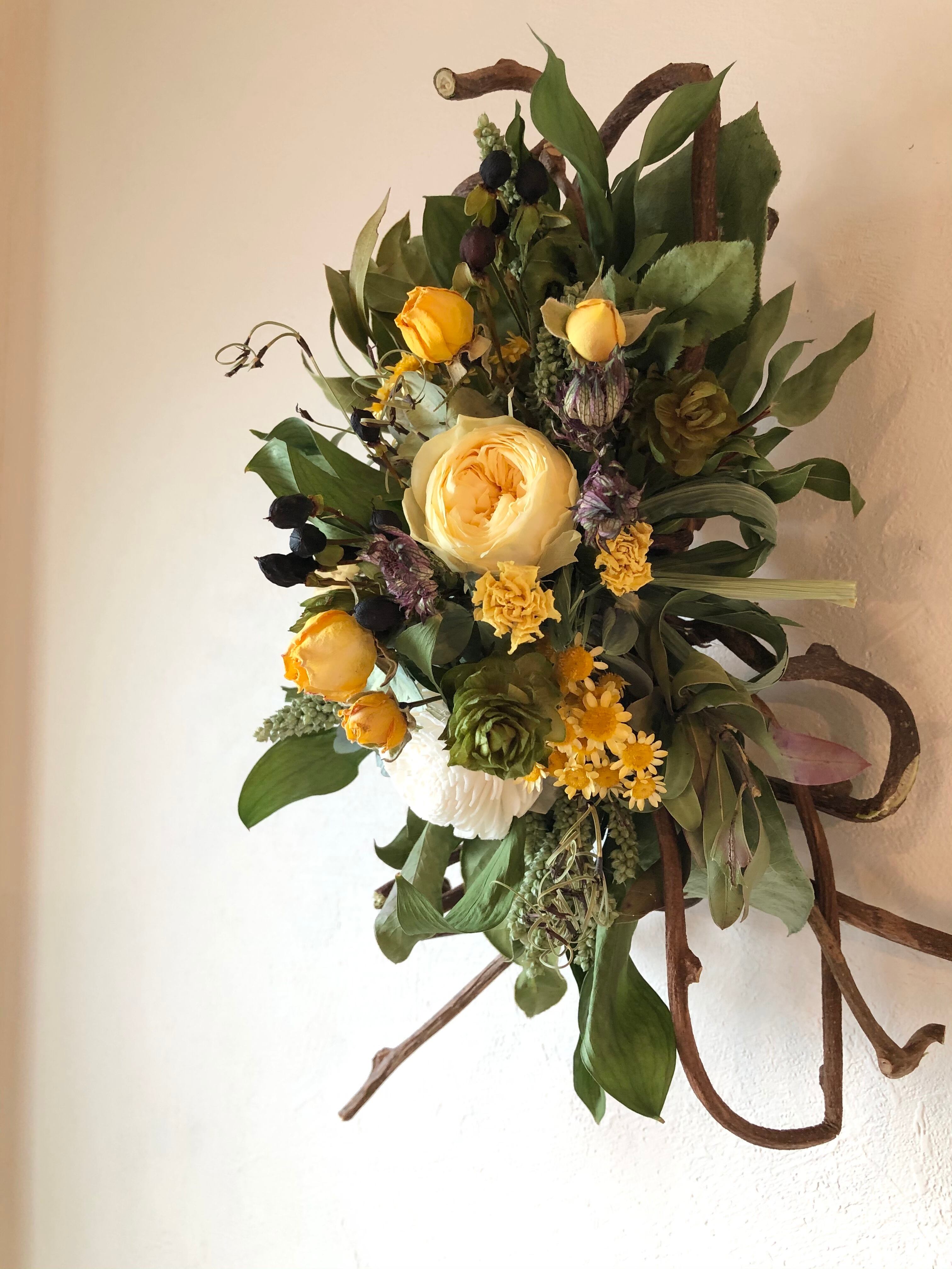 くるくるとしたツルがかわいい、キウイヅルをベースにして春らしい黄色の花材をたっぷりとアレンジしました。ポイントに入れたアストランティアのパープルが全体を引き締めて。