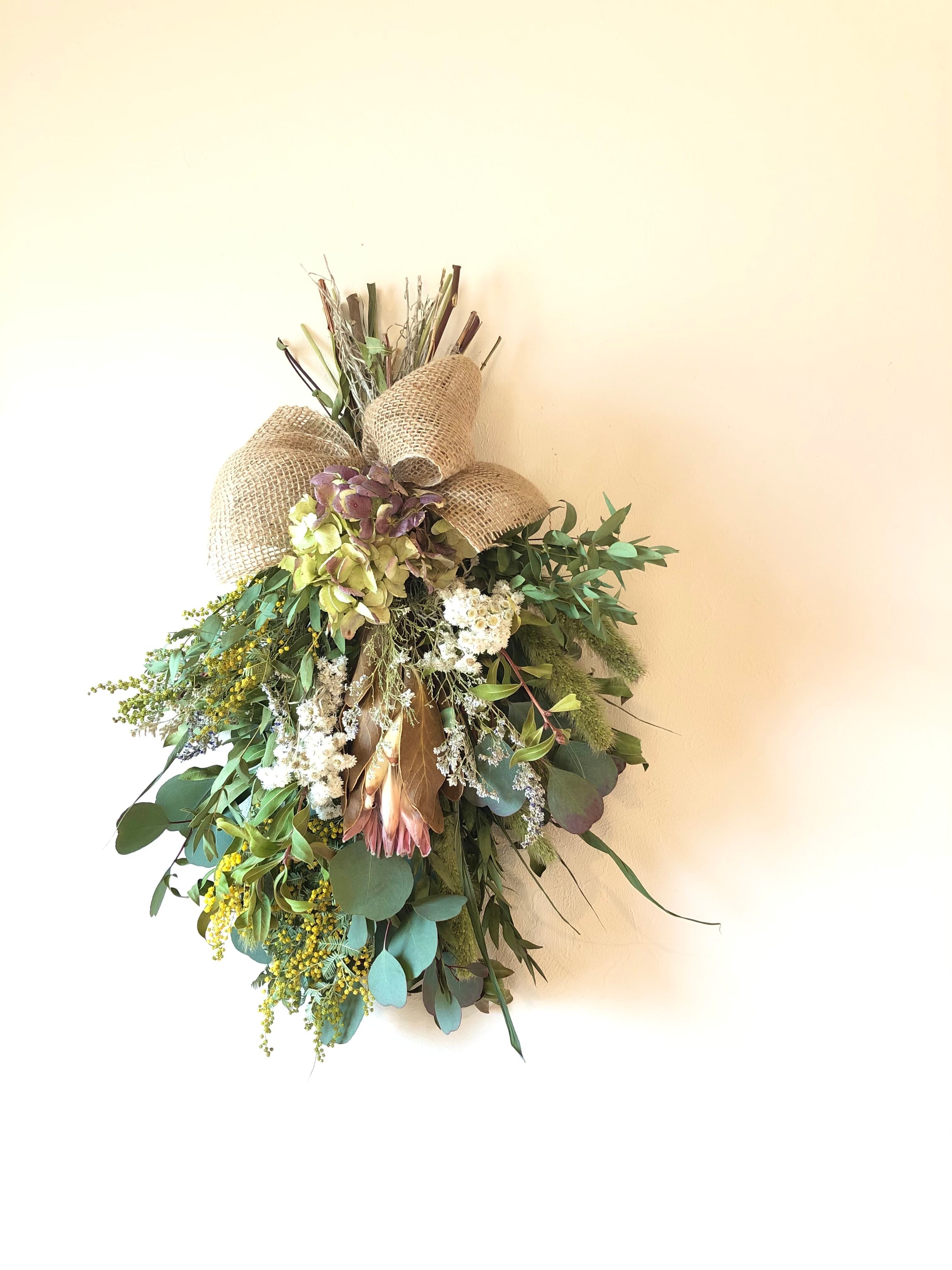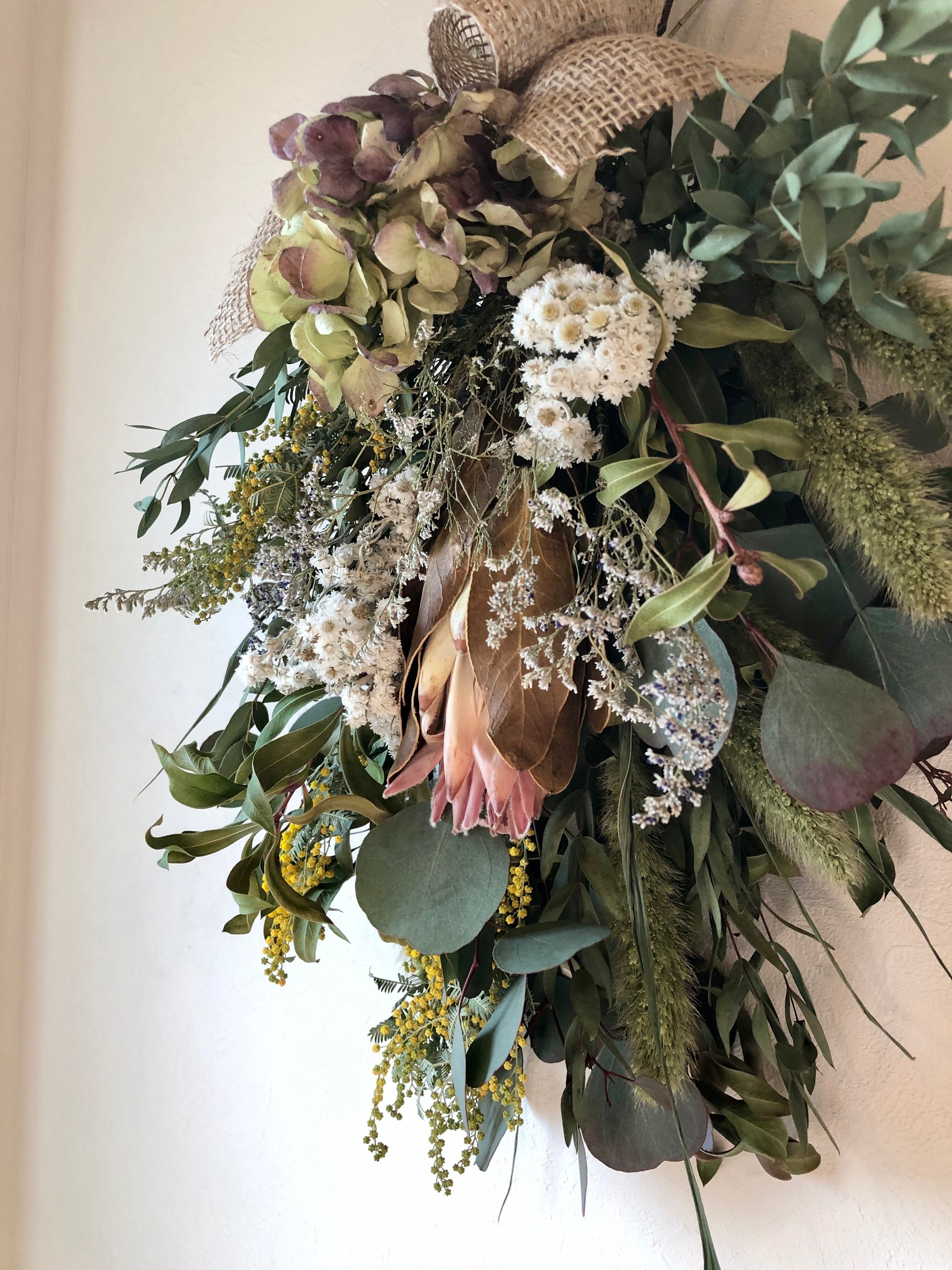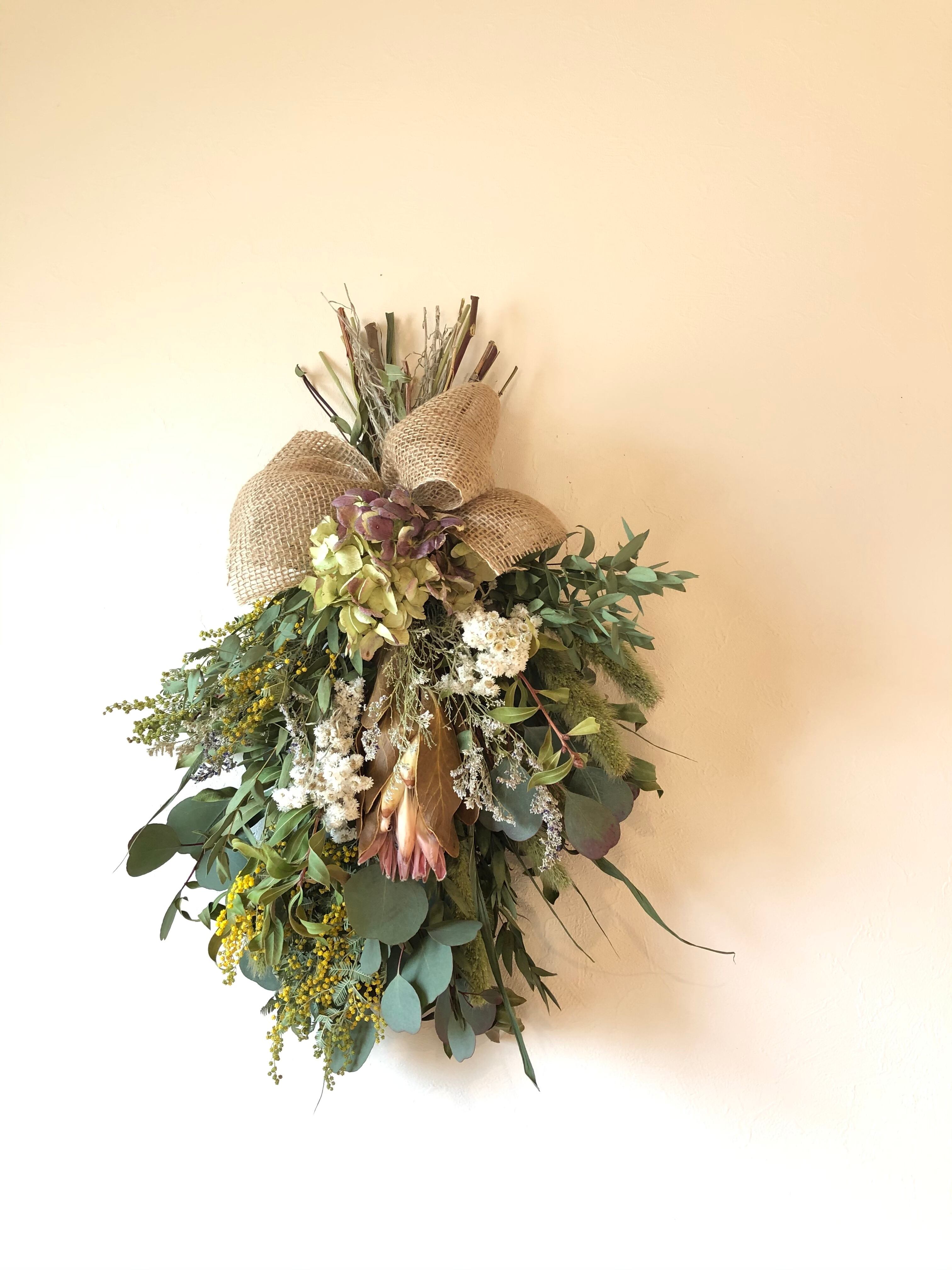 フレッシュのユーカリポポラスをベースにたっぷりと使ったボリュームのあるスワッグ。