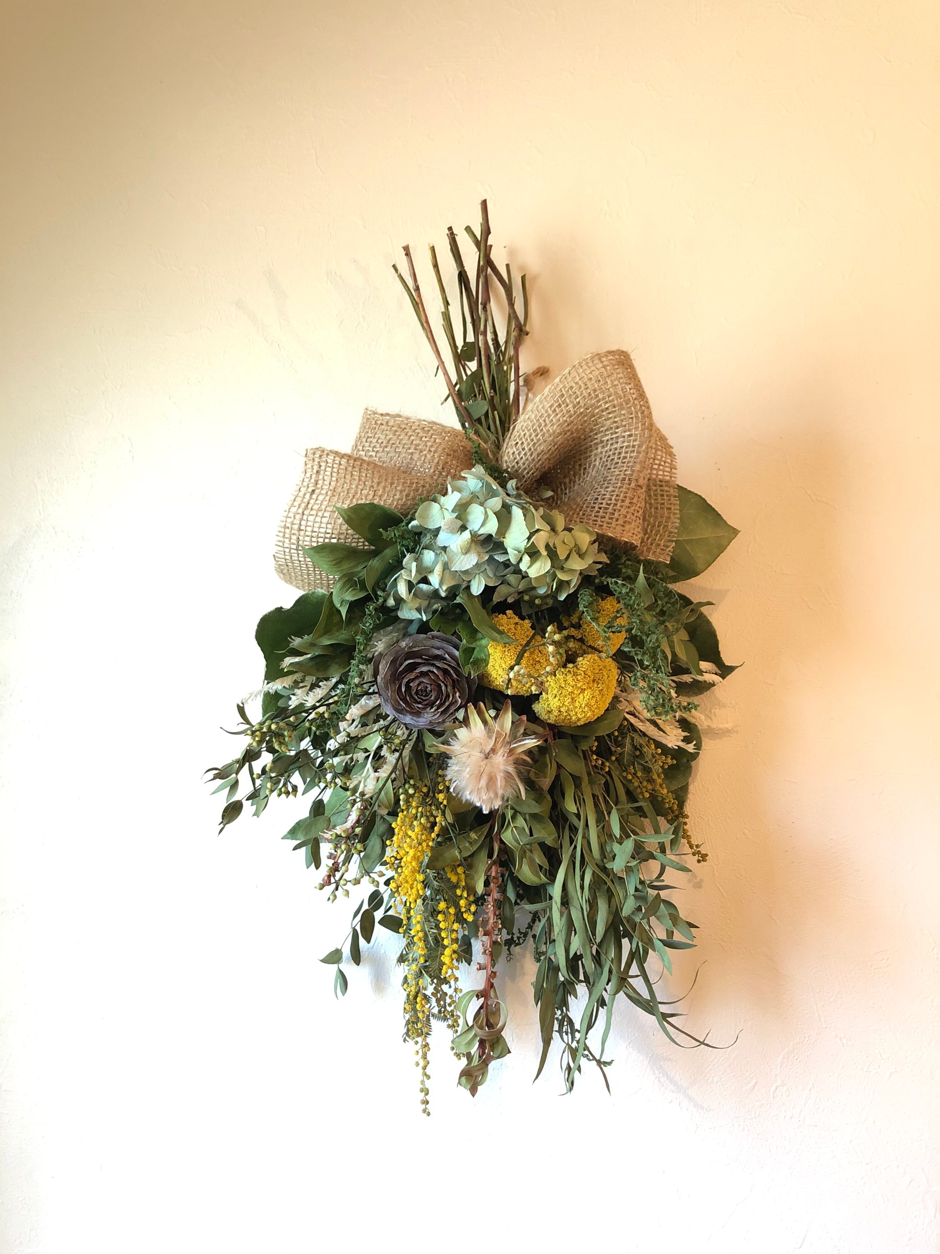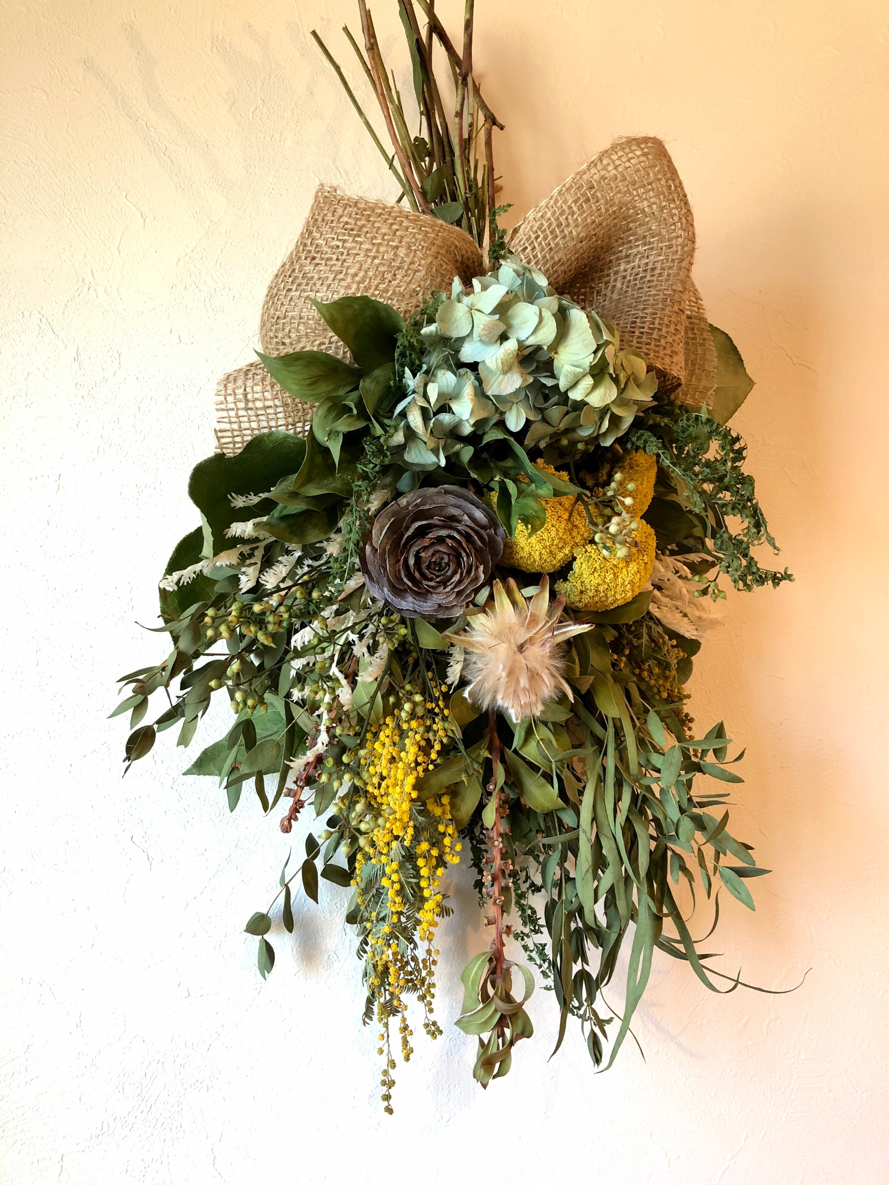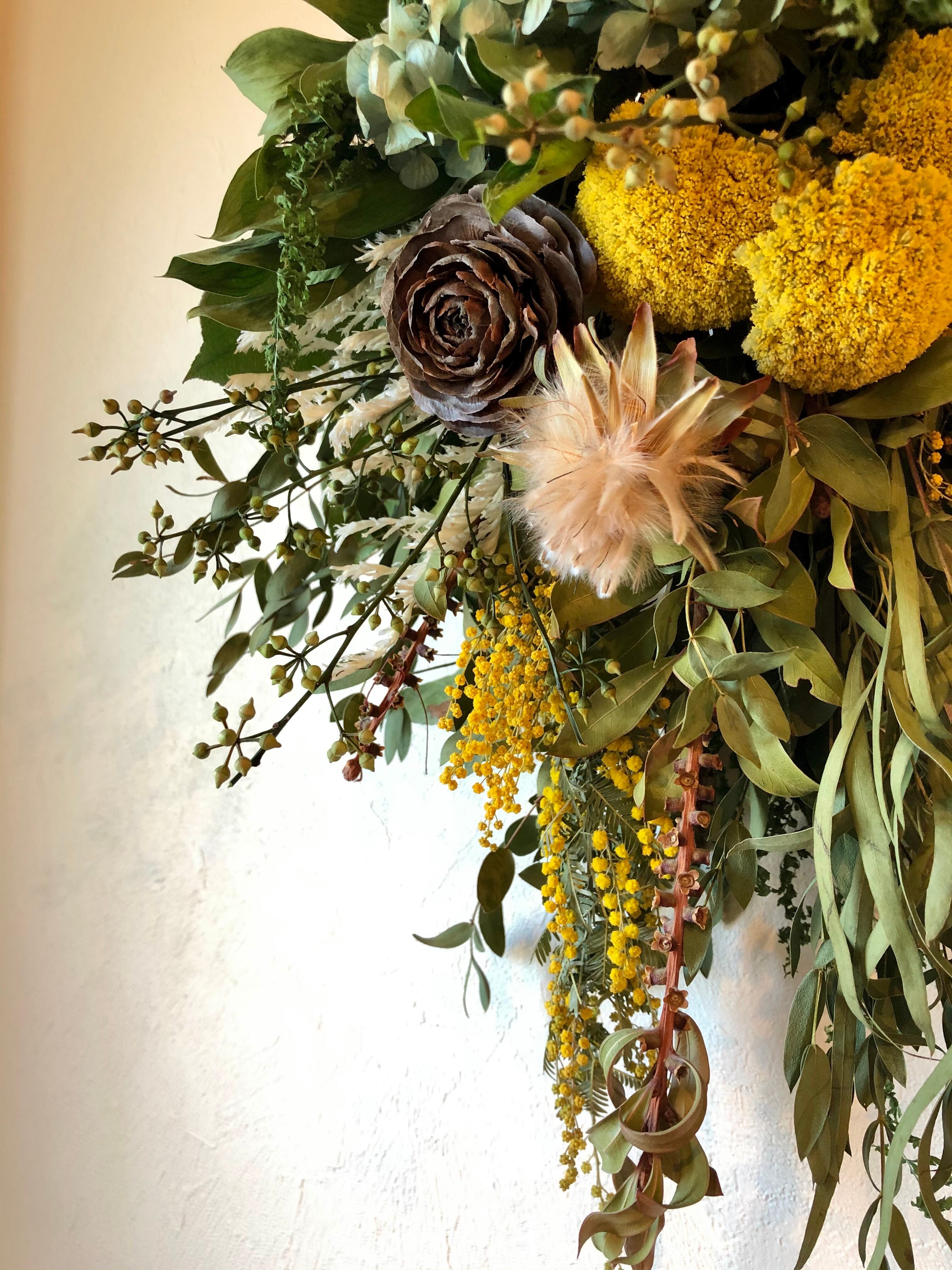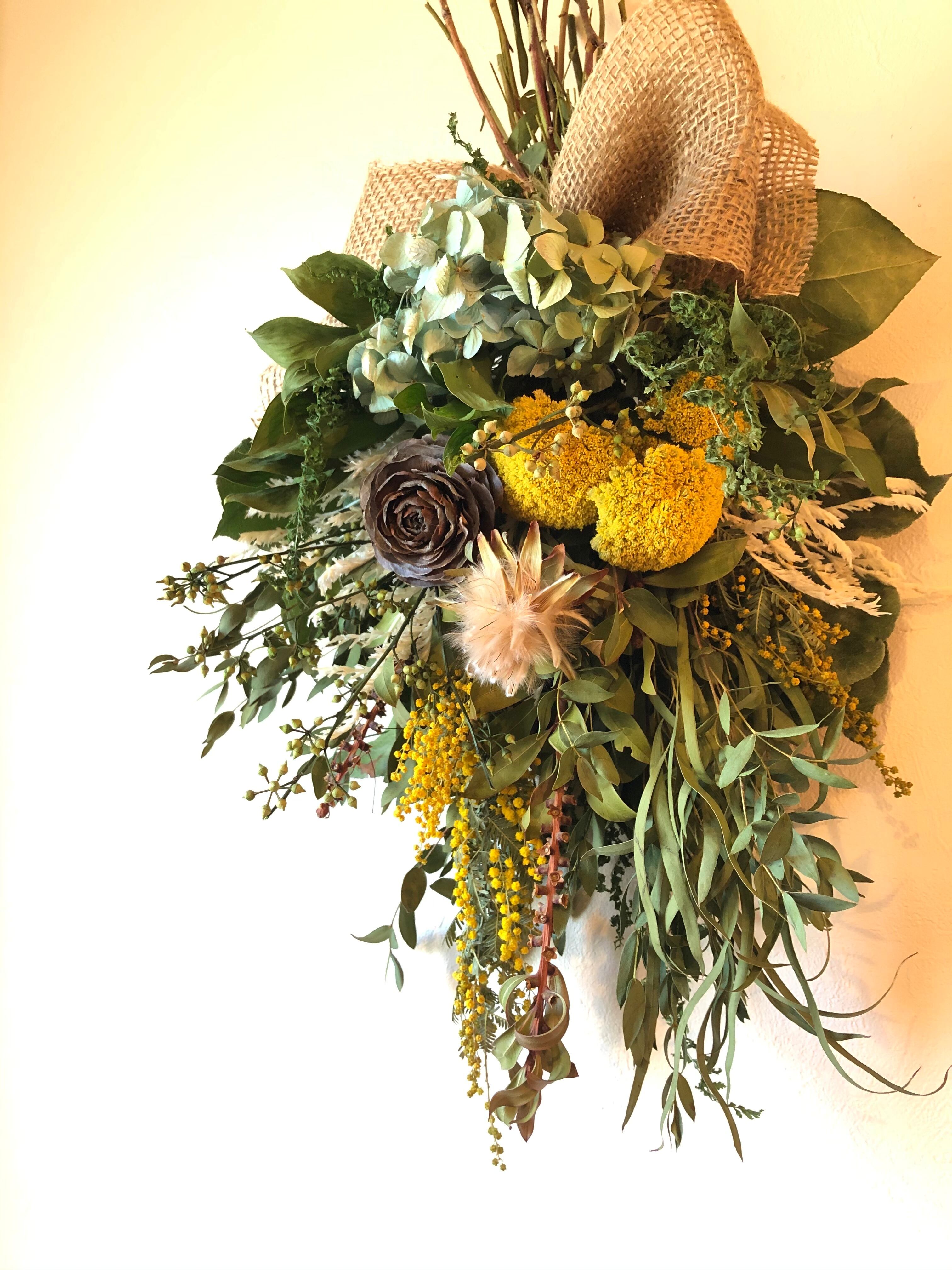 ユーカリとキンポウジュをたっぷり使ったベースに、黄色のアキレア、ミモザなどをアレンジしたスワッグ。