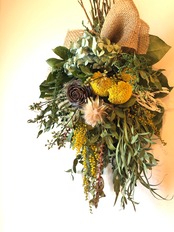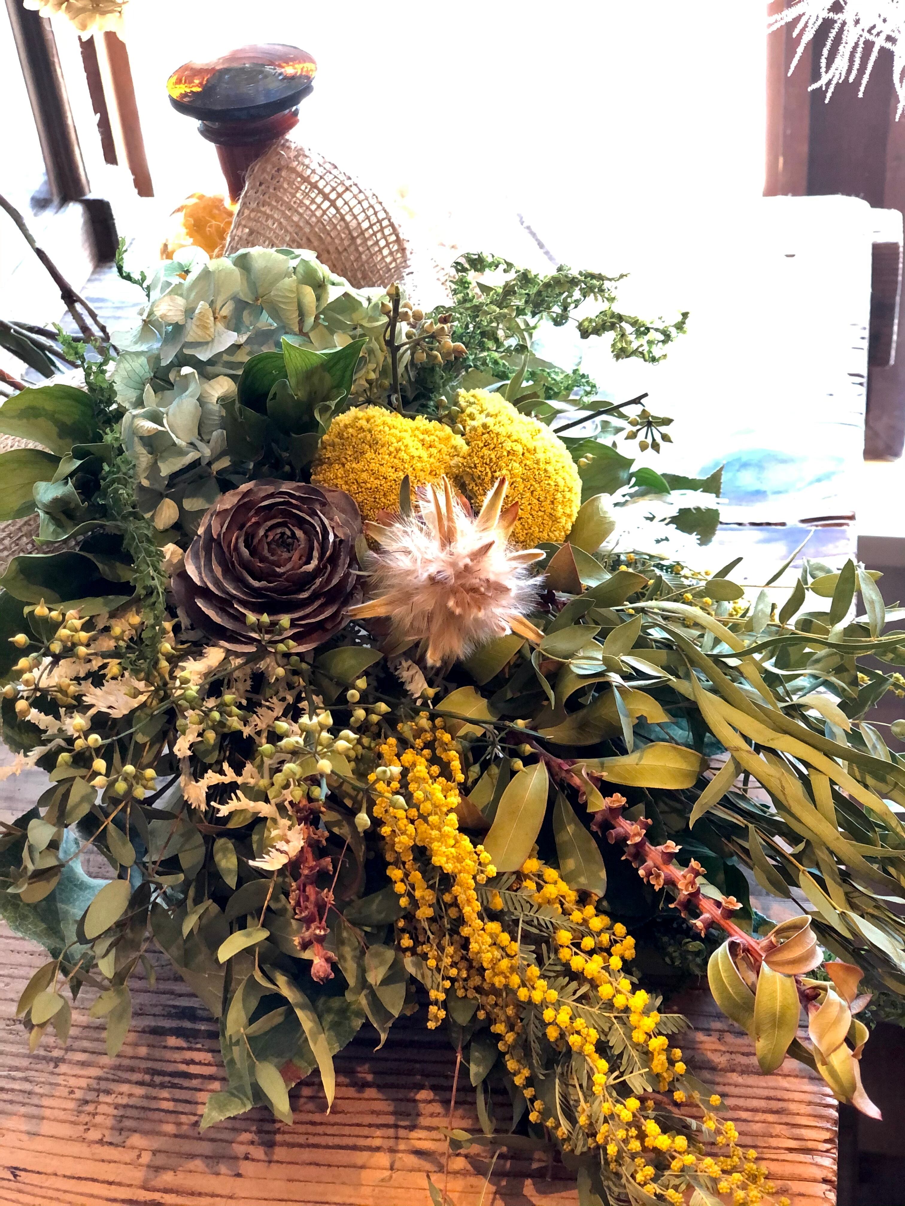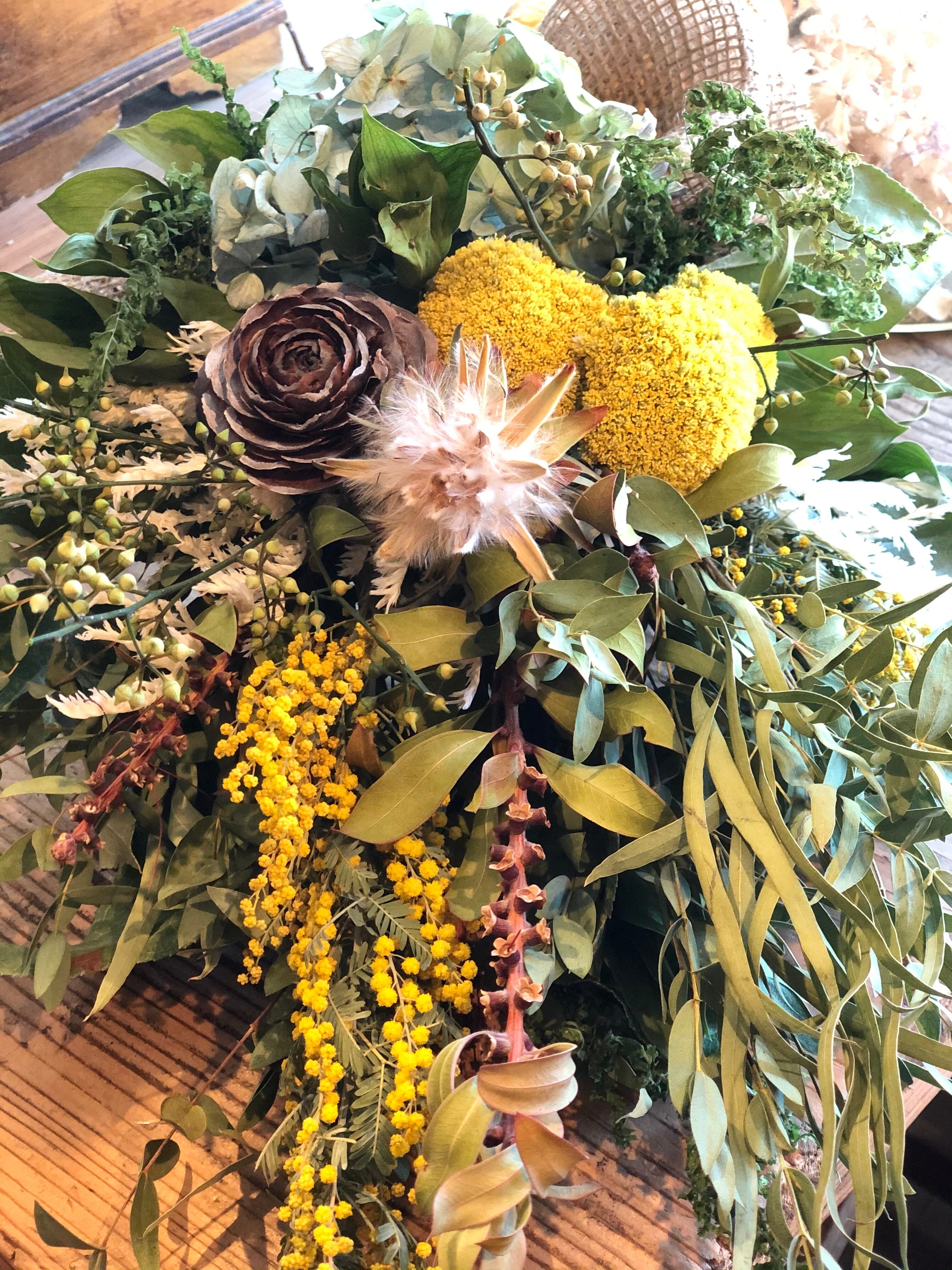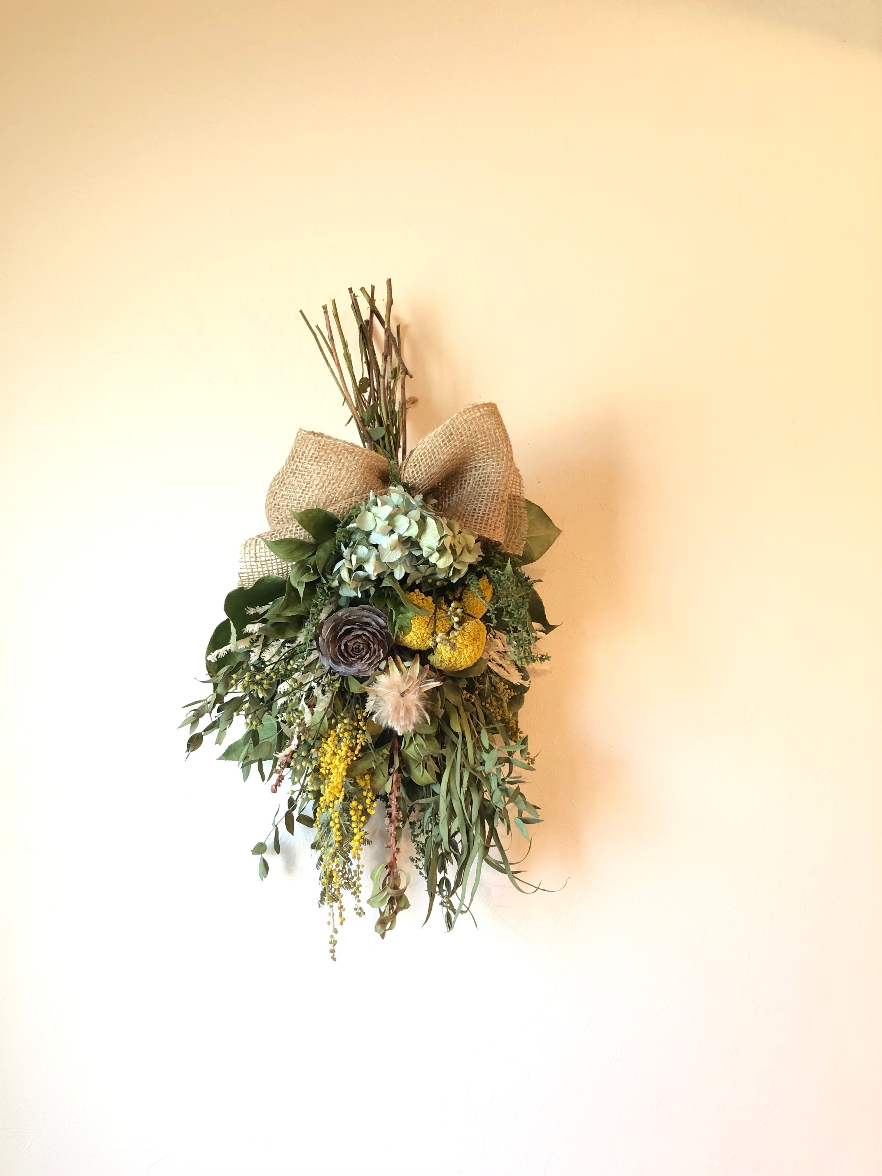 ユーカリとキンポウジュをたっぷり使ったベースに、黄色のアキレア、ミモザなどをアレンジしたスワッグ。