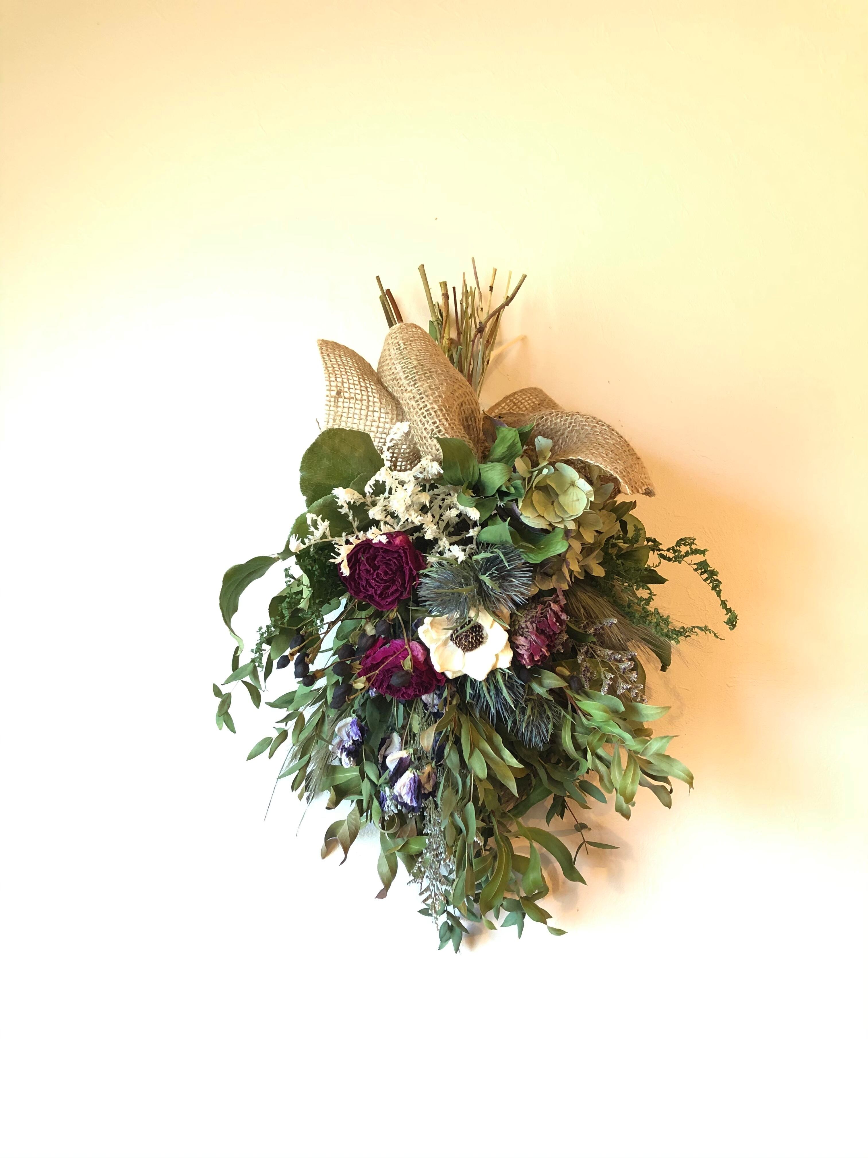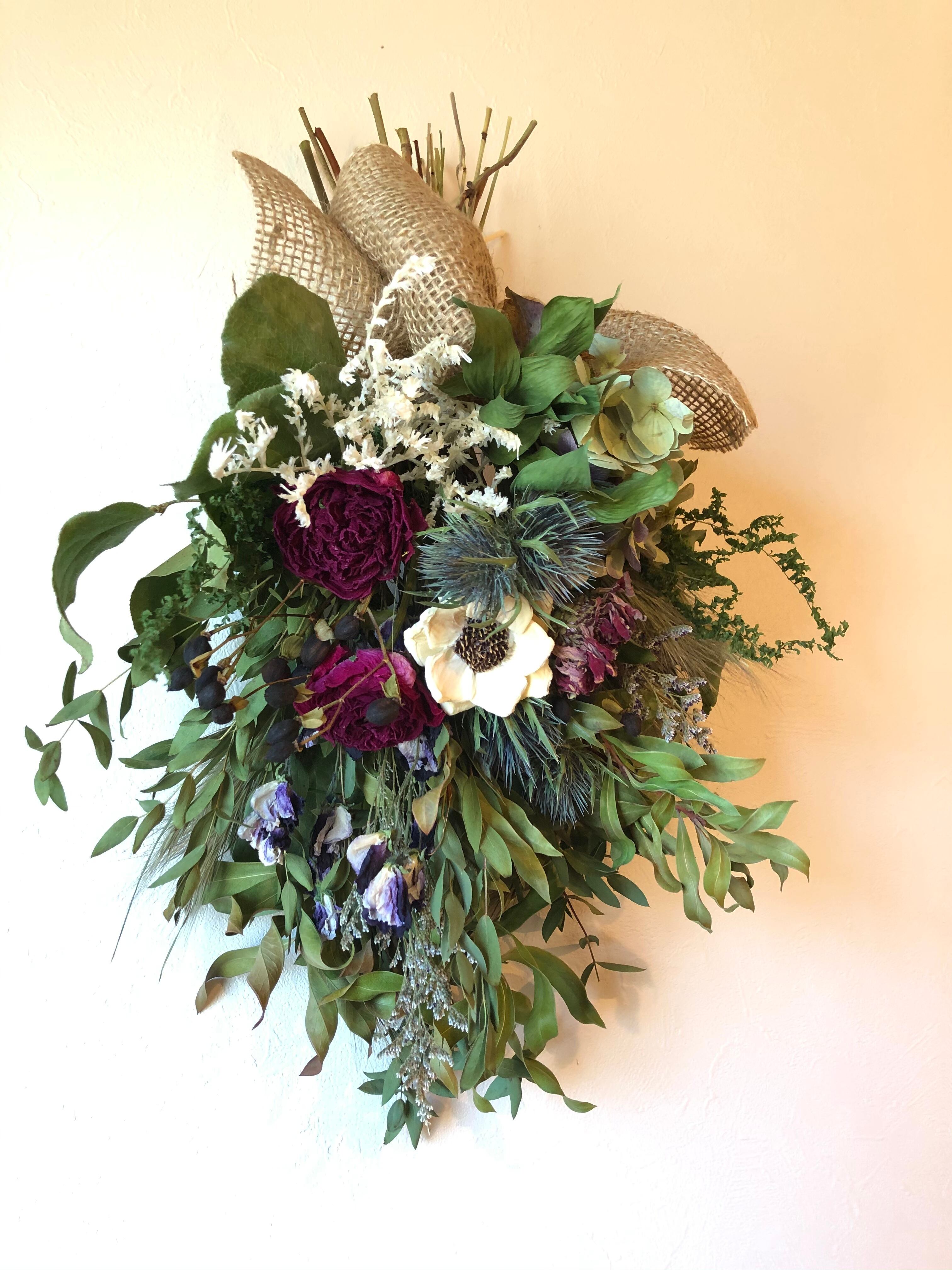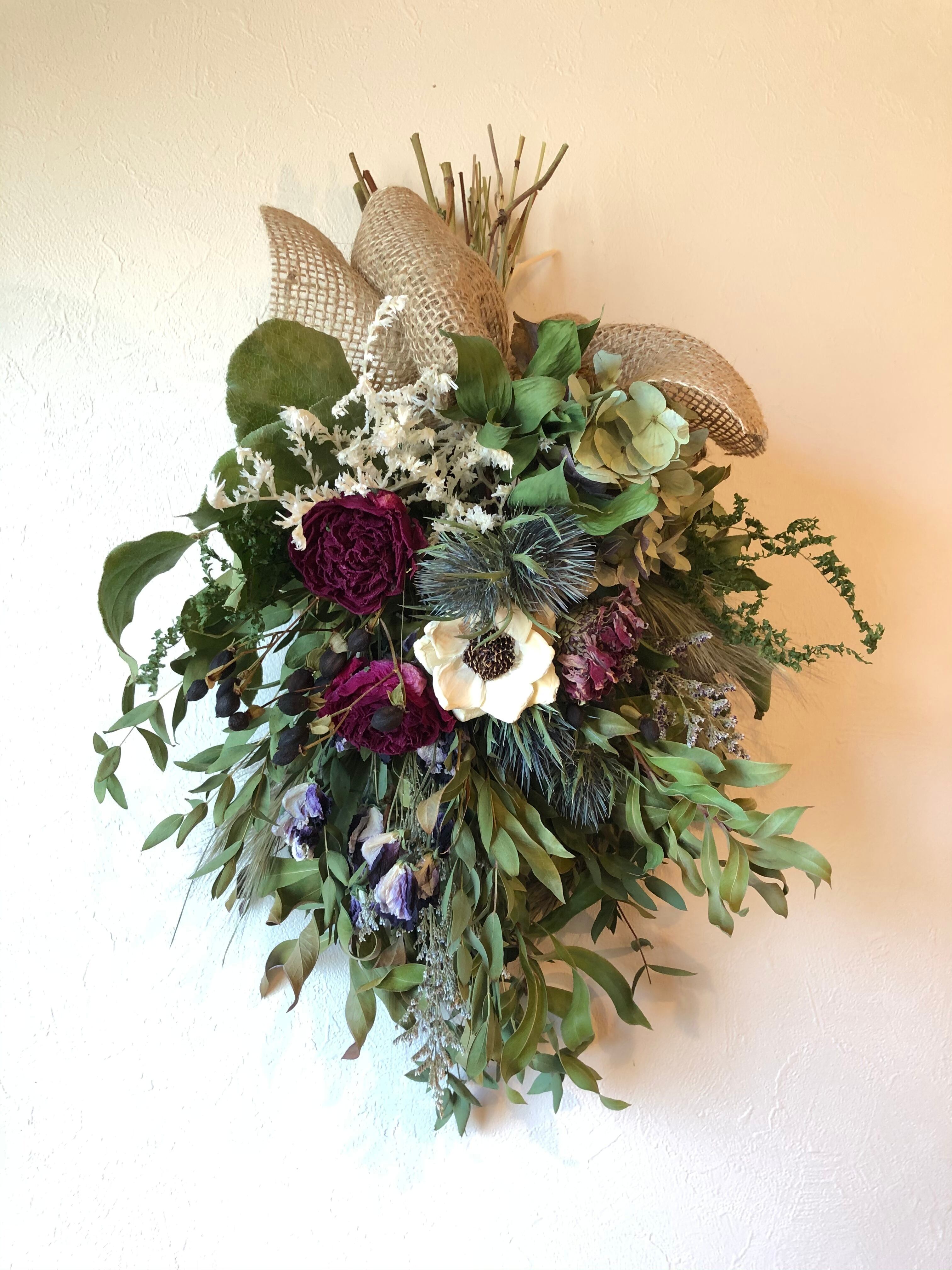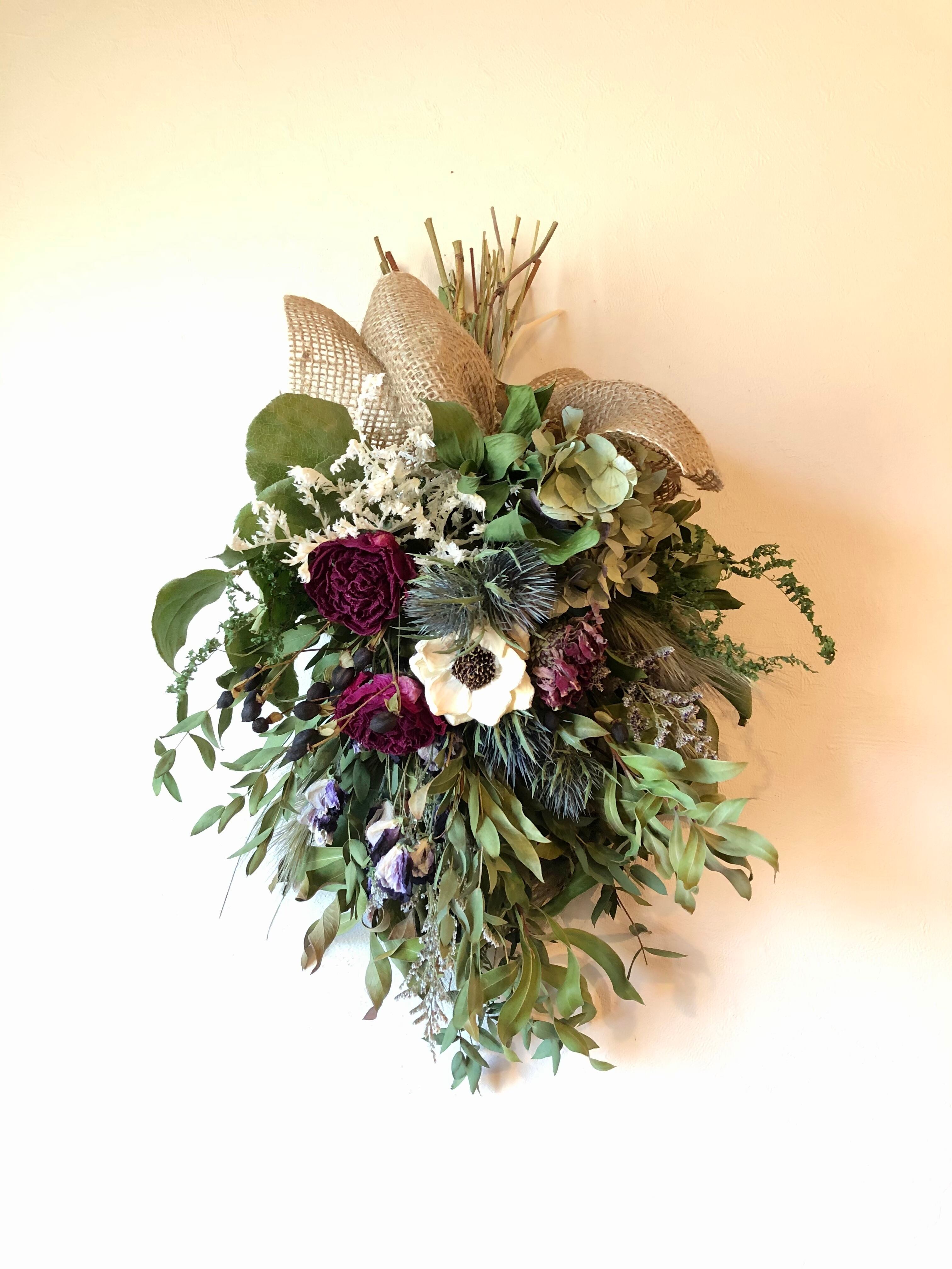 ユーカリとキンポウジュをたっぷり使ったベースに、ボルドー系のシャクヤクやブルー系のアジサイ、そしてなんとも可愛いのがパープルのスイトピー!!シックで落ち着いた中にも花柳のある色合い。