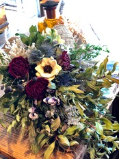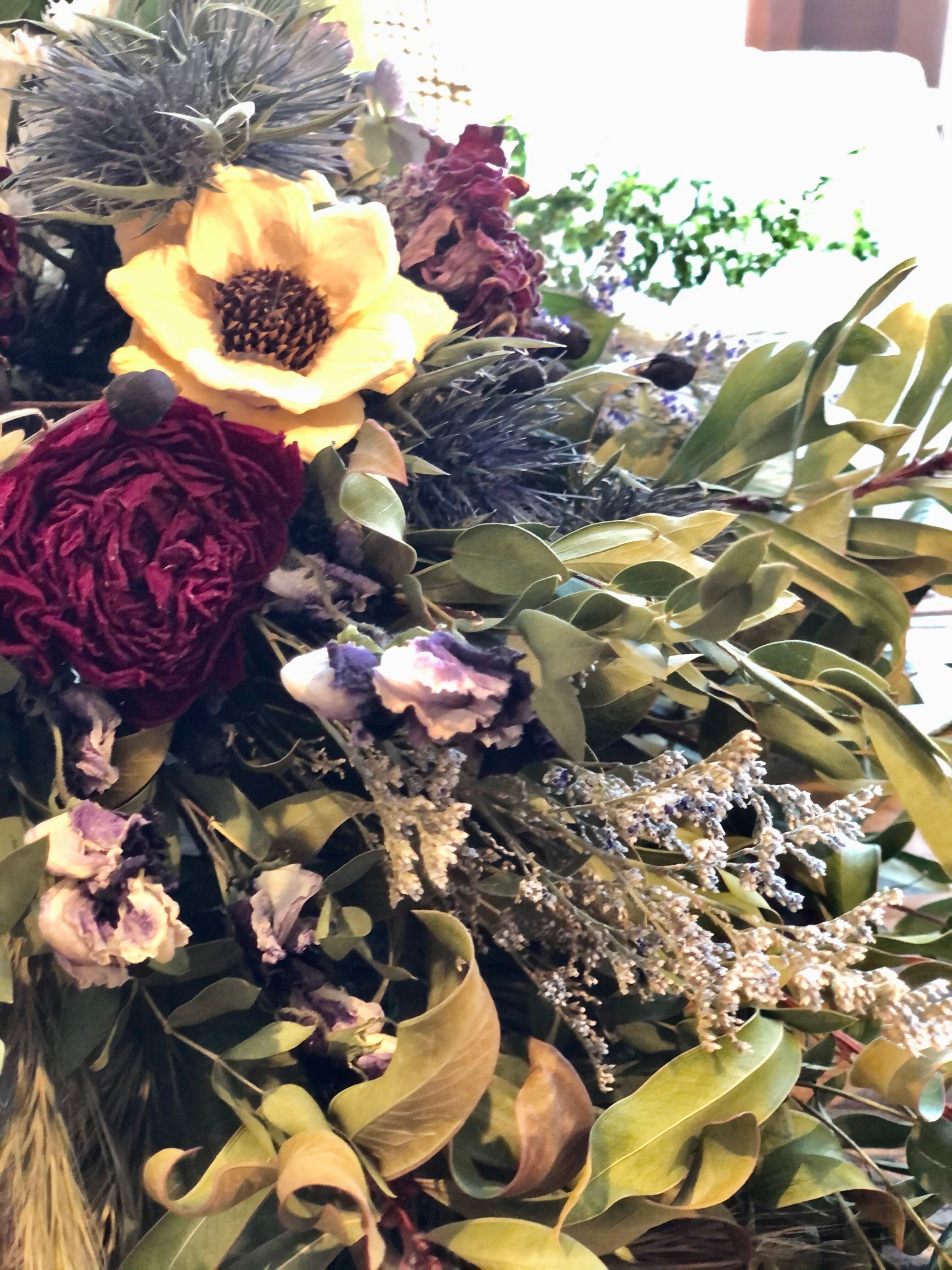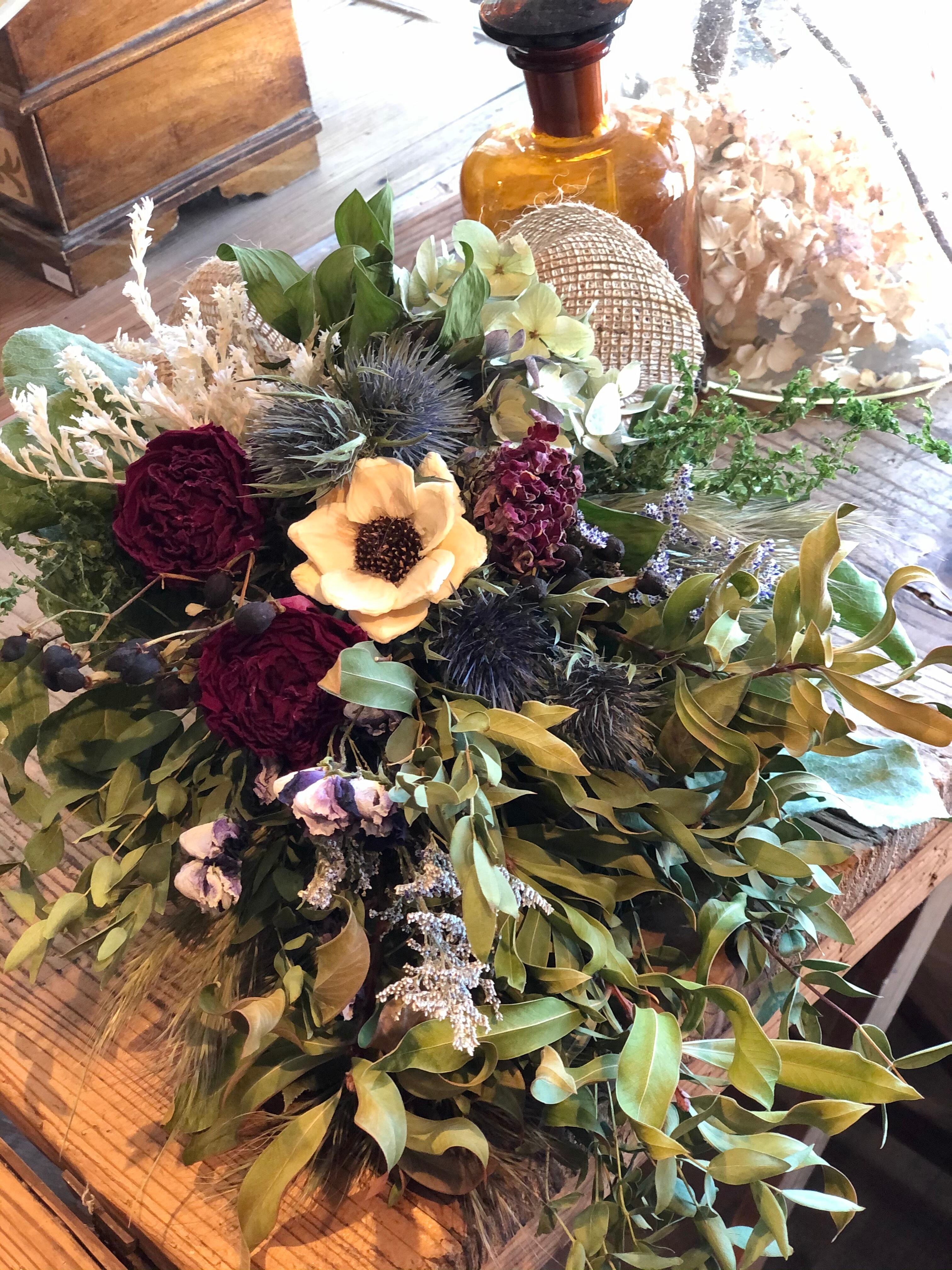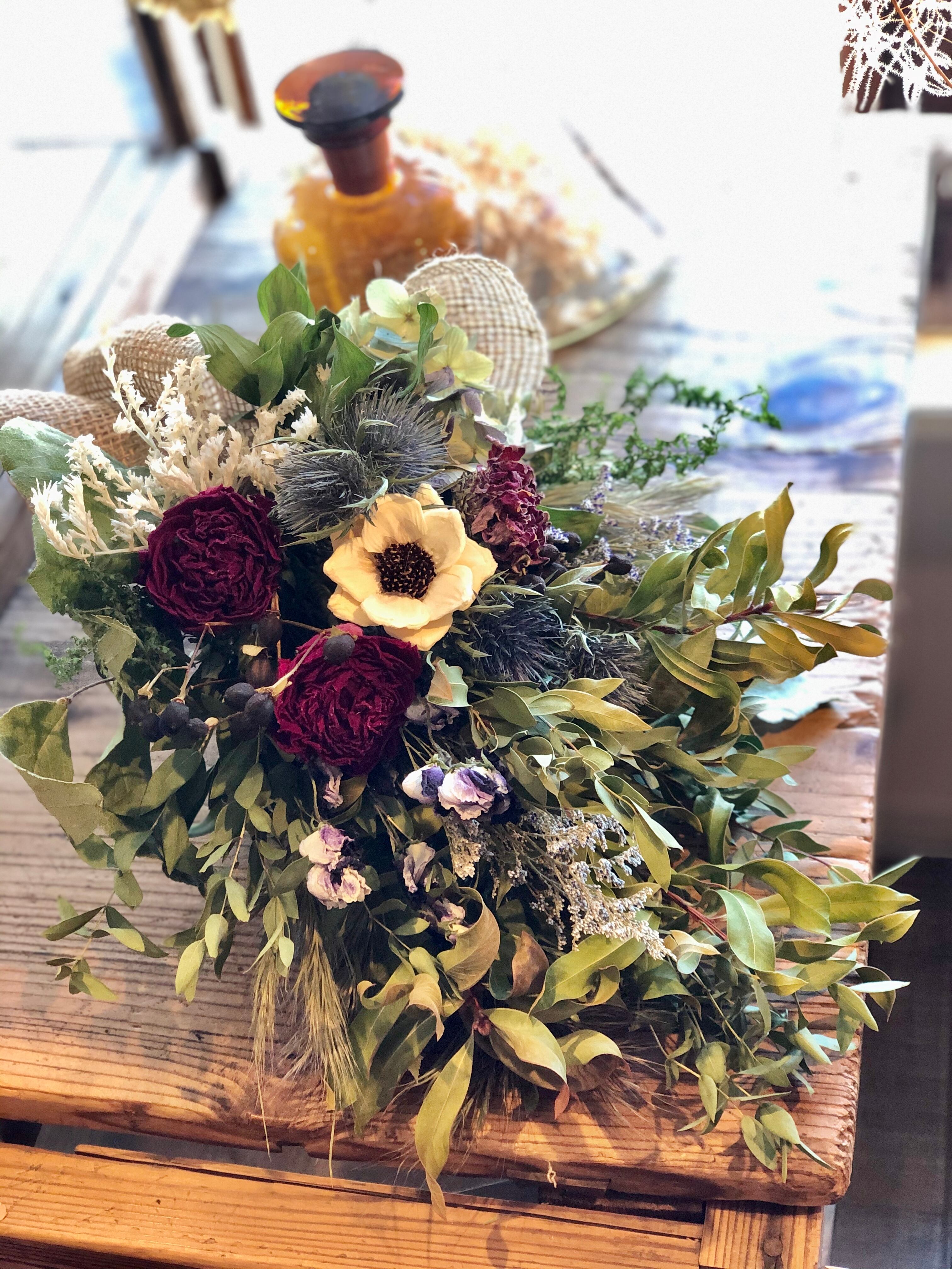 ユーカリとキンポウジュをたっぷり使ったベースに、ボルドー系のシャクヤクやブルー系のアジサイ、そしてなんとも可愛いのがパープルのスイトピー!!シックで落ち着いた中にも花柳のある色合い。