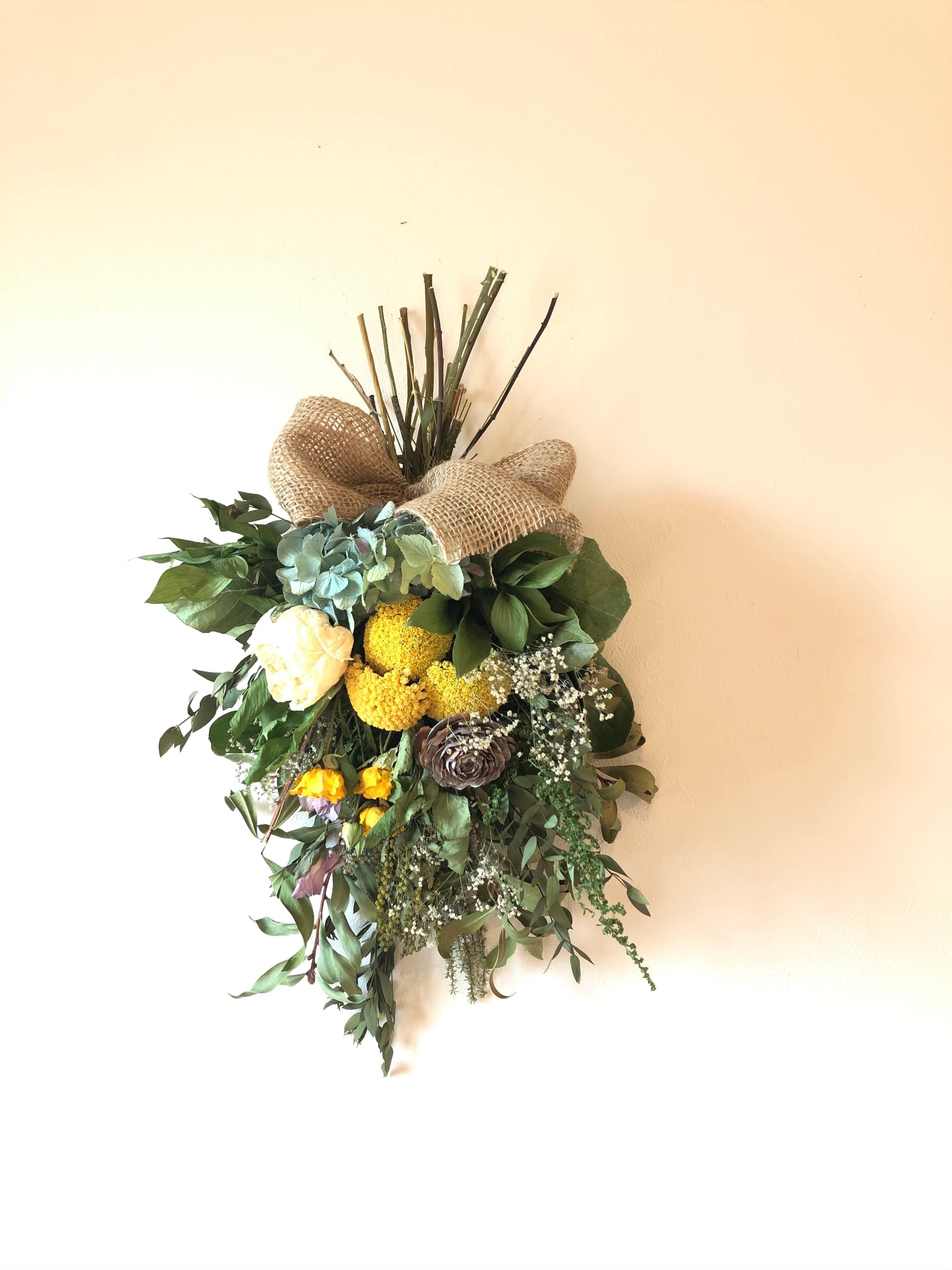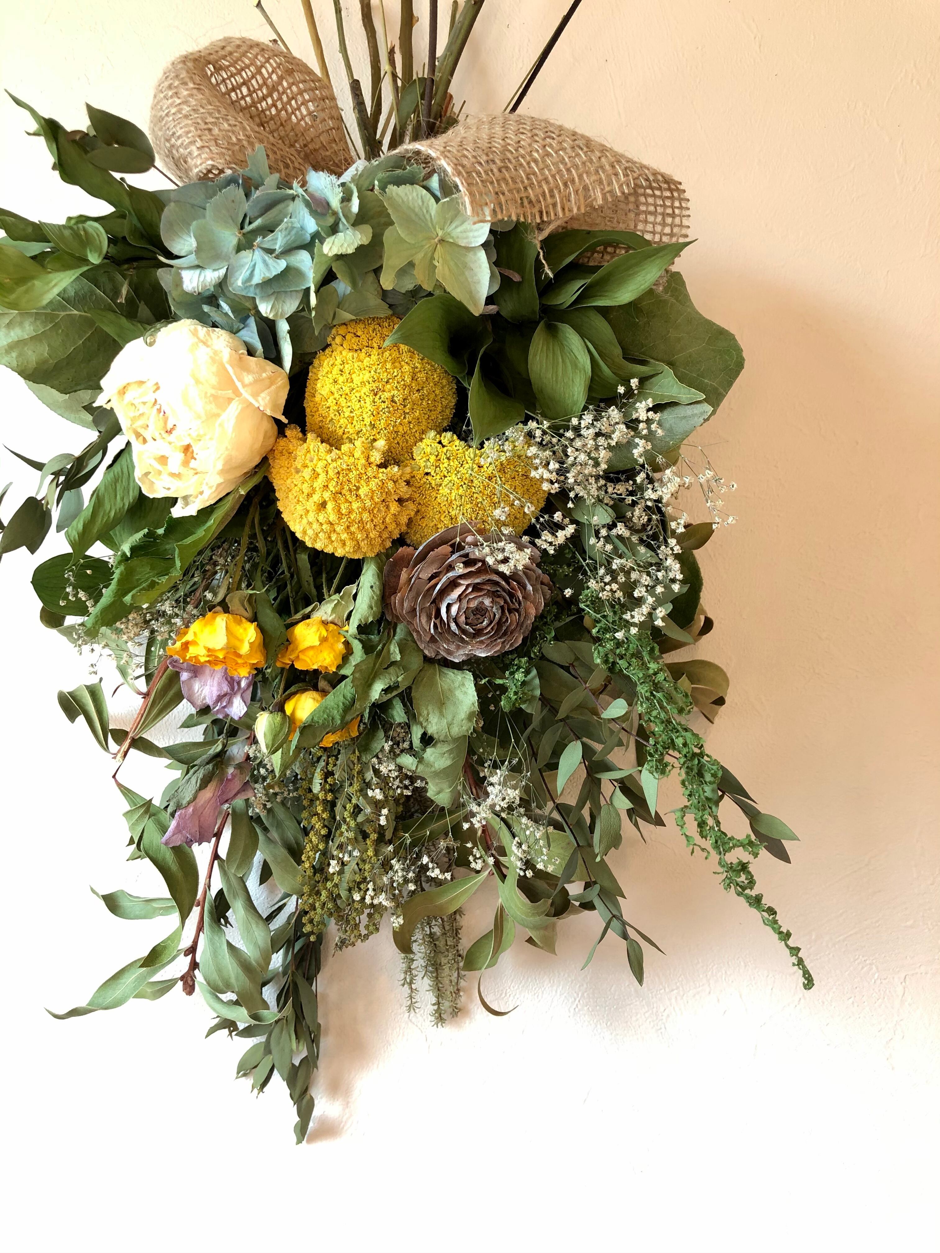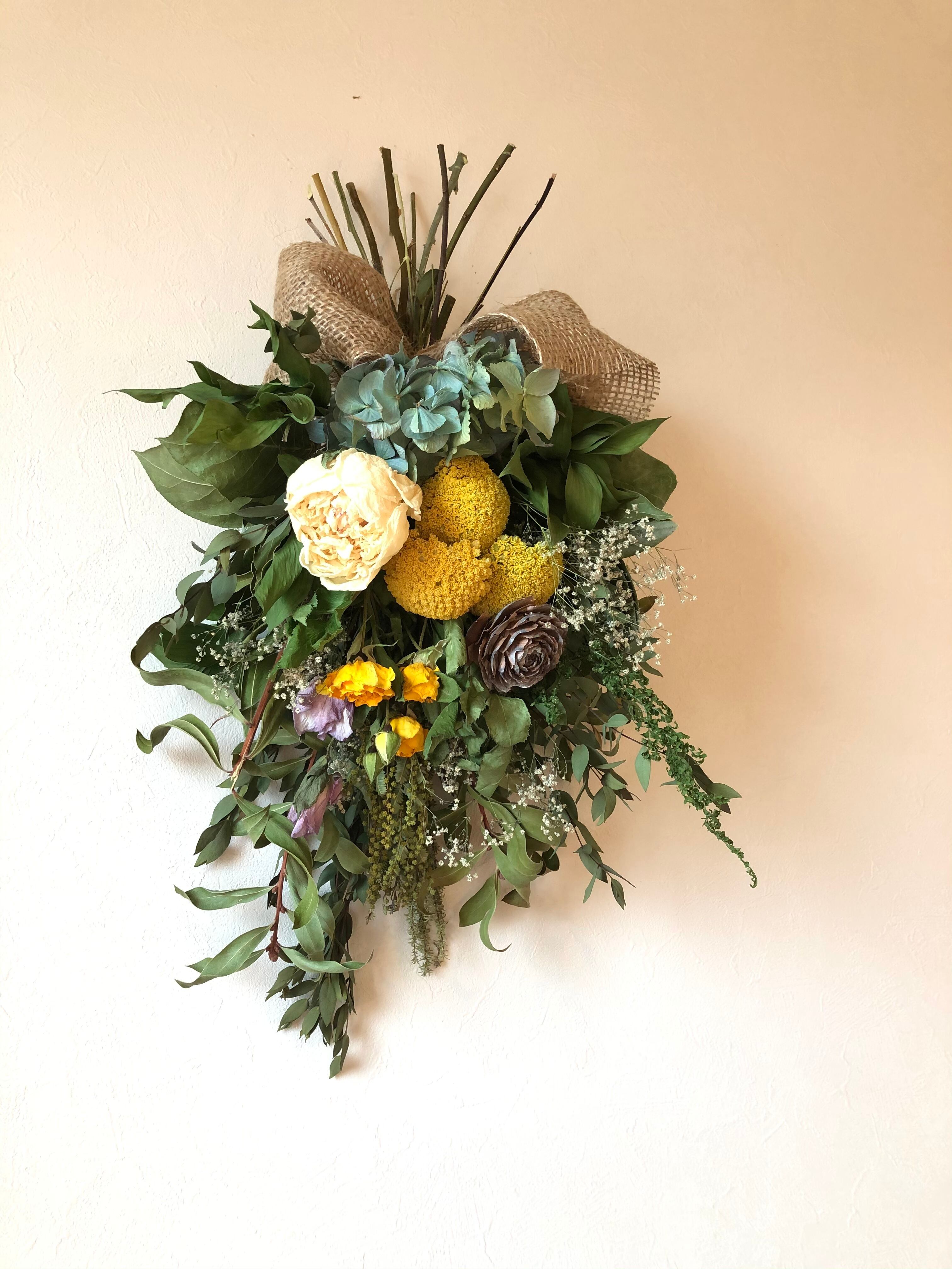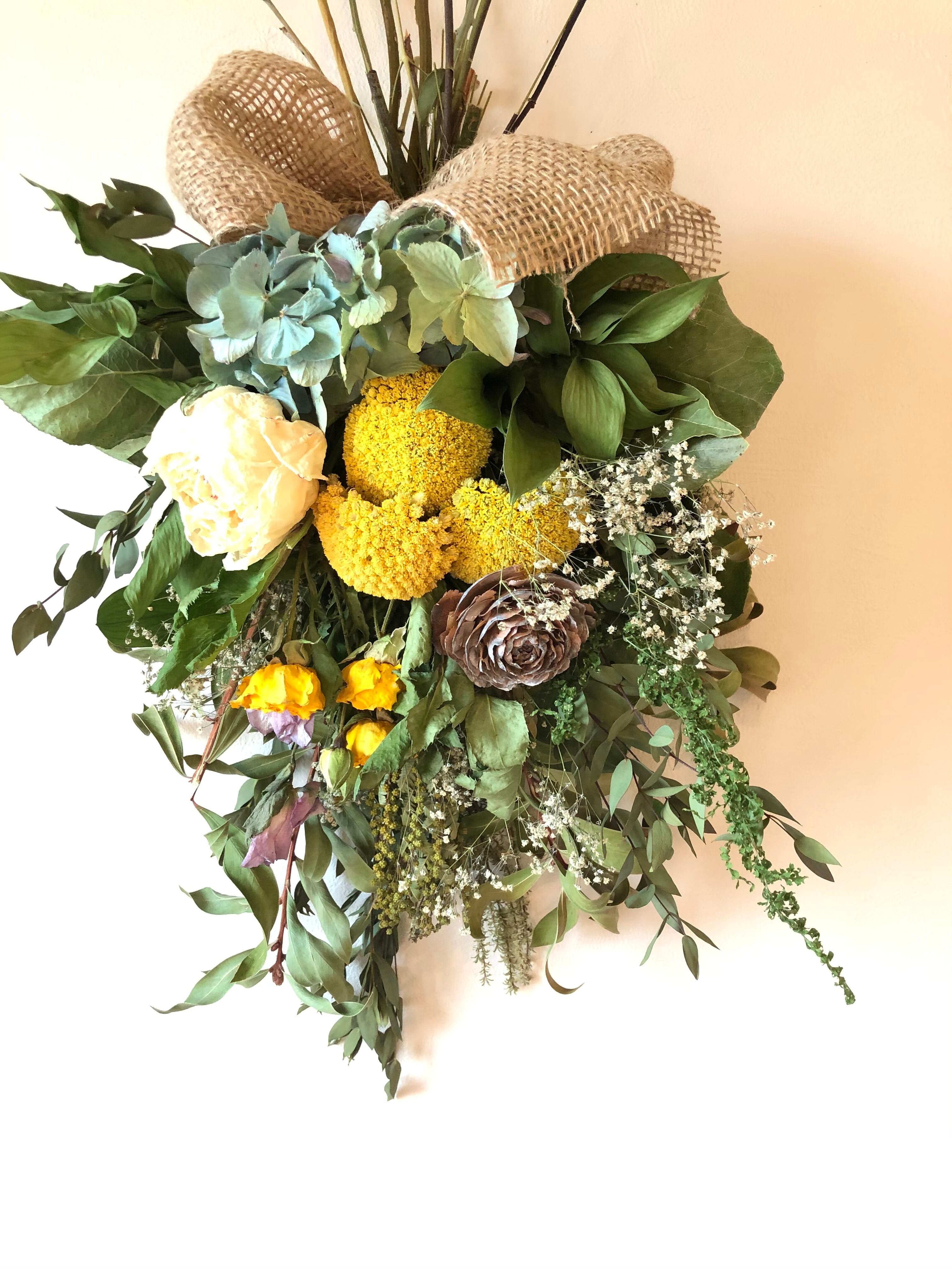 ユーカリとキンポウジュをたっぷり使ったベースに、黄色のアキレアをたっぷりと入れた春色スワッグ。