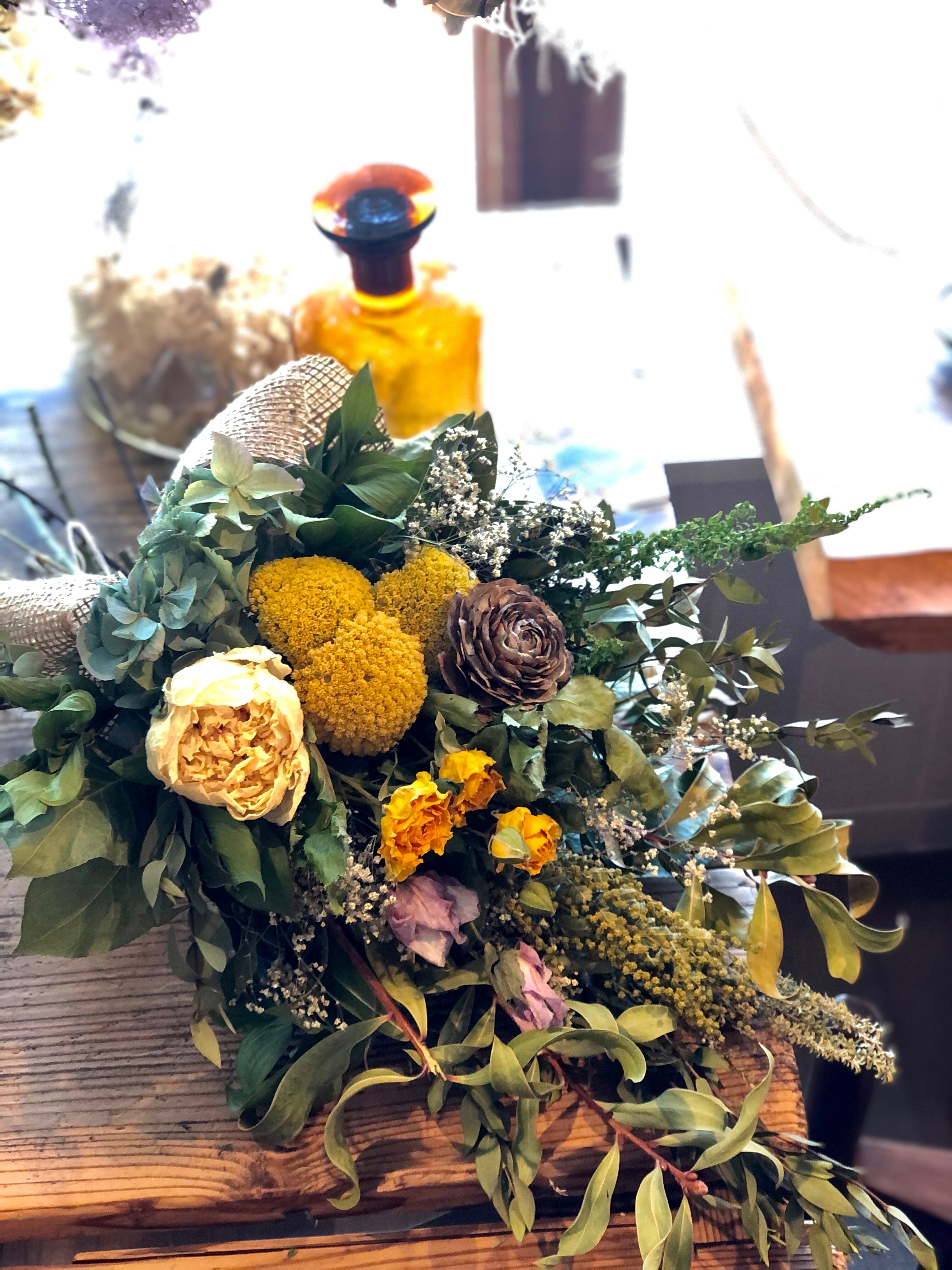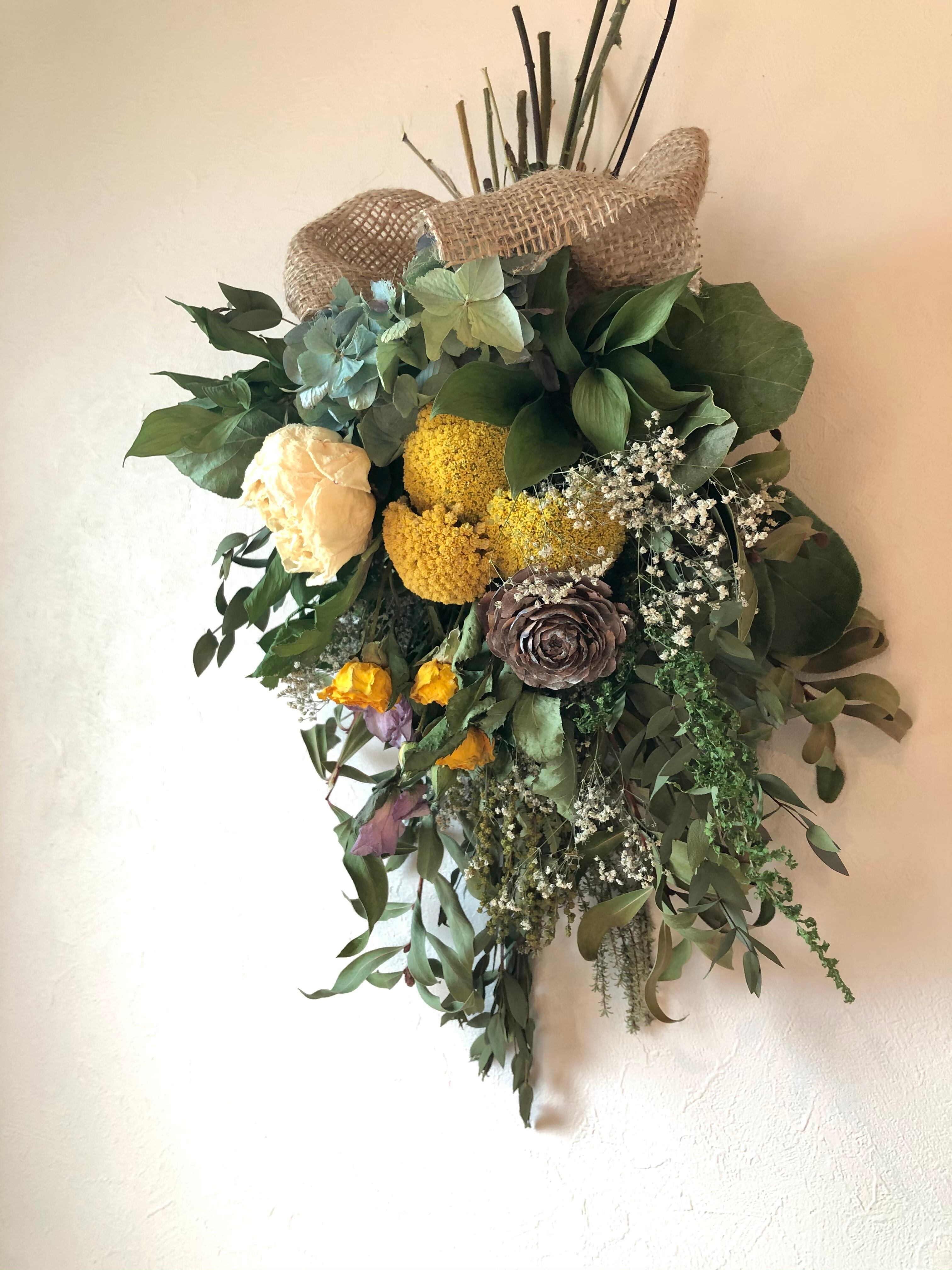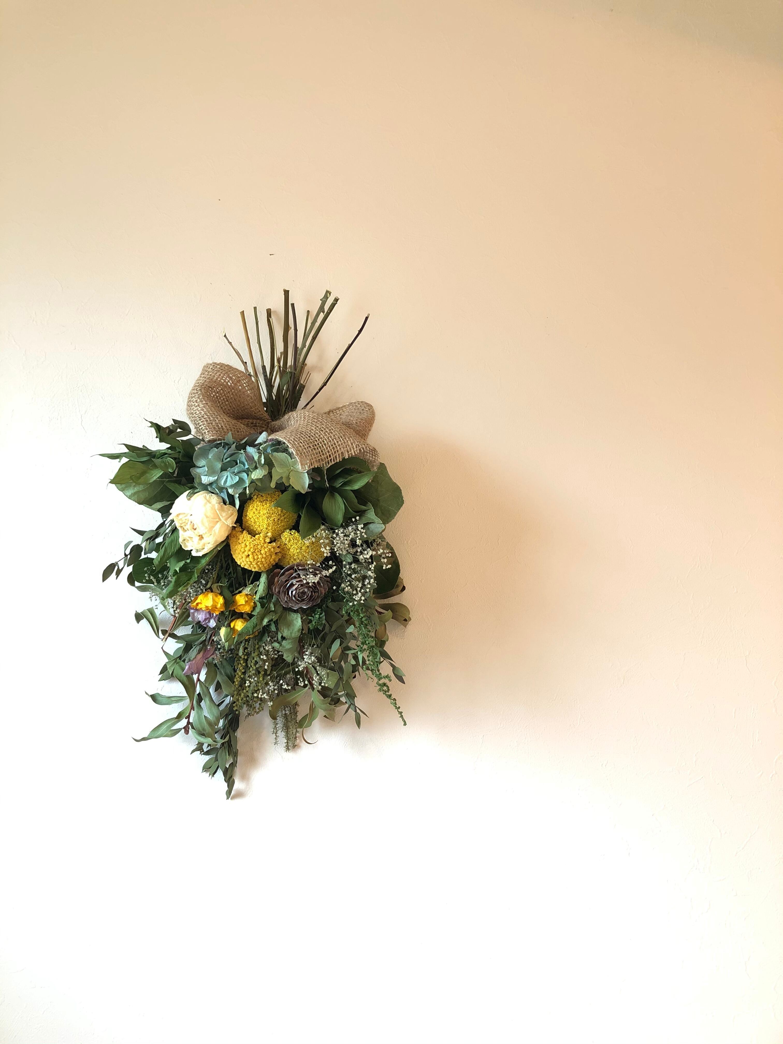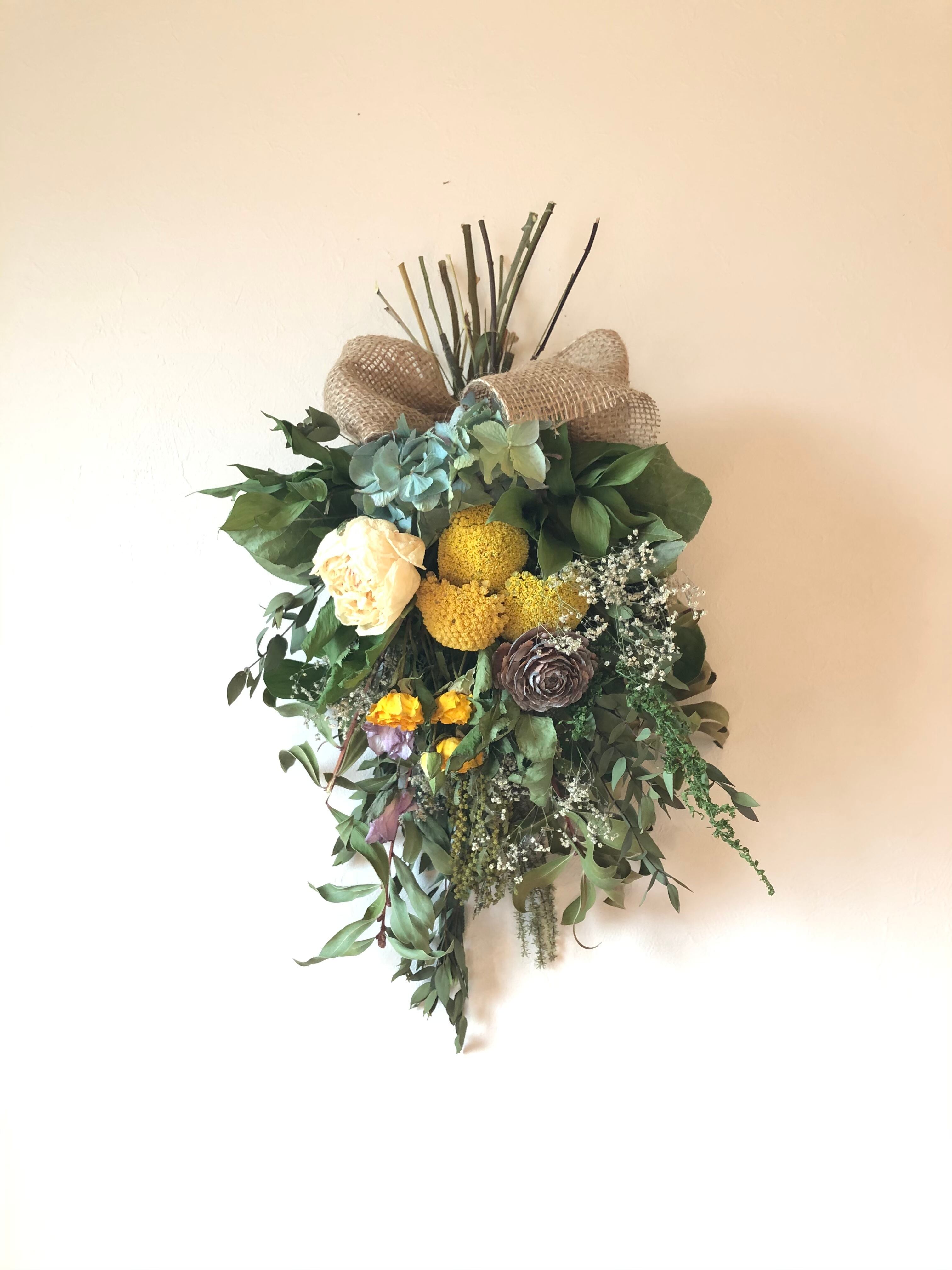 ユーカリとキンポウジュをたっぷり使ったベースに、黄色のアキレアをたっぷりと入れた春色スワッグ。