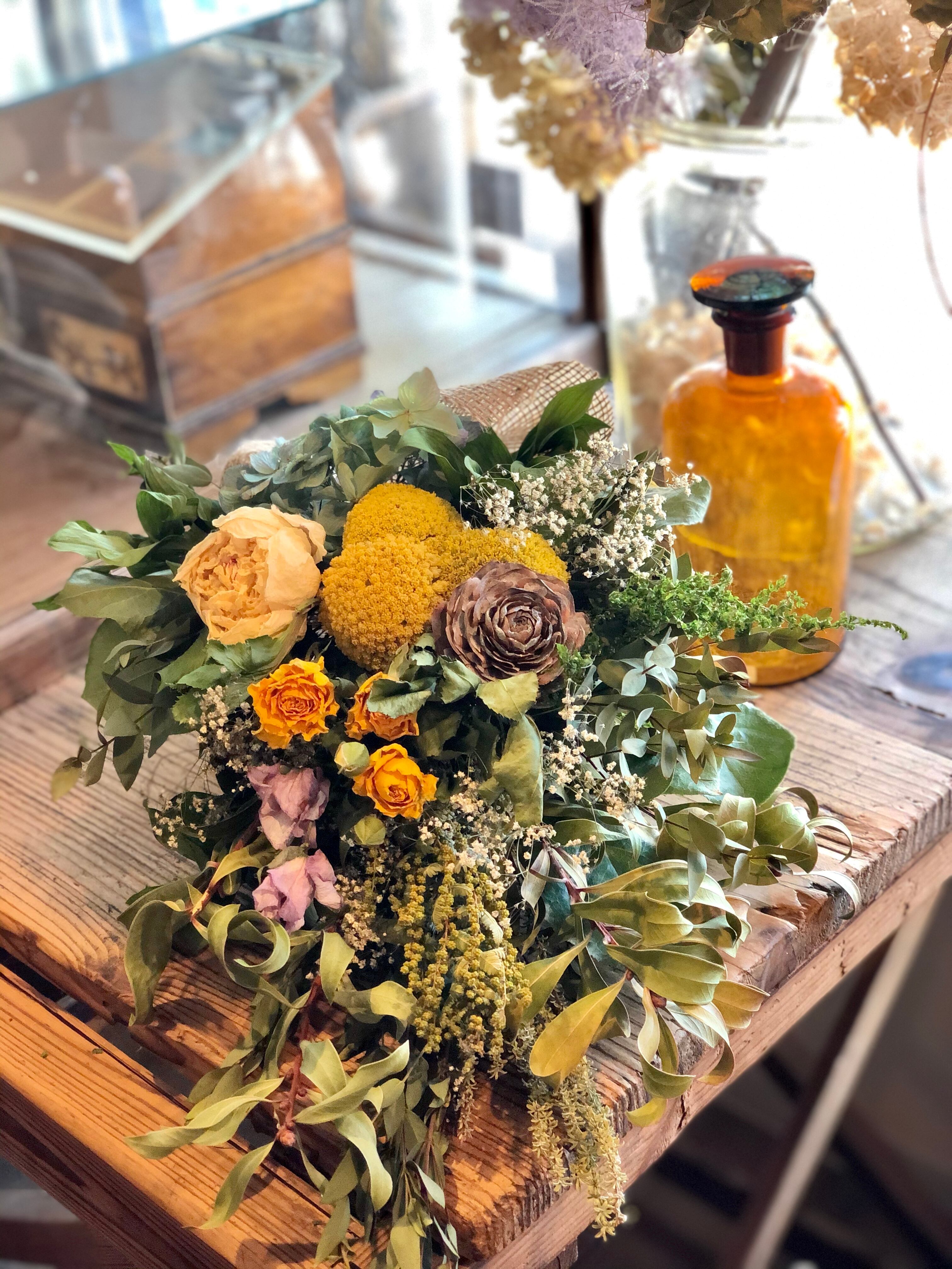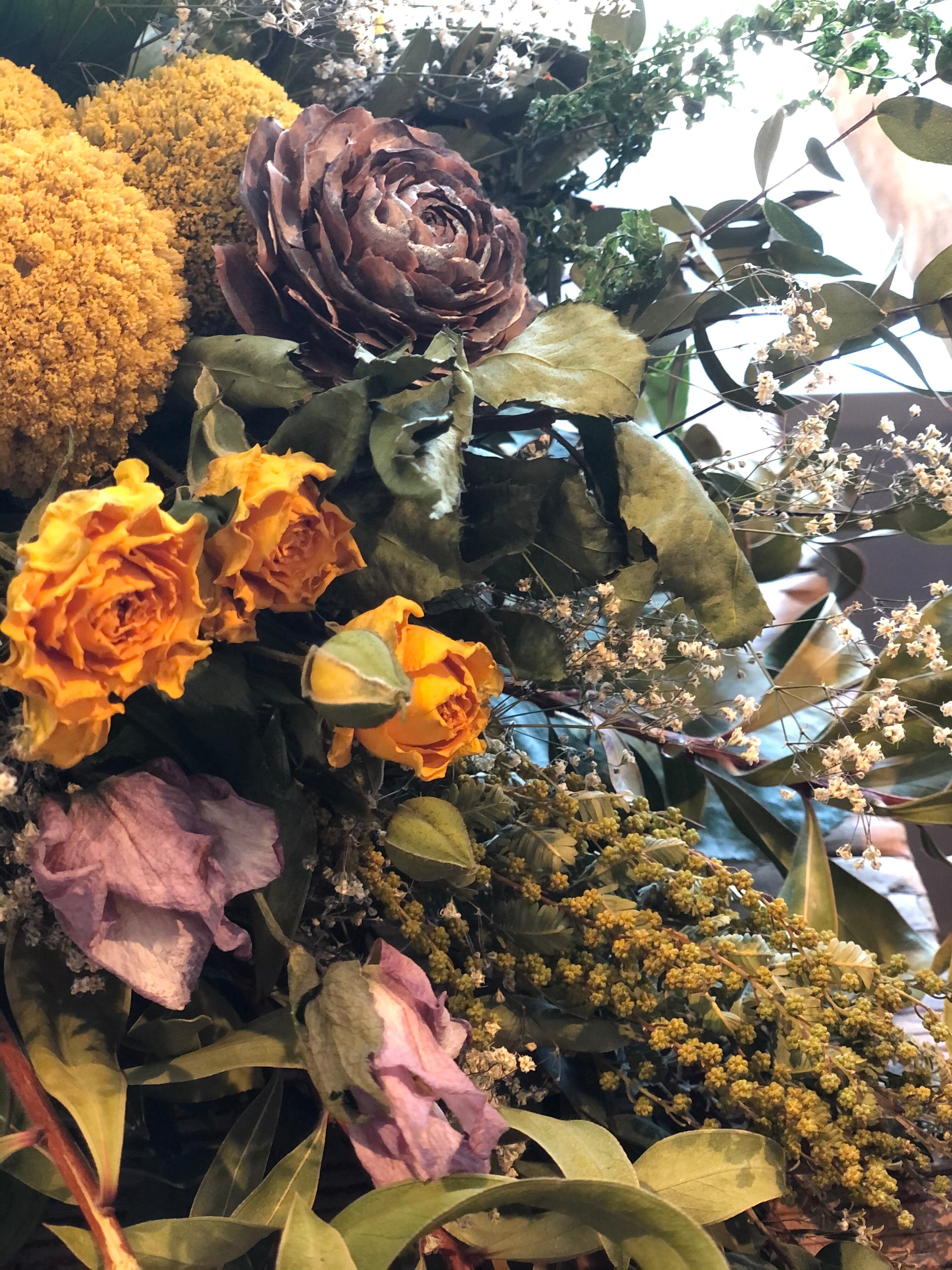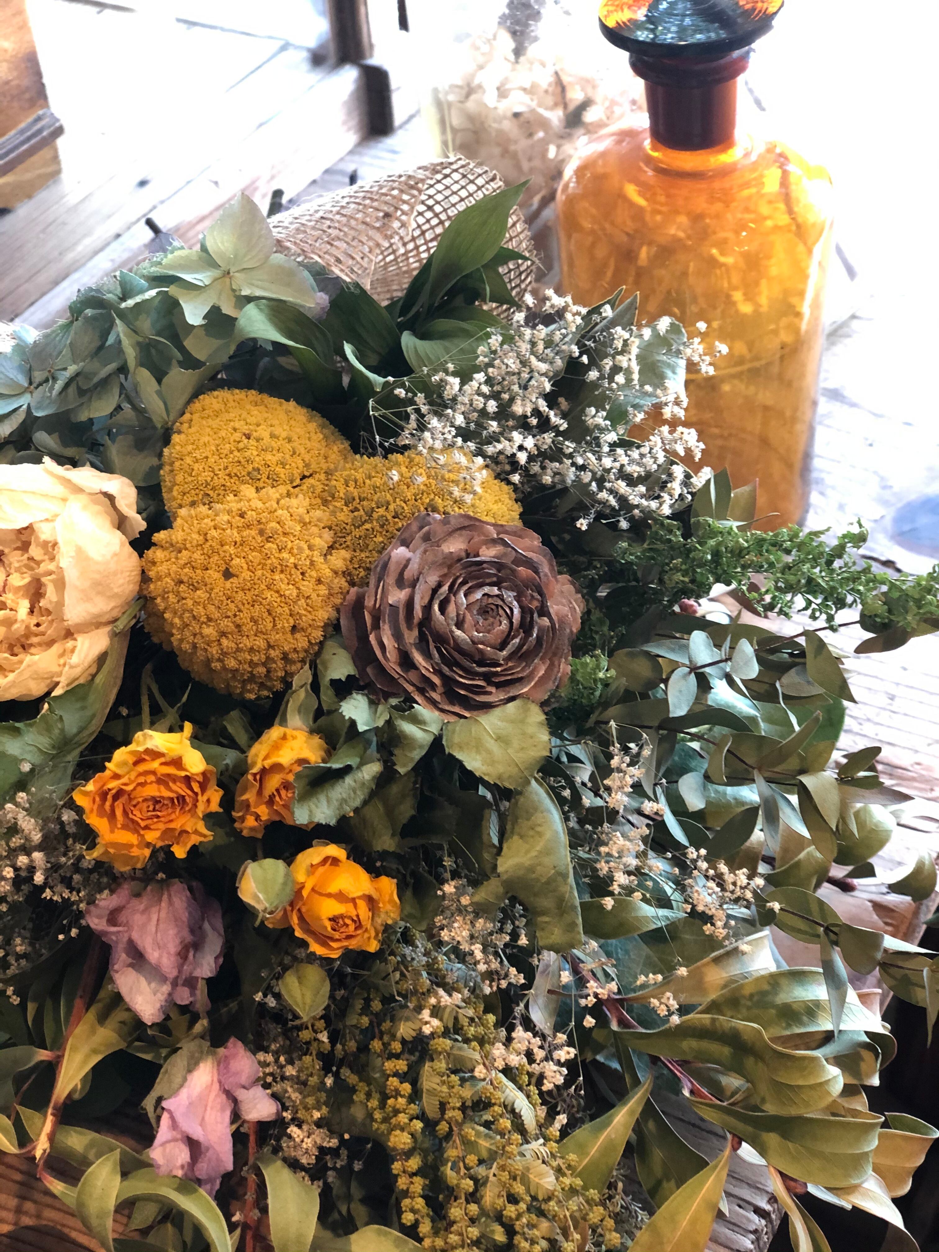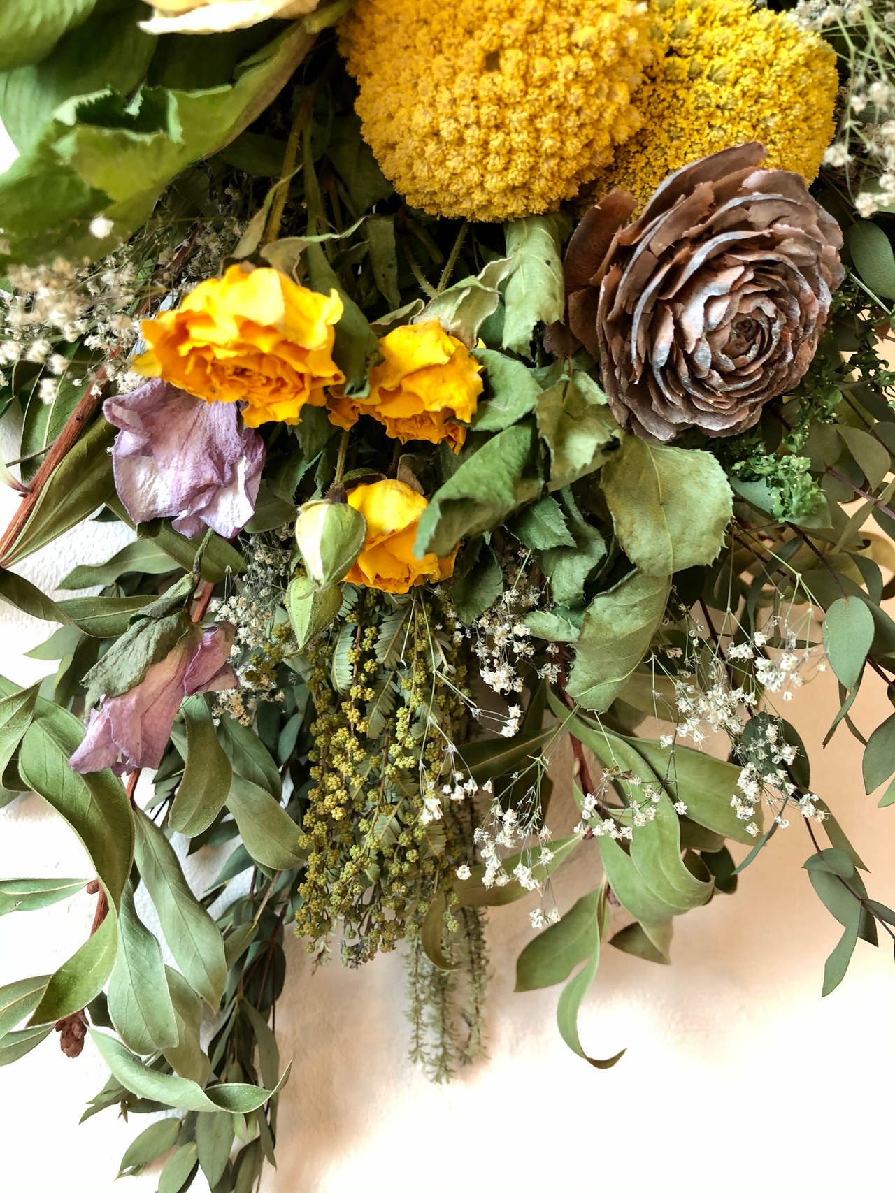 ユーカリとキンポウジュをたっぷり使ったベースに、黄色のアキレアをたっぷりと入れた春色スワッグ。
