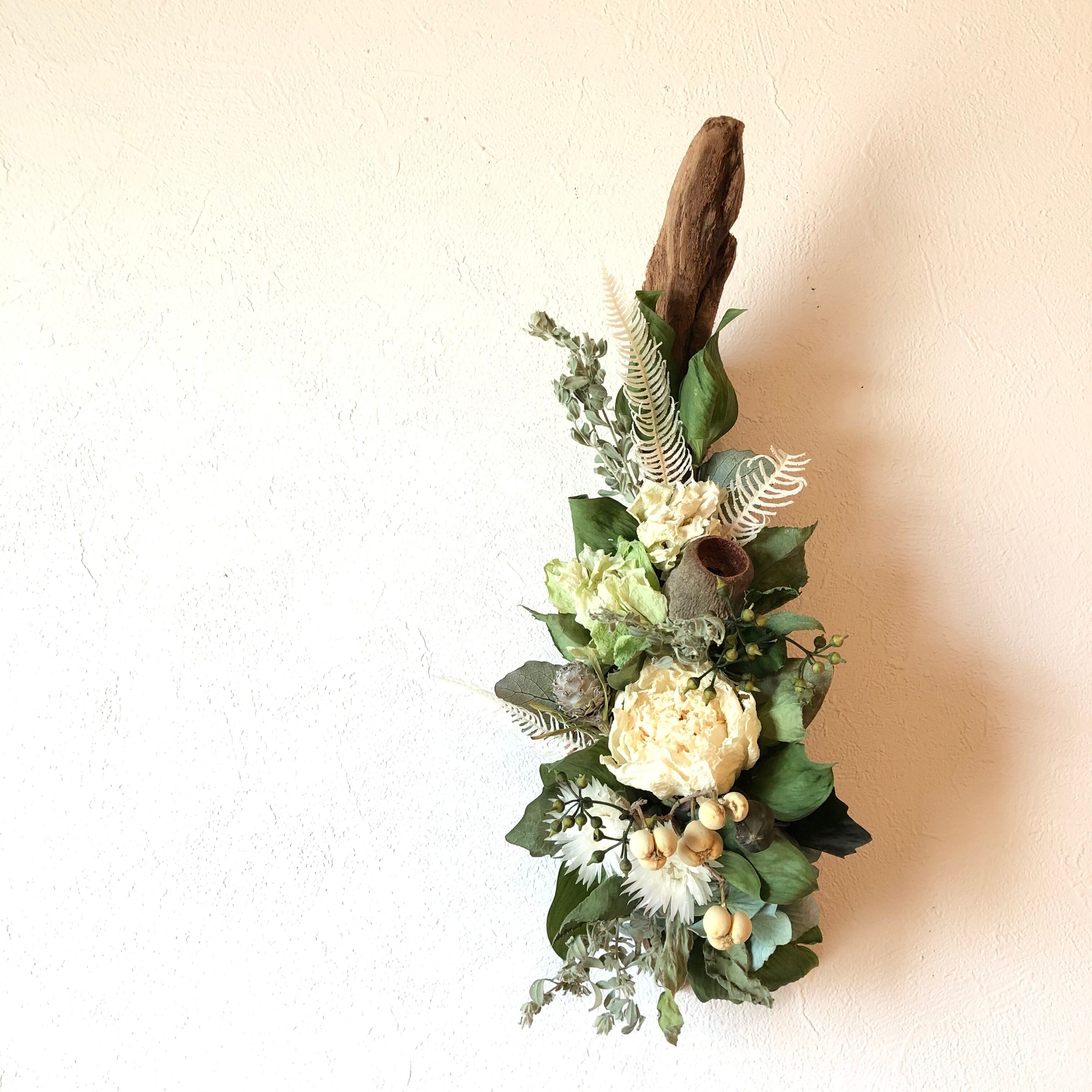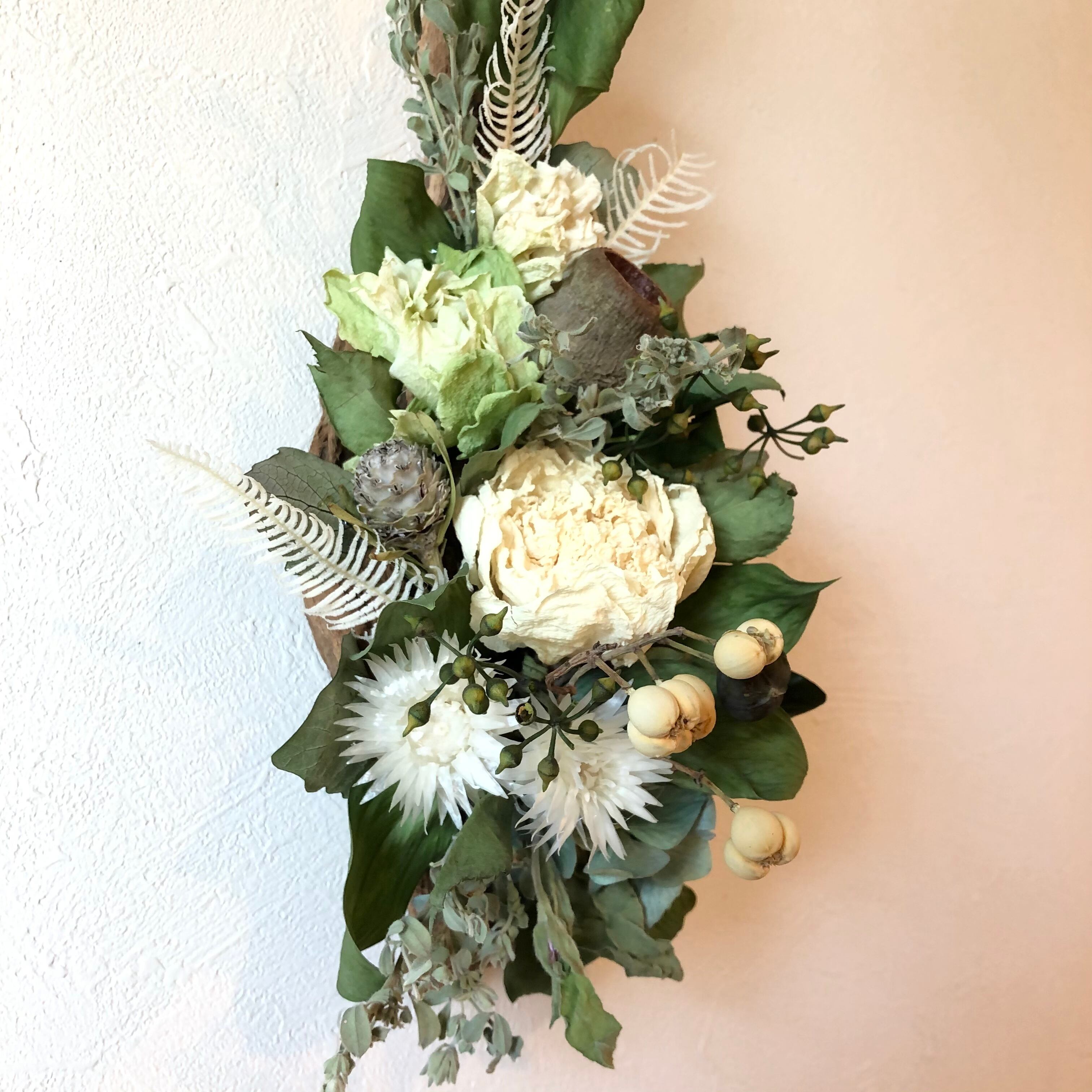 白のシャクヤクをメインにアジサイ、ユーカリの実、クリスマスローズなどを入れてシックで落ち着いた色合いに。