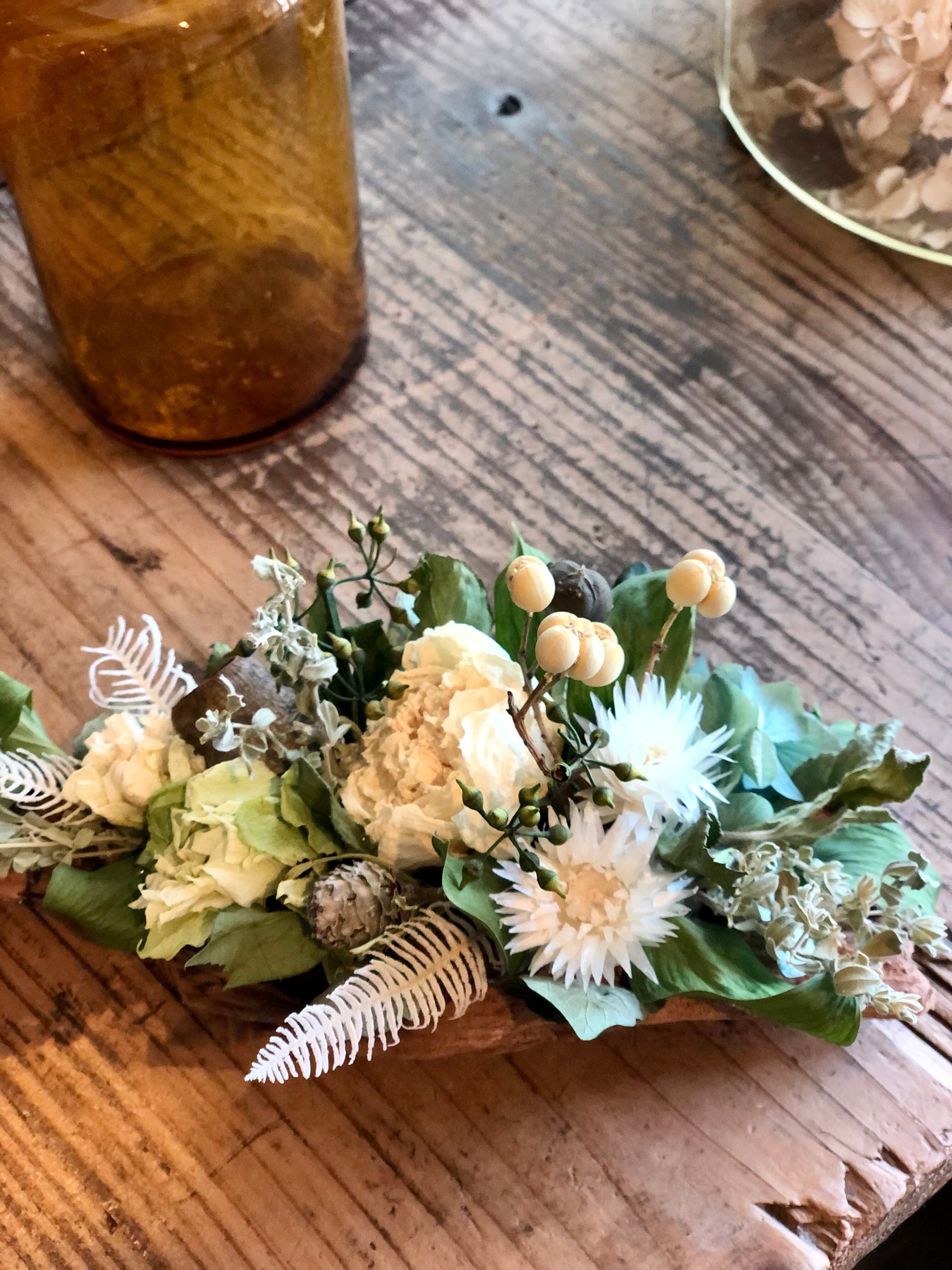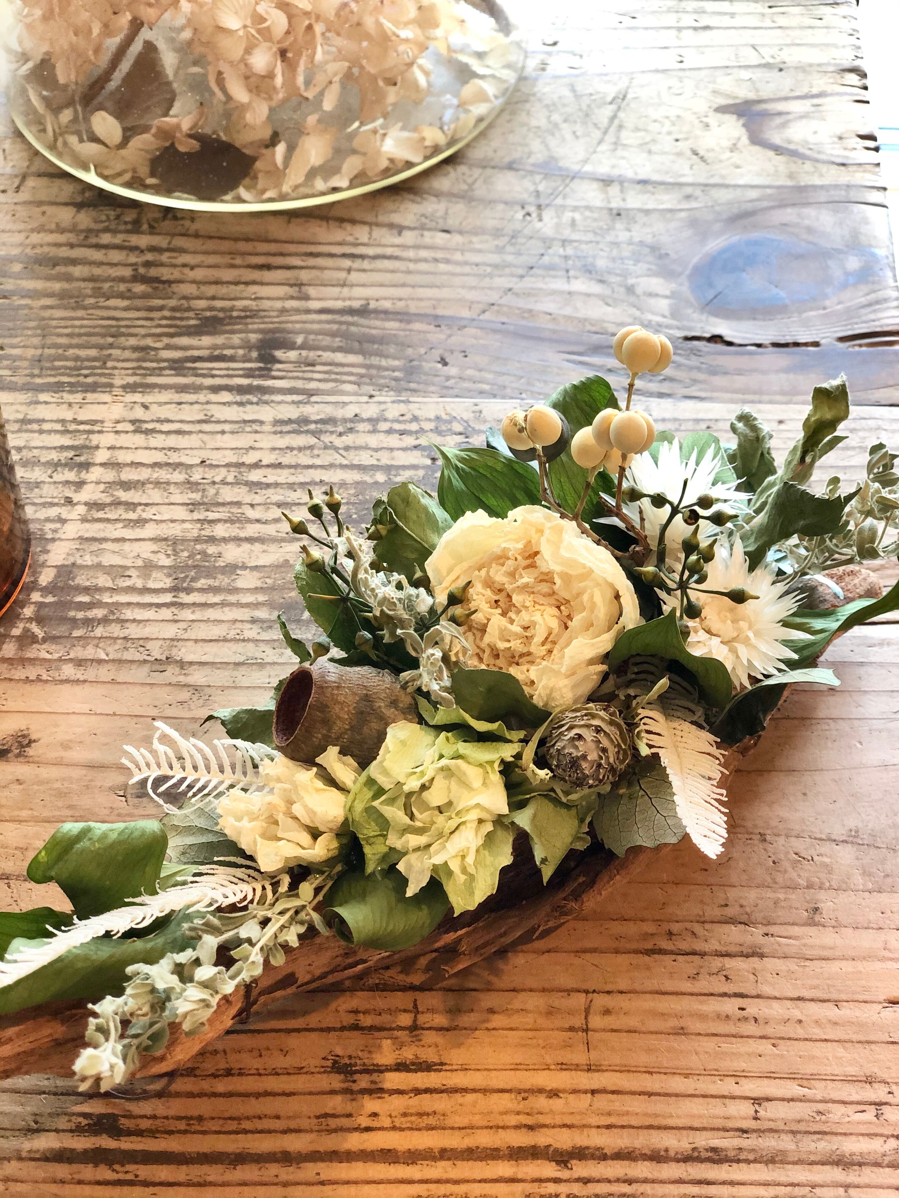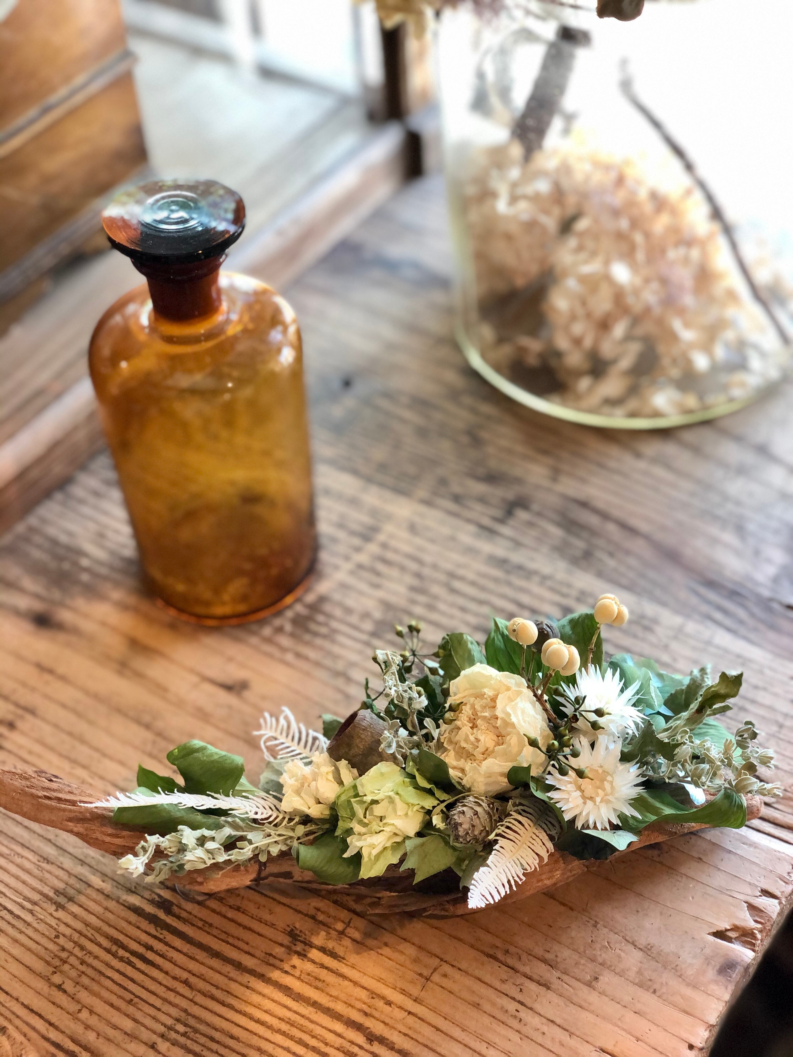 傷がついていたり、穴が開いていたり。その雰囲気はドライフラワーのシックな色合いともとても相性がいいです。